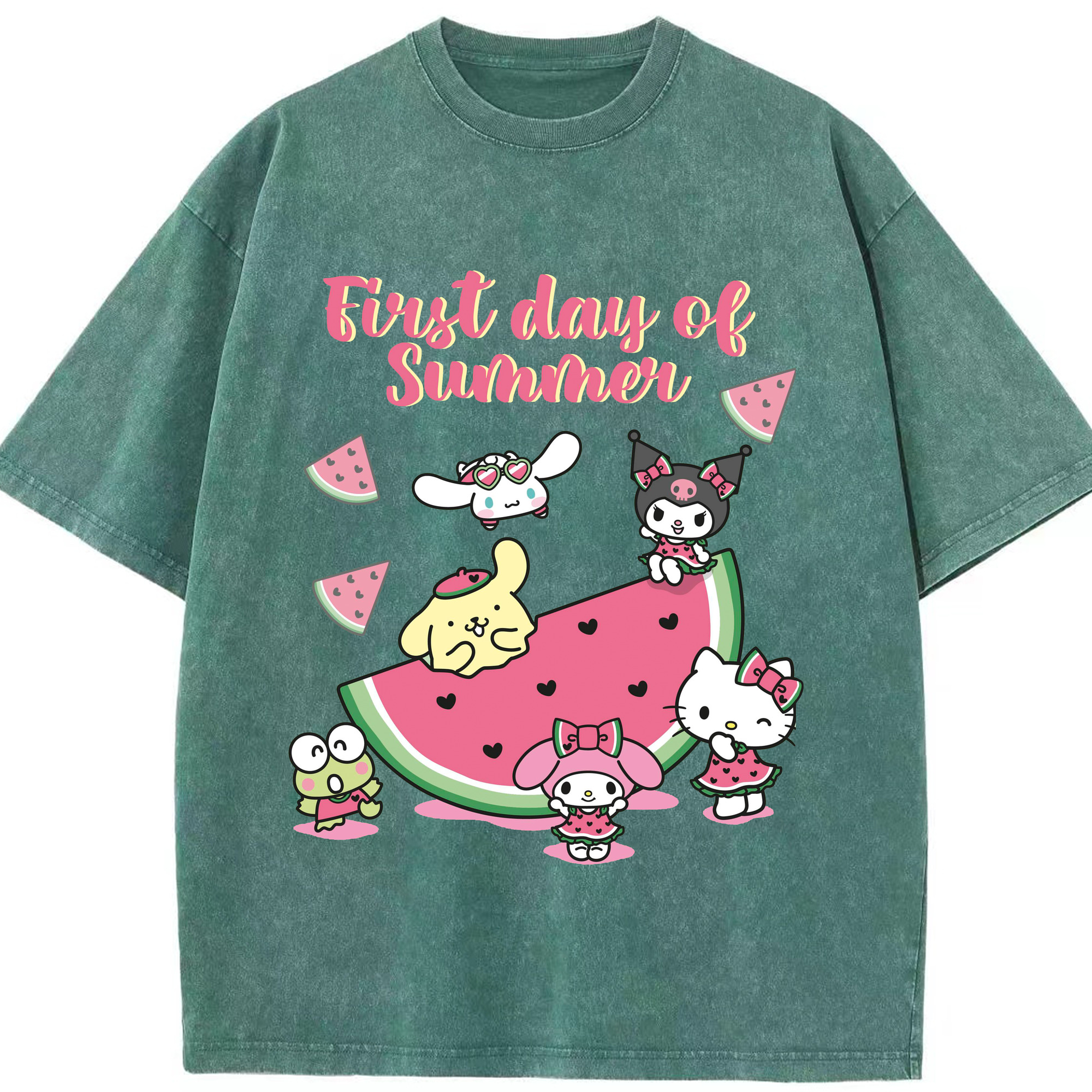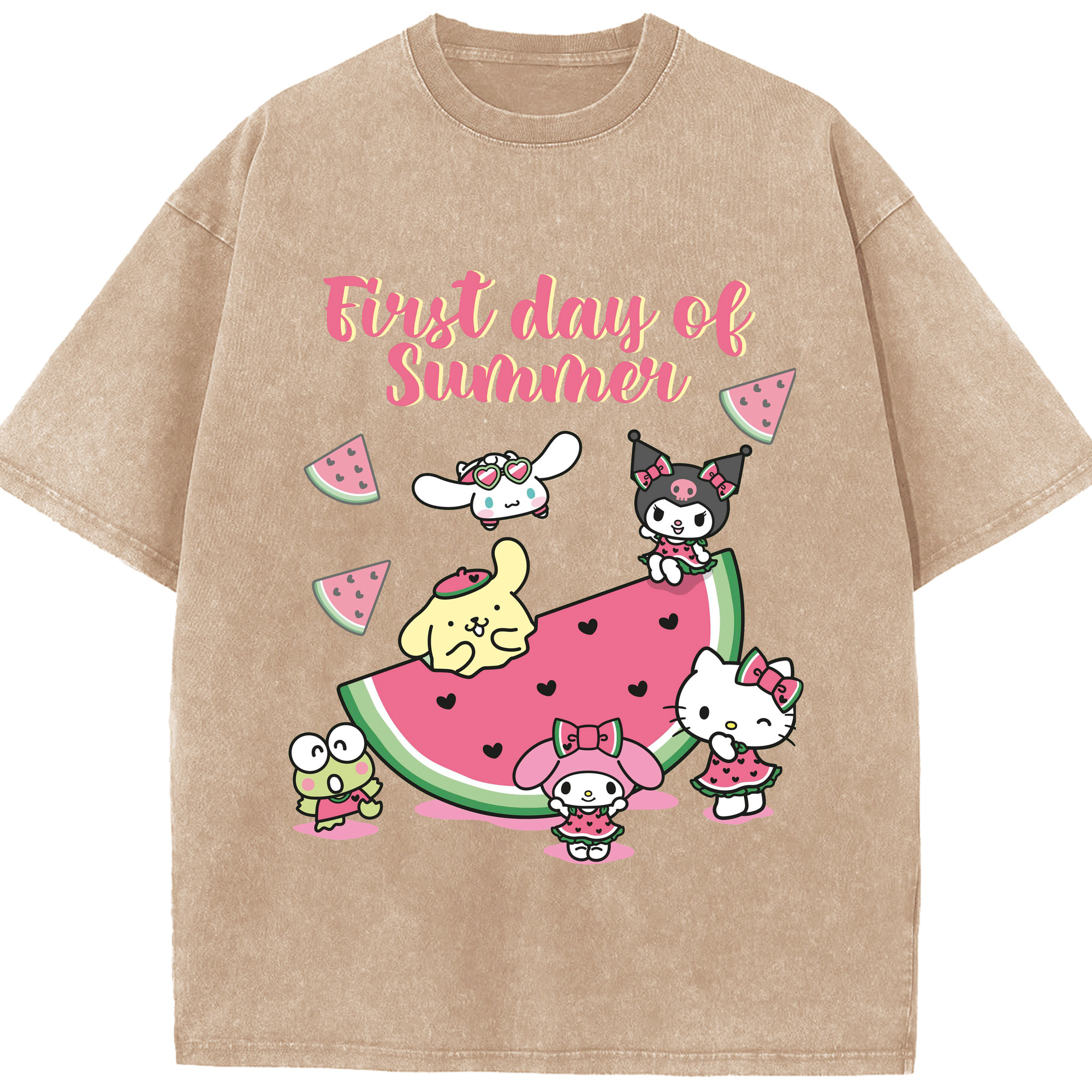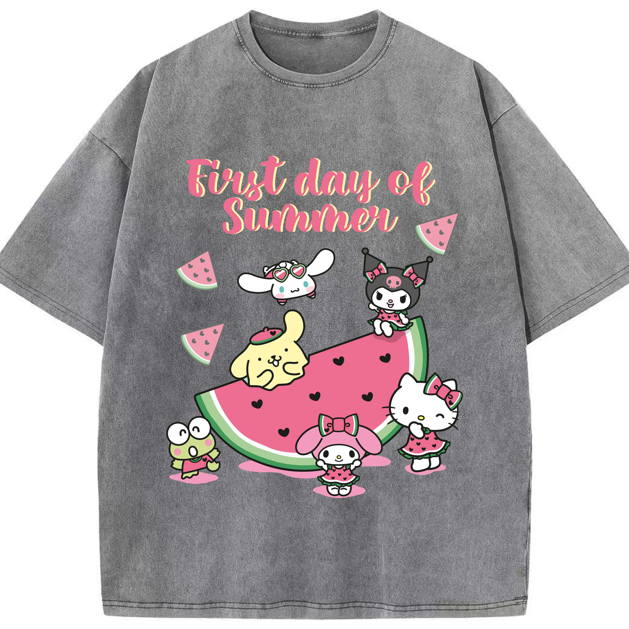 スイカサンリオ - 綿100% ヴィンテージ風 半袖Tシャツ ・ 背面プリント ・ 柔らか肌触り ・ 通気性 快適 ・ スポーツ カジュアル 外出用