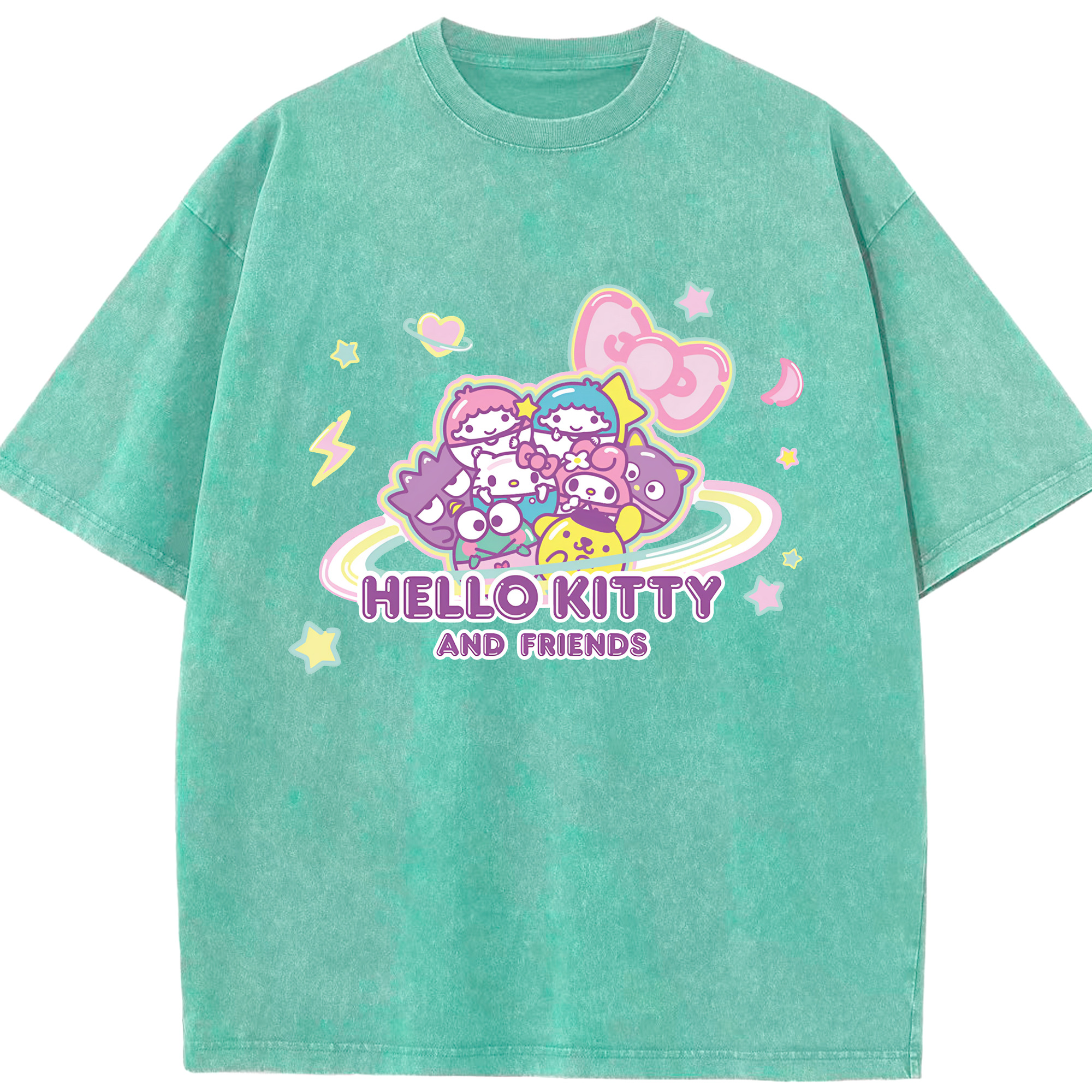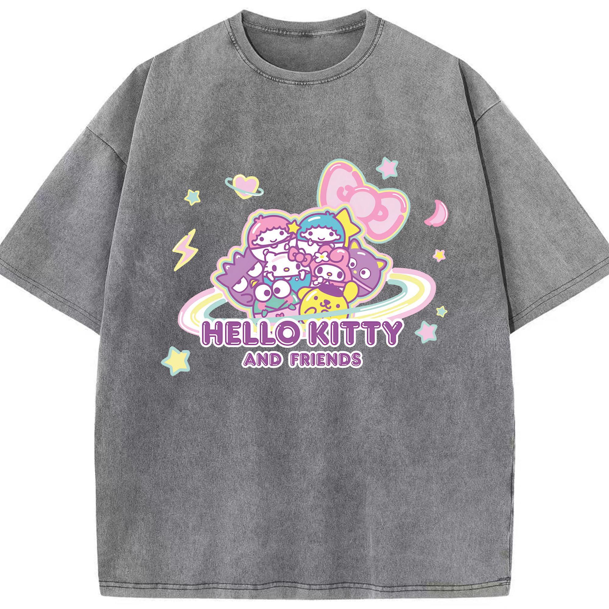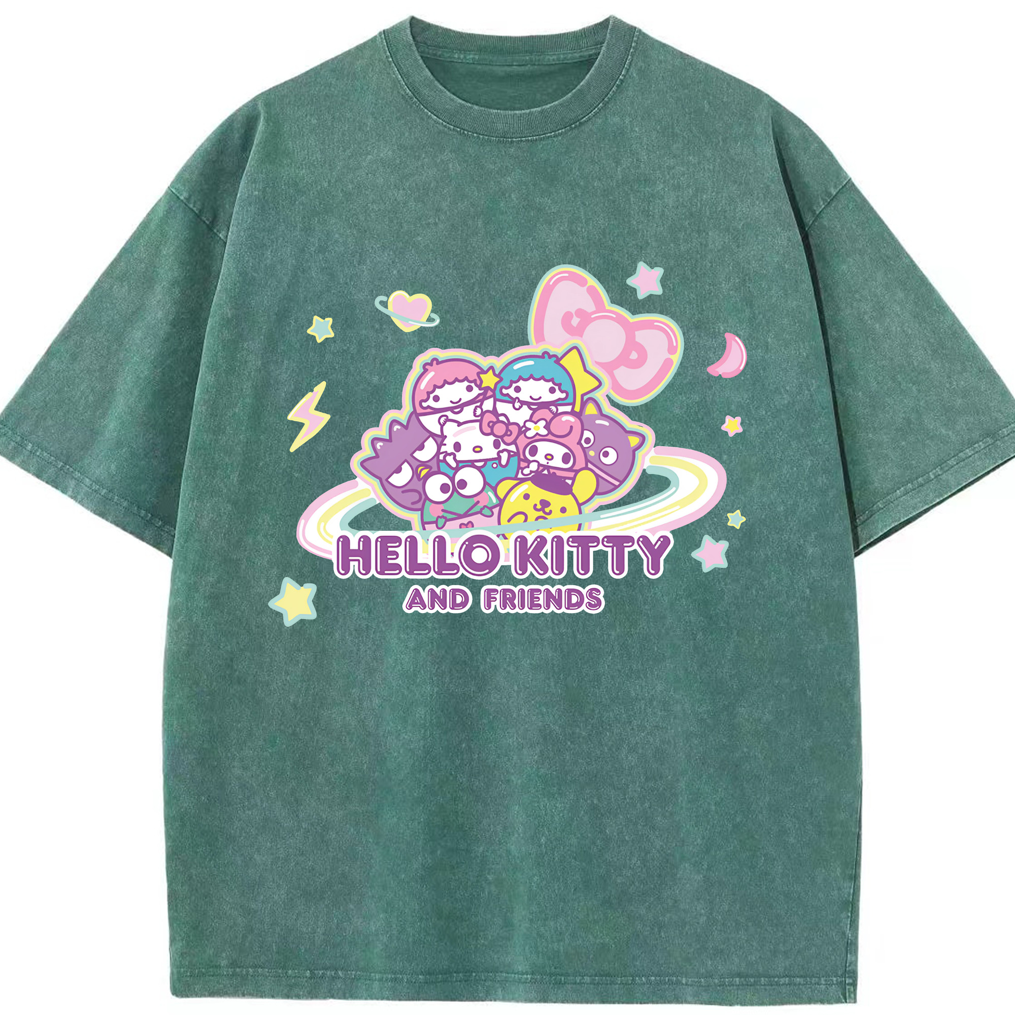 キティちゃんとなかまたち大集合♪ - 綿100% ヴィンテージ風 半袖Tシャツ ・ フロントプリント ・ 柔らか肌触り ・ 通気性 快適 ・ スポーツ カジュアル 外出用