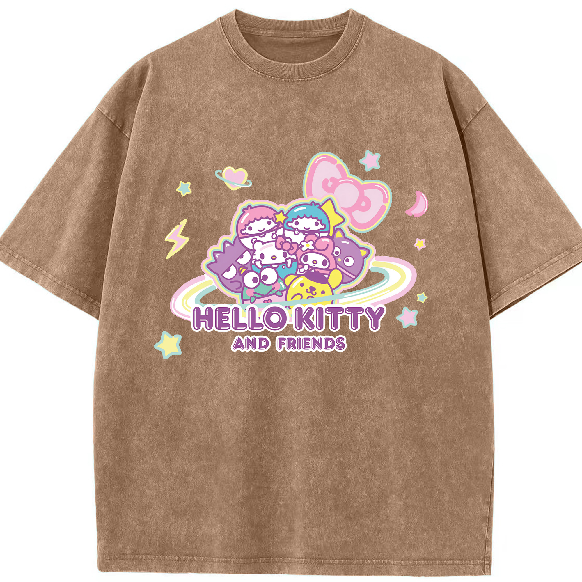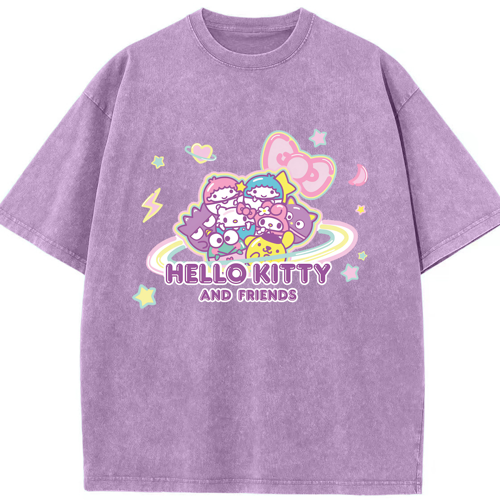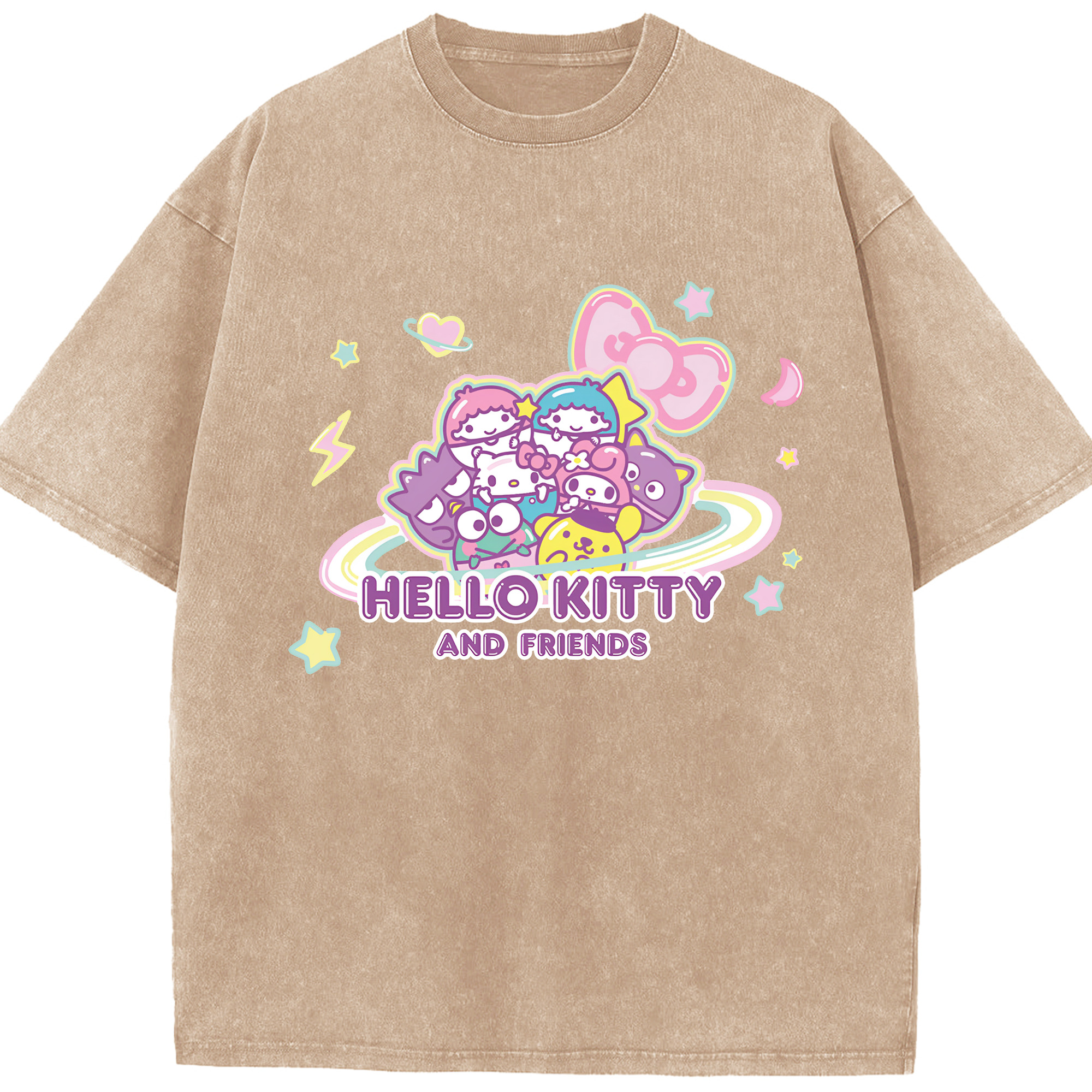 キティちゃんとなかまたち大集合♪ - 綿100% ヴィンテージ風 半袖Tシャツ ・ フロントプリント ・ 柔らか肌触り ・ 通気性 快適 ・ スポーツ カジュアル 外出用