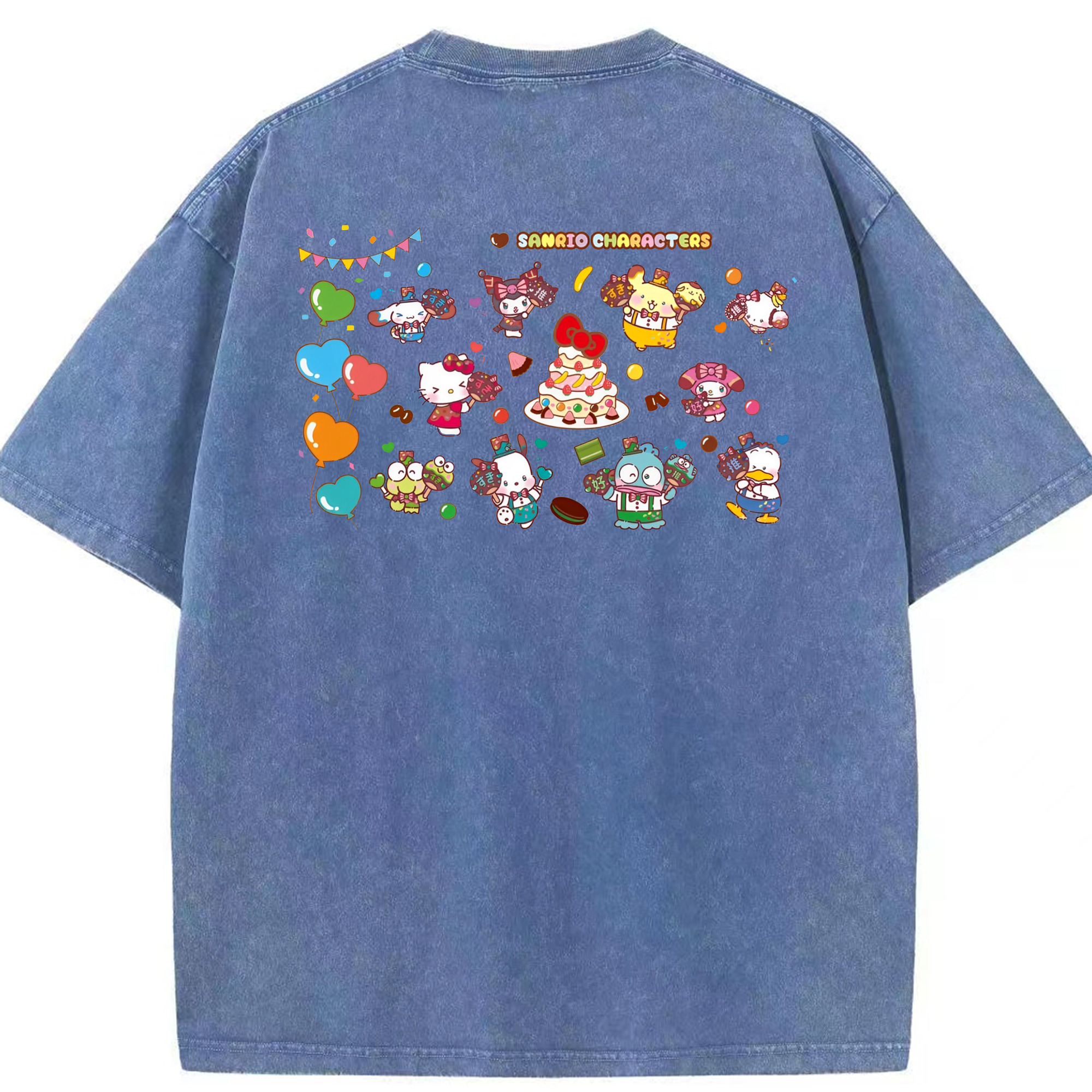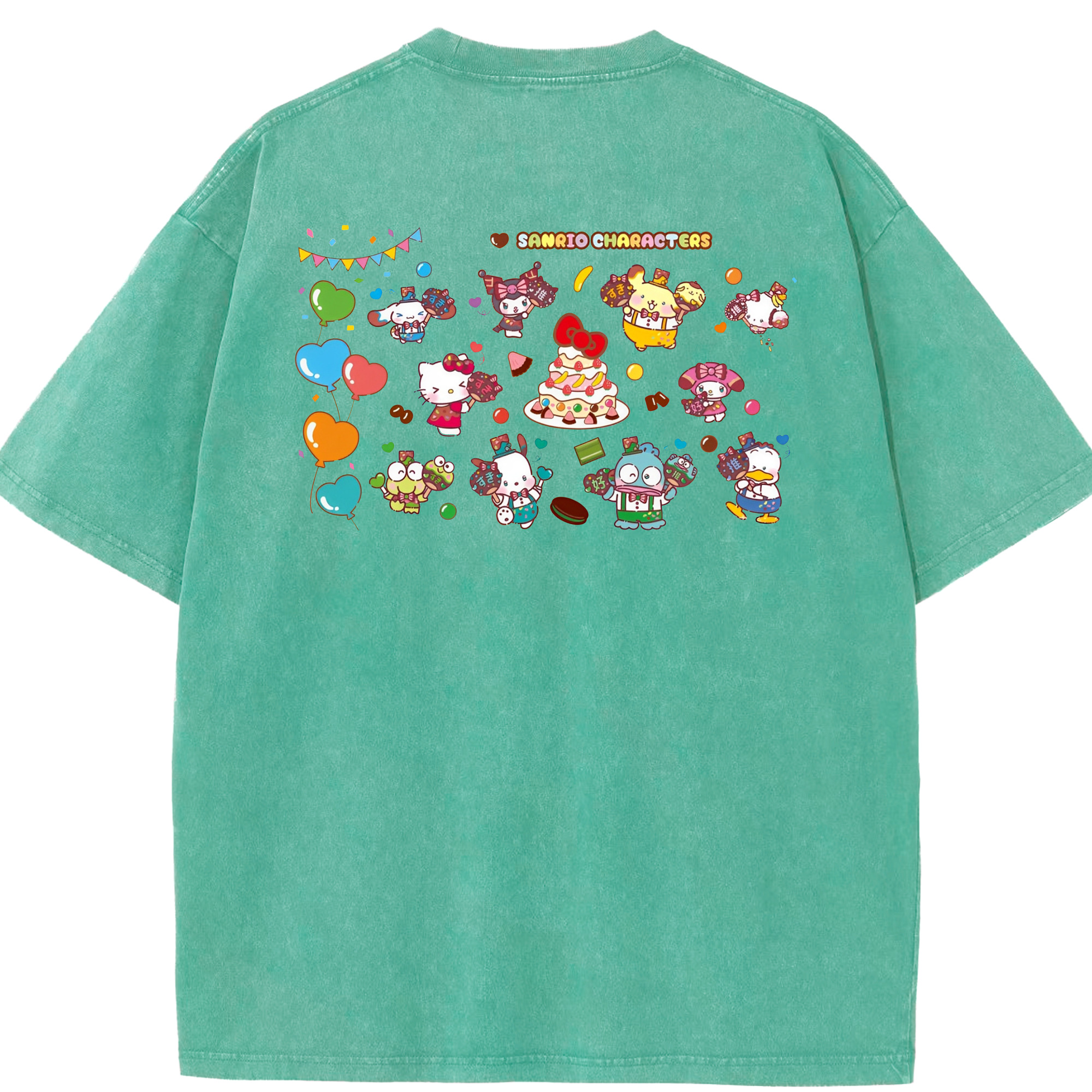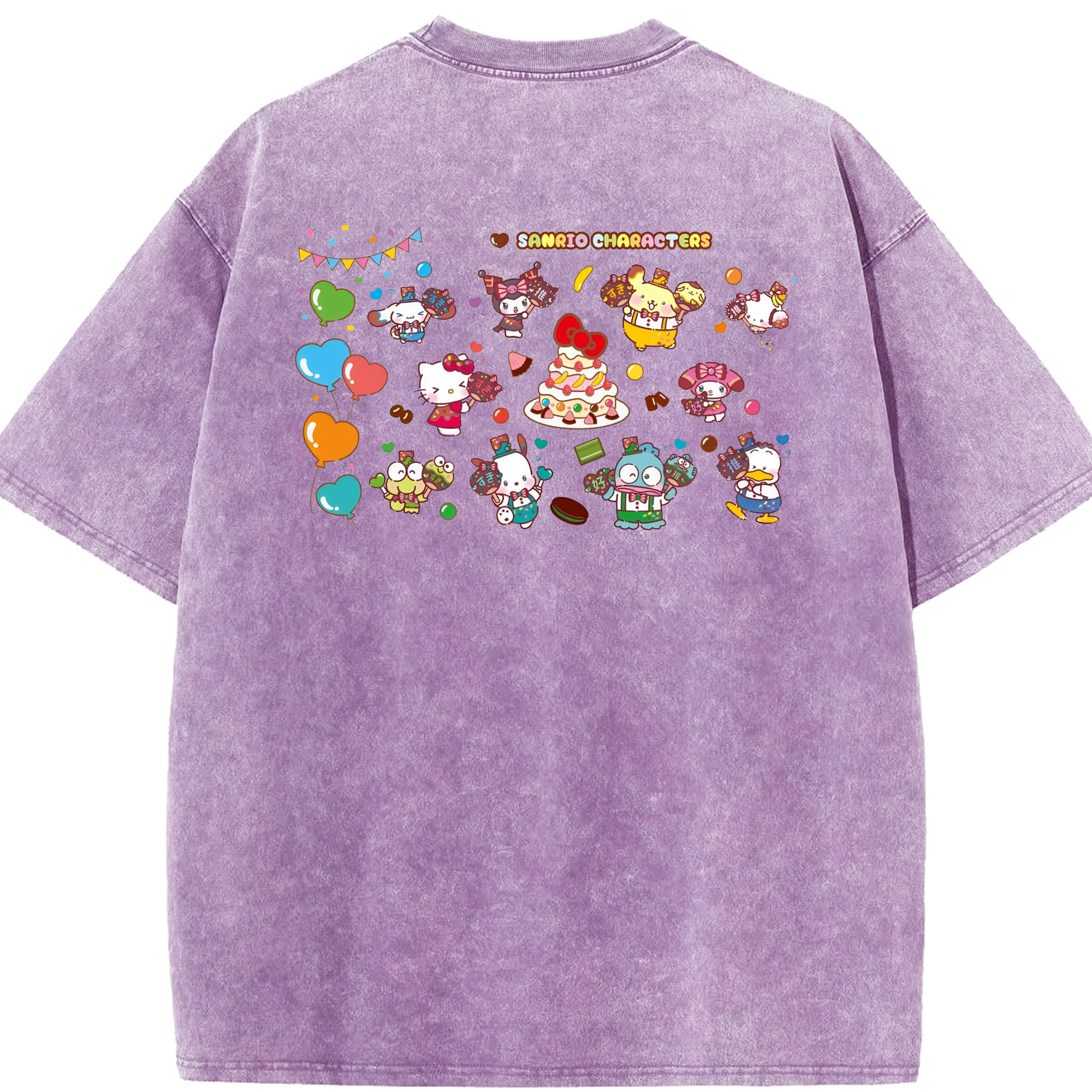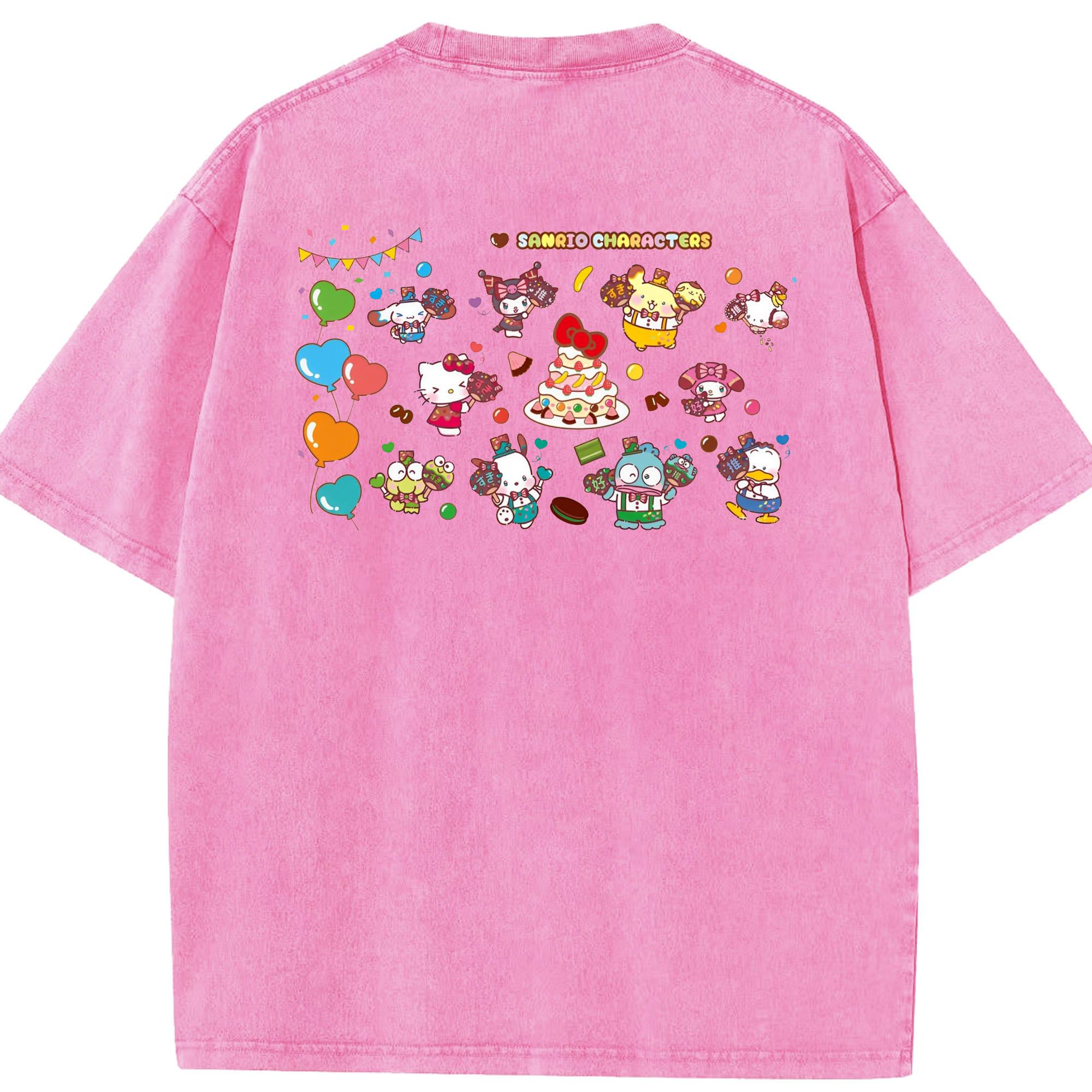 カラフルでポップ!レインボーサンリオ - 綿100% ヴィンテージ風 半袖Tシャツ ・ 背面プリント ・ 柔らか肌触り ・ 通気性 快適 ・ スポーツ カジュアル 外出用