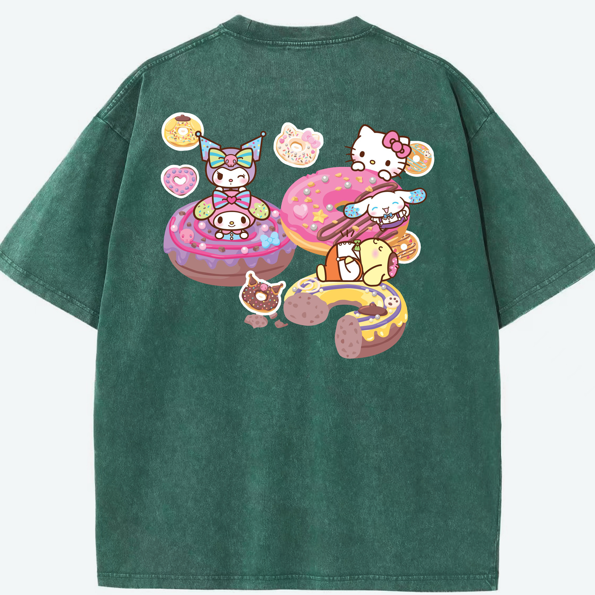 ドーナツ×サンリオ - 綿100% ヴィンテージ風 半袖Tシャツ ・ フロントプリント ・ 柔らか肌触り ・ 通気性 快適 ・ スポーツ カジュアル 外出用