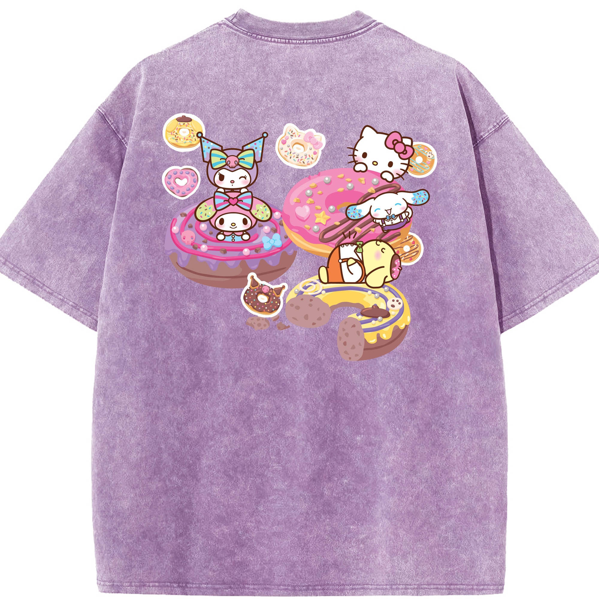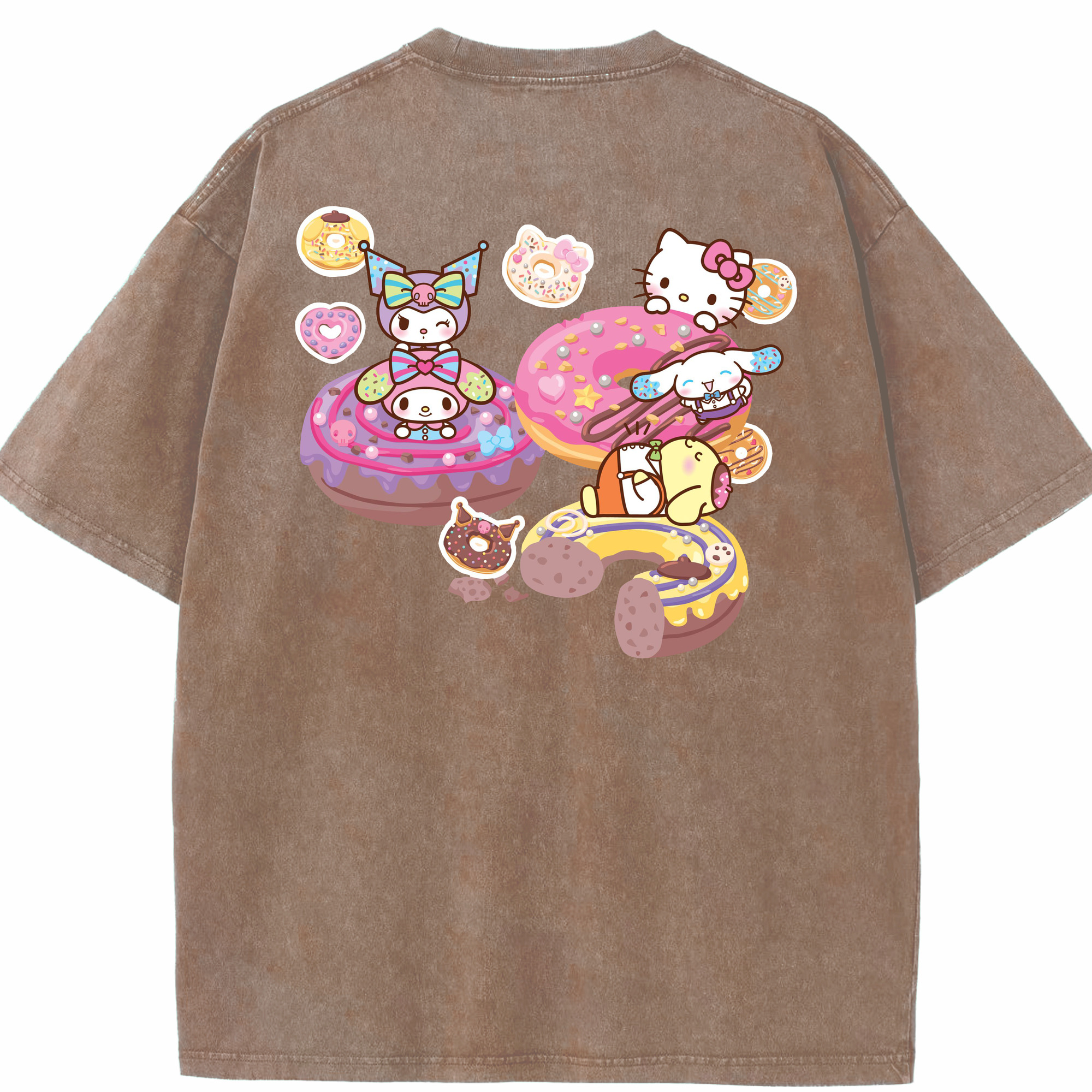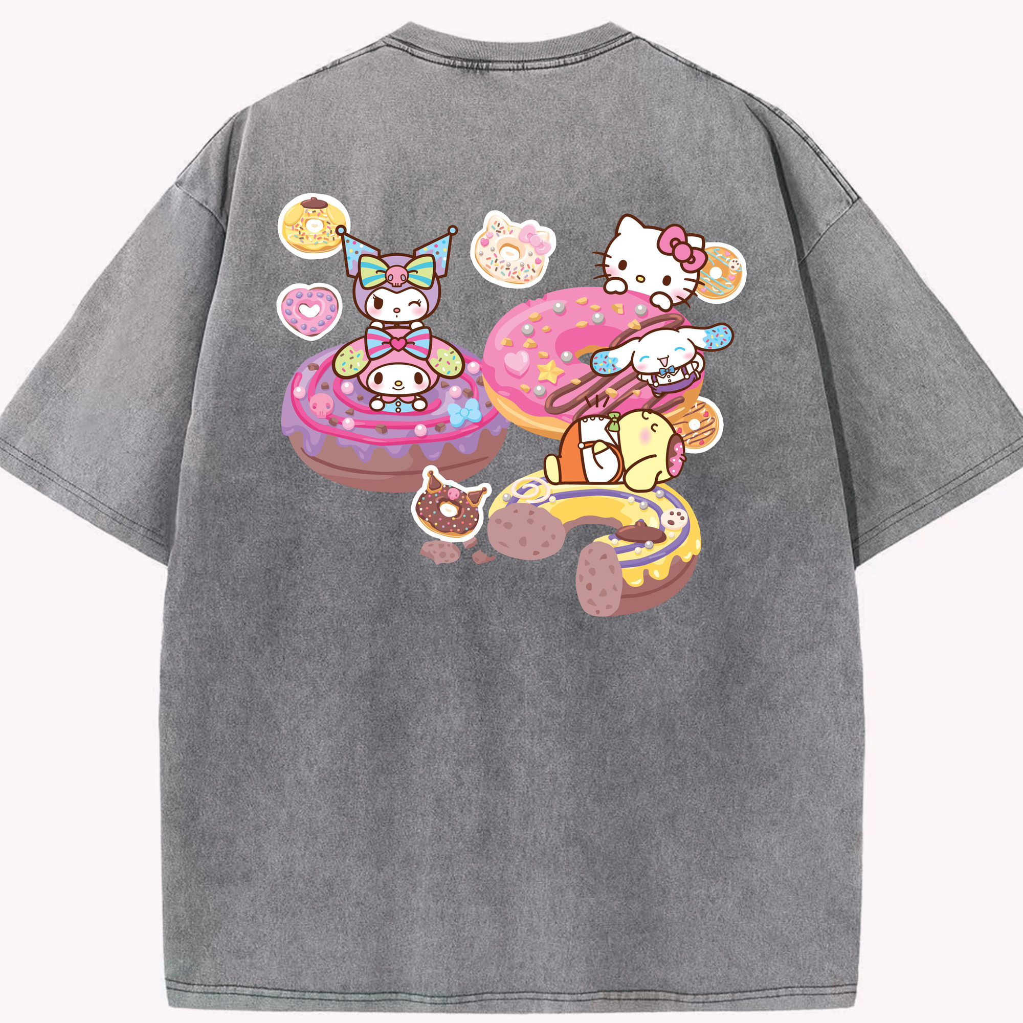 ドーナツ×サンリオ - 綿100% ヴィンテージ風 半袖Tシャツ ・ 背面プリント ・ 柔らか肌触り ・ 通気性 快適 ・ スポーツ カジュアル 外出用
