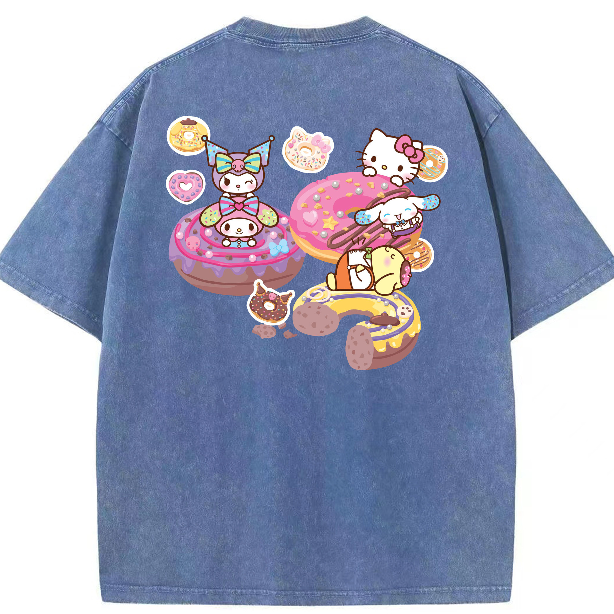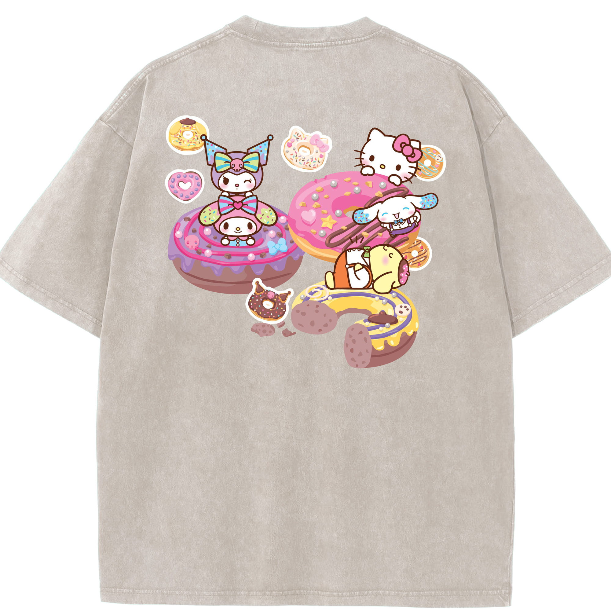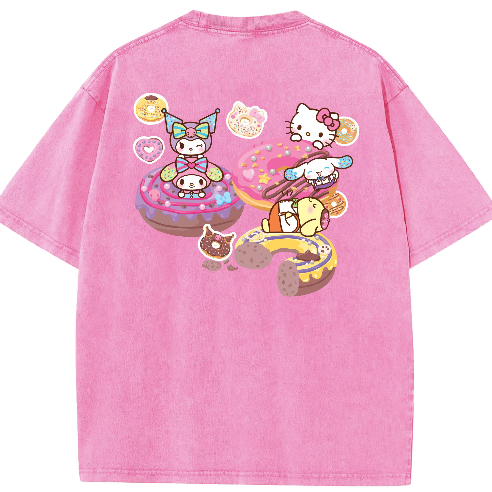 ドーナツ×サンリオ - 綿100% ヴィンテージ風 半袖Tシャツ ・ 背面プリント ・ 柔らか肌触り ・ 通気性 快適 ・ スポーツ カジュアル 外出用
