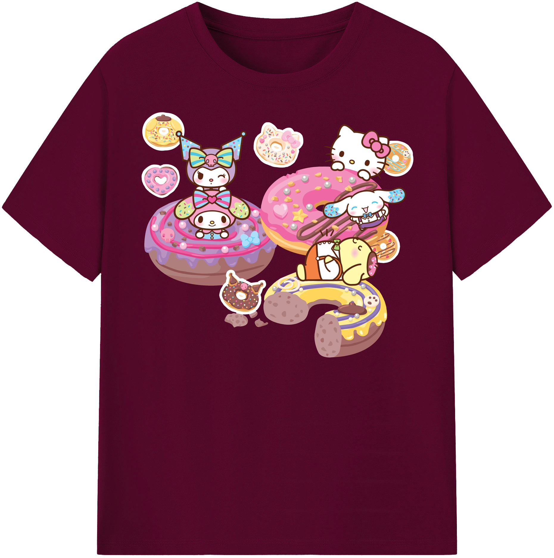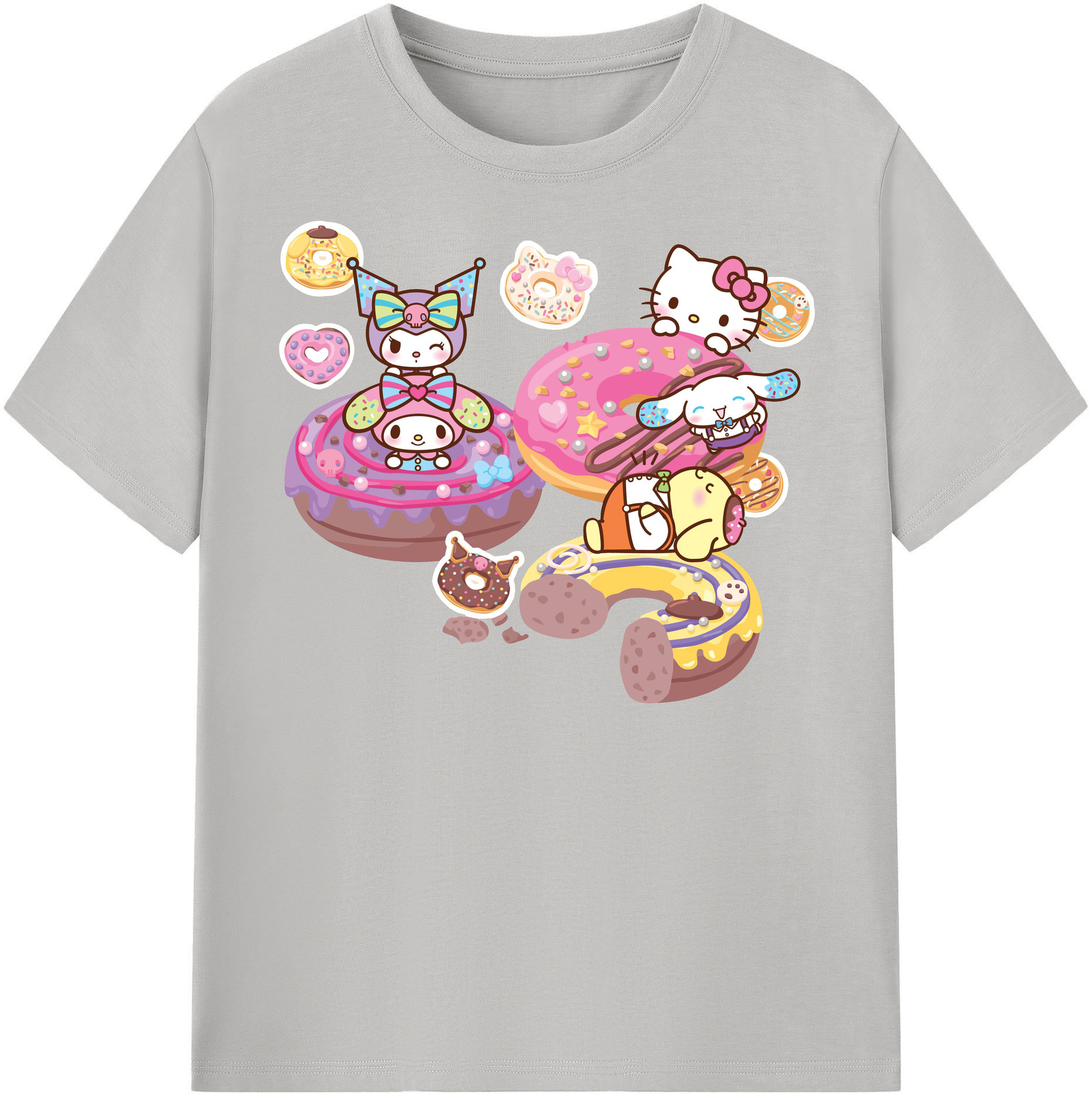 ドーナツ×サンリオ - 綿100% ヴィンテージ風 半袖Tシャツ ・ フロントプリント ・ 柔らか肌触り ・ 通気性 快適 ・ スポーツ カジュアル 外出用