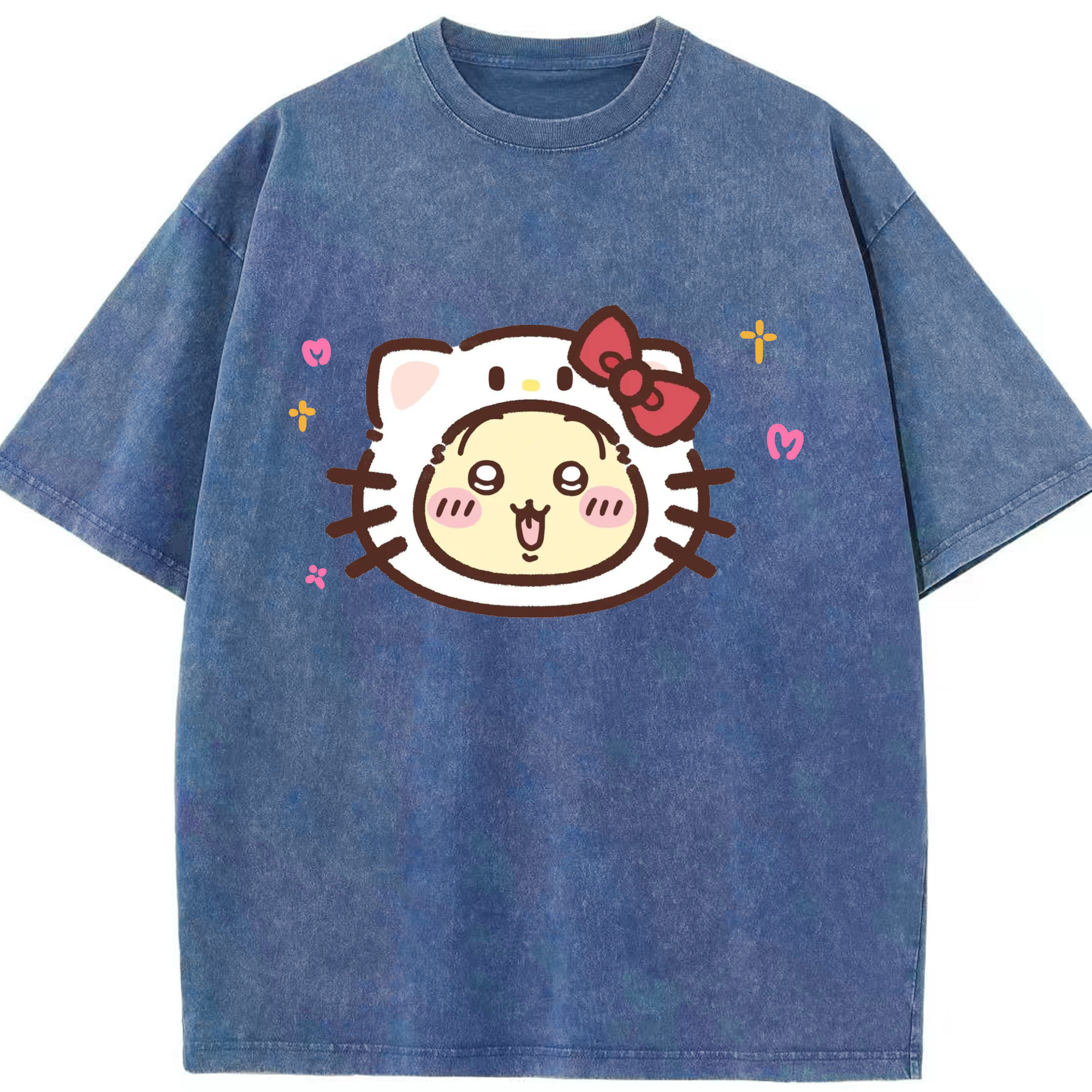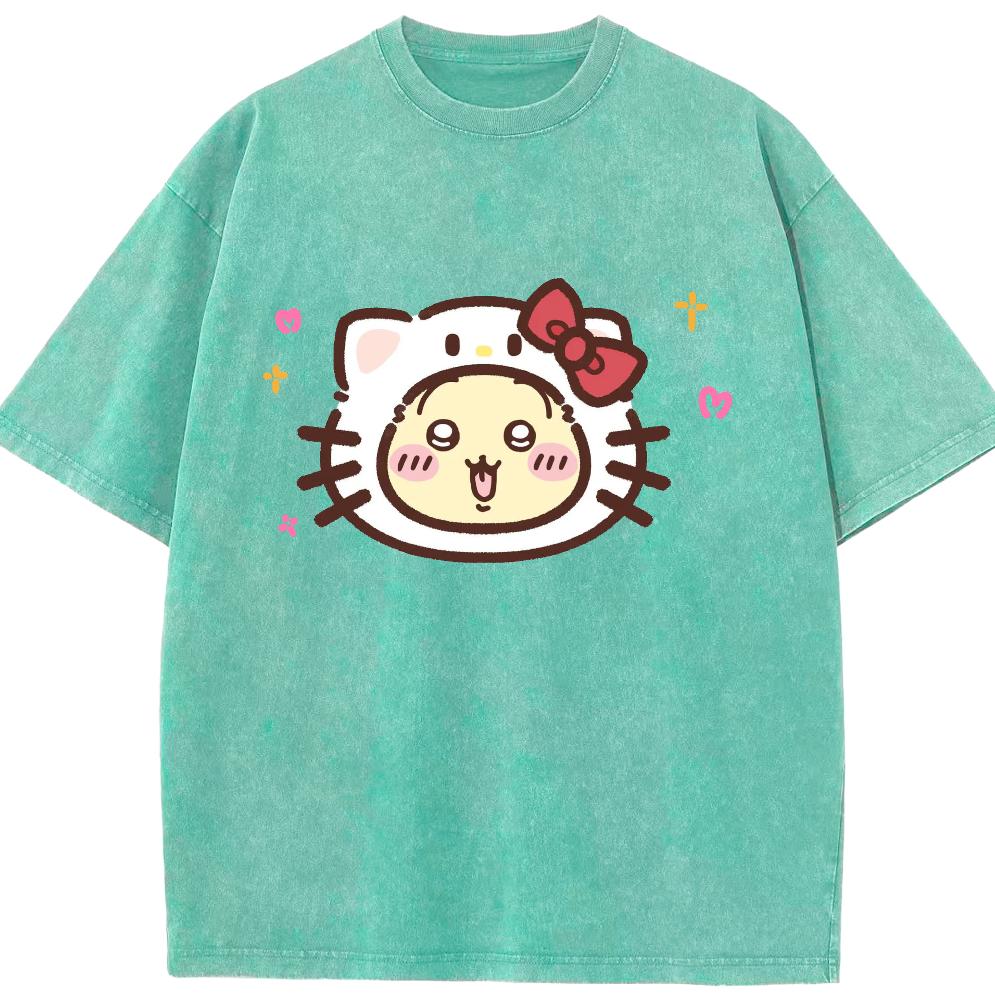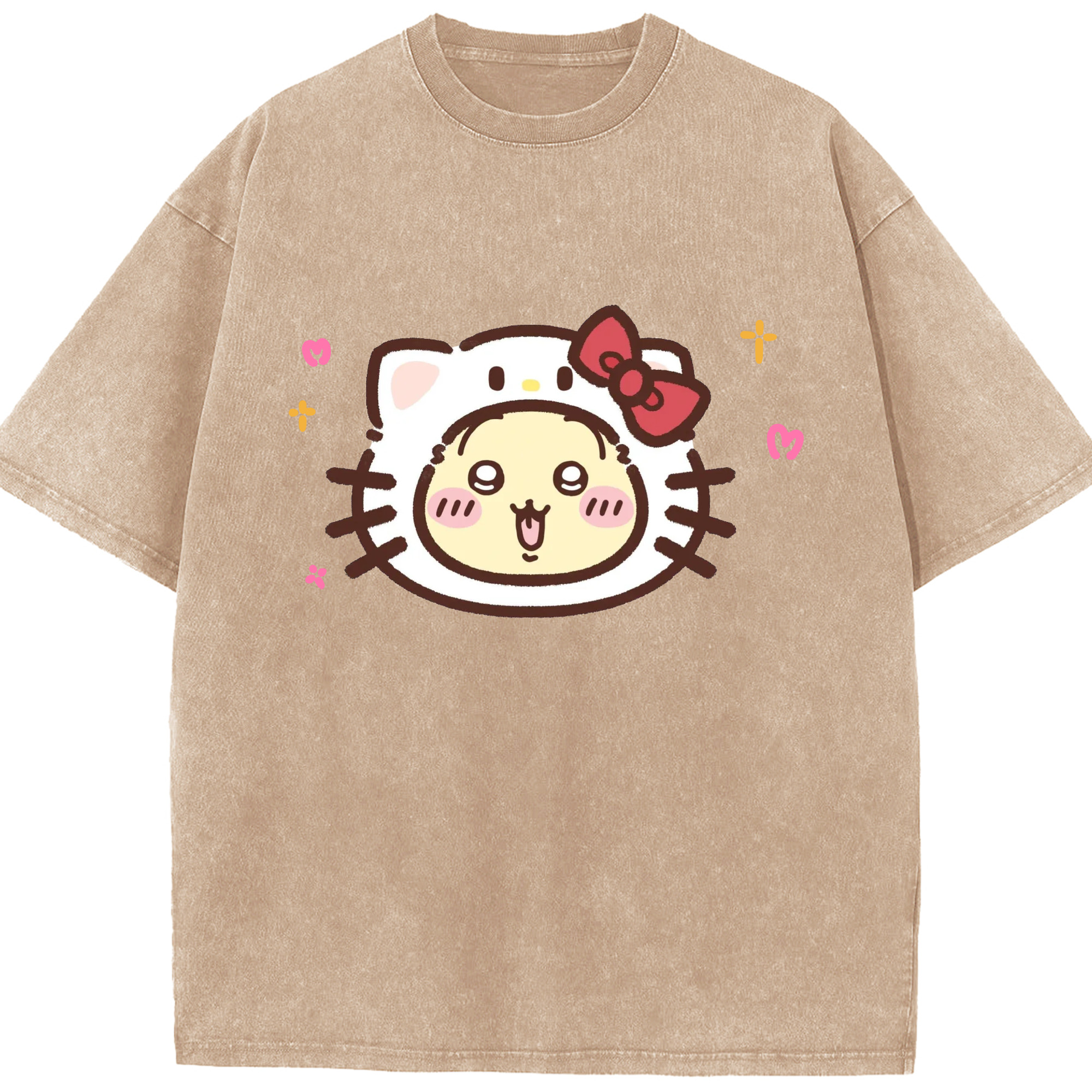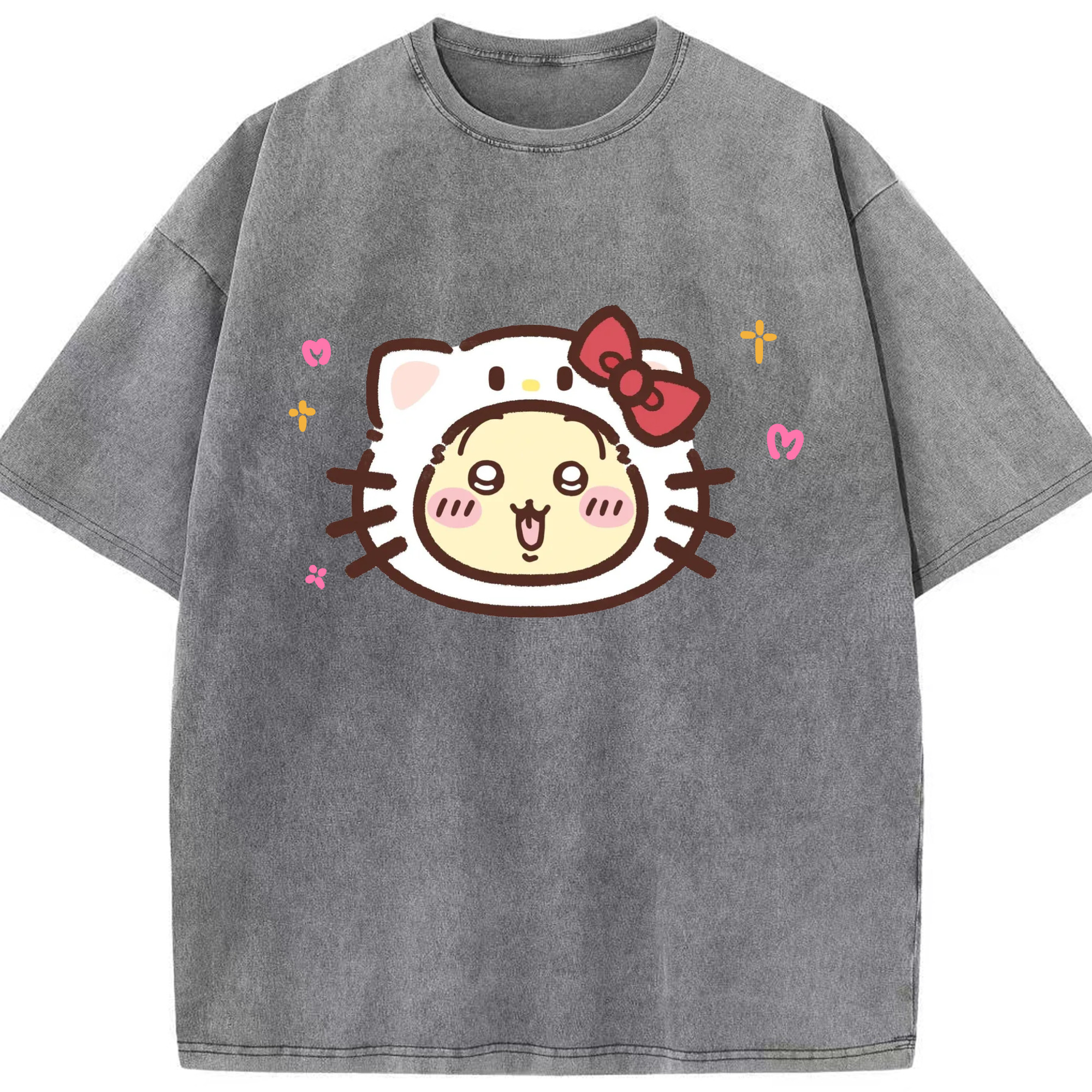 ハローキティ&ちいかわ - 綿100% ヴィンテージ風 半袖Tシャツ ・ 背面プリント ・ 柔らか肌触り ・ 通気性 快適 ・ スポーツ カジュアル 外出用