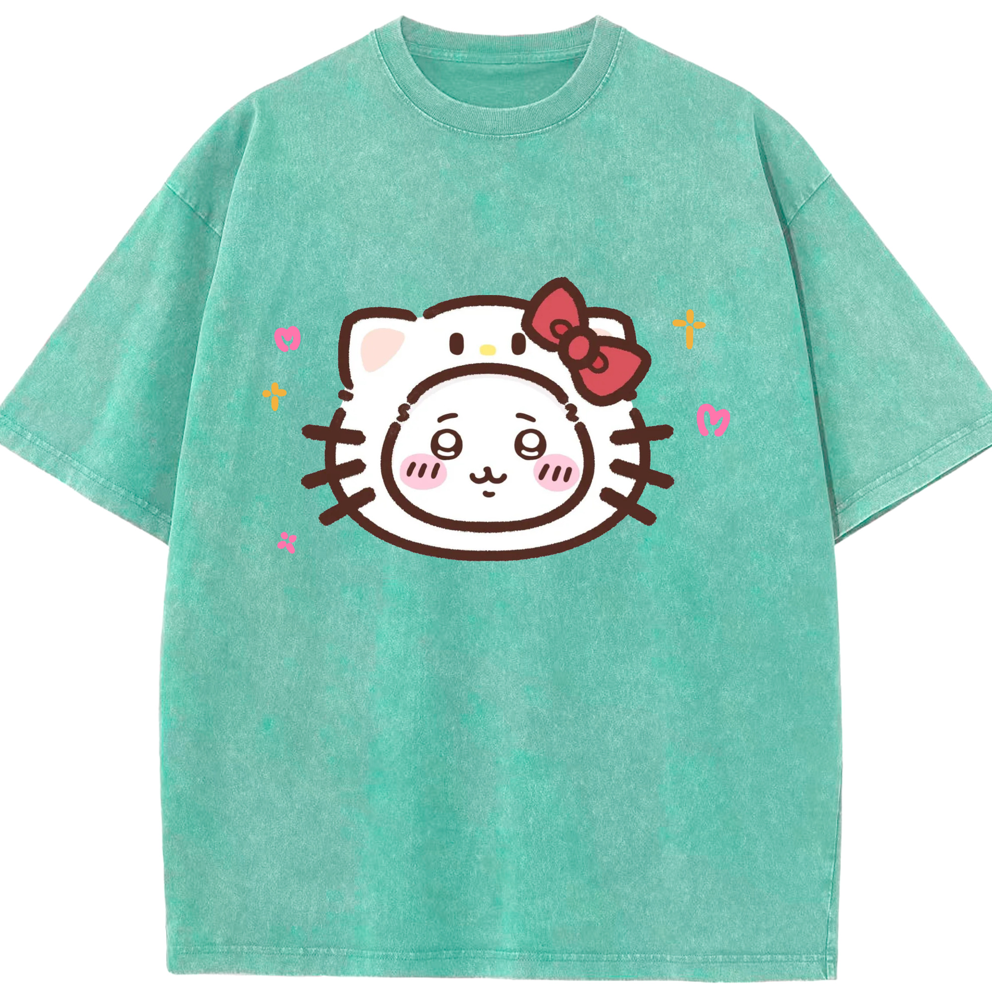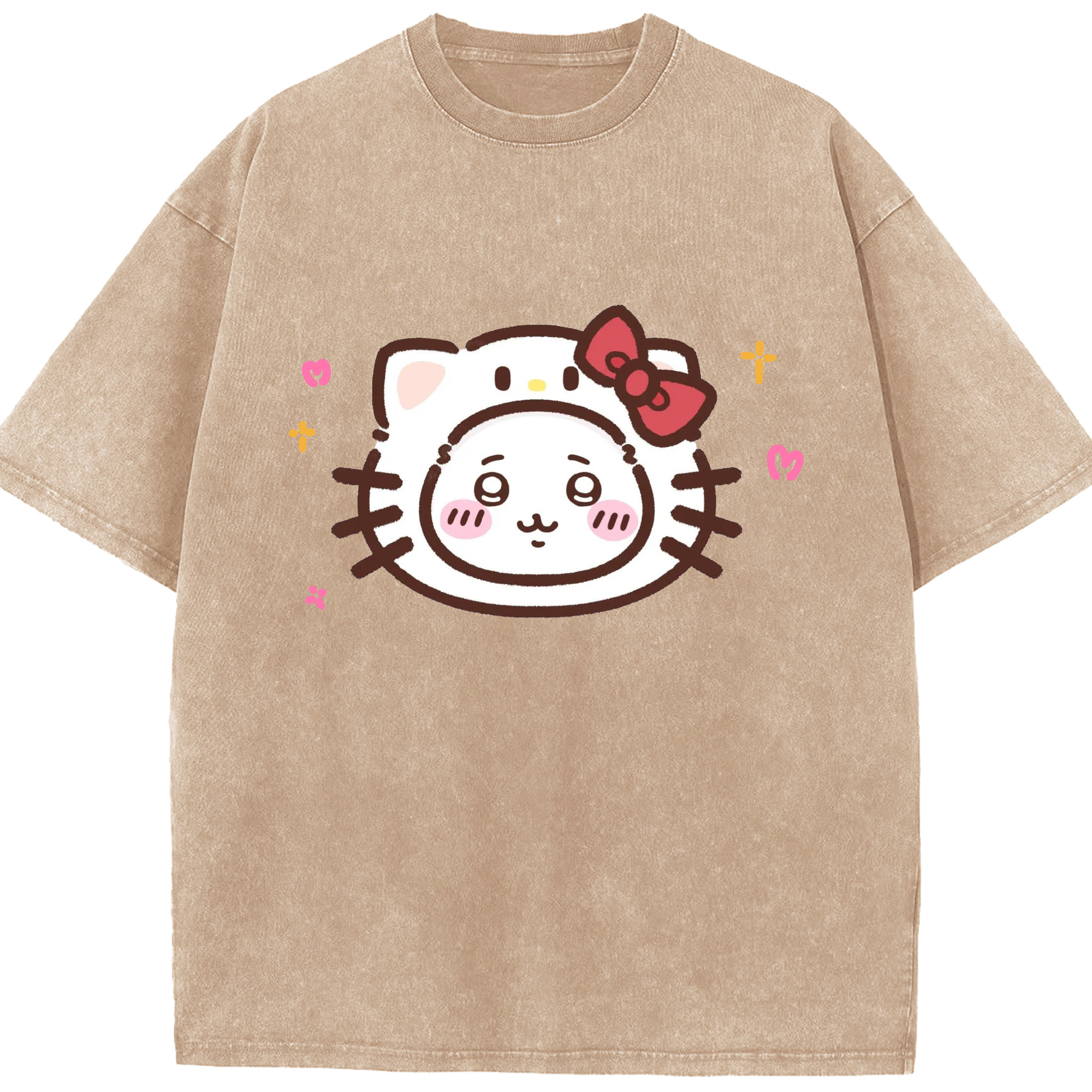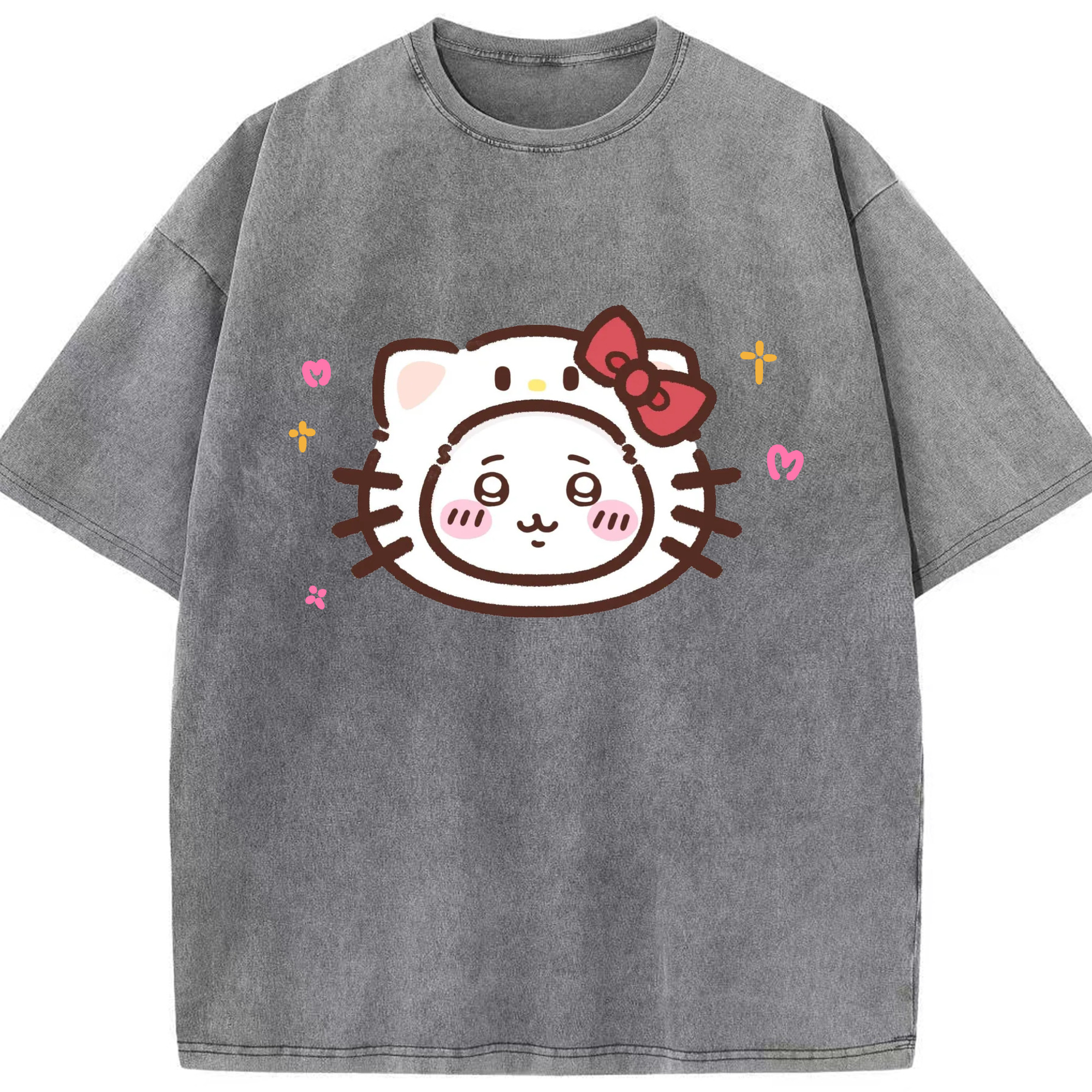 ハローキティ&ちいかわ - 綿100% ヴィンテージ風 半袖Tシャツ ・ 背面プリント ・ 柔らか肌触り ・ 通気性 快適 ・ スポーツ カジュアル 外出用