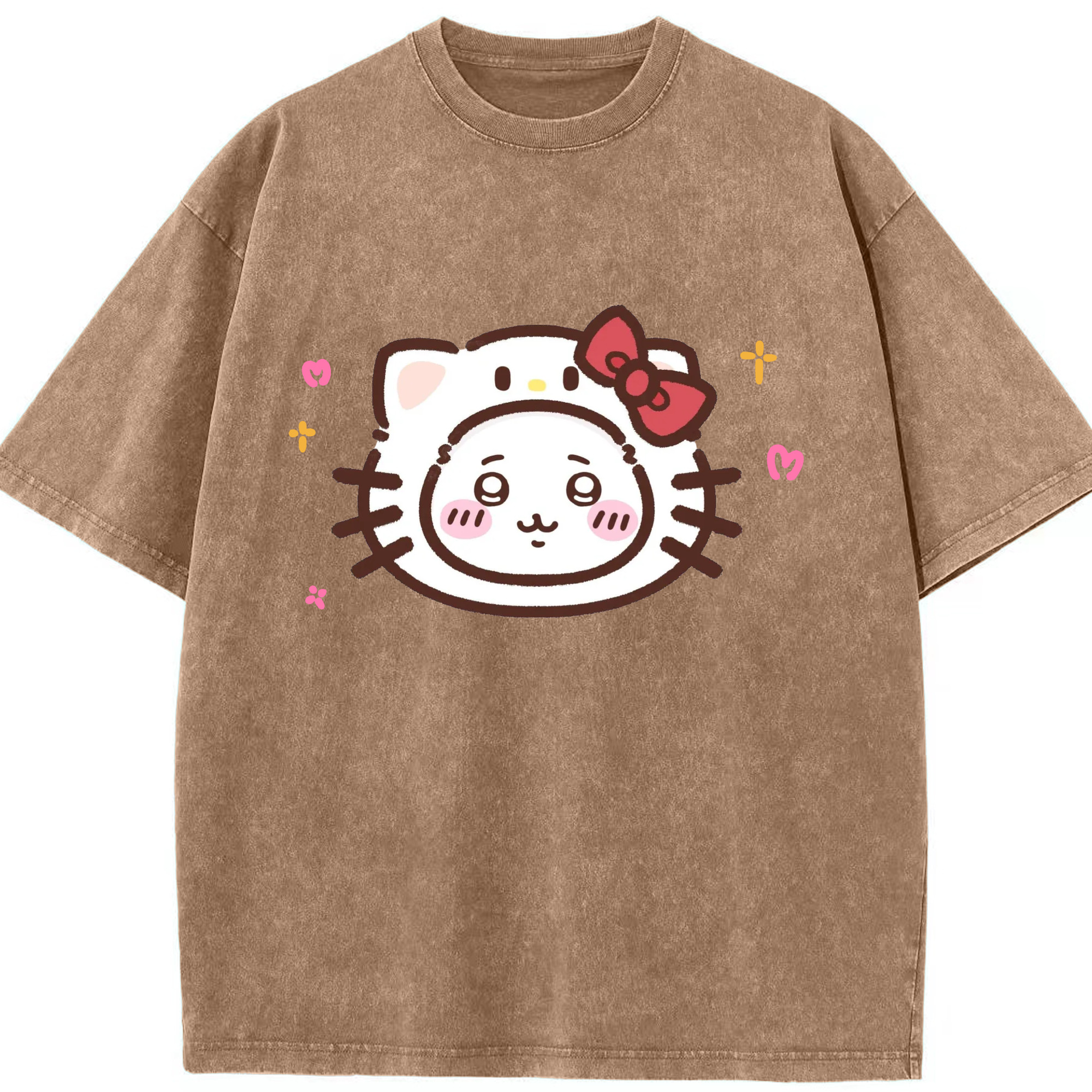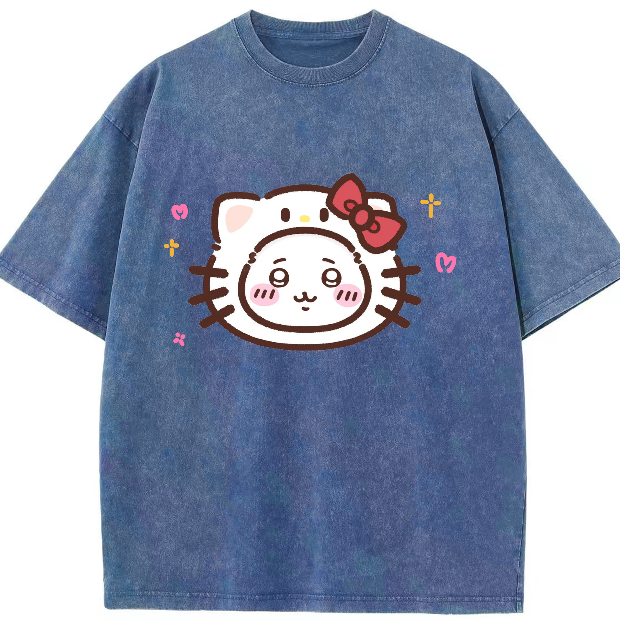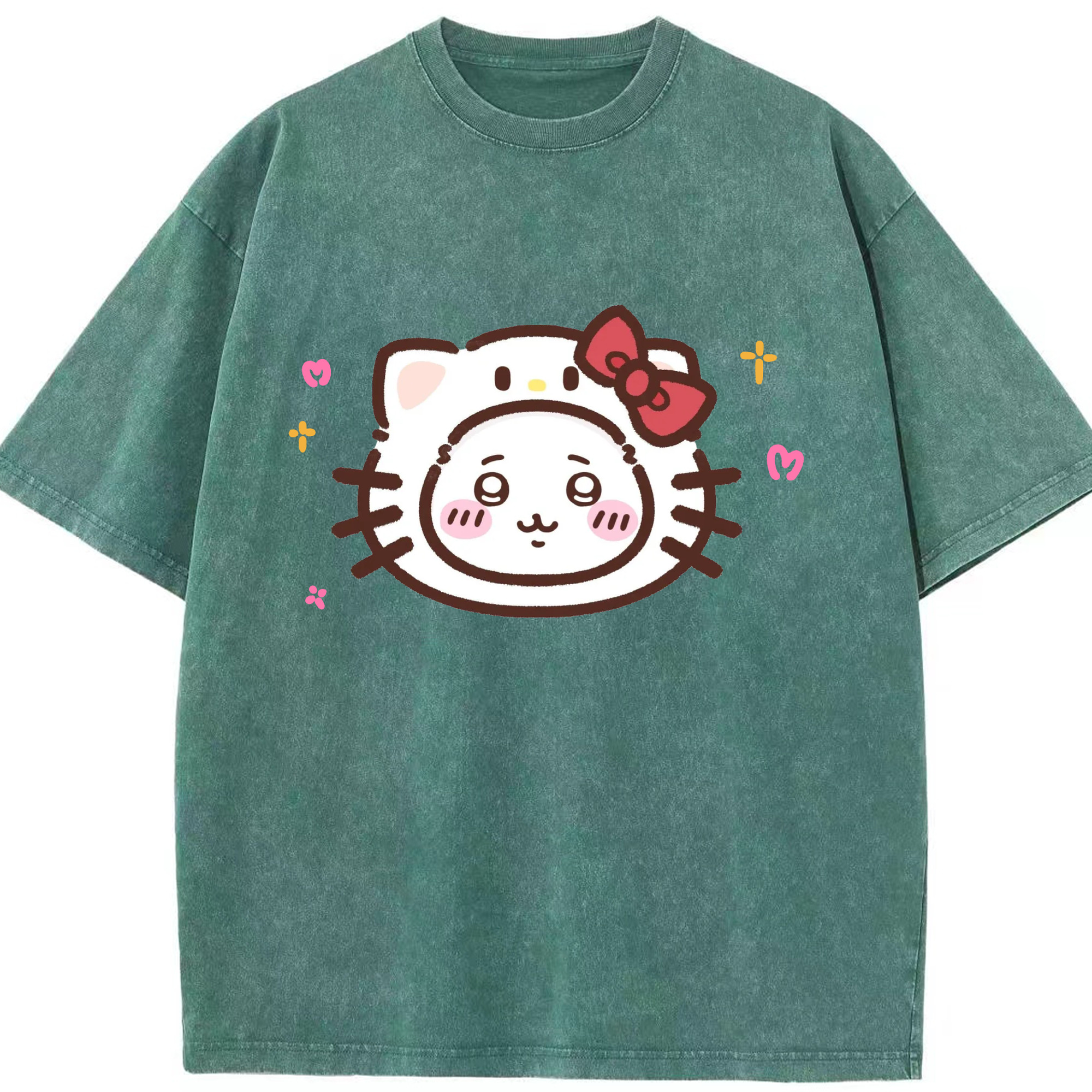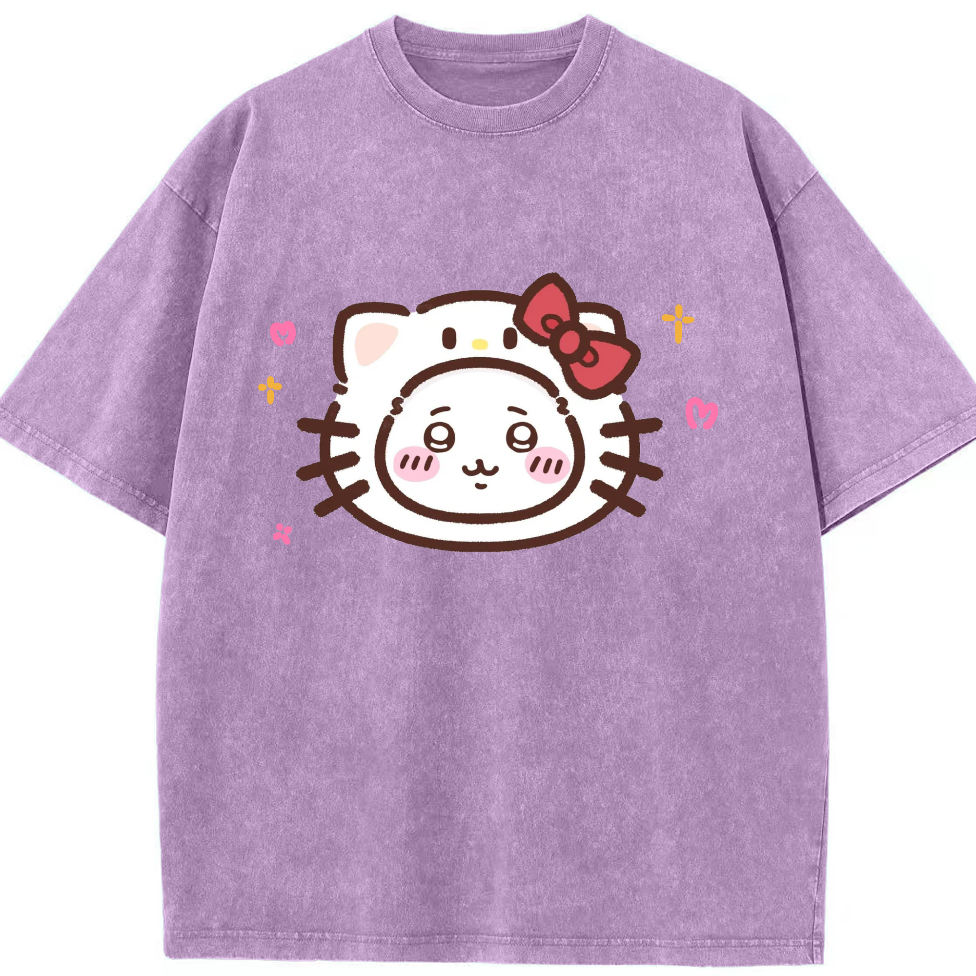 ハローキティ&ちいかわ - 綿100% ヴィンテージ風 半袖Tシャツ ・ 背面プリント ・ 柔らか肌触り ・ 通気性 快適 ・ スポーツ カジュアル 外出用