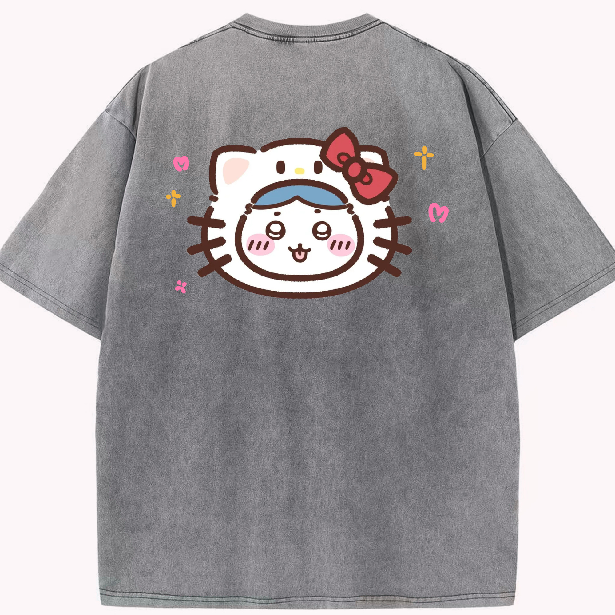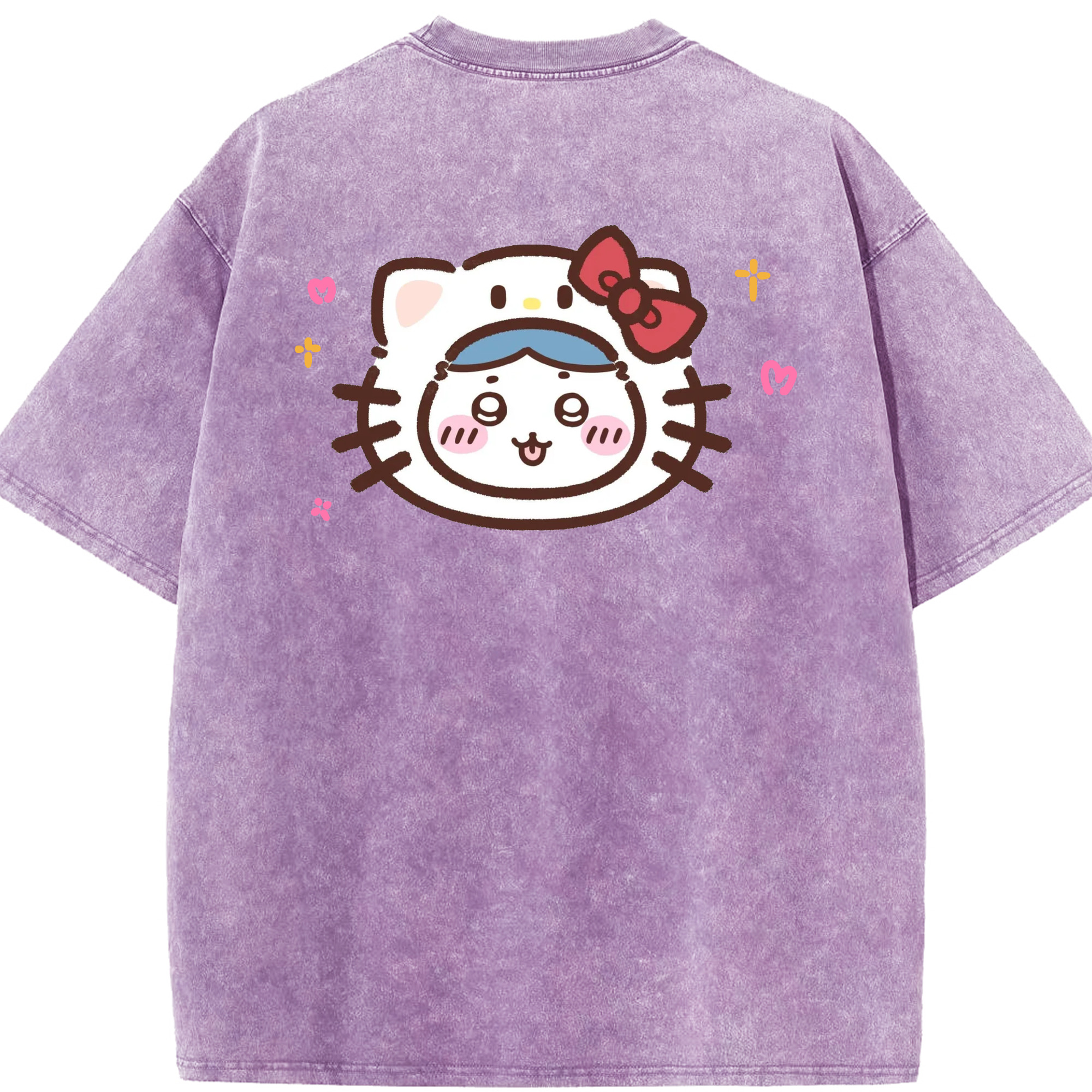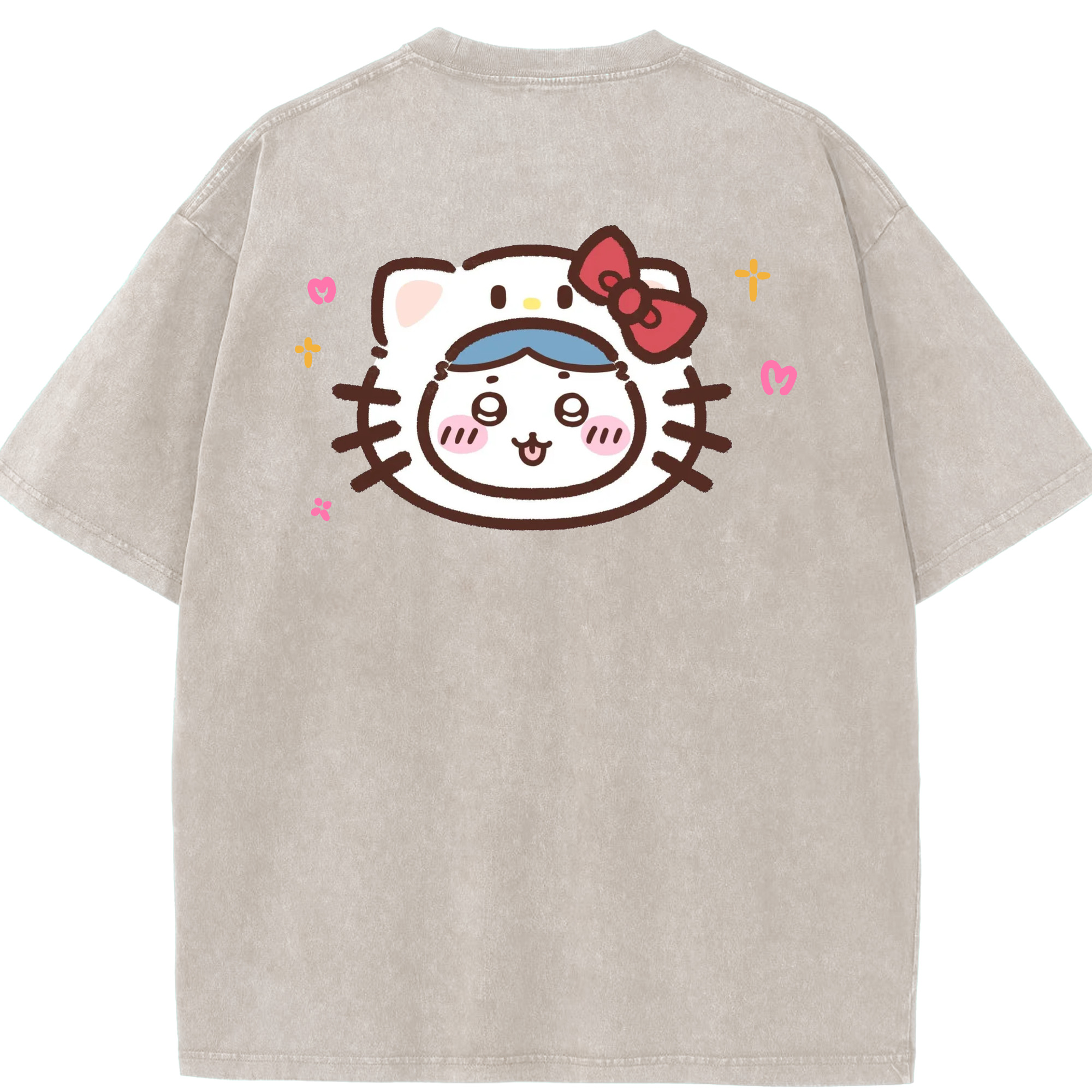 ハローキティ&ちいかわ - 綿100% ヴィンテージ風 半袖Tシャツ ・ 背面プリント ・ 柔らか肌触り ・ 通気性 快適 ・ スポーツ カジュアル 外出用