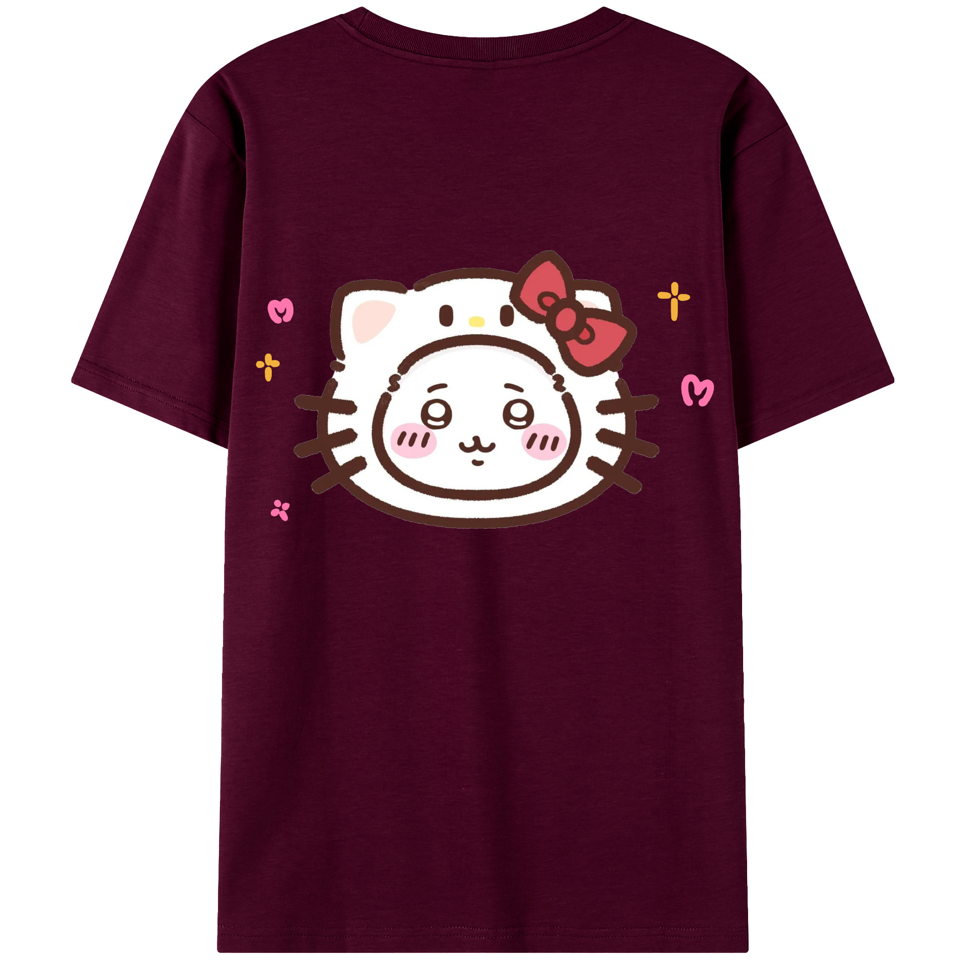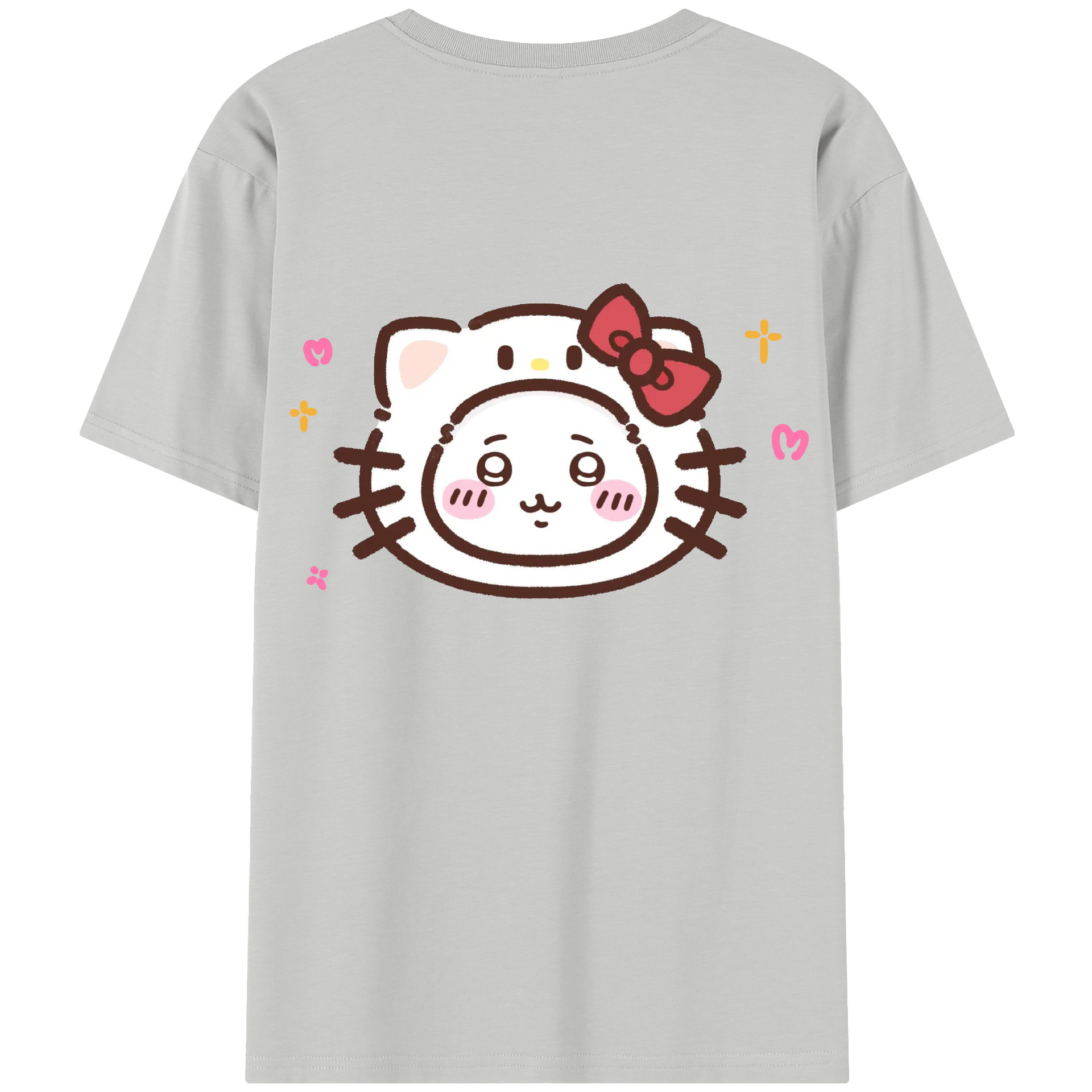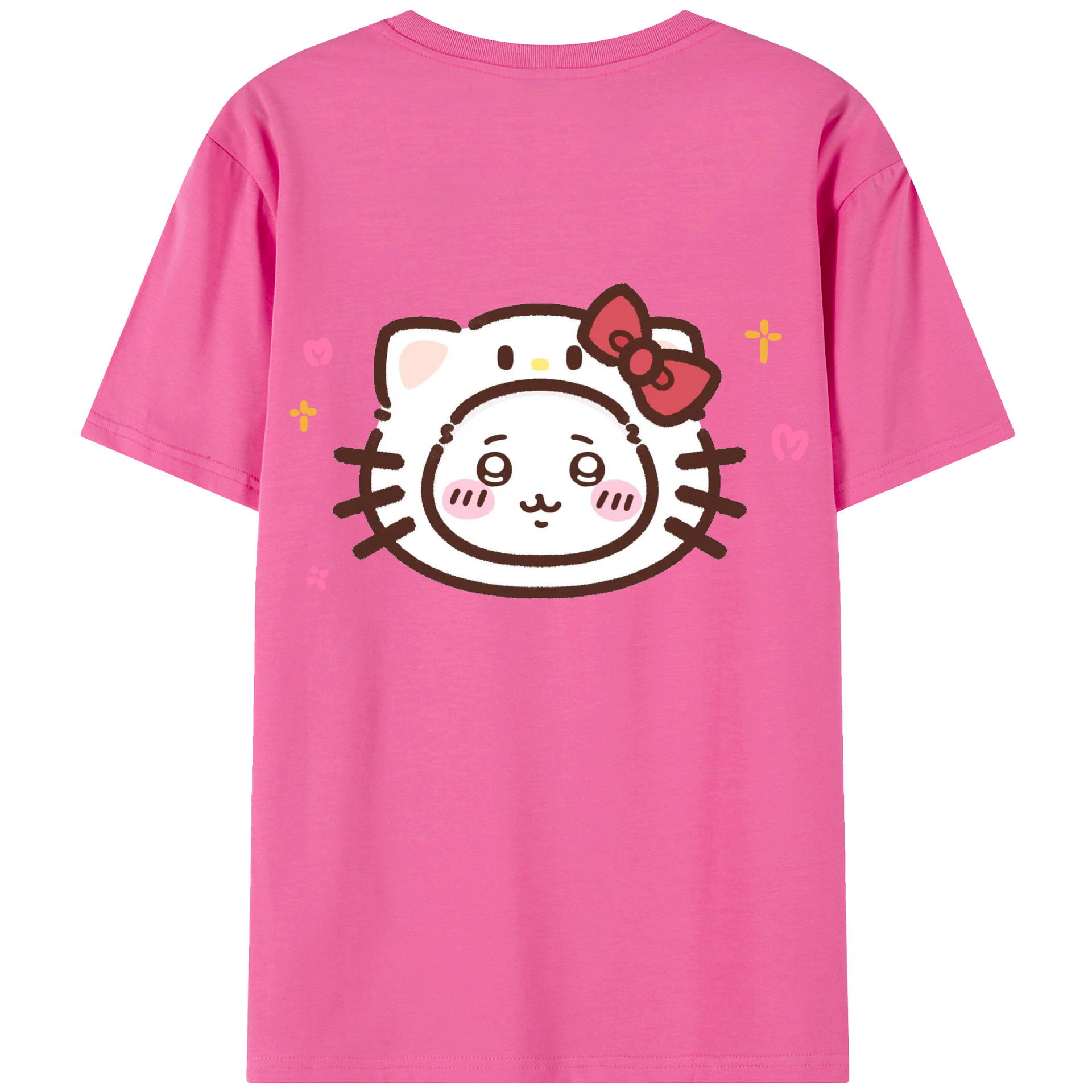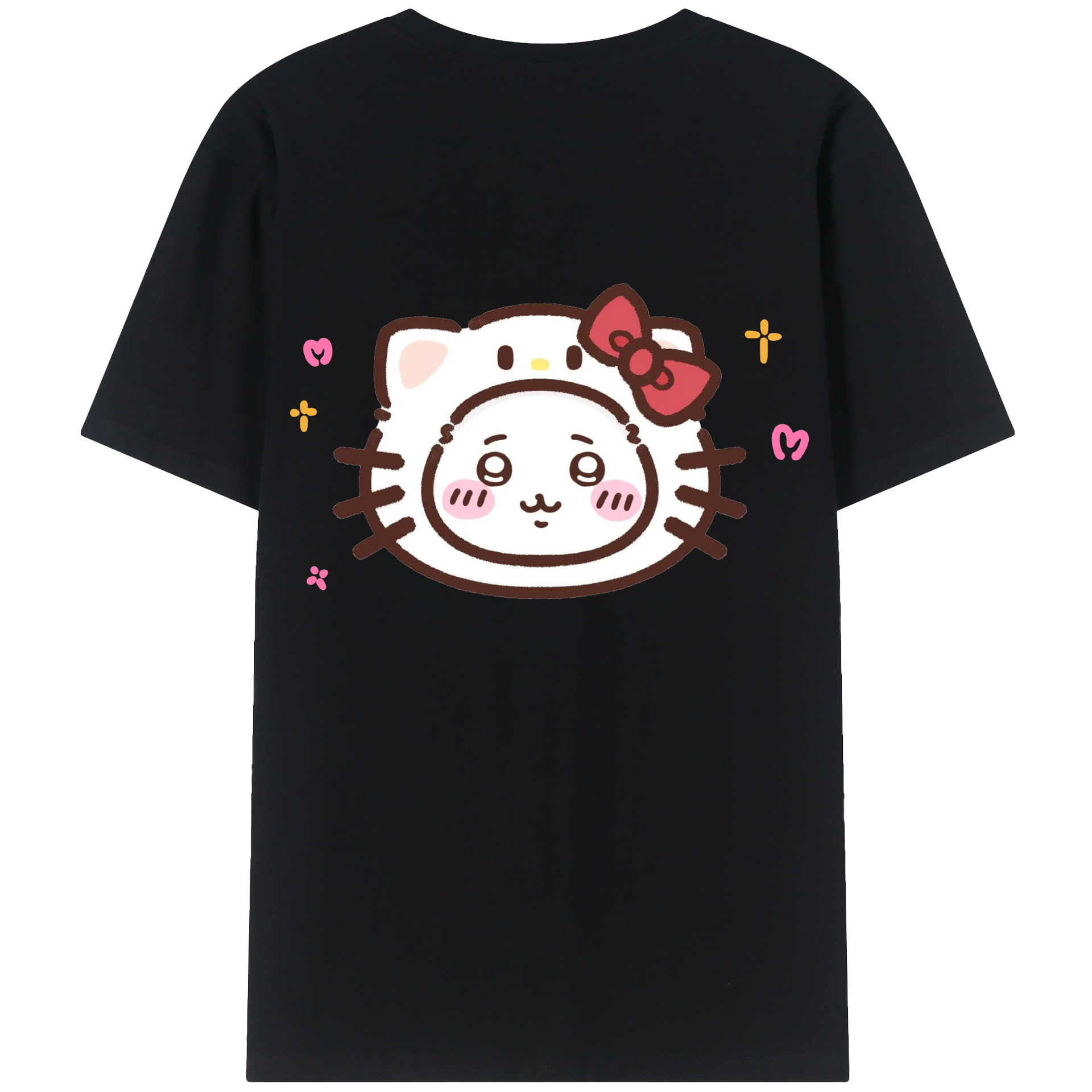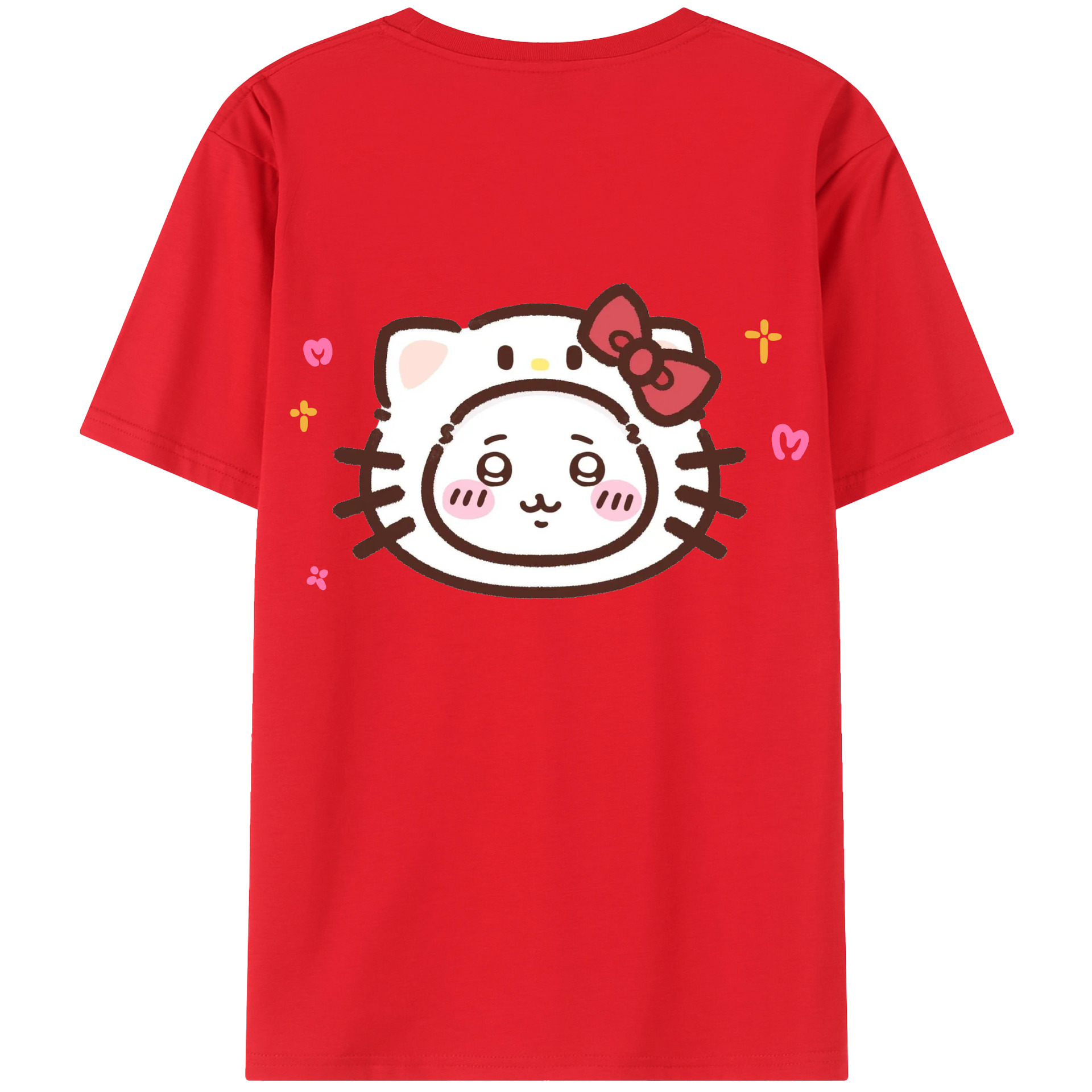 ハローキティ&ちいかわ - レディース半袖Tシャツ ・ 綿100% ・ バックプリント ・ 強化クルーネック ・ 二重折り袖口 ・ 快適 通気性 ・ フィットネス カジュアル 旅行用