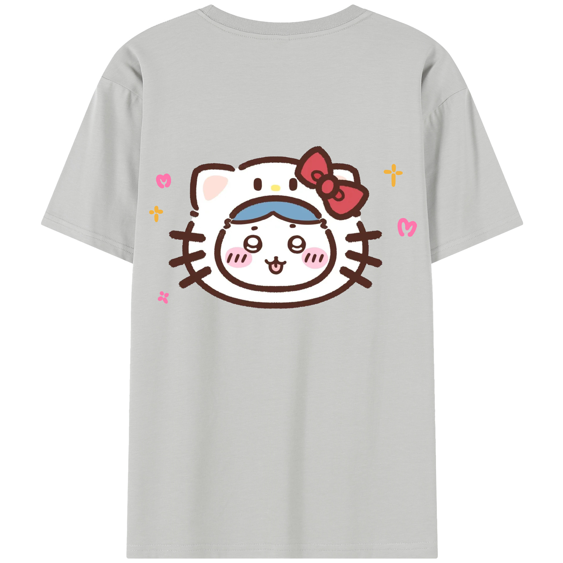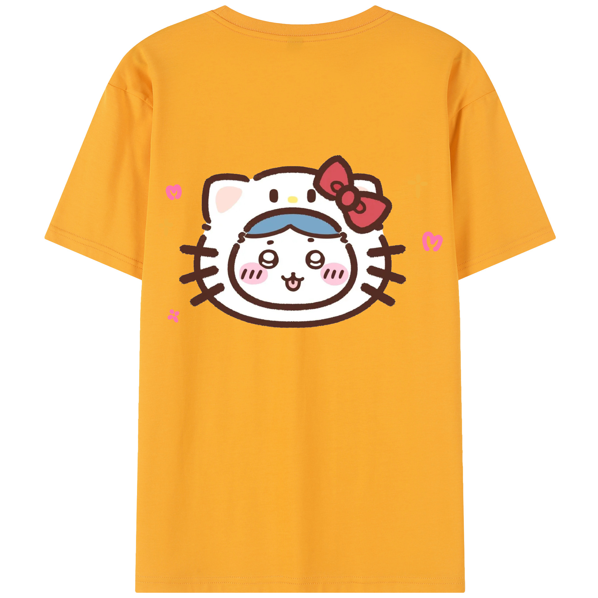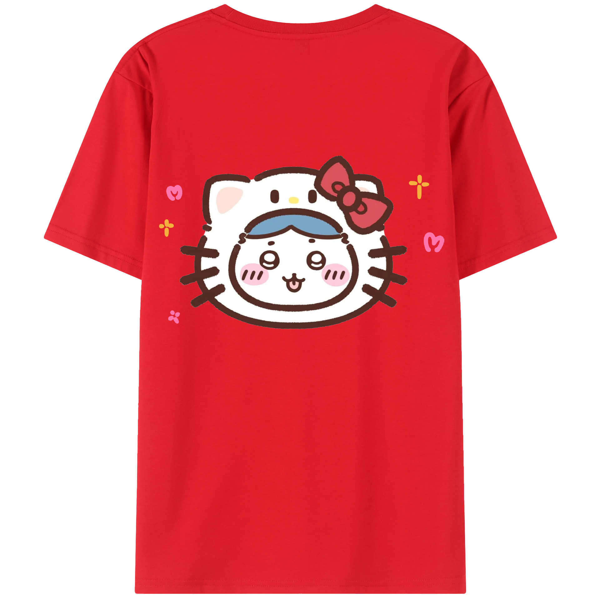ハローキティ&ちいかわ - レディース半袖Tシャツ ・ 綿100% ・ バックプリント ・ 強化クルーネック ・ 二重折り袖口 ・ 快適 通気性 ・ フィットネス カジュアル 旅行用