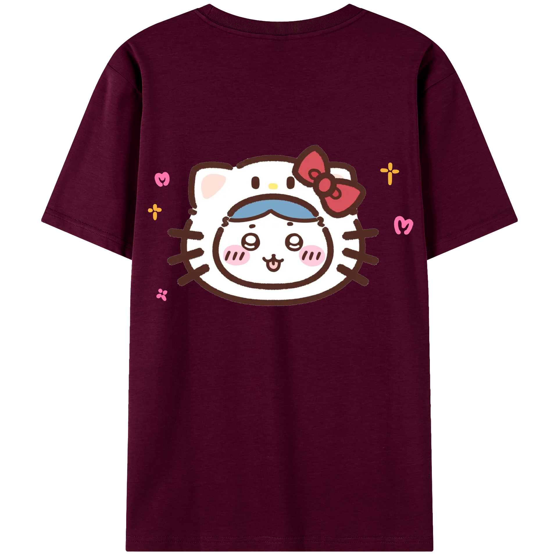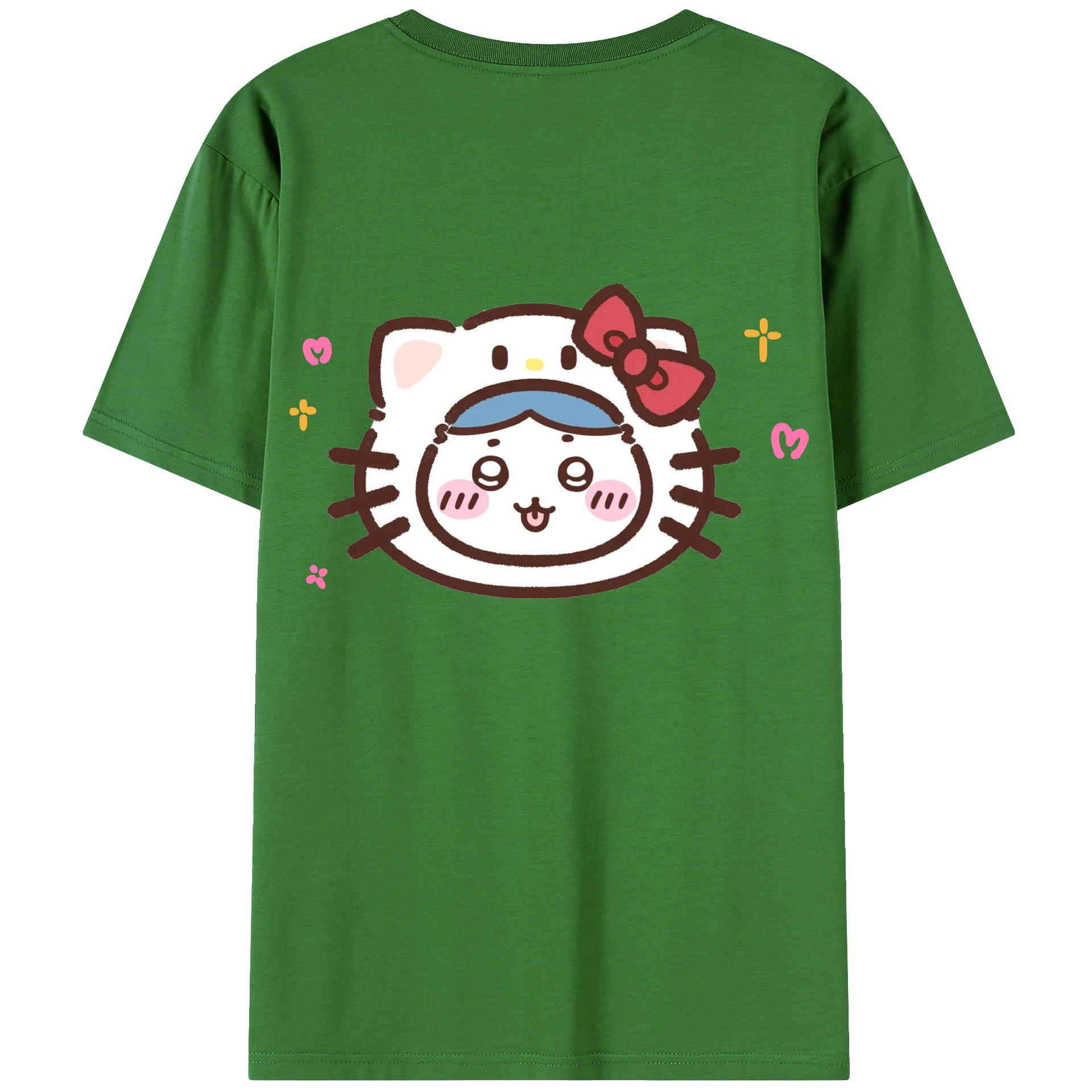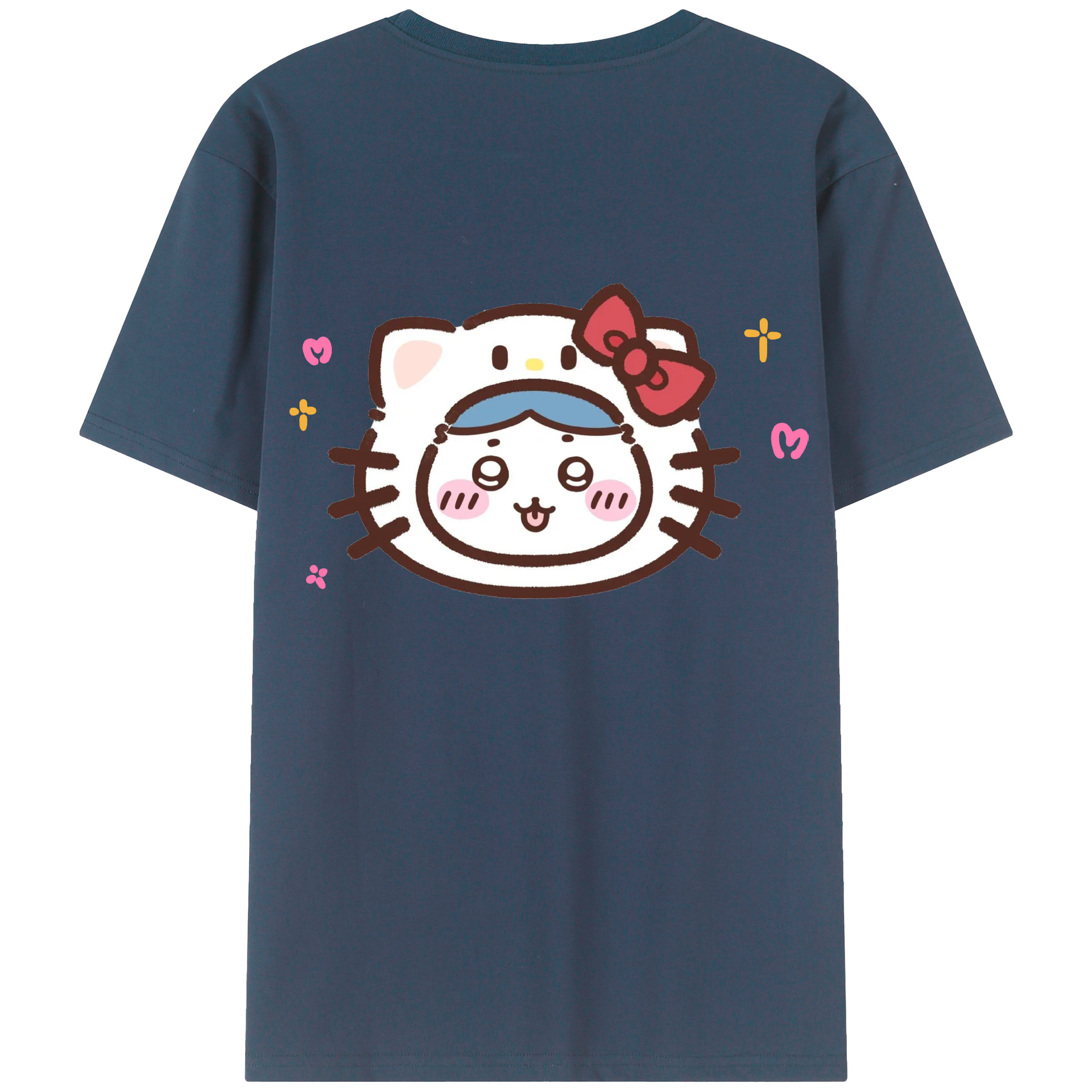 ハローキティ&ちいかわ - レディース半袖Tシャツ ・ 綿100% ・ バックプリント ・ 強化クルーネック ・ 二重折り袖口 ・ 快適 通気性 ・ フィットネス カジュアル 旅行用
