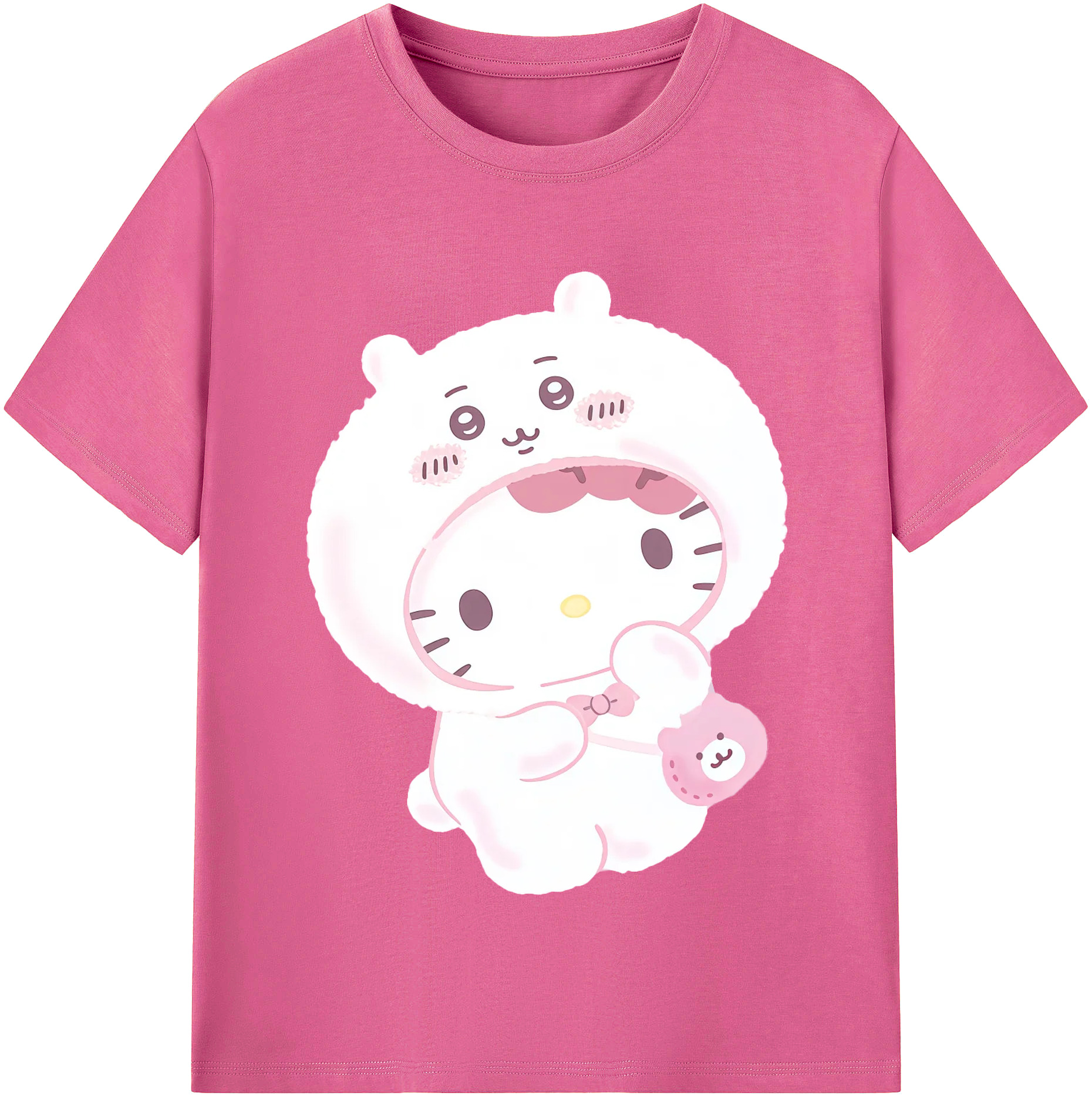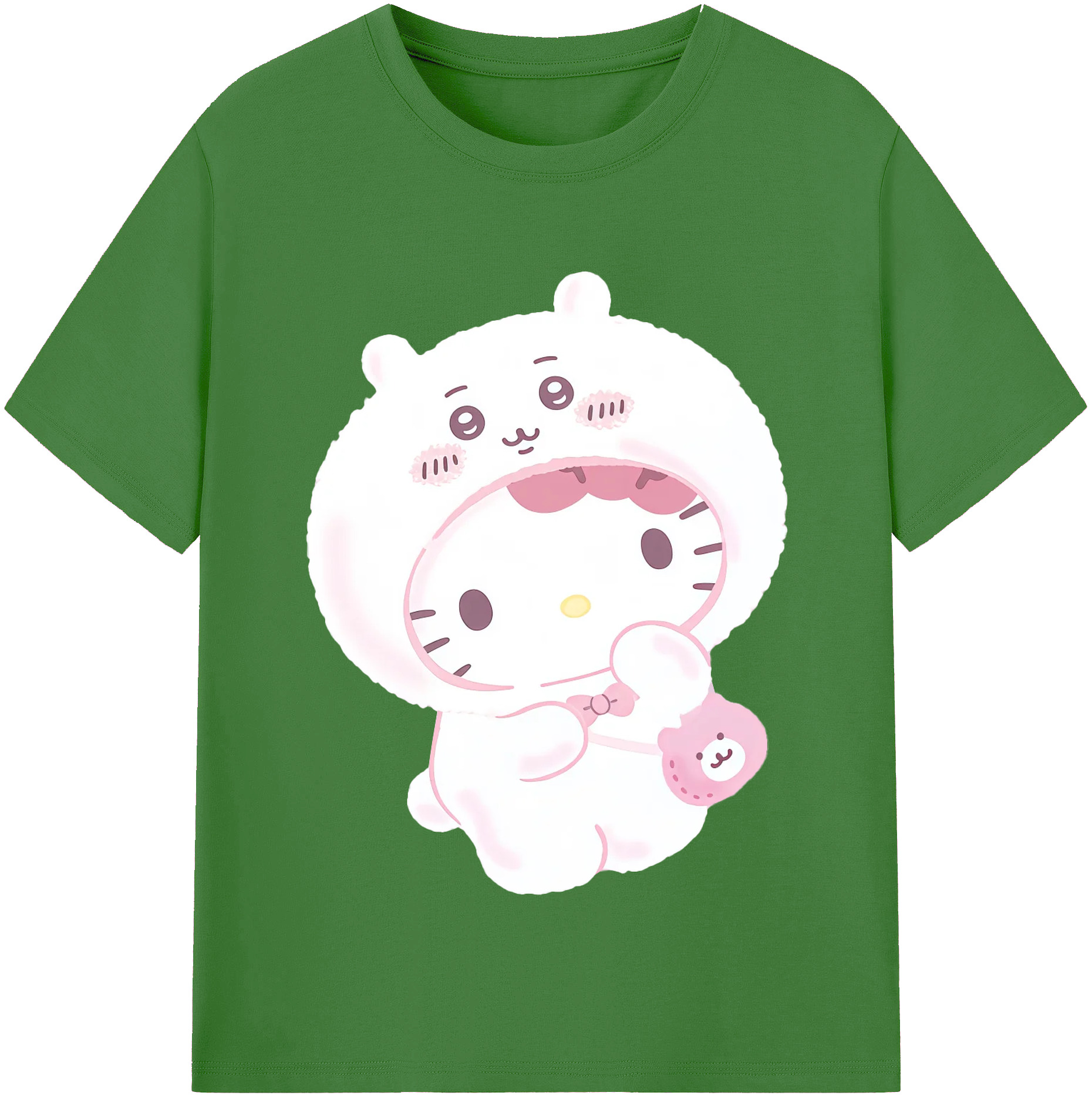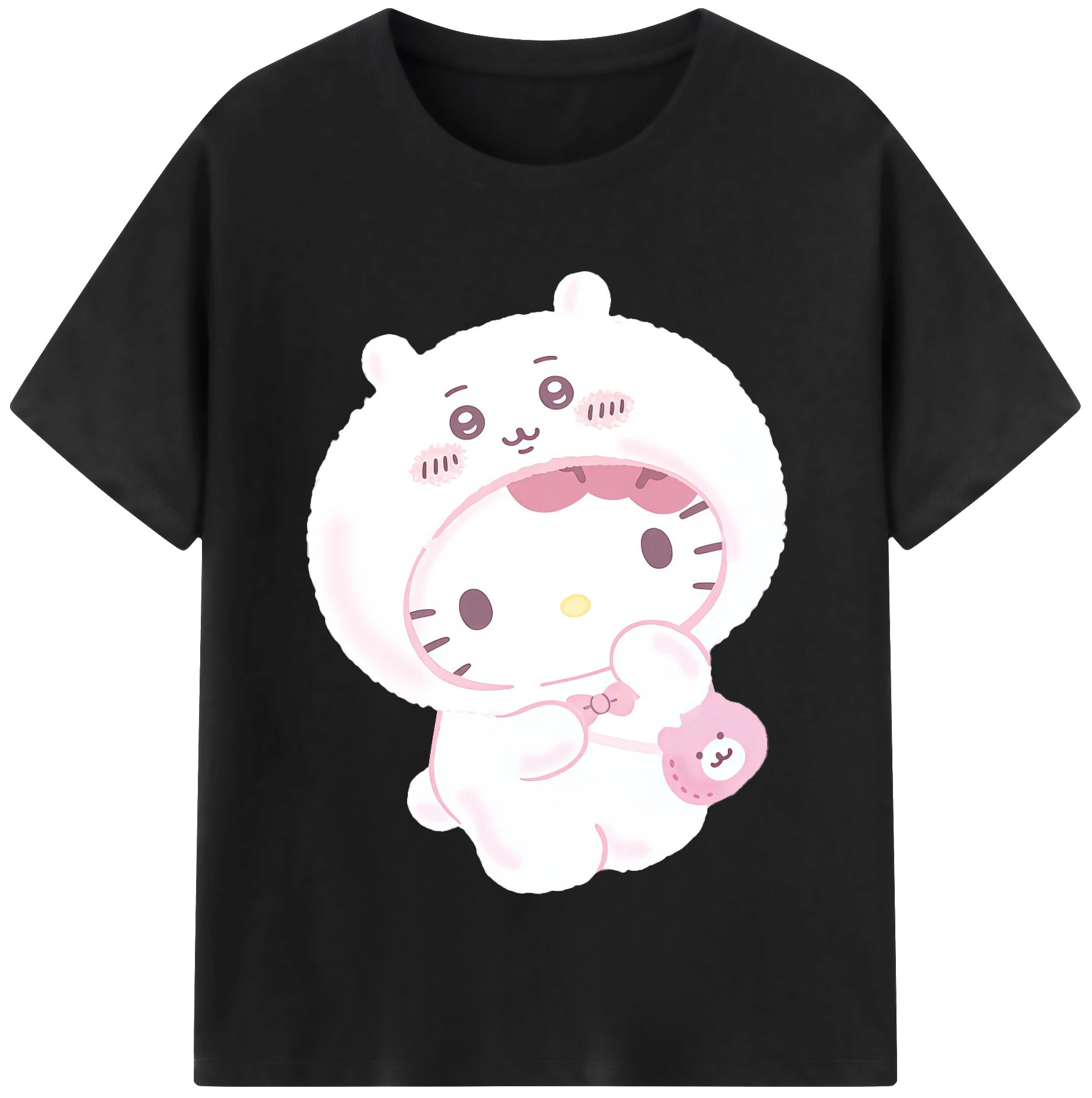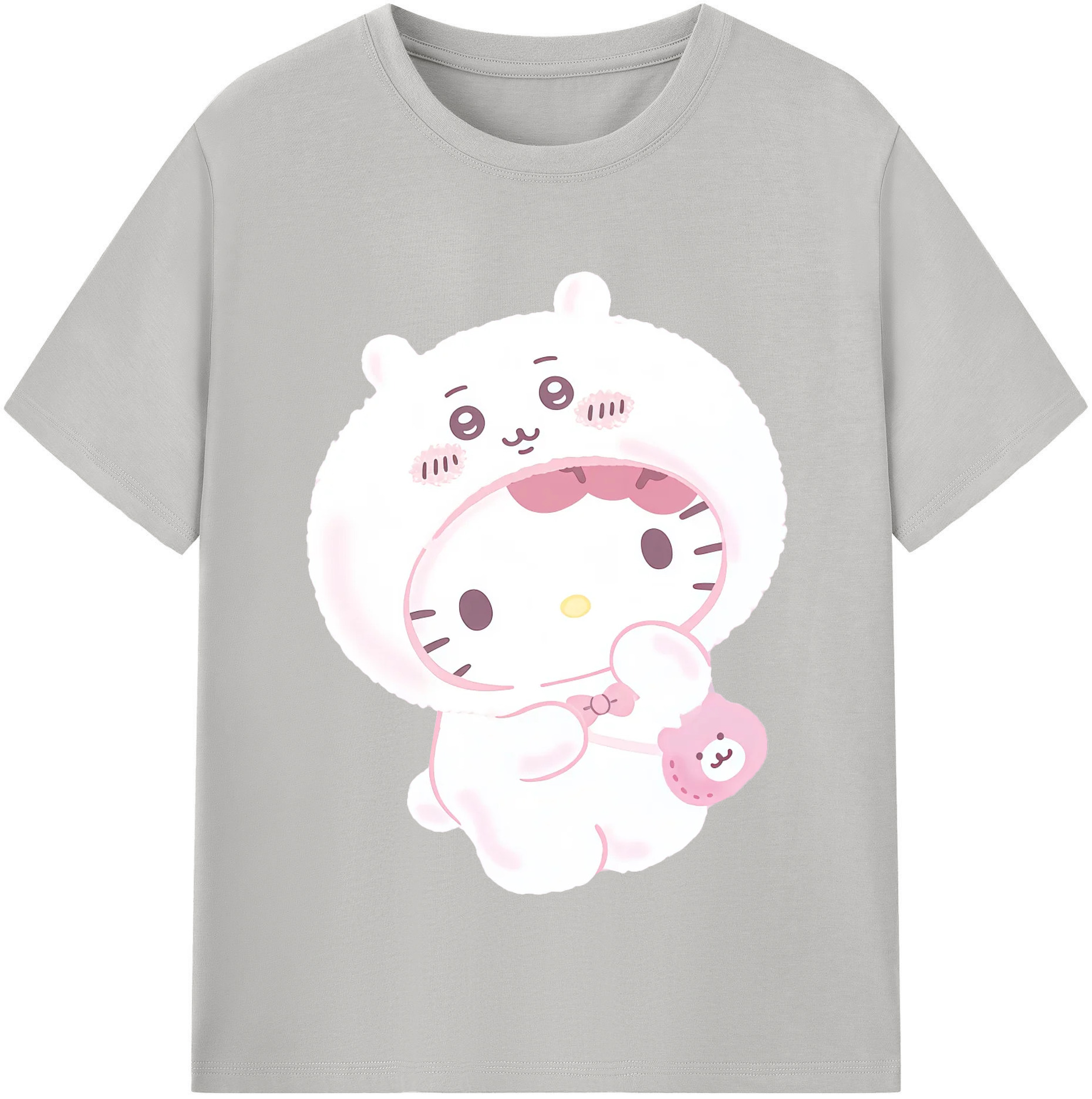 ハローキティ&ちいかわ - レディースカジュアルプリントTシャツ ・ 綿100% ・ クルーネック ・ フロントプリント ・ 柔らかく快適 ・ フィットネス カジュアル 旅行用