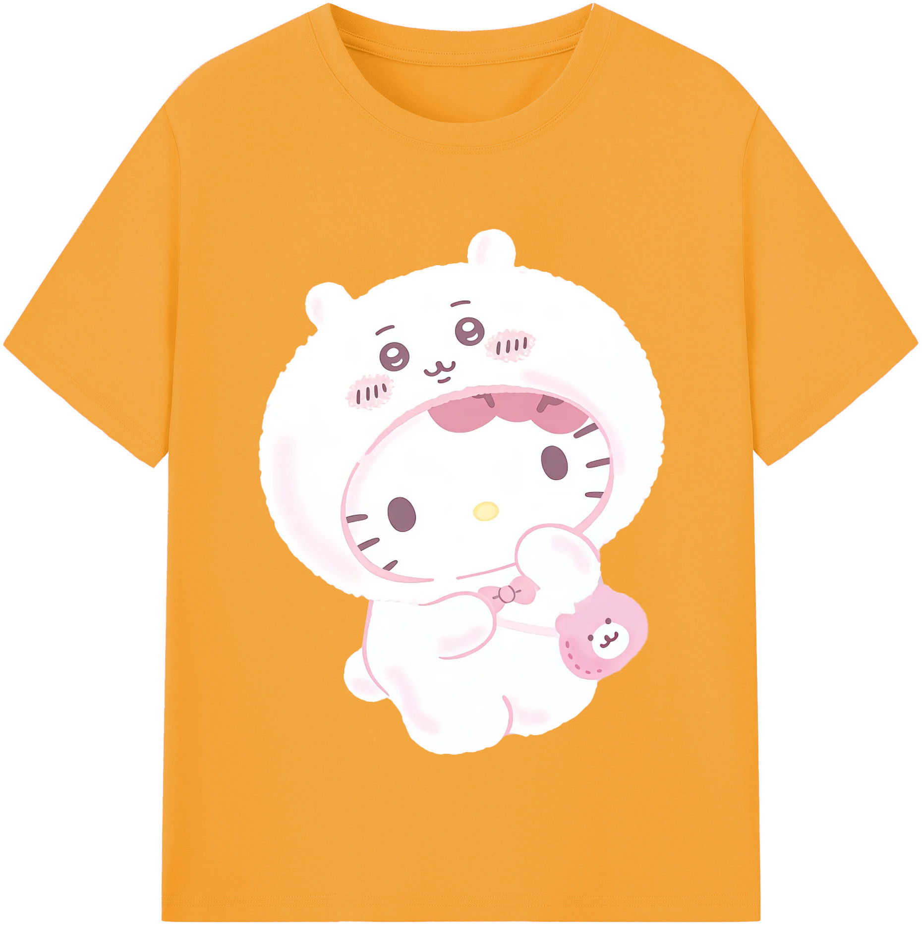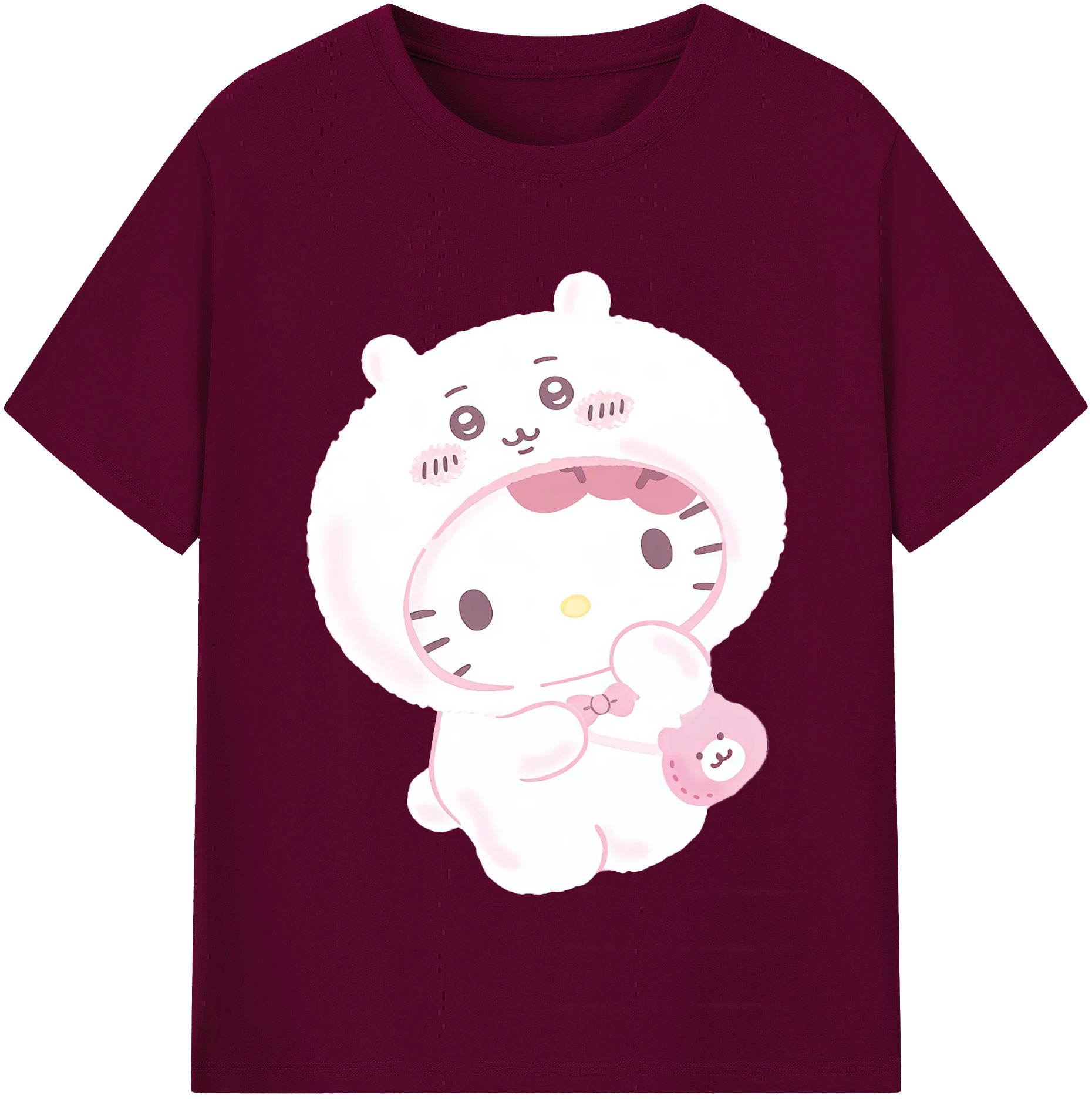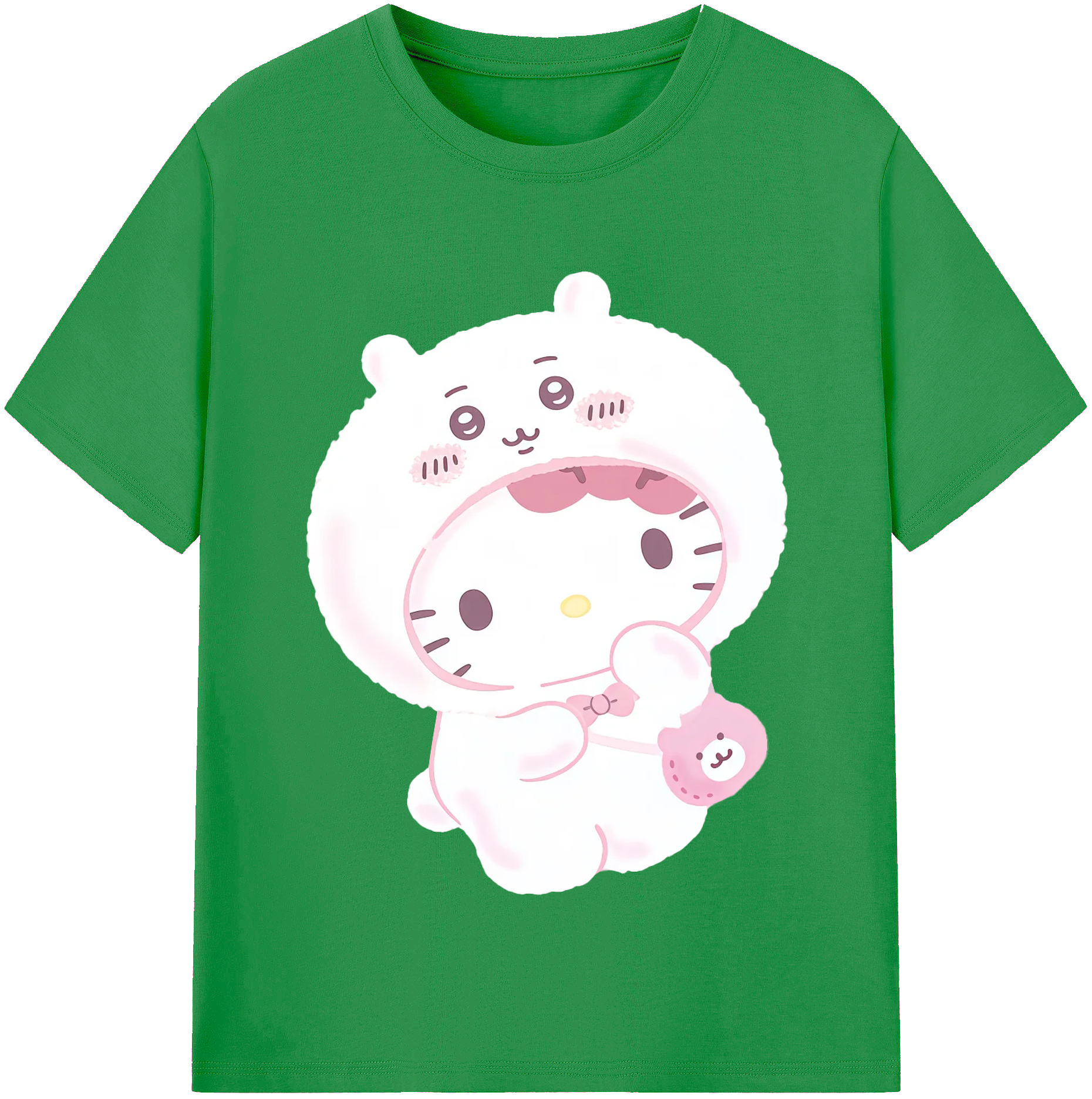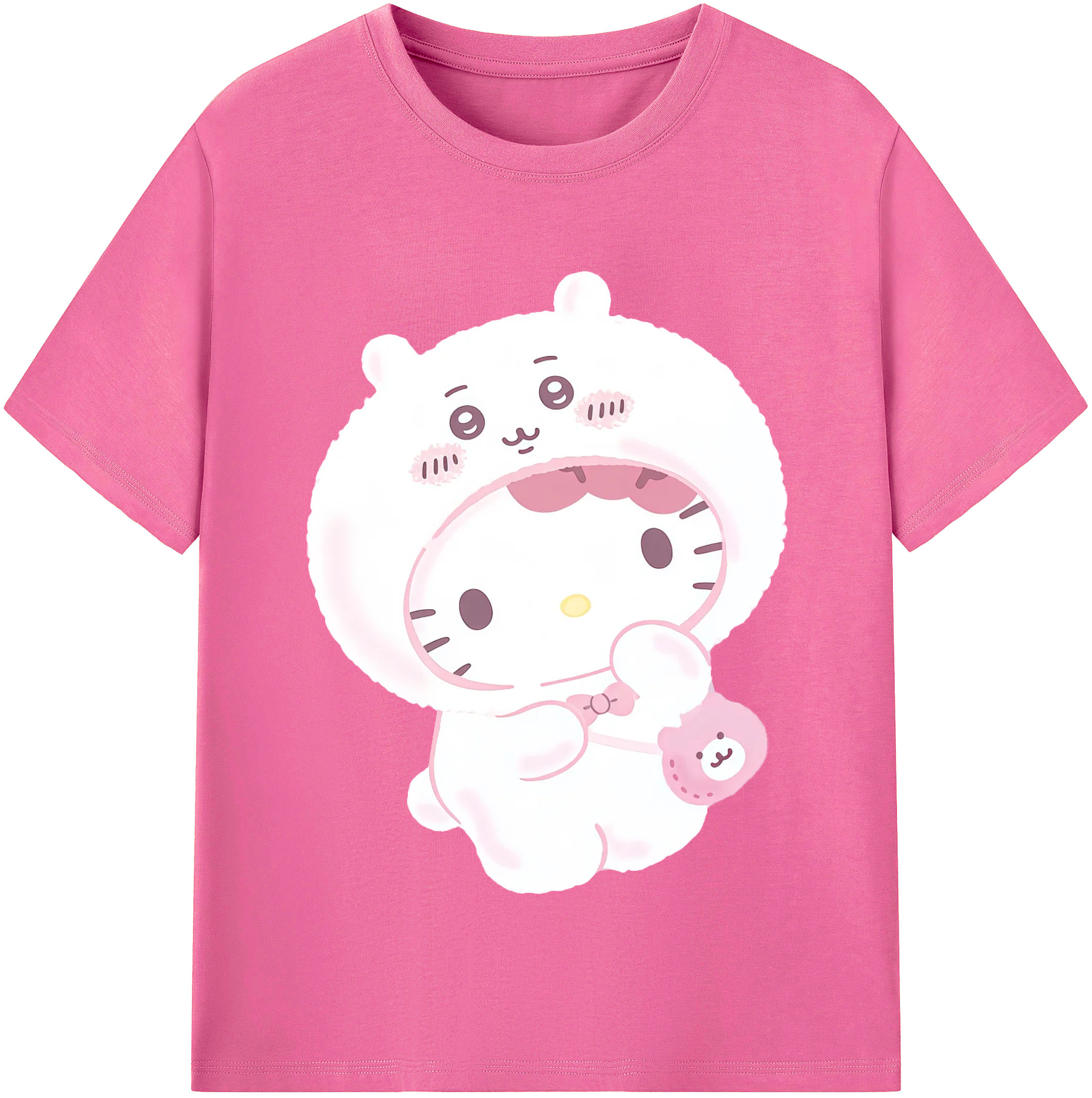ハローキティ&ちいかわ - レディースカジュアルプリントTシャツ ・ 綿100% ・ クルーネック ・ フロントプリント ・ 柔らかく快適 ・ フィットネス カジュアル 旅行用