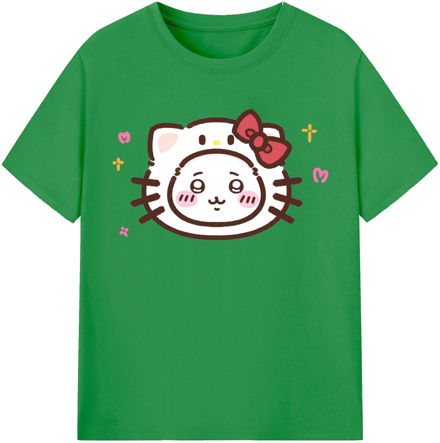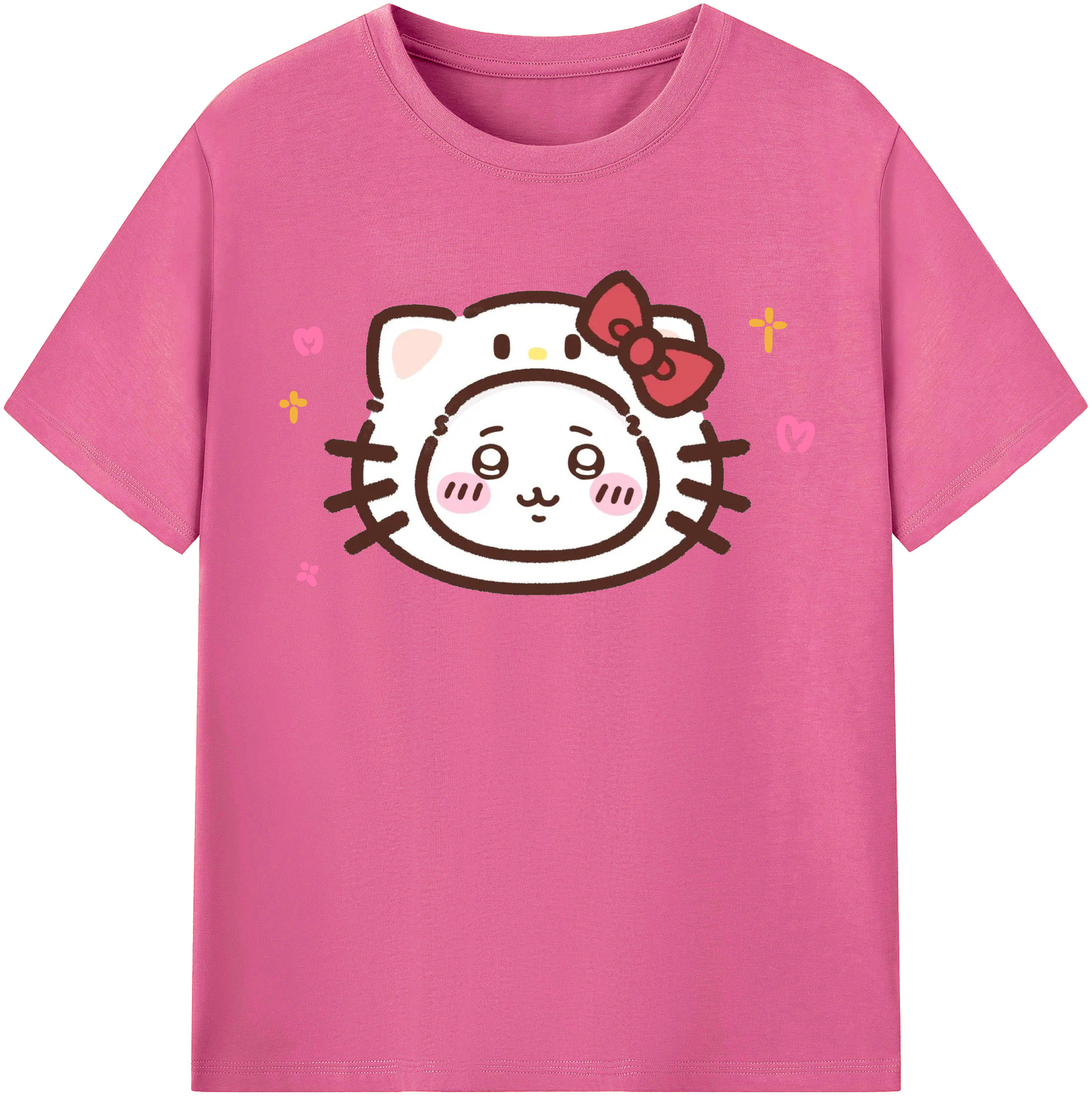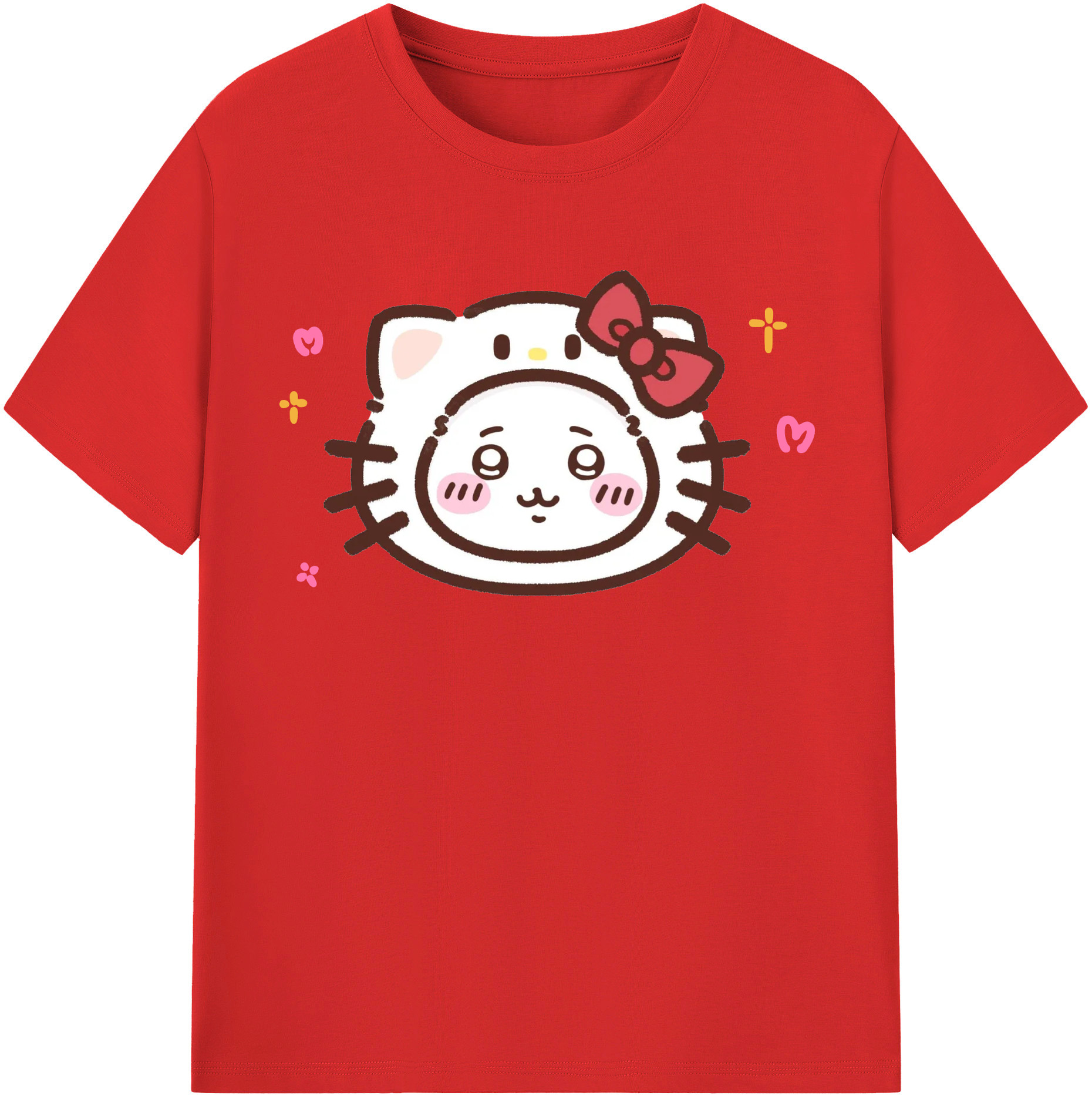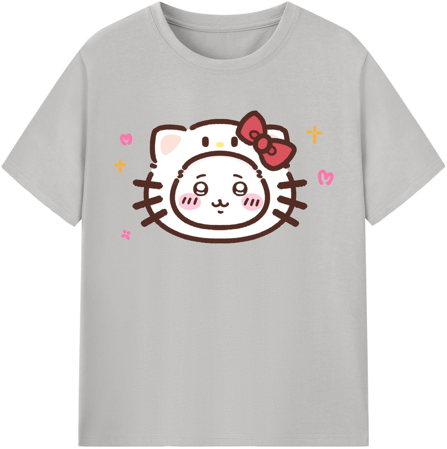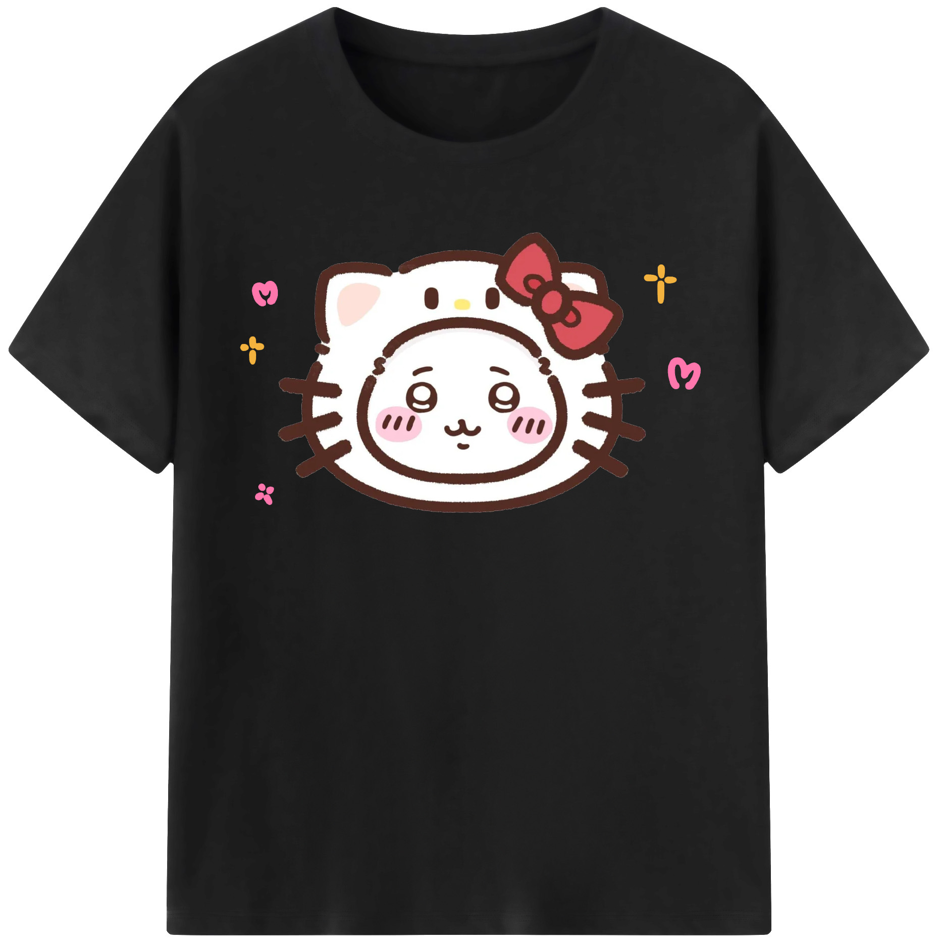 ハローキティ&ちいかわ - レディースカジュアルプリントTシャツ ・ 綿100% ・ クルーネック ・ フロントプリント ・ 柔らかく快適 ・ フィットネス カジュアル 旅行用