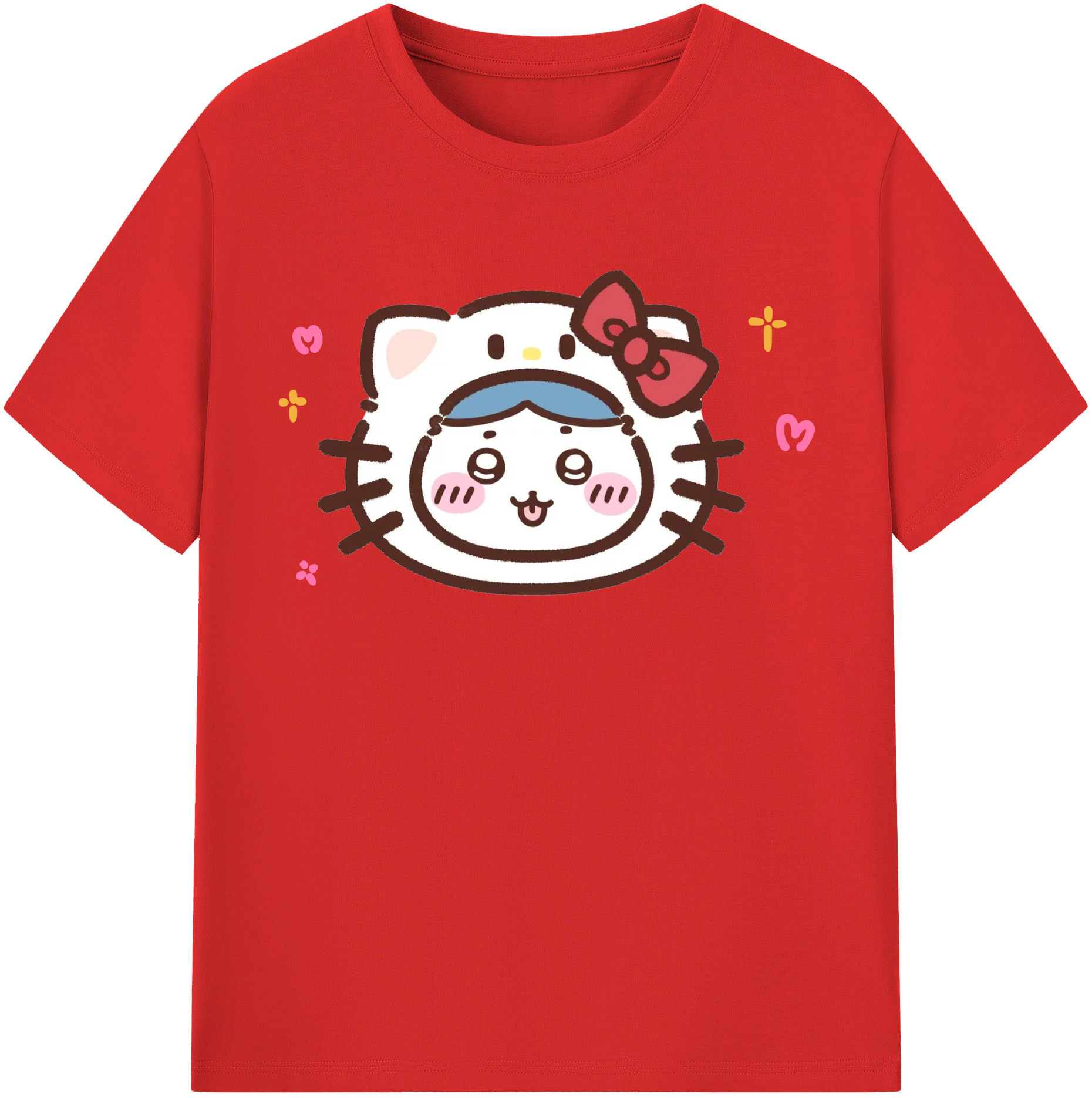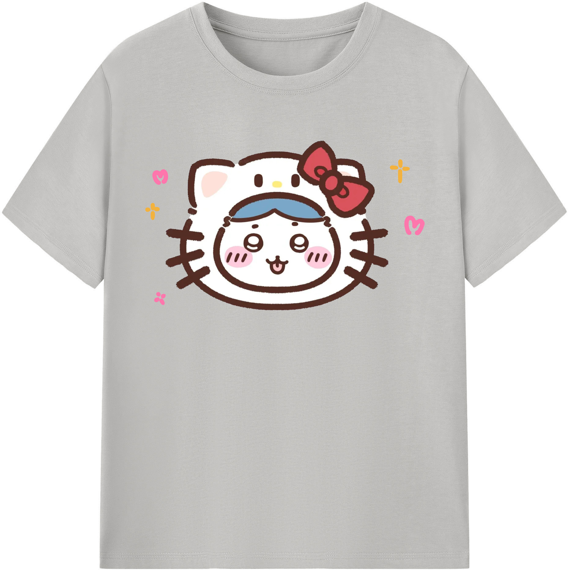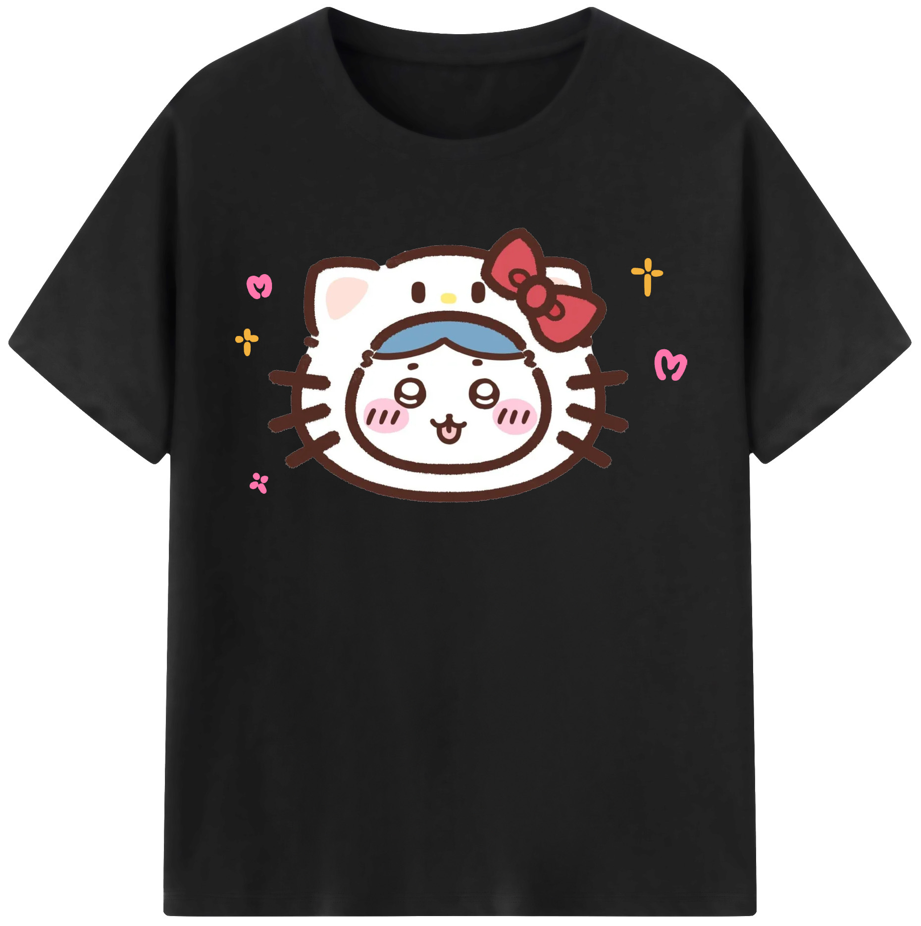 ハローキティ&ちいかわ - レディースカジュアルプリントTシャツ ・ 綿100% ・ クルーネック ・ フロントプリント ・ 柔らかく快適 ・ フィットネス カジュアル 旅行用