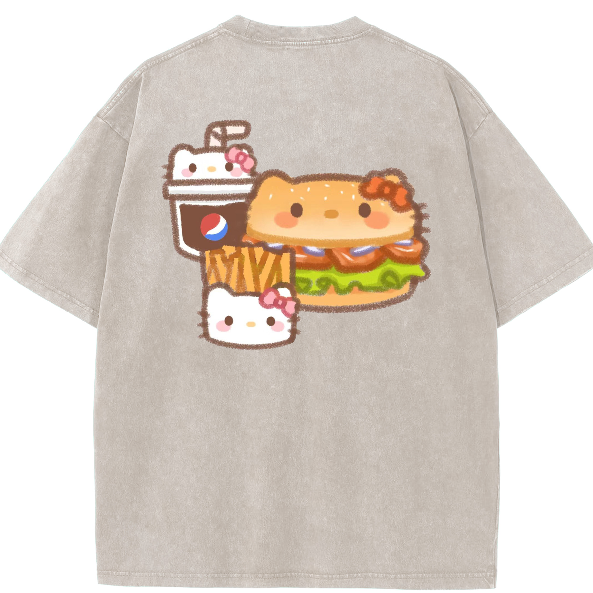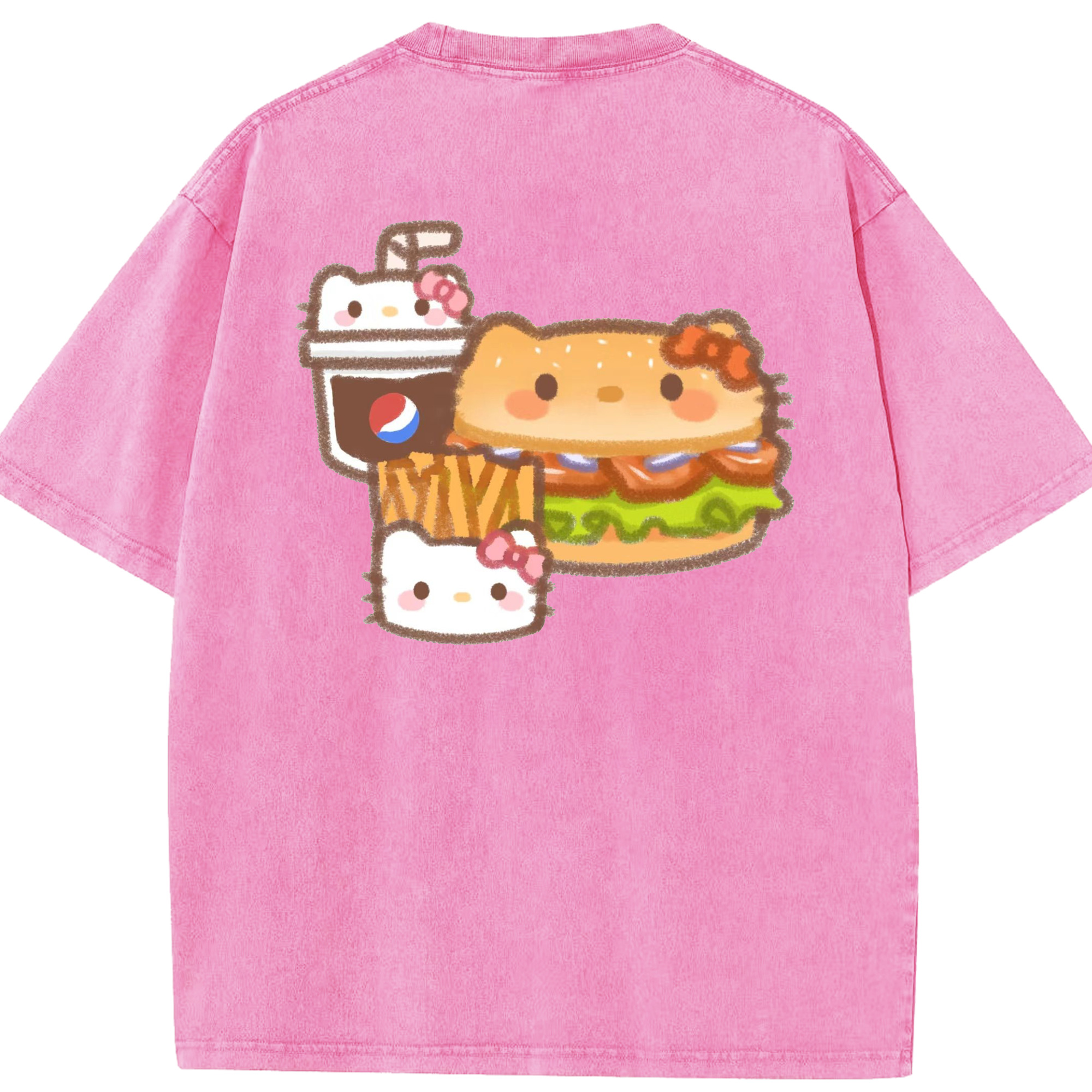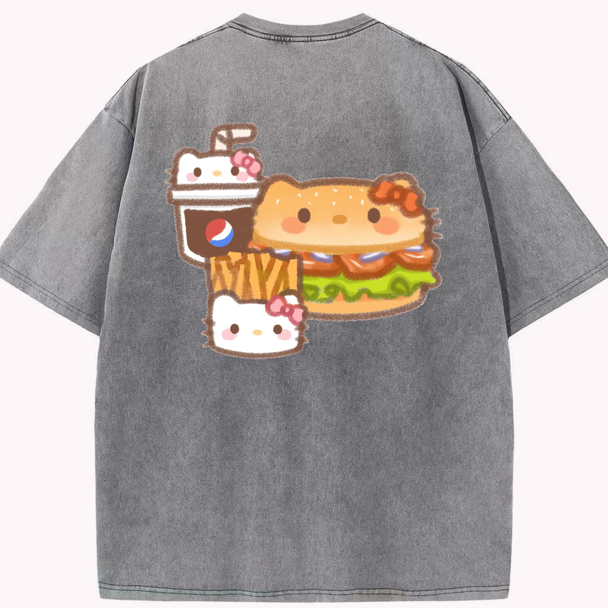 ハンバーガーになったハローキティ - 綿100% ヴィンテージ風 半袖Tシャツ ・ フロントプリント ・ 柔らか肌触り ・ 通気性 快適 ・ スポーツ カジュアル 外出用