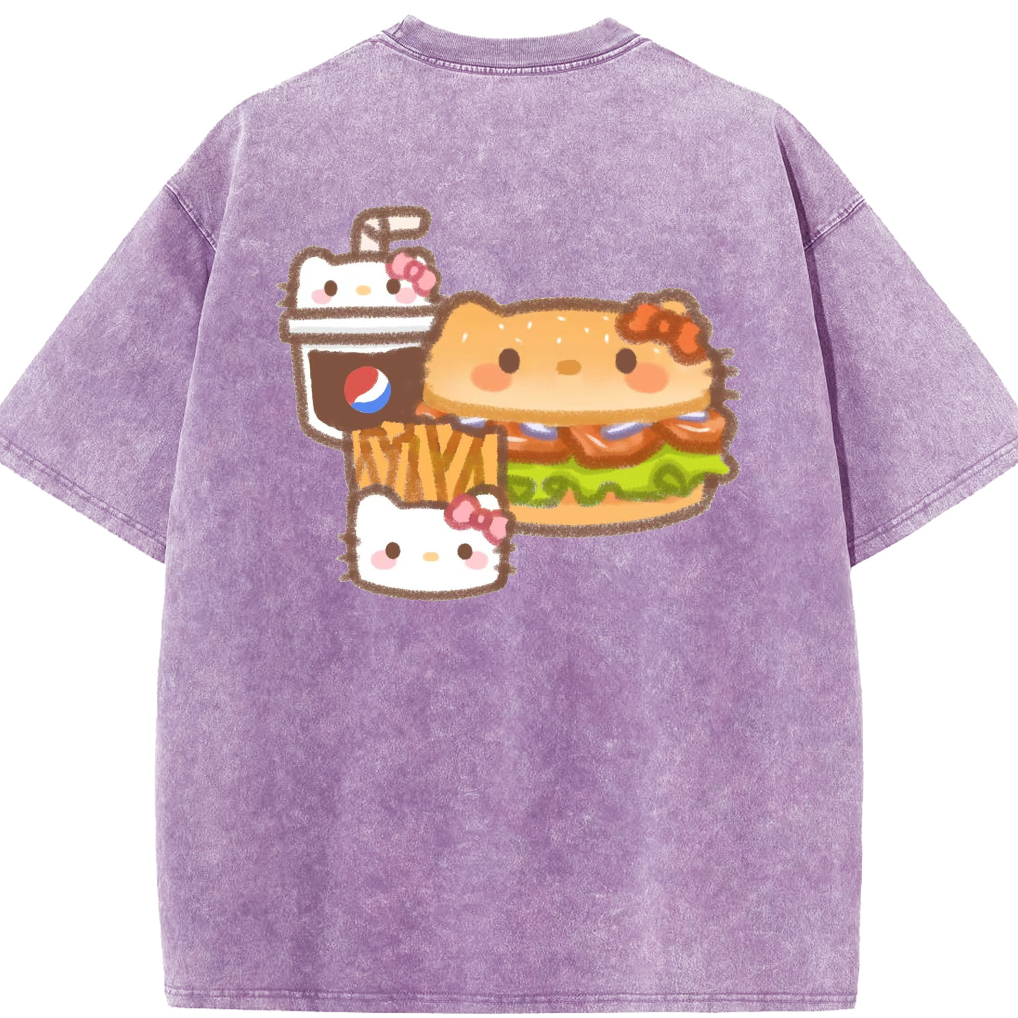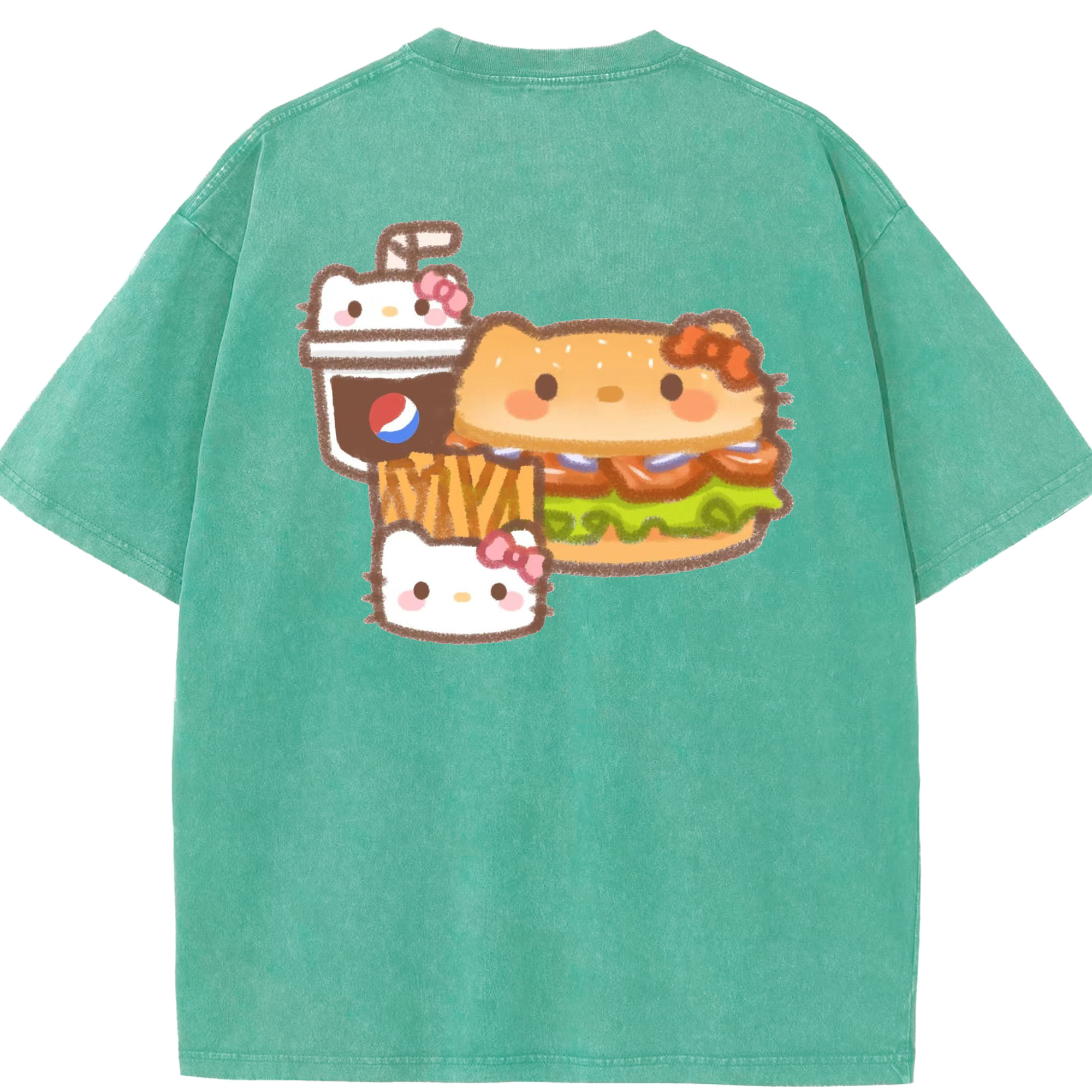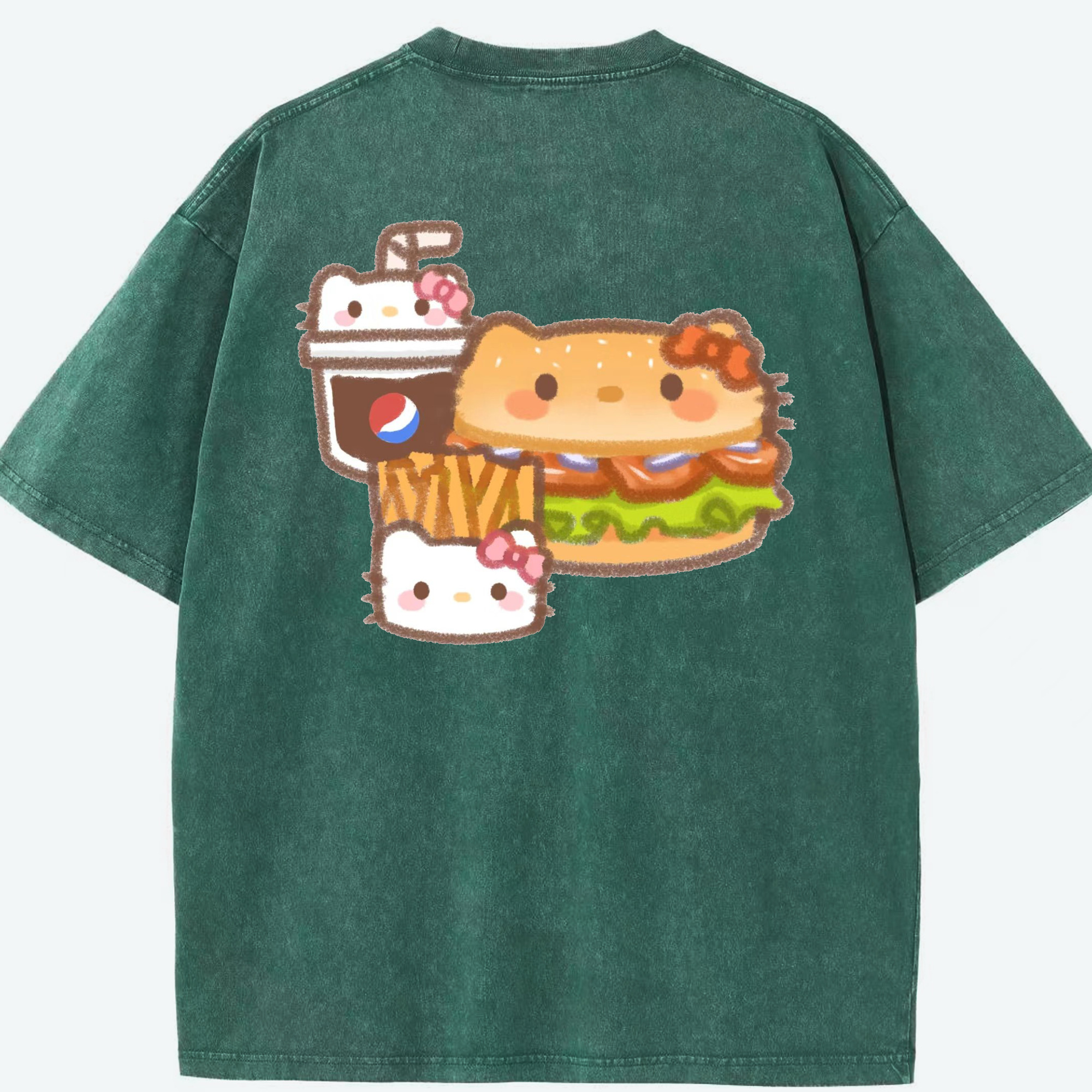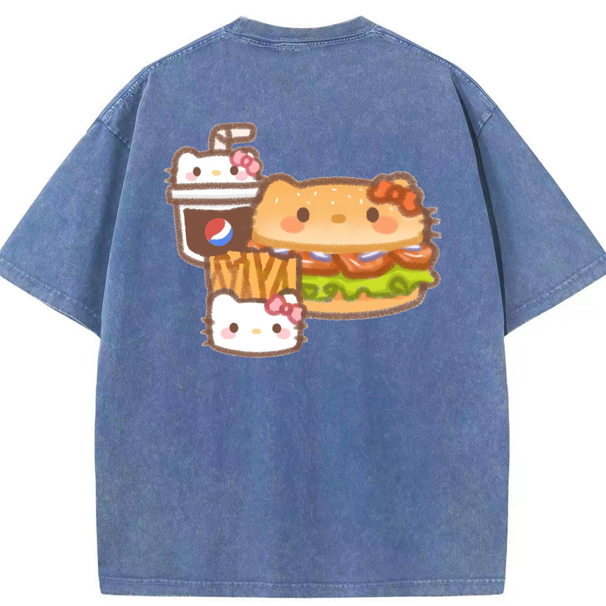 ハンバーガーになったハローキティ - 綿100% ヴィンテージ風 半袖Tシャツ ・ フロントプリント ・ 柔らか肌触り ・ 通気性 快適 ・ スポーツ カジュアル 外出用