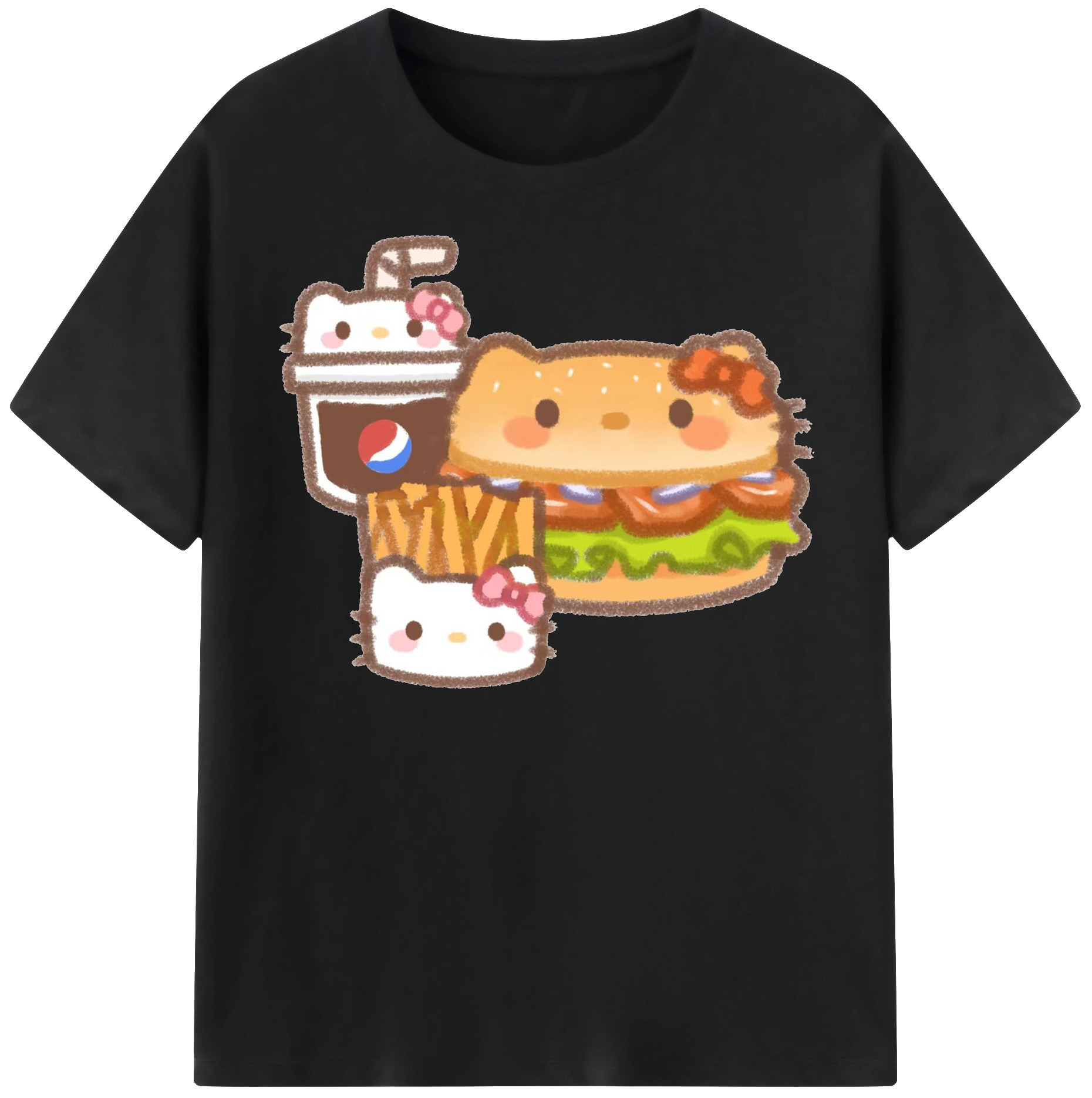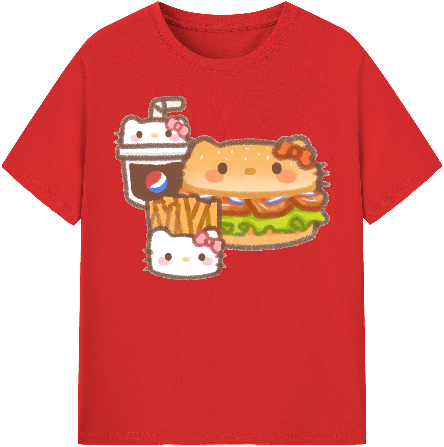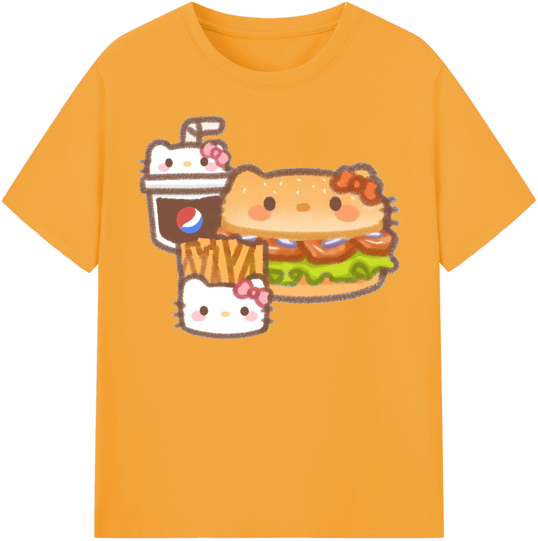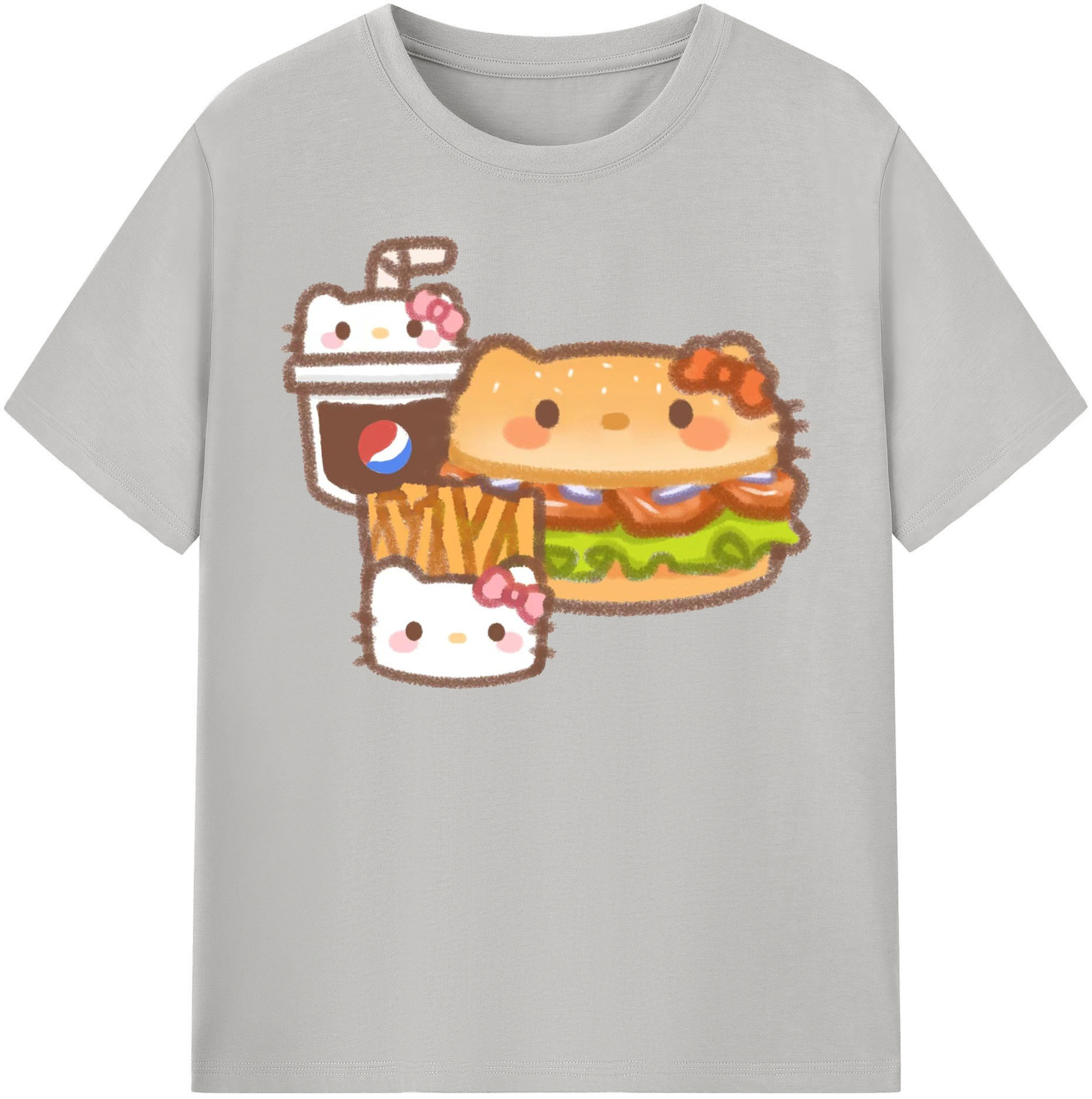 ハンバーガーになったハローキティ - 綿100% ヴィンテージ風 半袖Tシャツ ・ フロントプリント ・ 柔らか肌触り ・ 通気性 快適 ・ スポーツ カジュアル 外出用