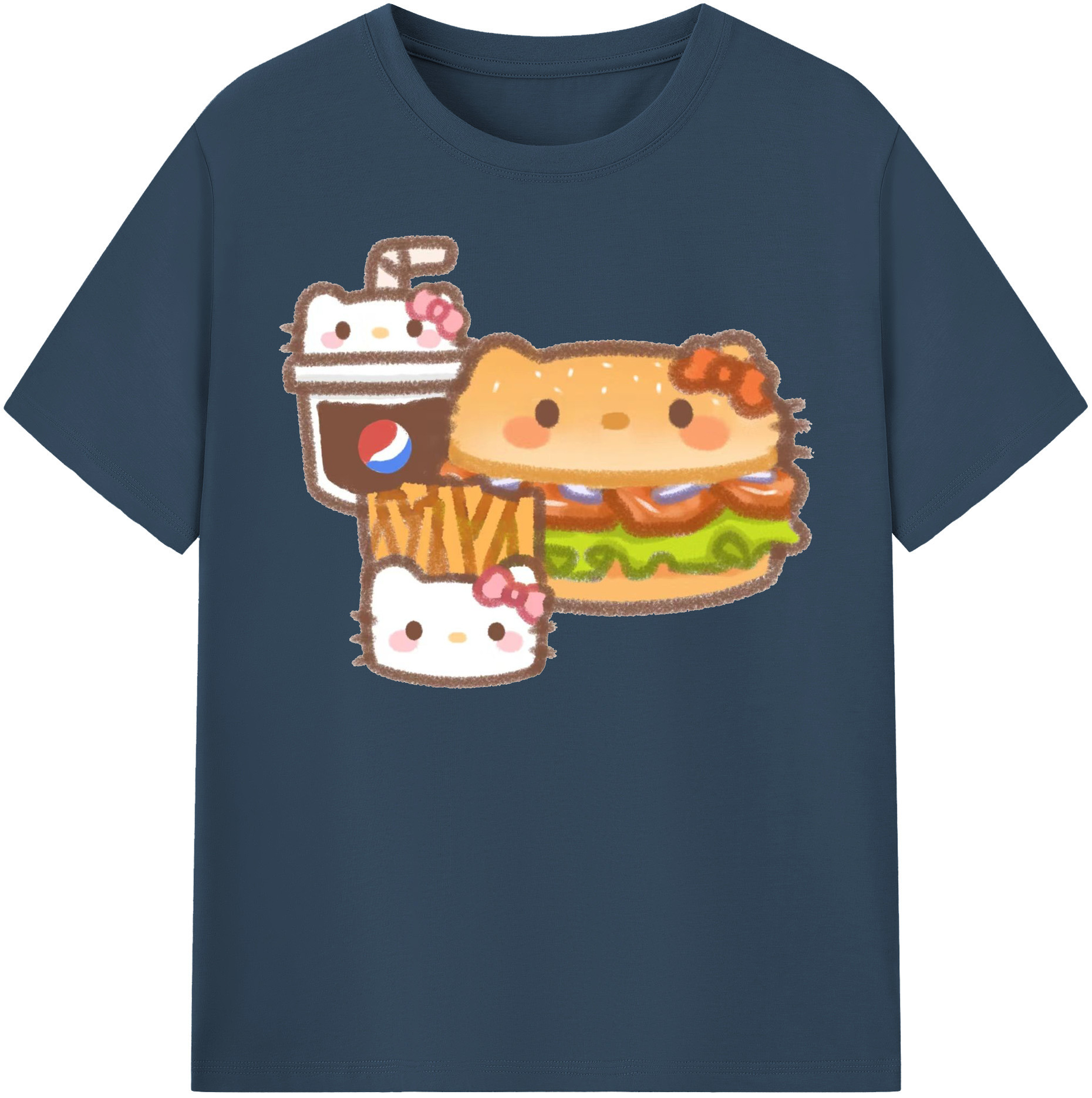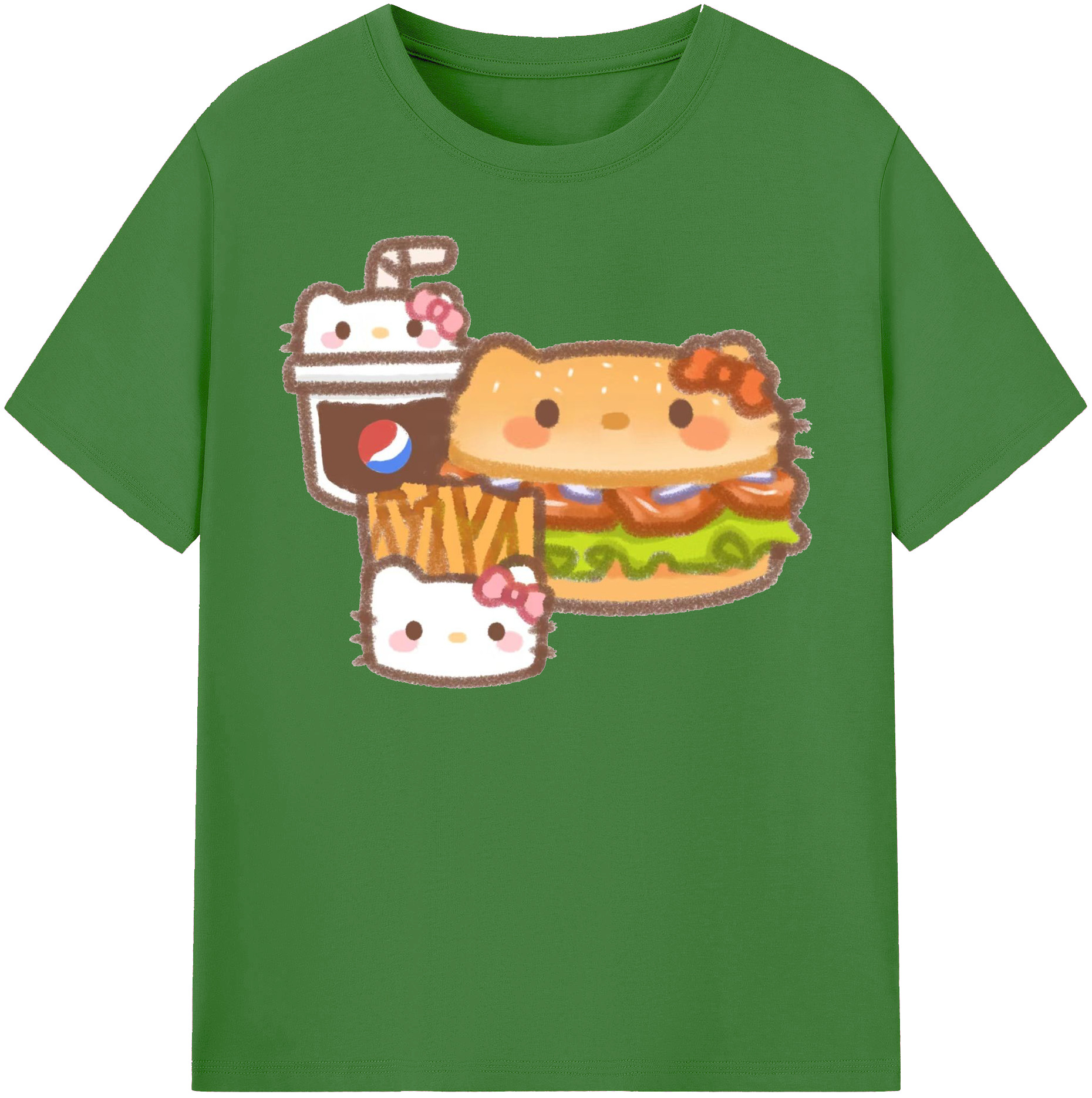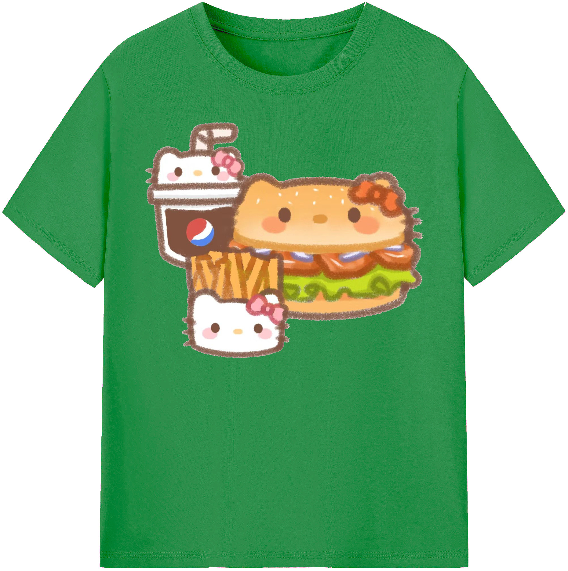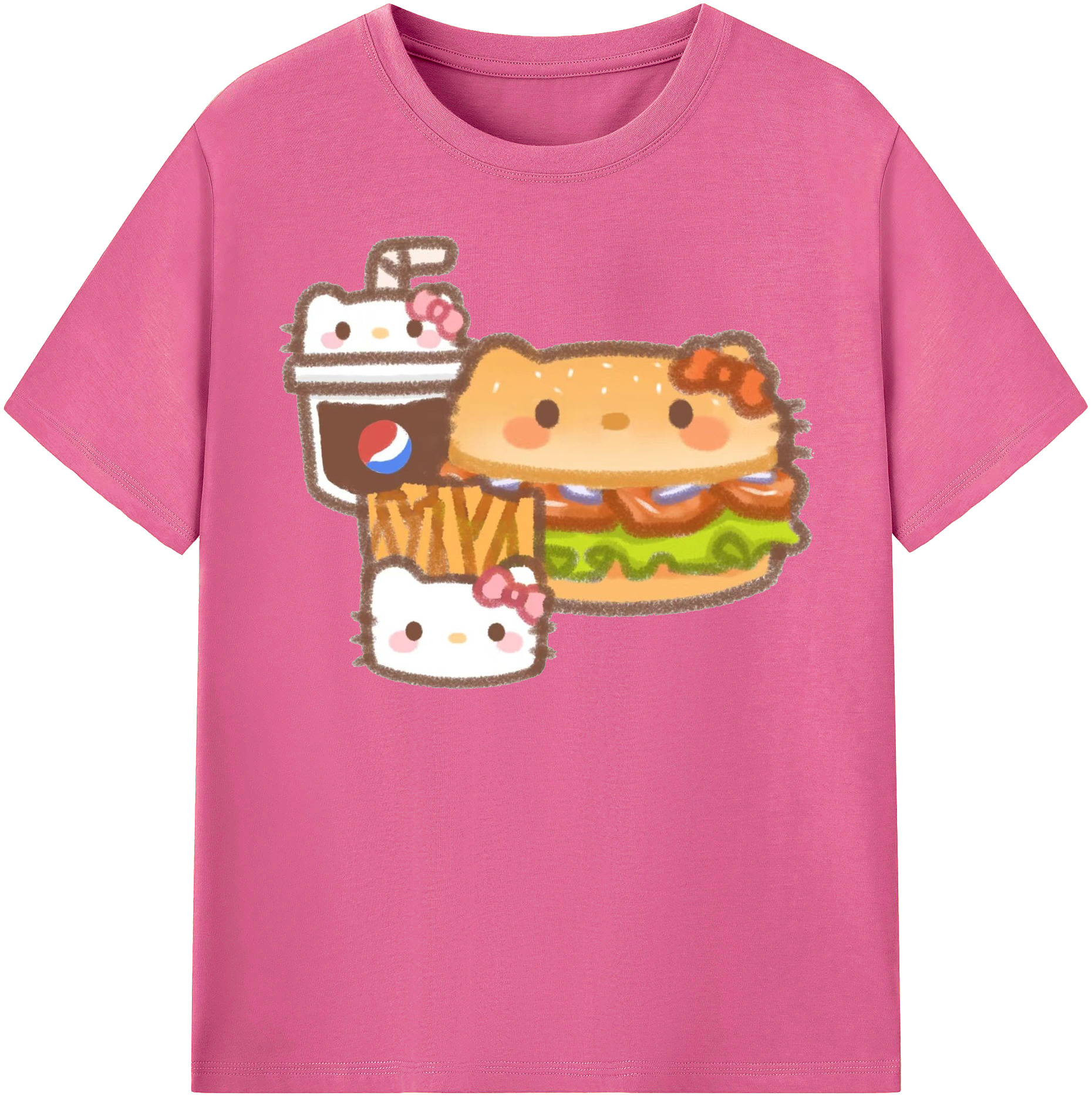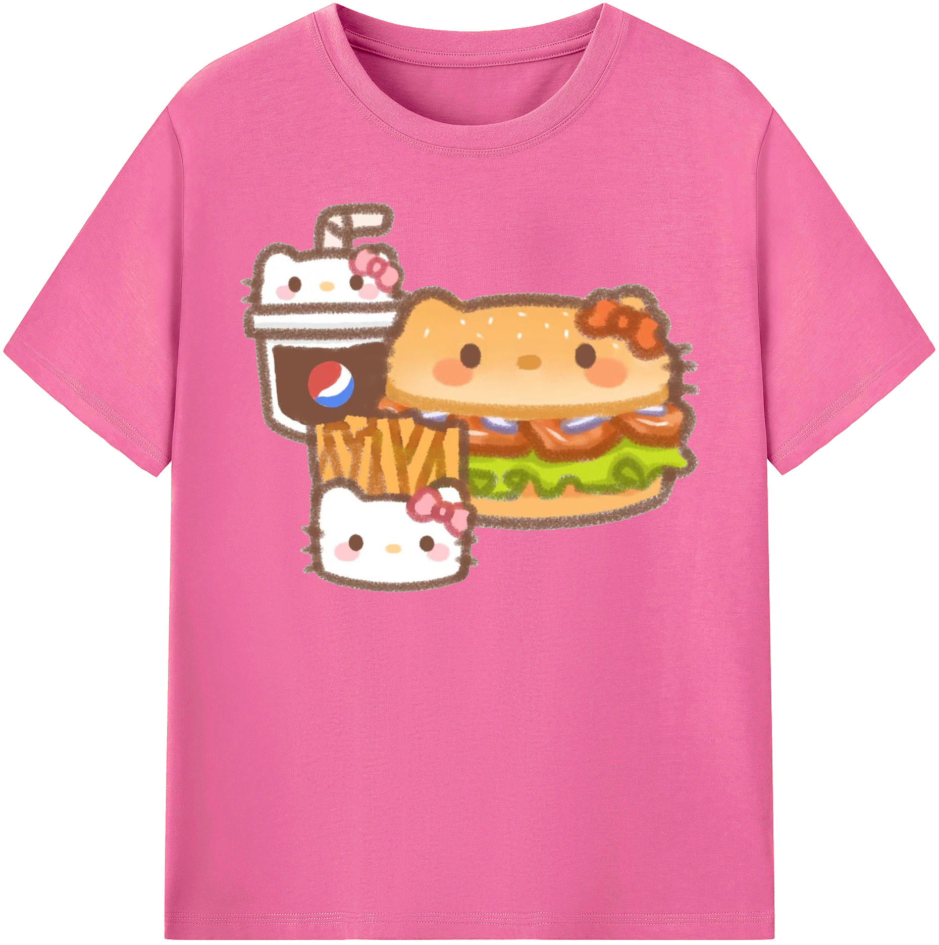ハンバーガーになったハローキティ - 綿100% ヴィンテージ風 半袖Tシャツ ・ フロントプリント ・ 柔らか肌触り ・ 通気性 快適 ・ スポーツ カジュアル 外出用