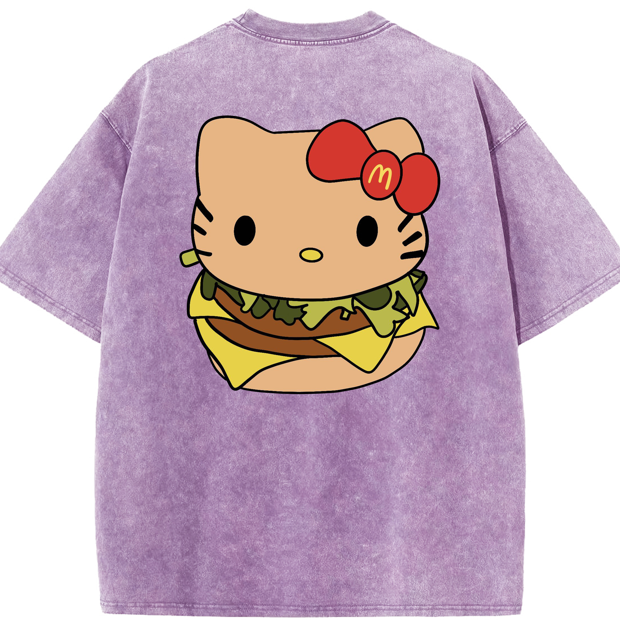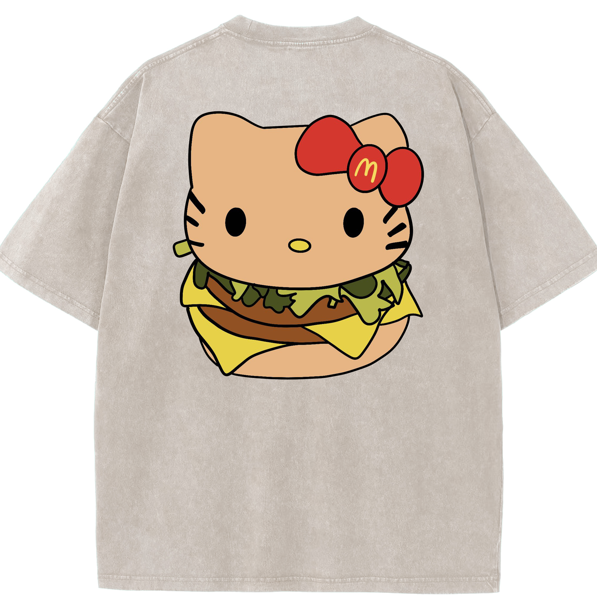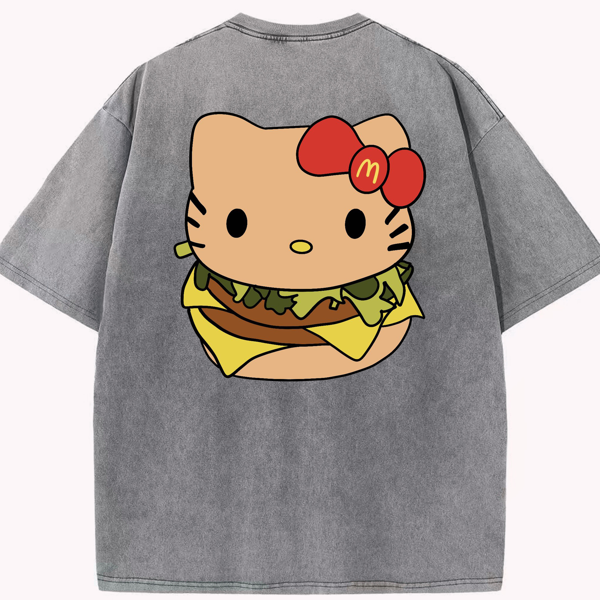 ハンバーガーになったハローキティ - 綿100% ヴィンテージ風 半袖Tシャツ ・ 背面プリント ・ 柔らか肌触り ・ 通気性 快適 ・ スポーツ カジュアル 外出用