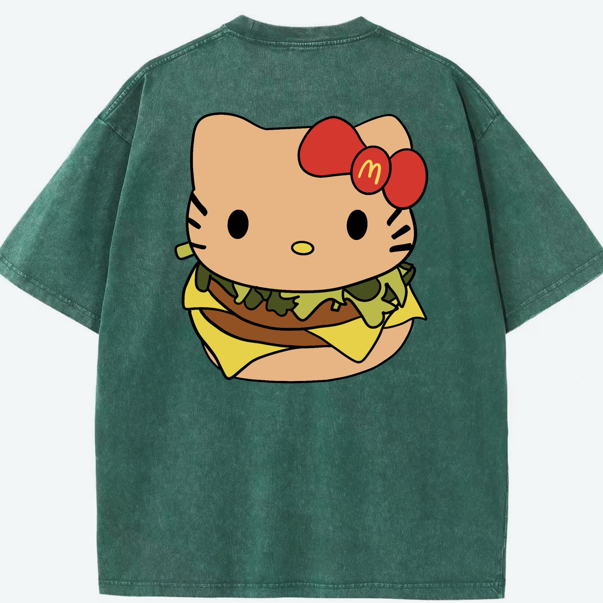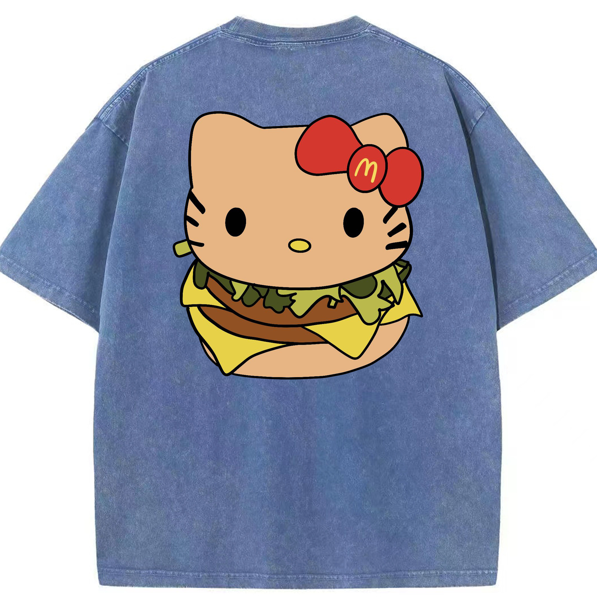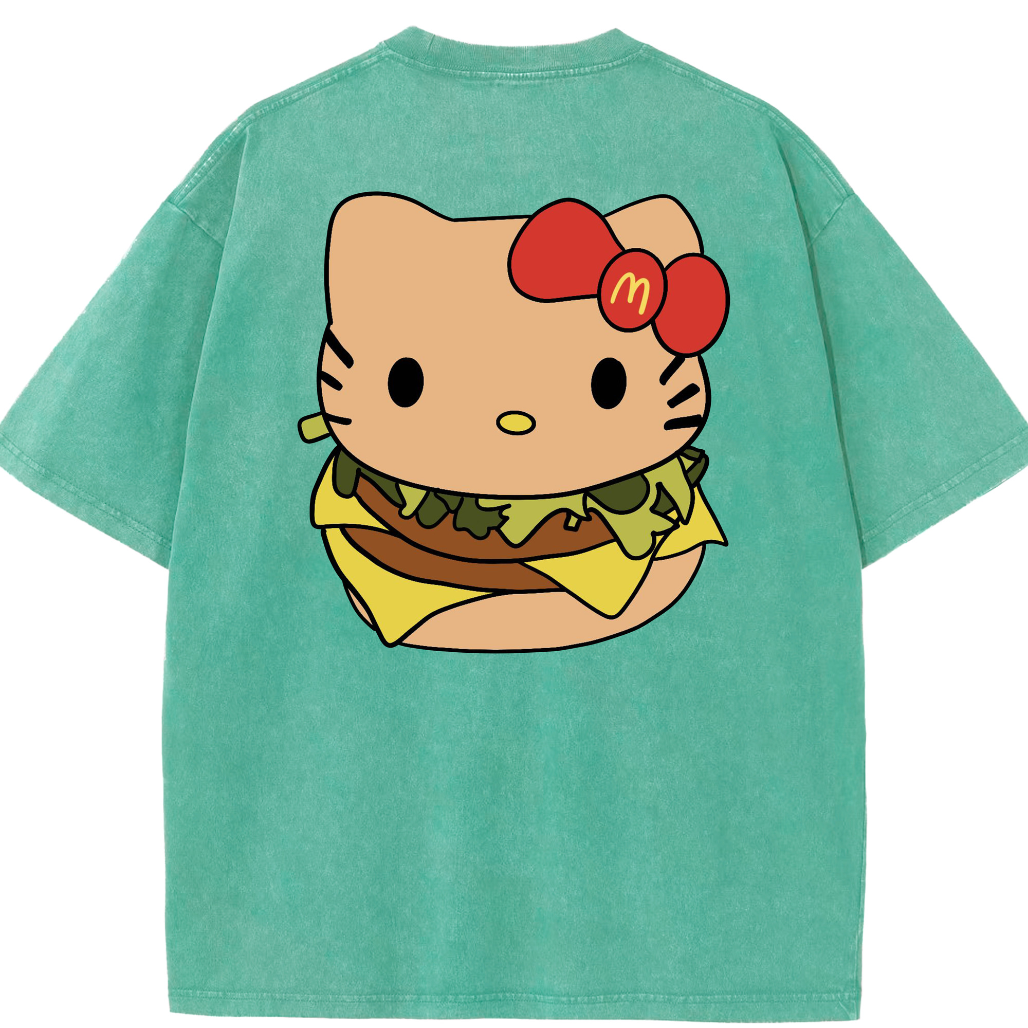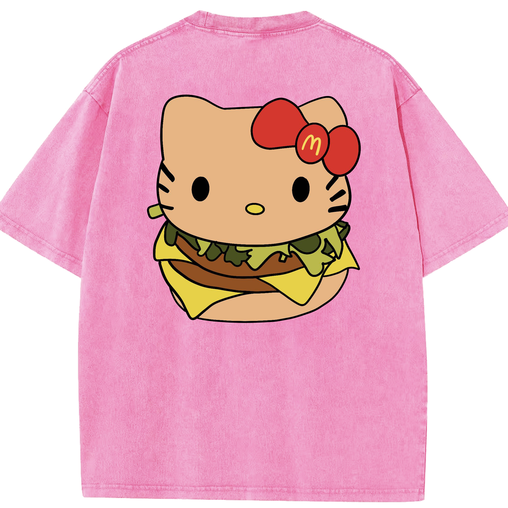 ハンバーガーになったハローキティ - 綿100% ヴィンテージ風 半袖Tシャツ ・ 背面プリント ・ 柔らか肌触り ・ 通気性 快適 ・ スポーツ カジュアル 外出用