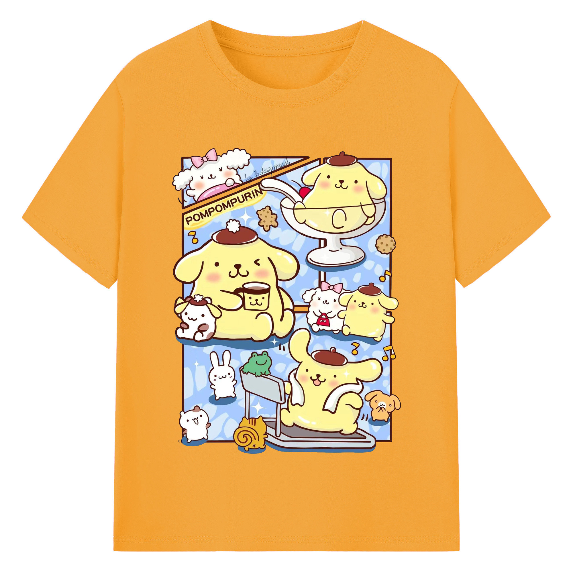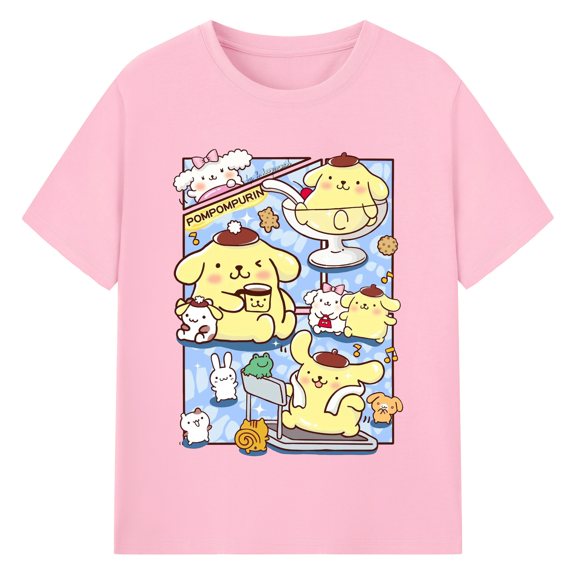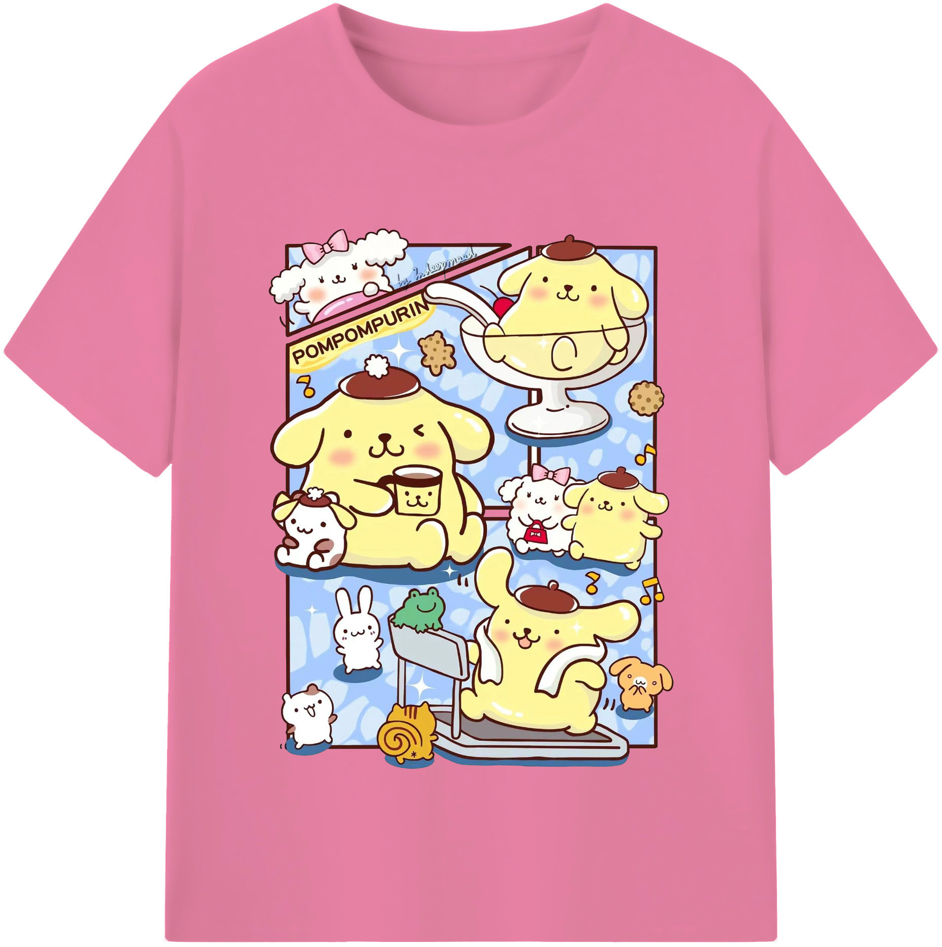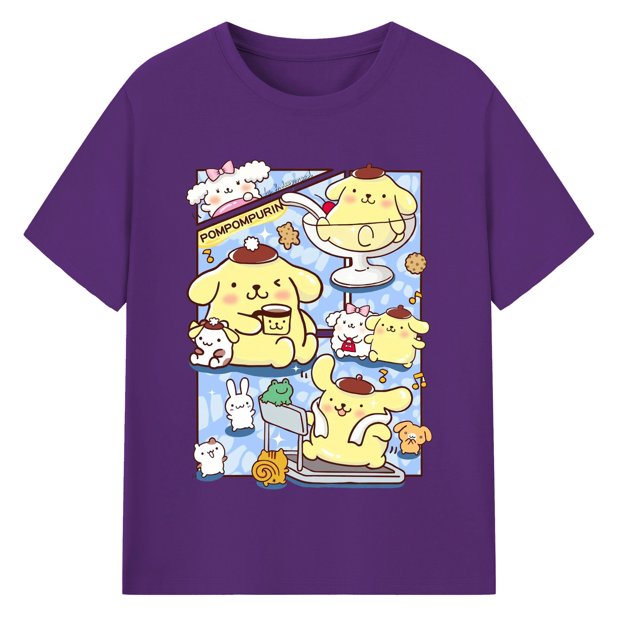 楽しいポムポムプリン - 綿100% 半袖Tシャツ ・ フロントプリント ・ 快適 通気性 ・ 日常使い 散歩 スポーツ用