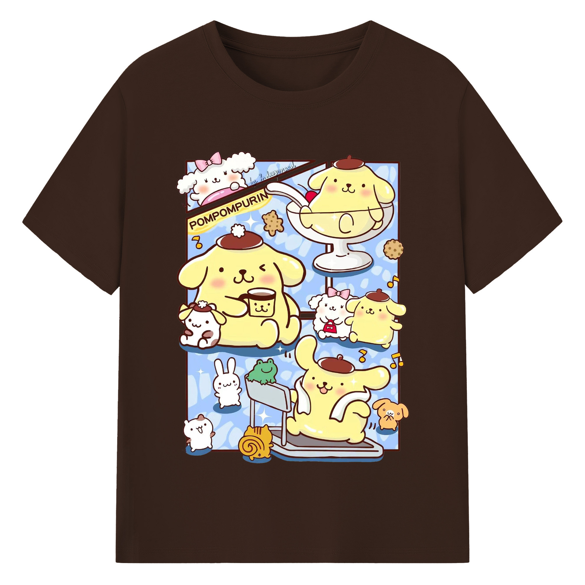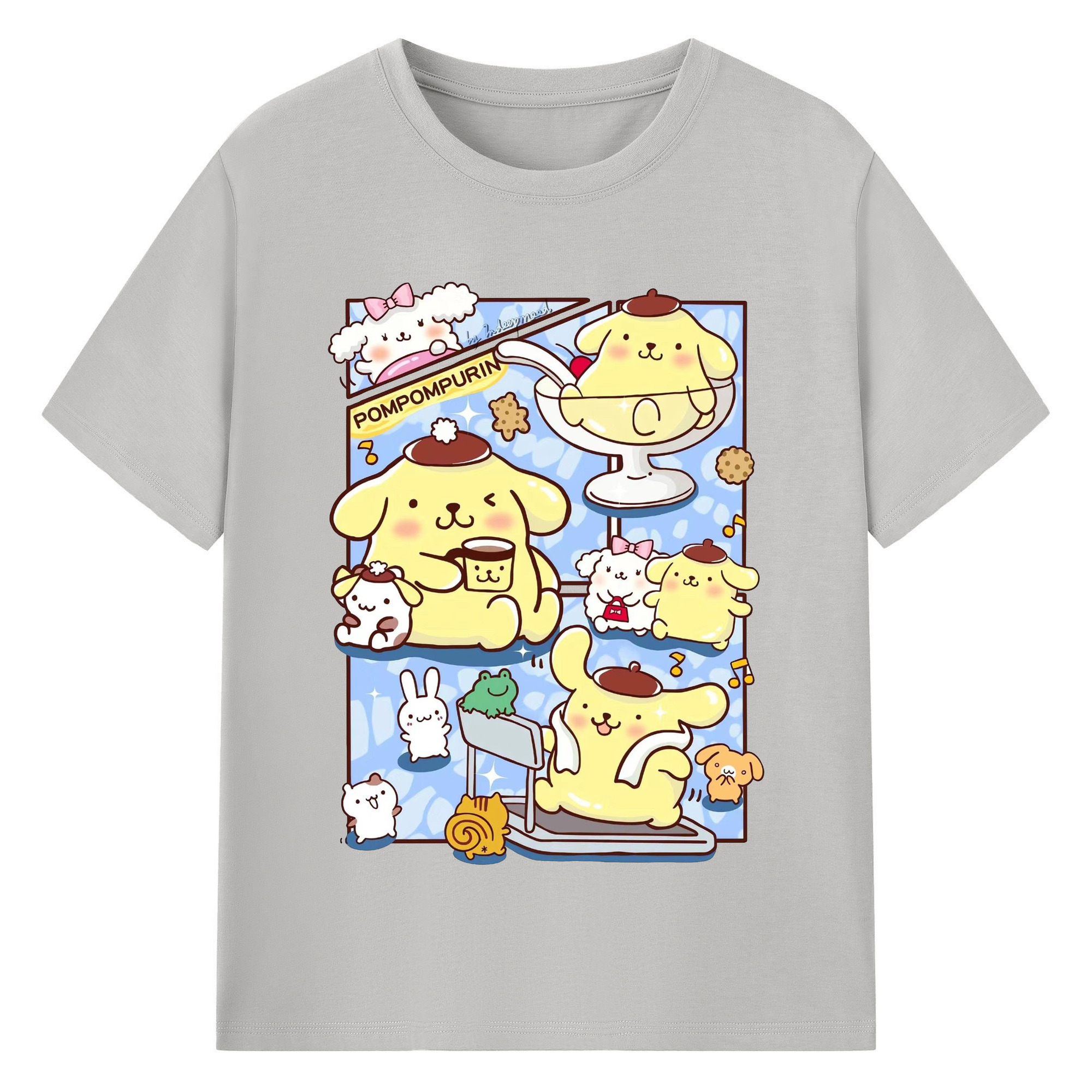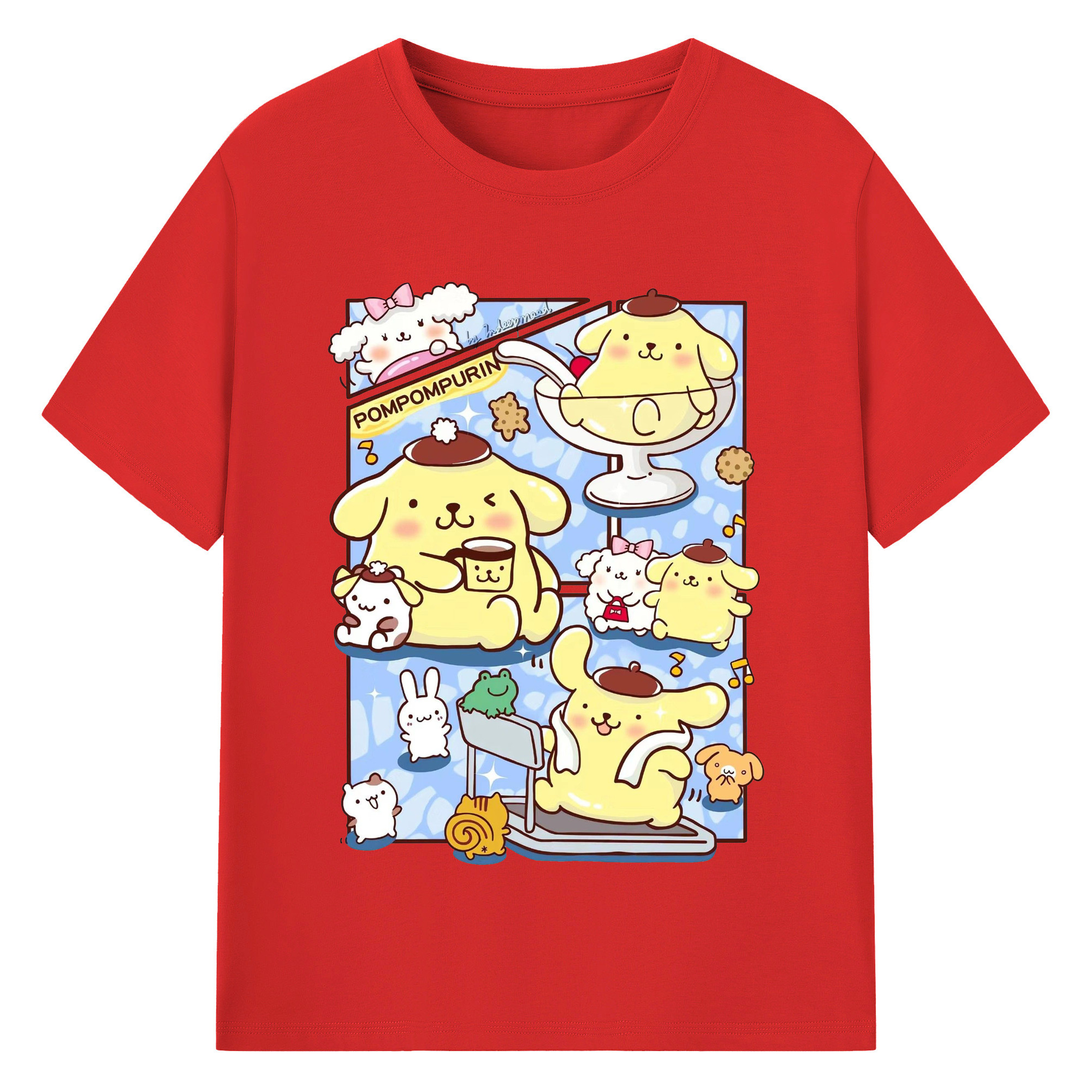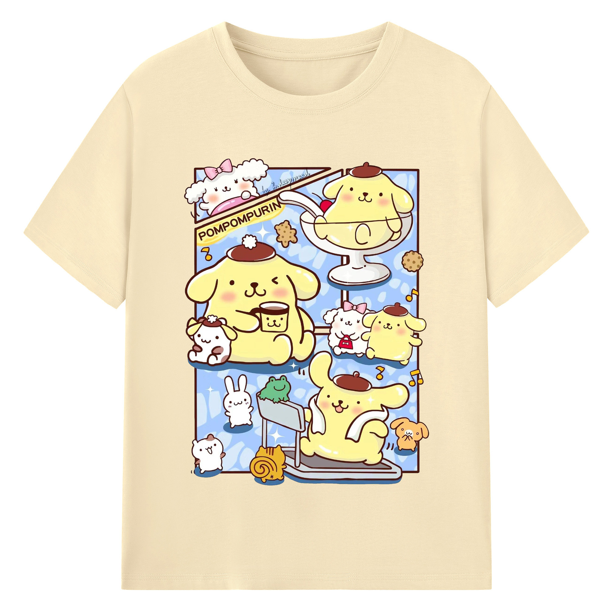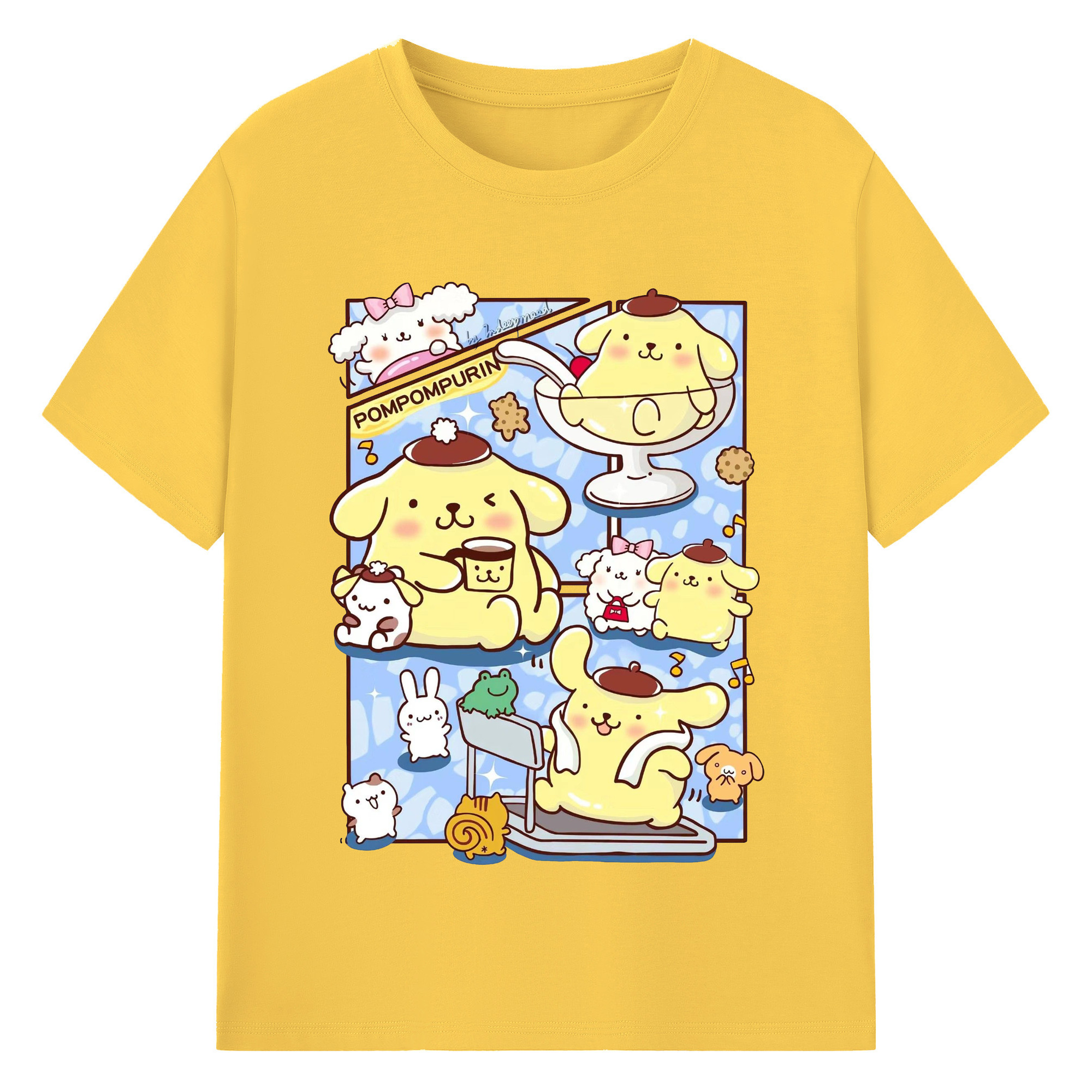 楽しいポムポムプリン - 綿100% 半袖Tシャツ ・ フロントプリント ・ 快適 通気性 ・ 日常使い 散歩 スポーツ用