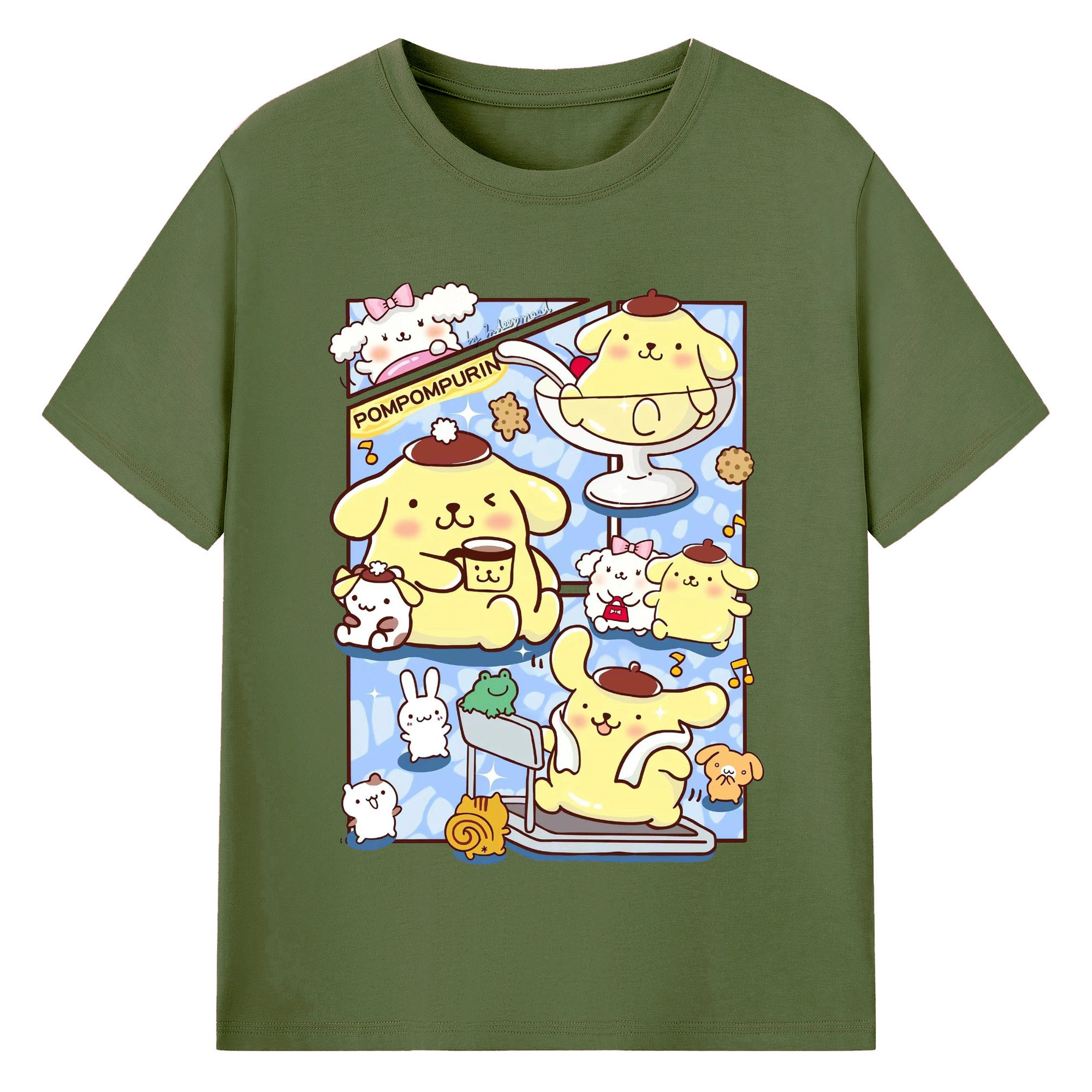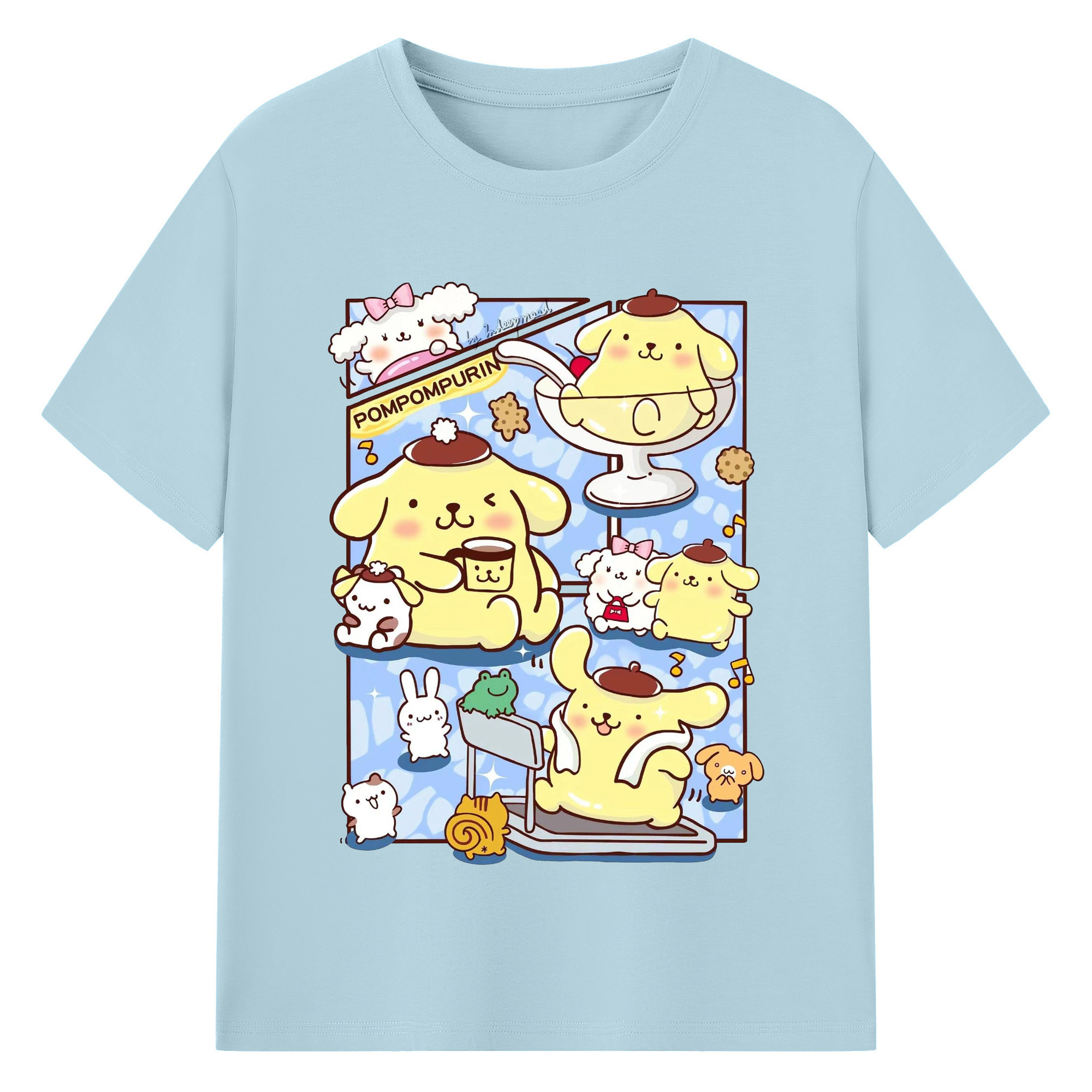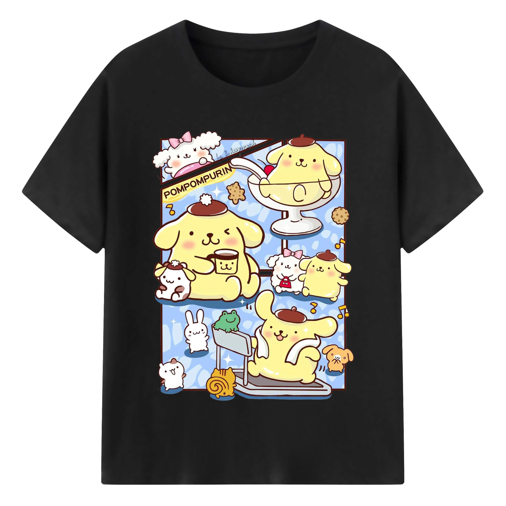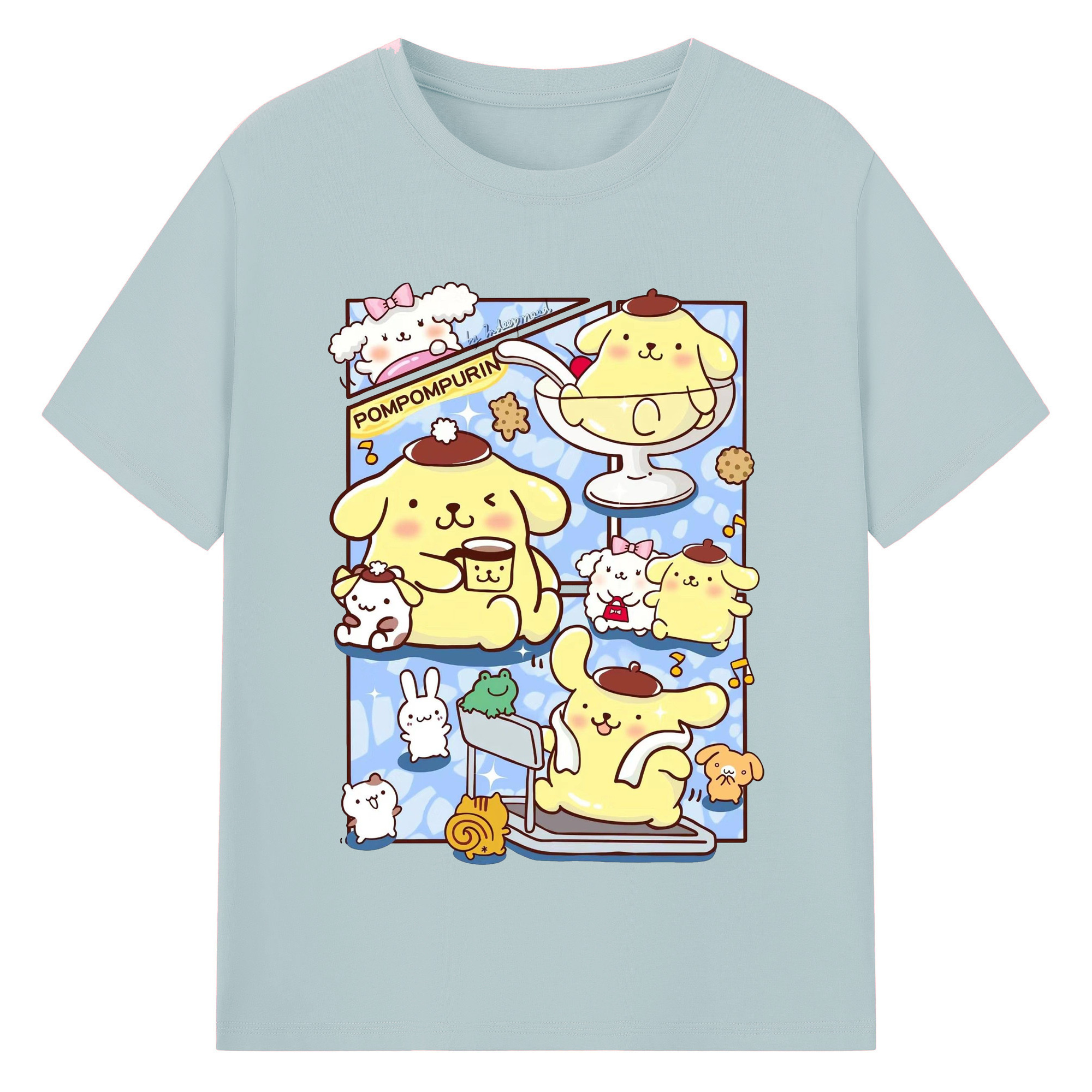 楽しいポムポムプリン - 綿100% 半袖Tシャツ ・ フロントプリント ・ 快適 通気性 ・ 日常使い 散歩 スポーツ用