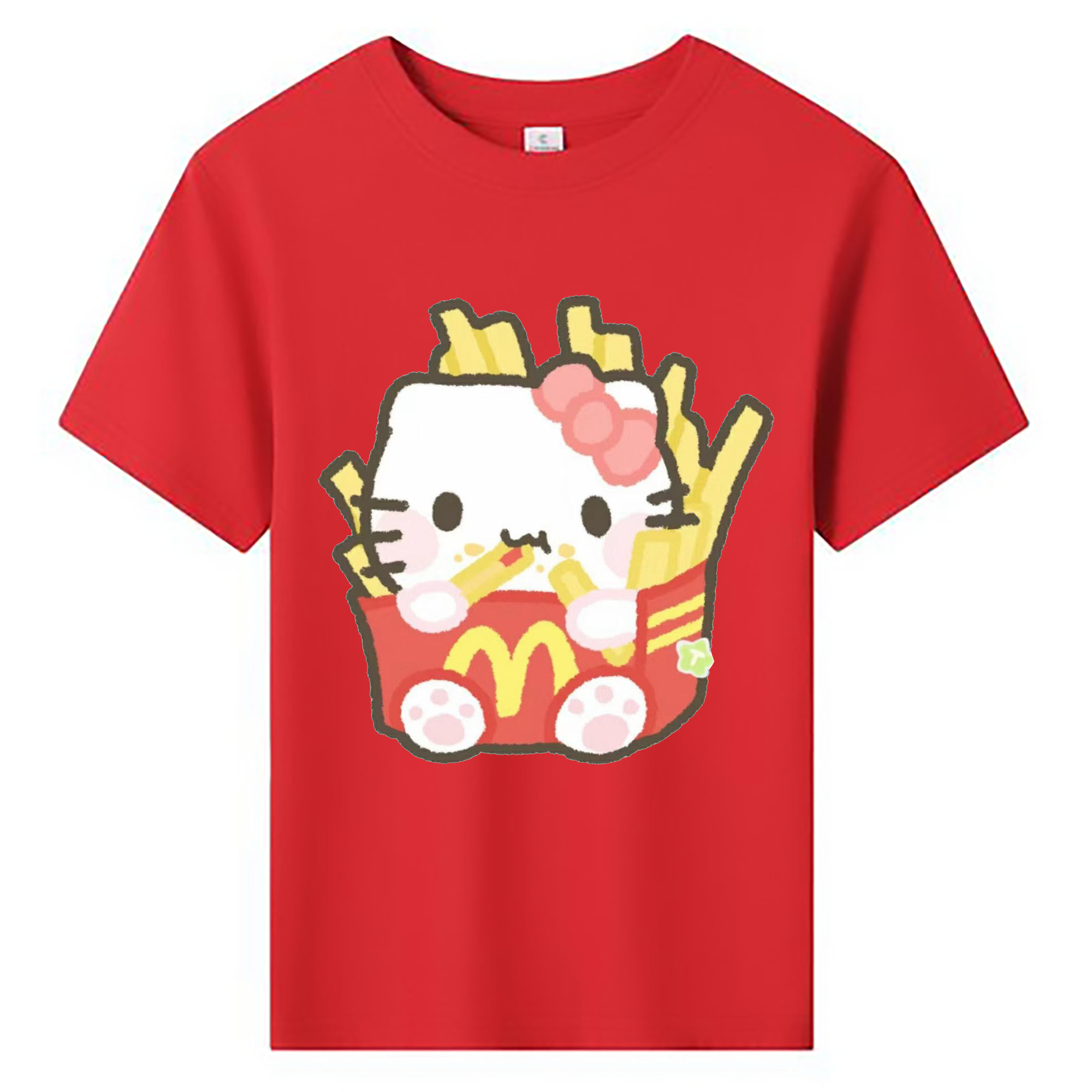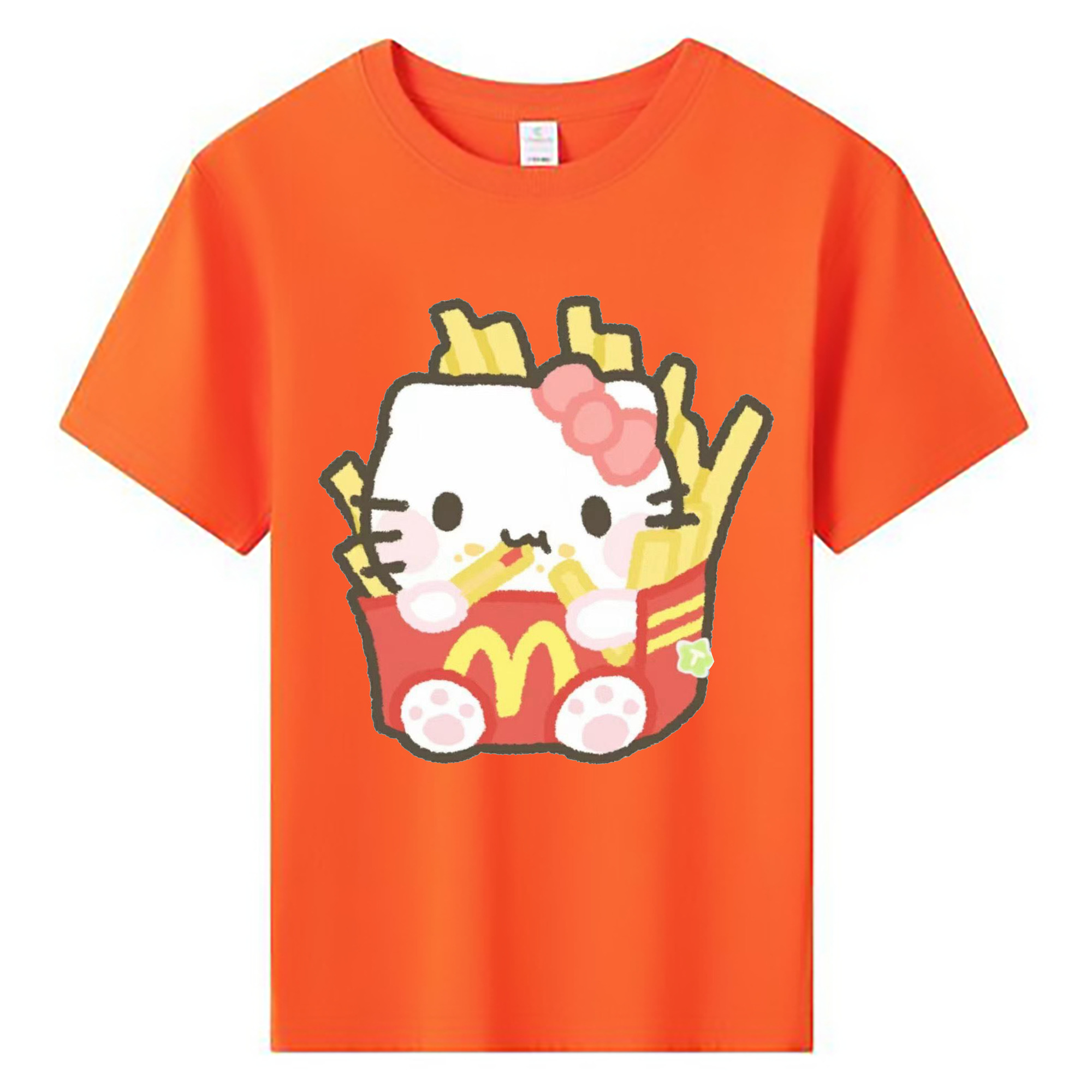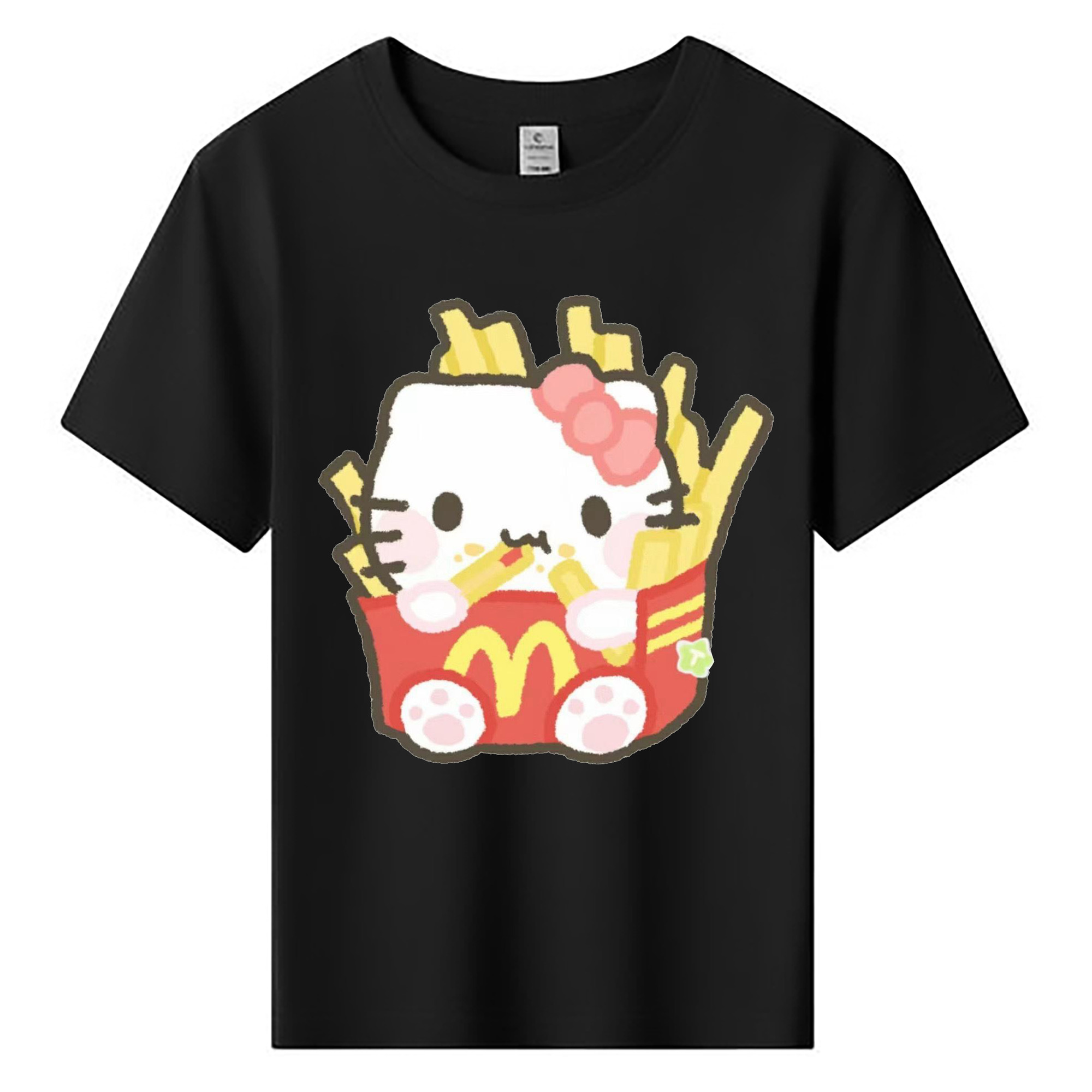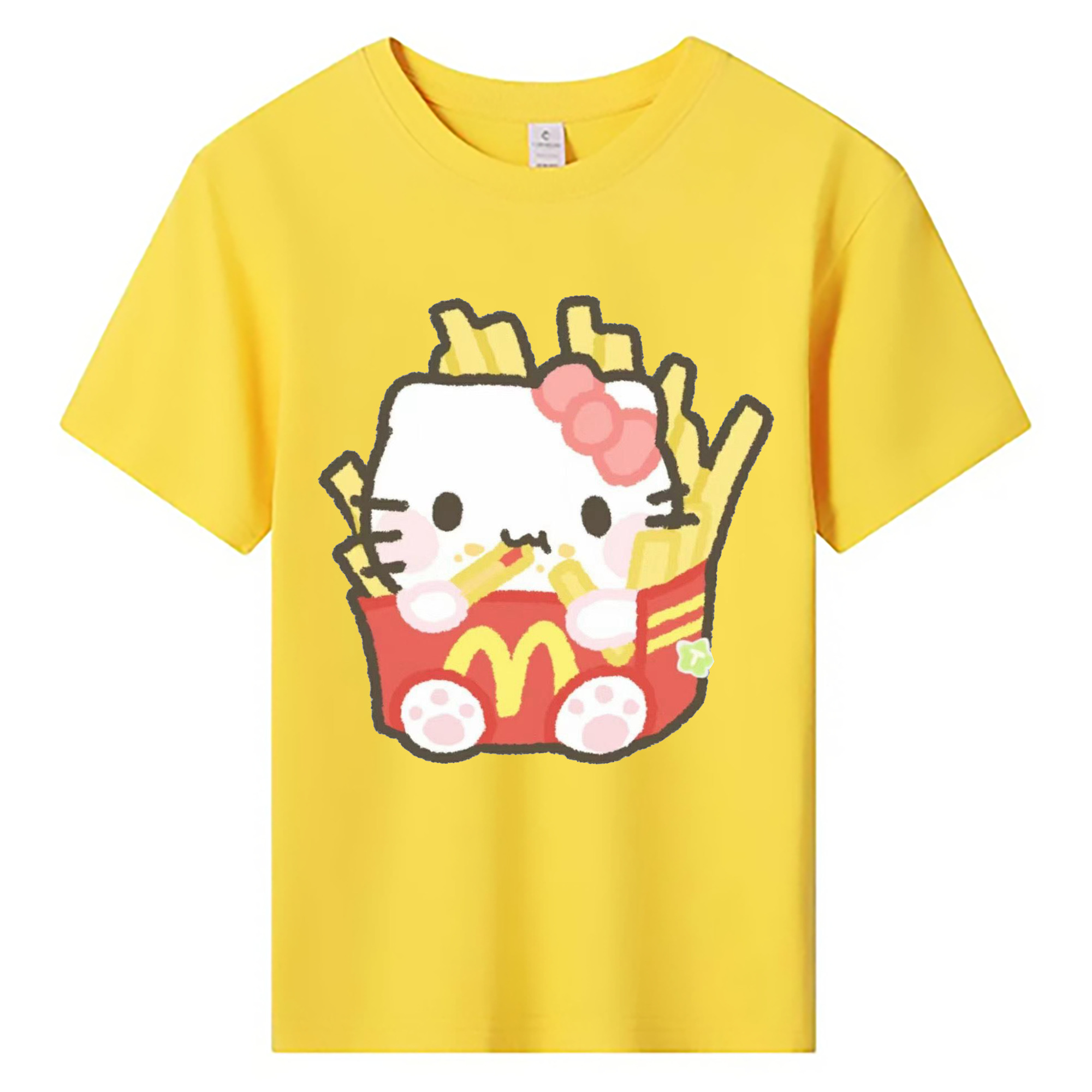 フライドポテトモチーフのハローキティ( - 綿100% ヴィンテージ風 半袖Tシャツ ・ フロントプリント ・ 柔らか肌触り ・ 通気性 快適 ・ スポーツ カジュアル 外出用