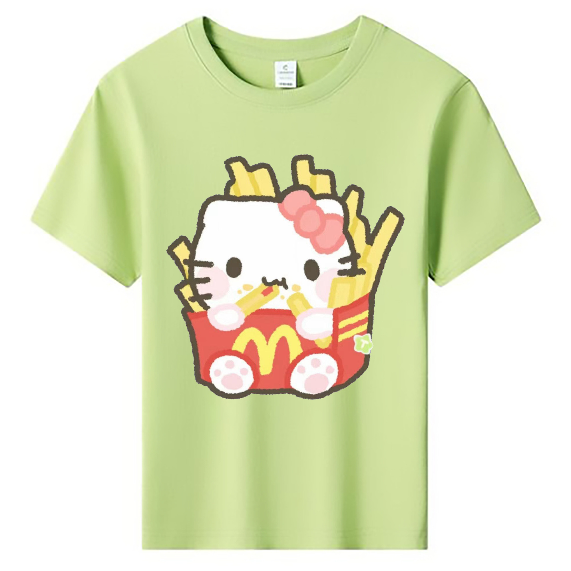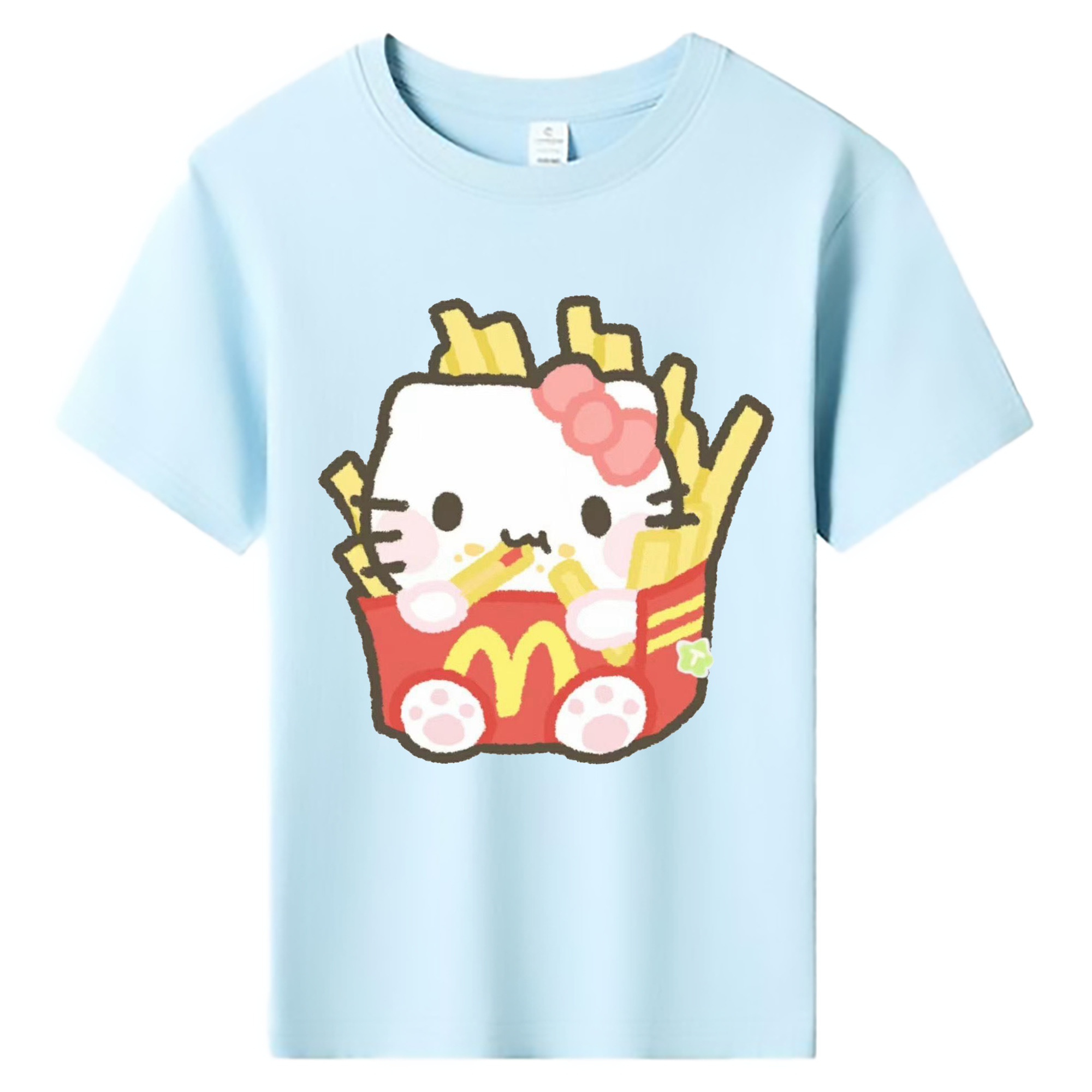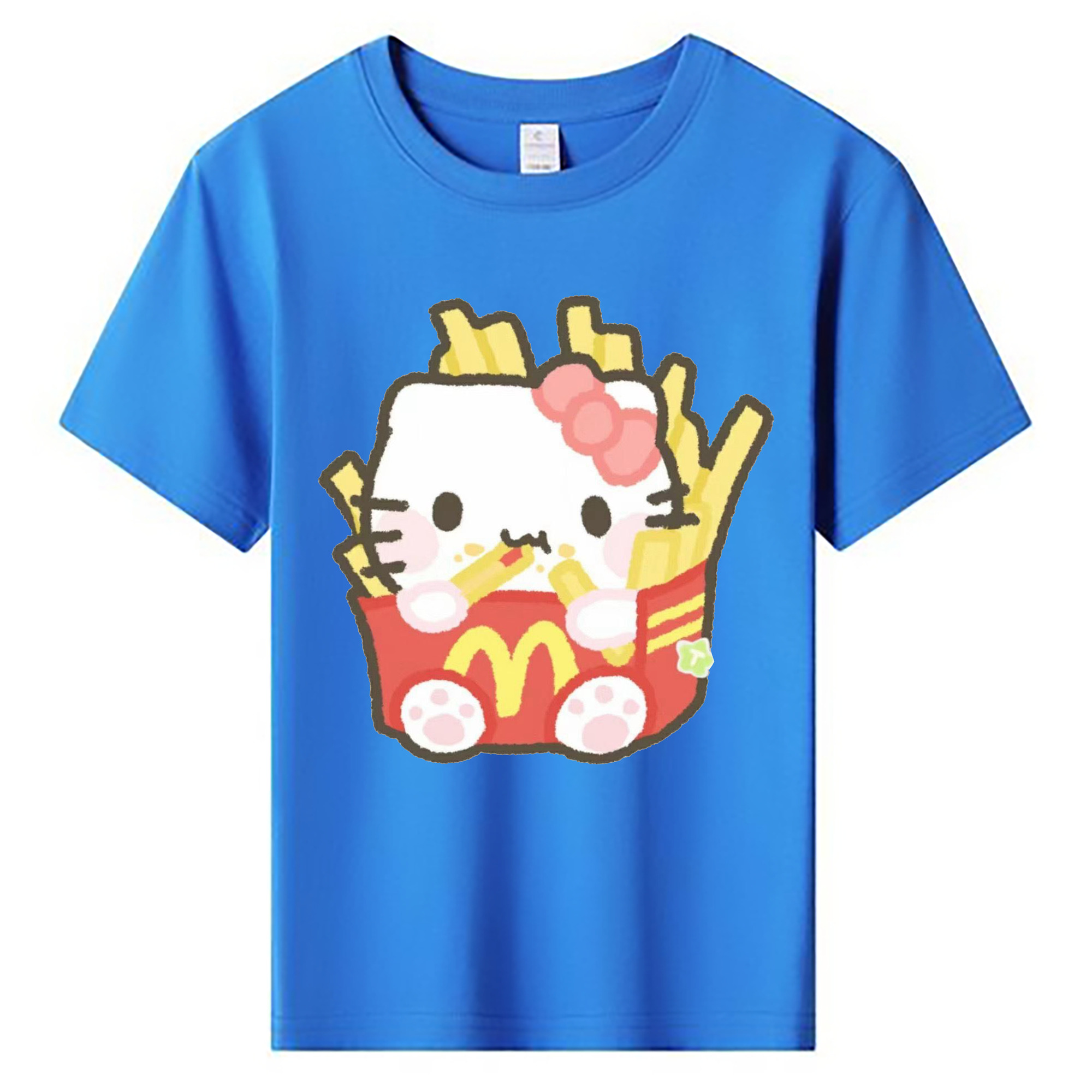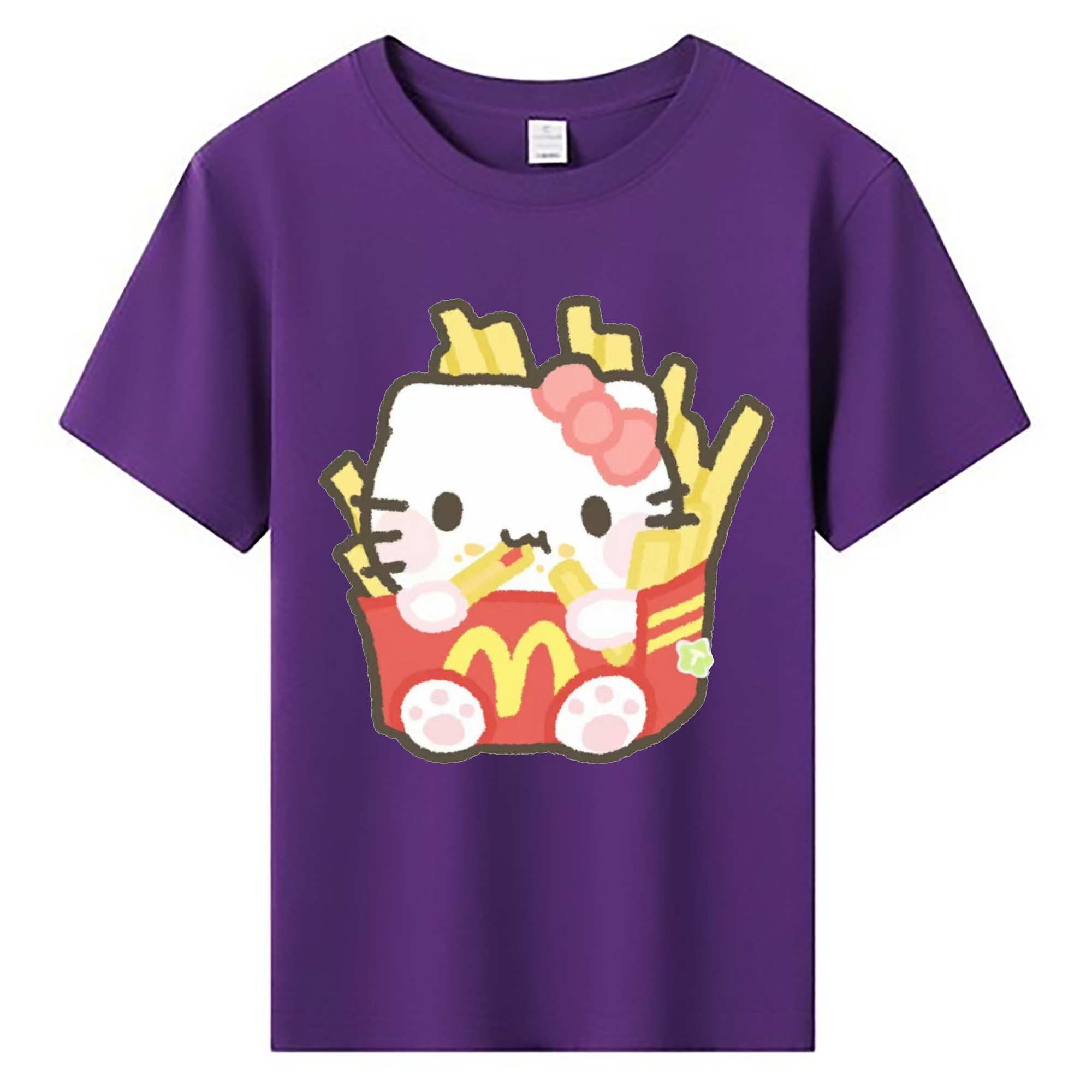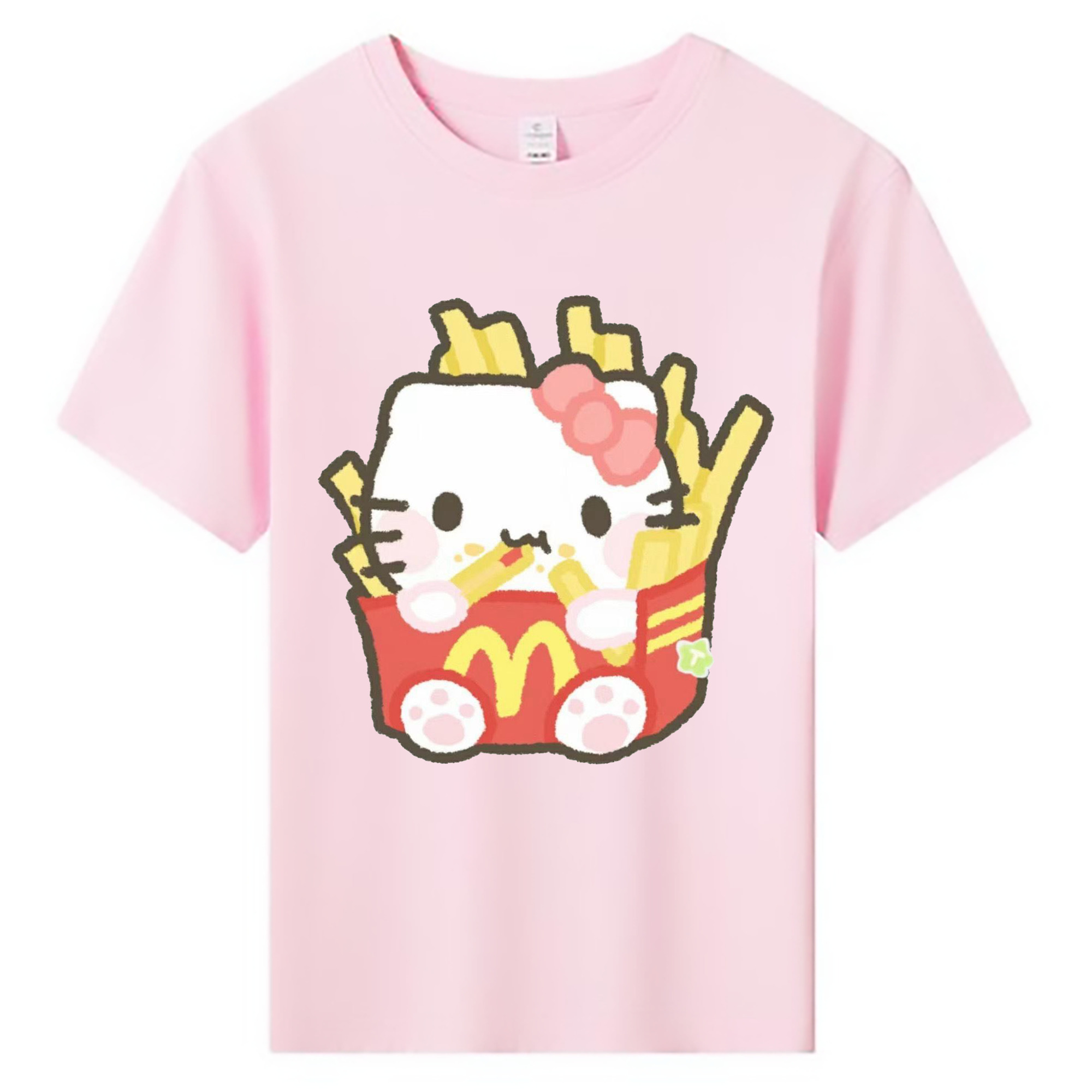 フライドポテトモチーフのハローキティ( - 綿100% ヴィンテージ風 半袖Tシャツ ・ フロントプリント ・ 柔らか肌触り ・ 通気性 快適 ・ スポーツ カジュアル 外出用