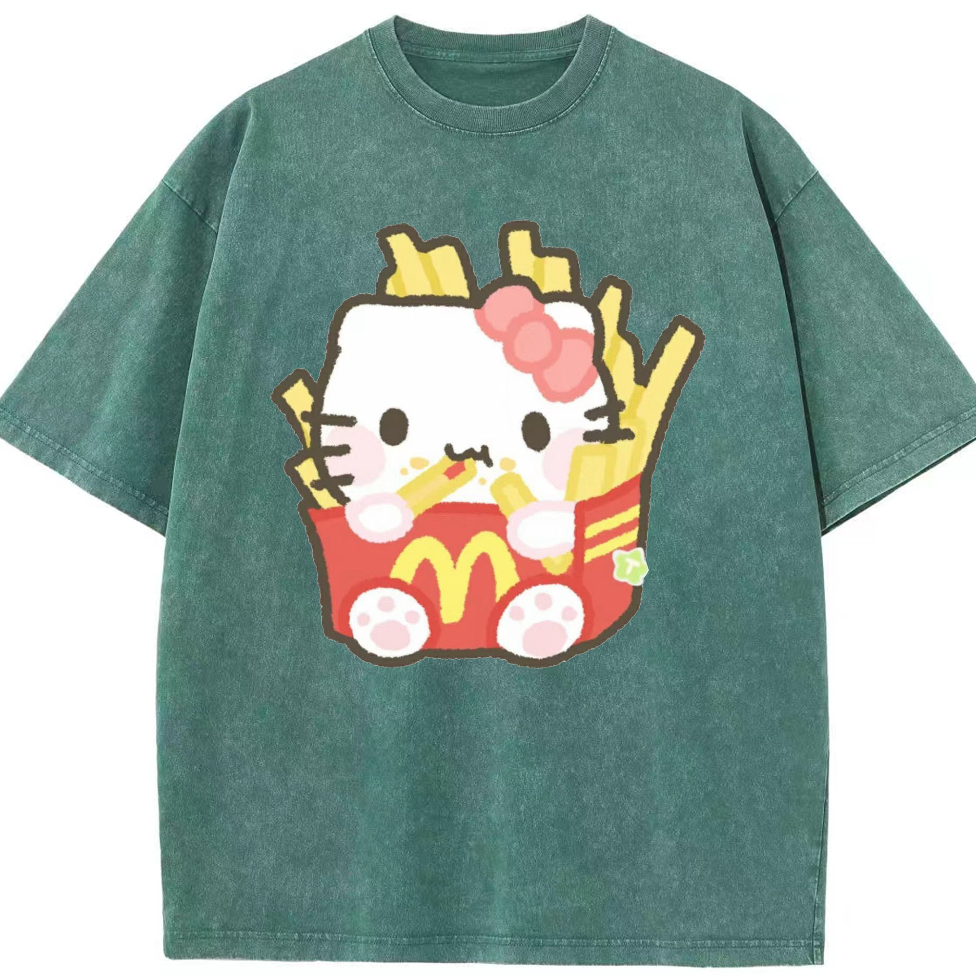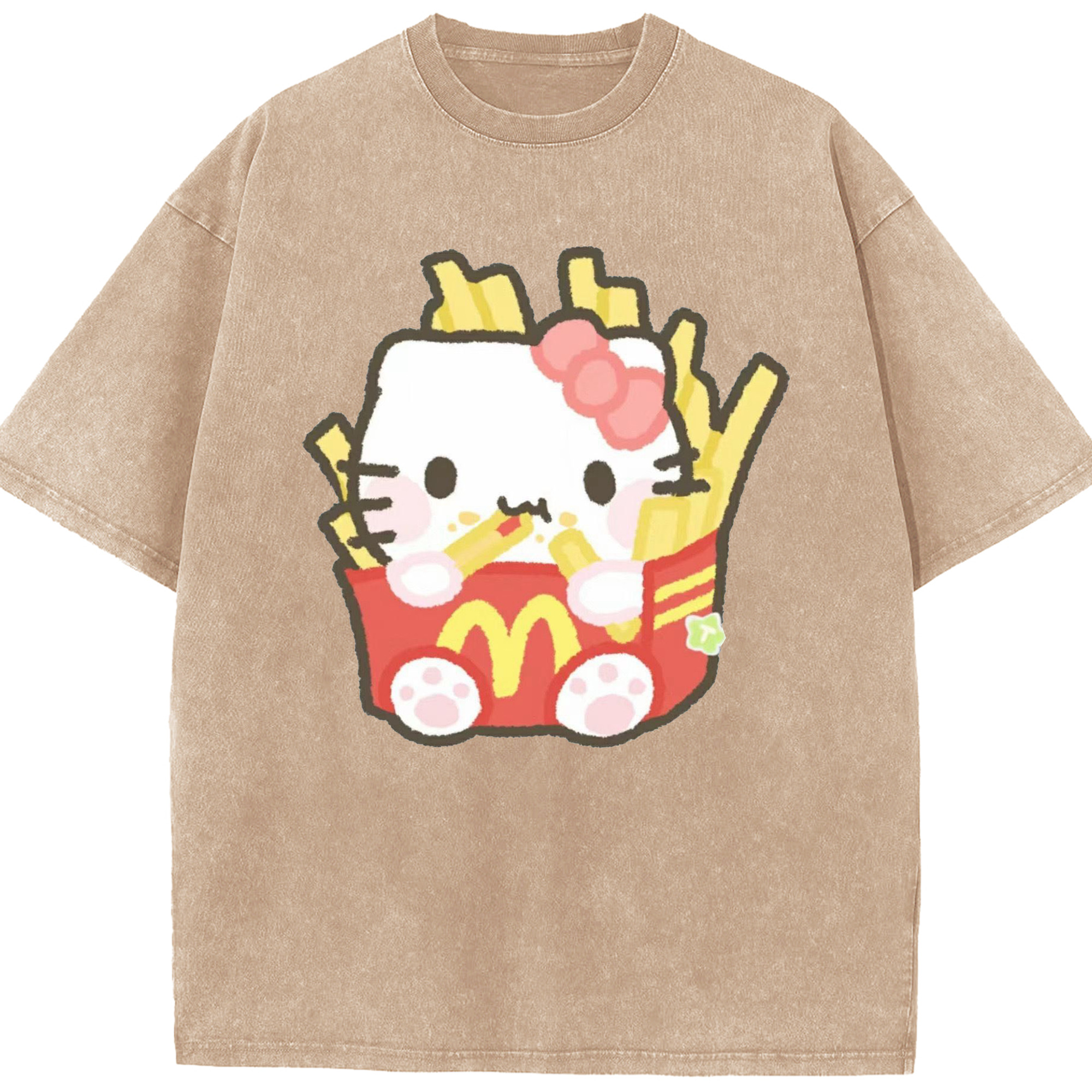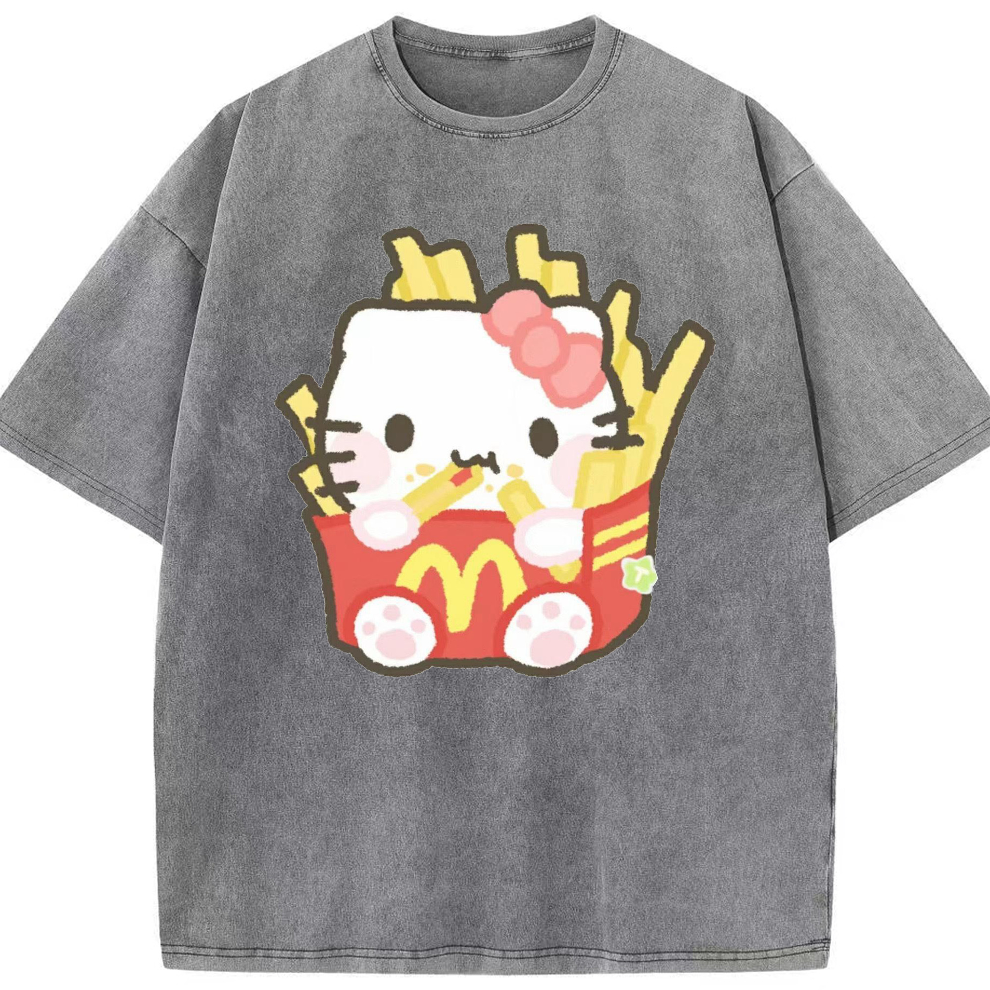 フライドポテトモチーフのハローキティ( - 綿100% ヴィンテージ風 半袖Tシャツ ・ 背面プリント ・ 柔らか肌触り ・ 通気性 快適 ・ スポーツ カジュアル 外出用