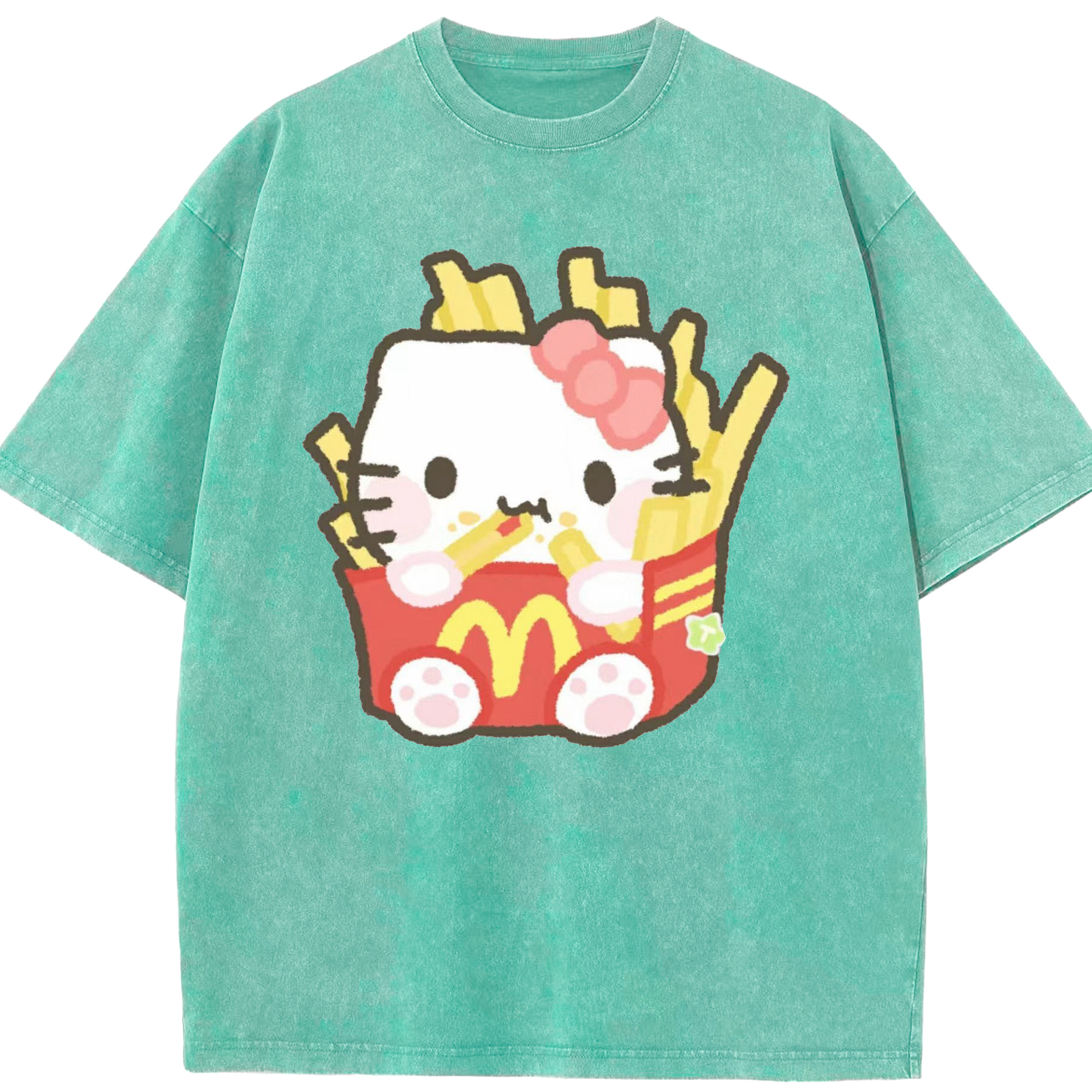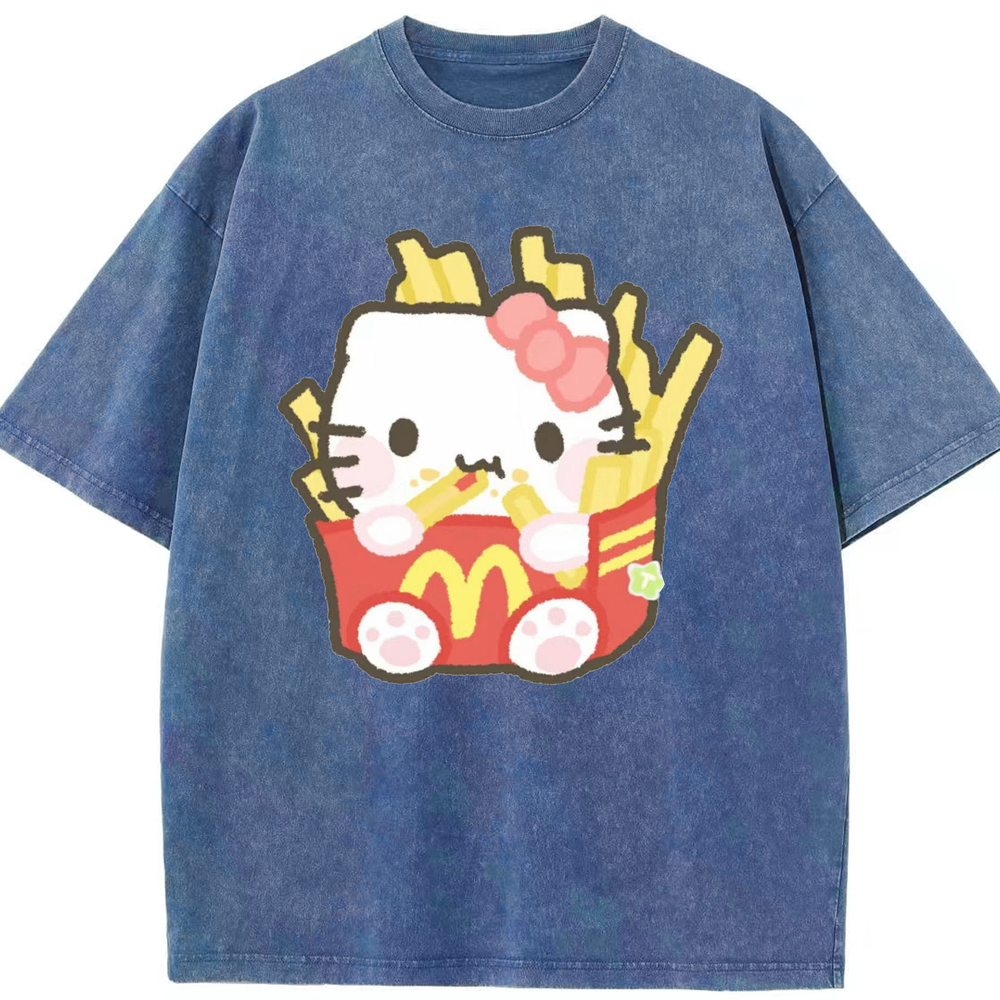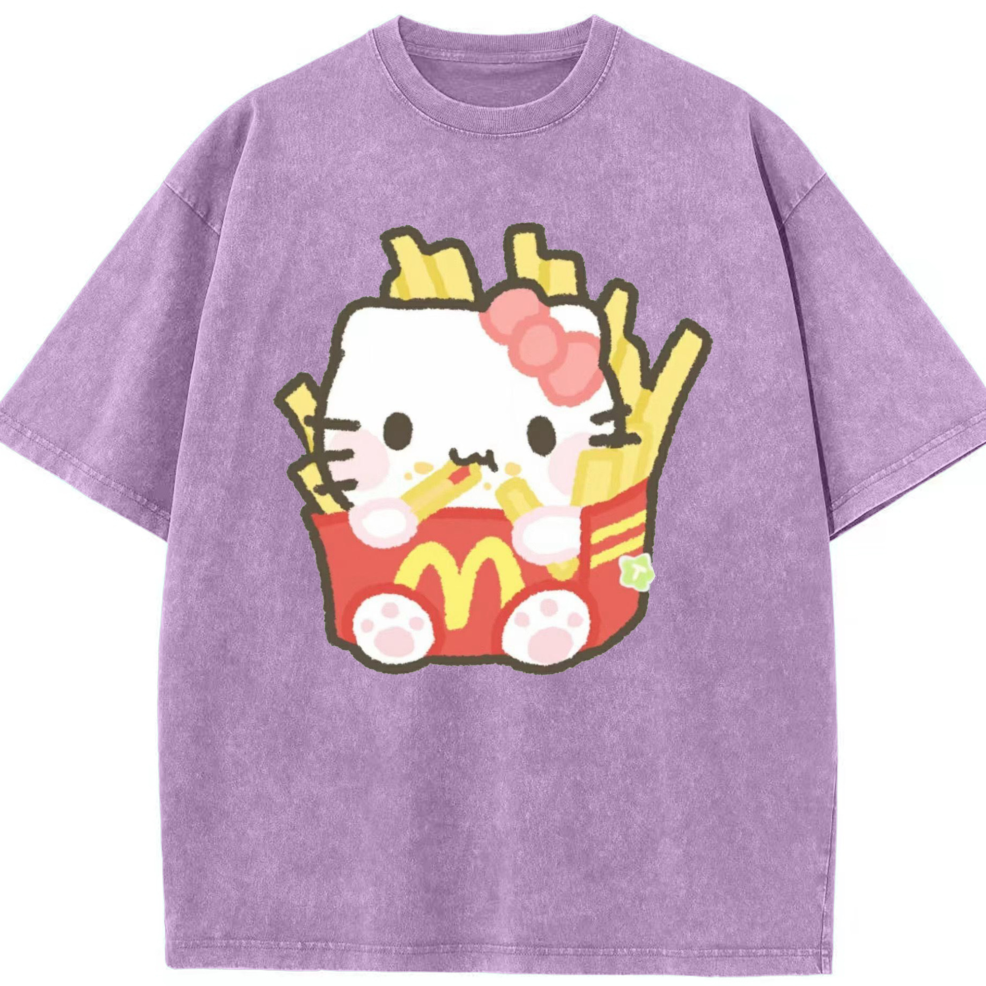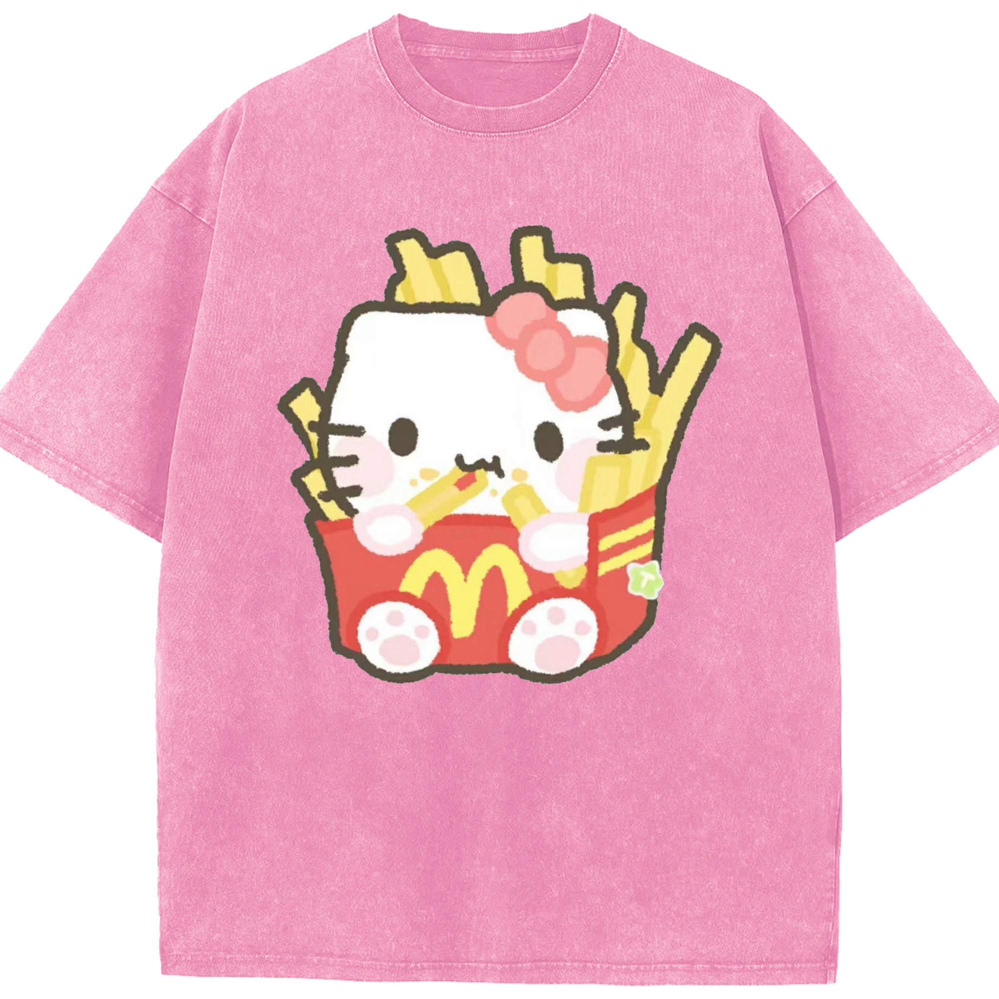 フライドポテトモチーフのハローキティ( - 綿100% ヴィンテージ風 半袖Tシャツ ・ 背面プリント ・ 柔らか肌触り ・ 通気性 快適 ・ スポーツ カジュアル 外出用