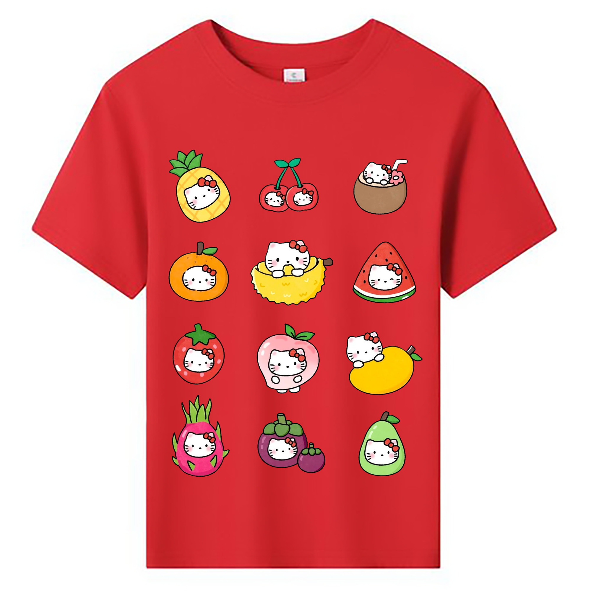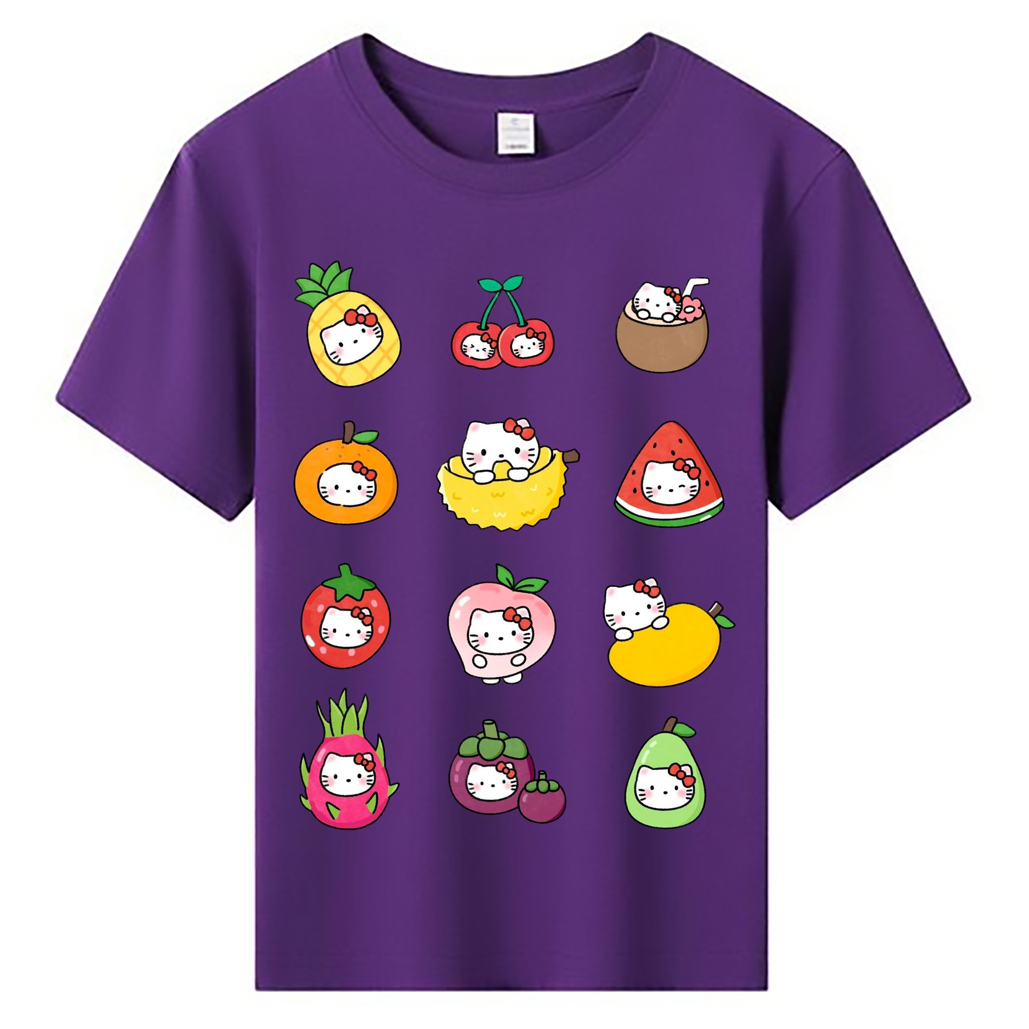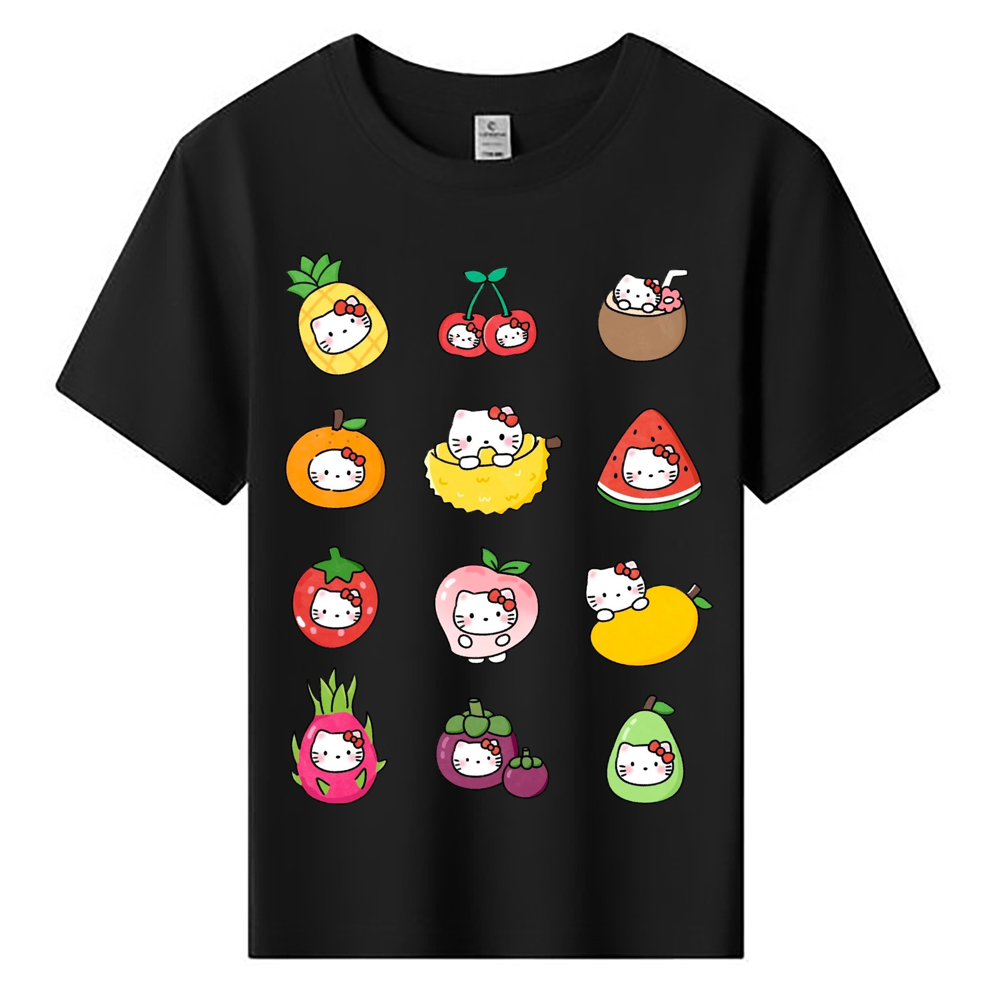 フルーツモチーフのハローキティ - 綿100% ヴィンテージ風 半袖Tシャツ ・ フロントプリント ・ 柔らか肌触り ・ 通気性 快適 ・ スポーツ カジュアル 外出用