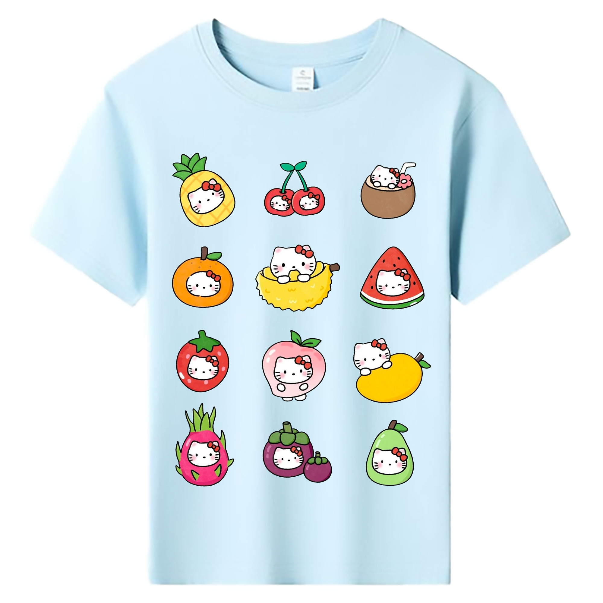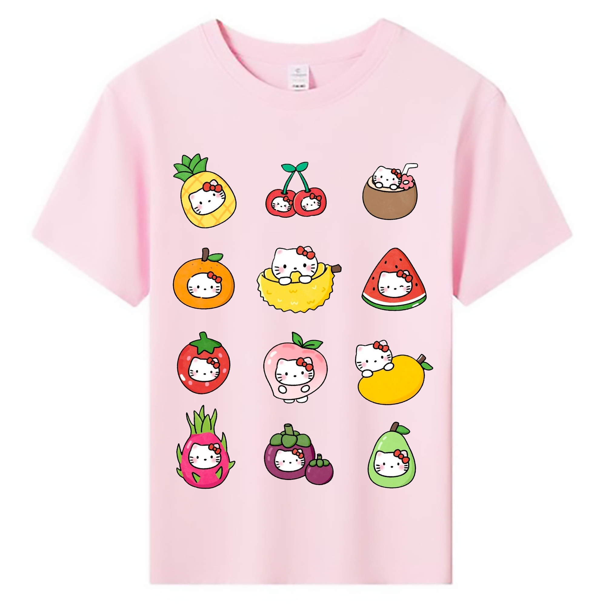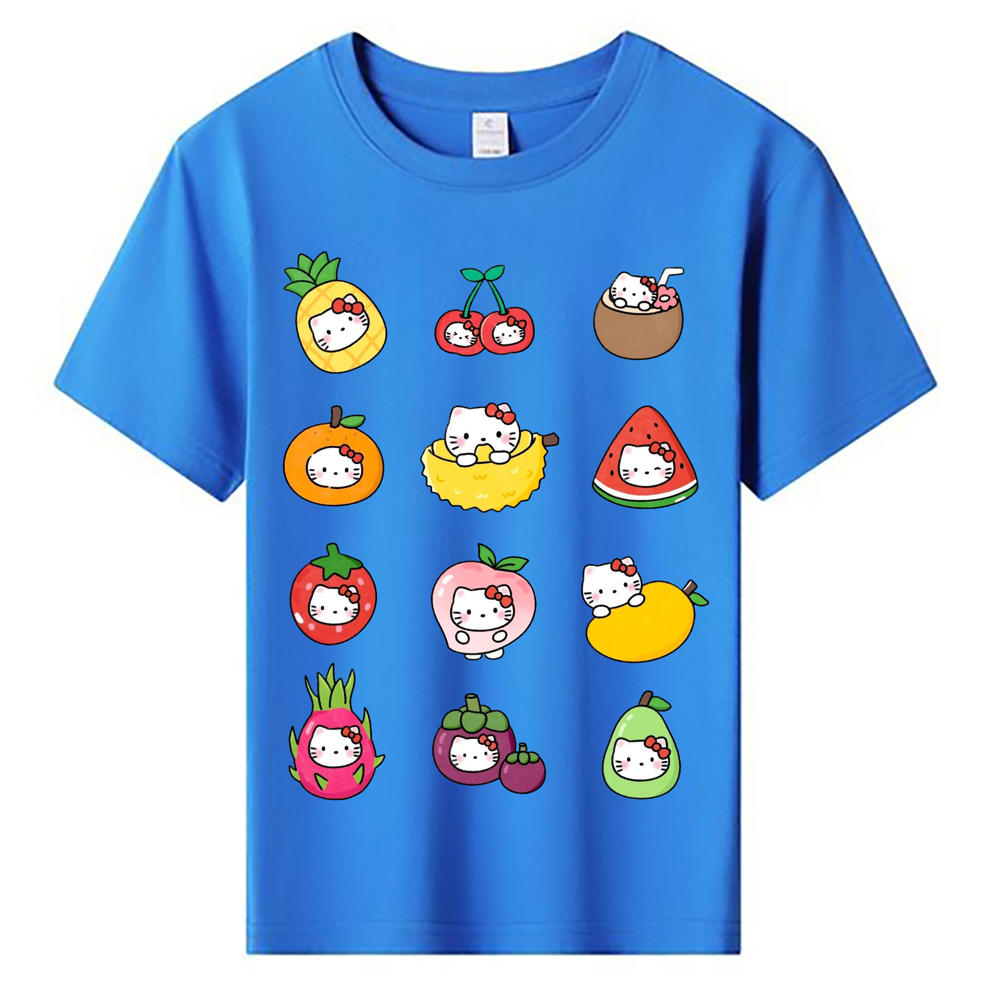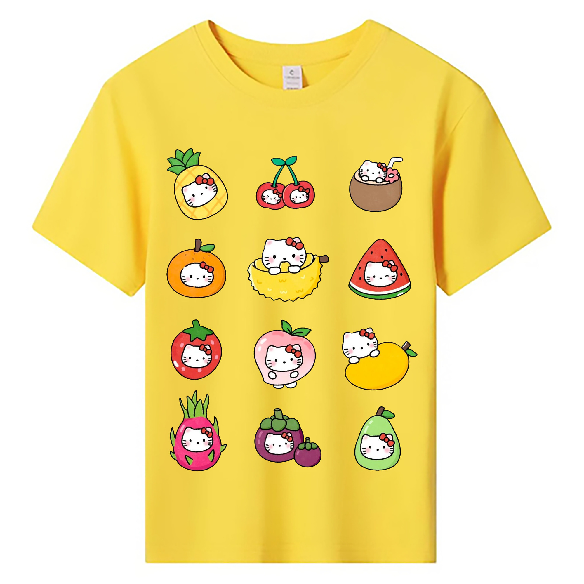 フルーツモチーフのハローキティ - 綿100% ヴィンテージ風 半袖Tシャツ ・ フロントプリント ・ 柔らか肌触り ・ 通気性 快適 ・ スポーツ カジュアル 外出用