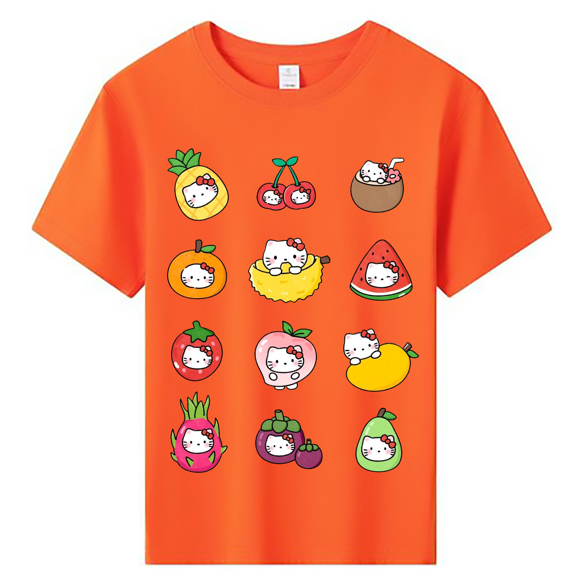 フルーツモチーフのハローキティ - 綿100% ヴィンテージ風 半袖Tシャツ ・ 背面プリント ・ 柔らか肌触り ・ 通気性 快適 ・ スポーツ カジュアル 外出用