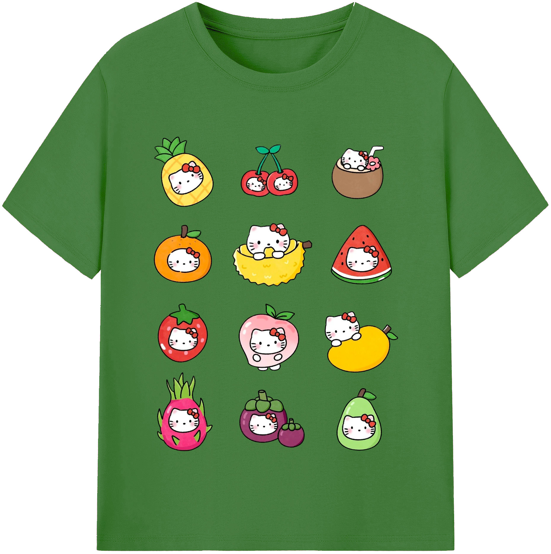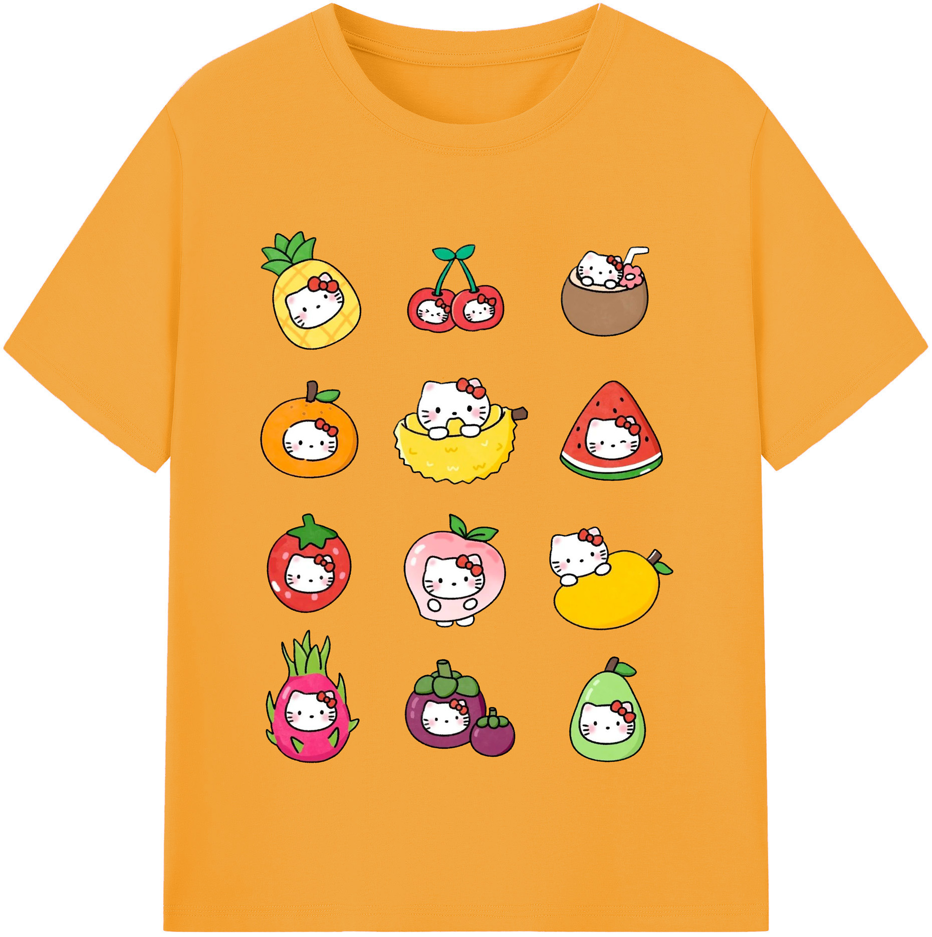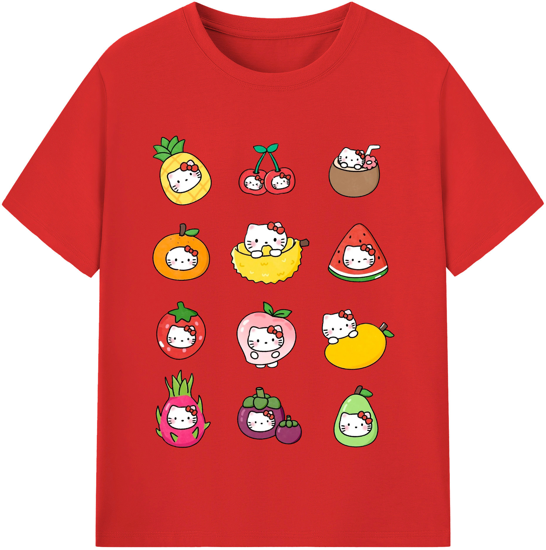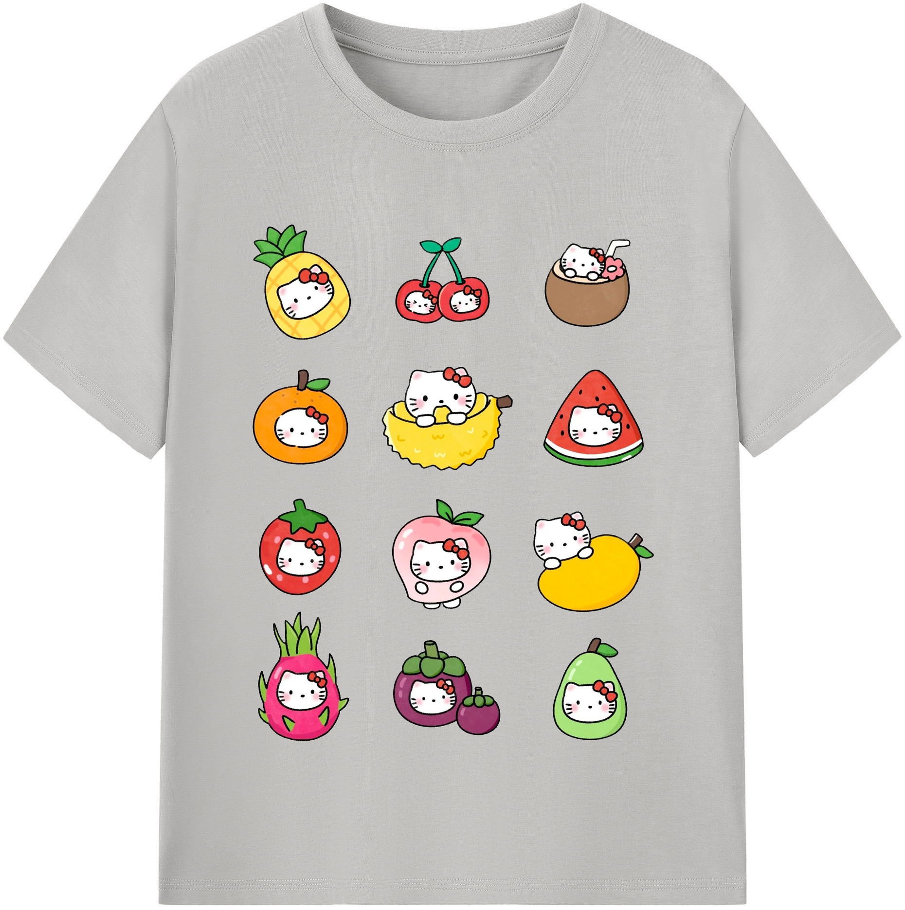 フルーツモチーフのハローキティ - 綿100% ヴィンテージ風 半袖Tシャツ ・ フロントプリント ・ 柔らか肌触り ・ 通気性 快適 ・ スポーツ カジュアル 外出用
