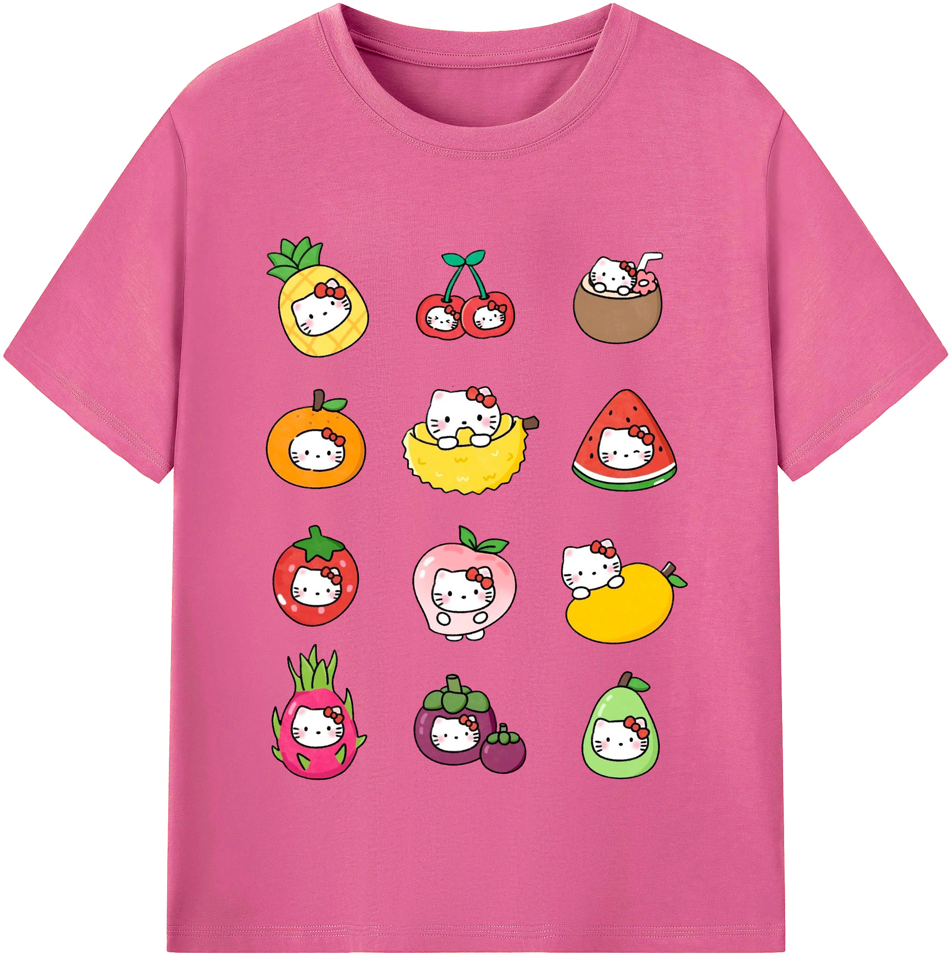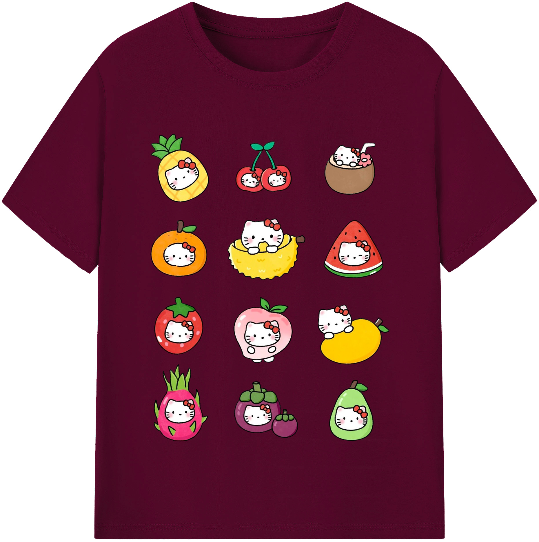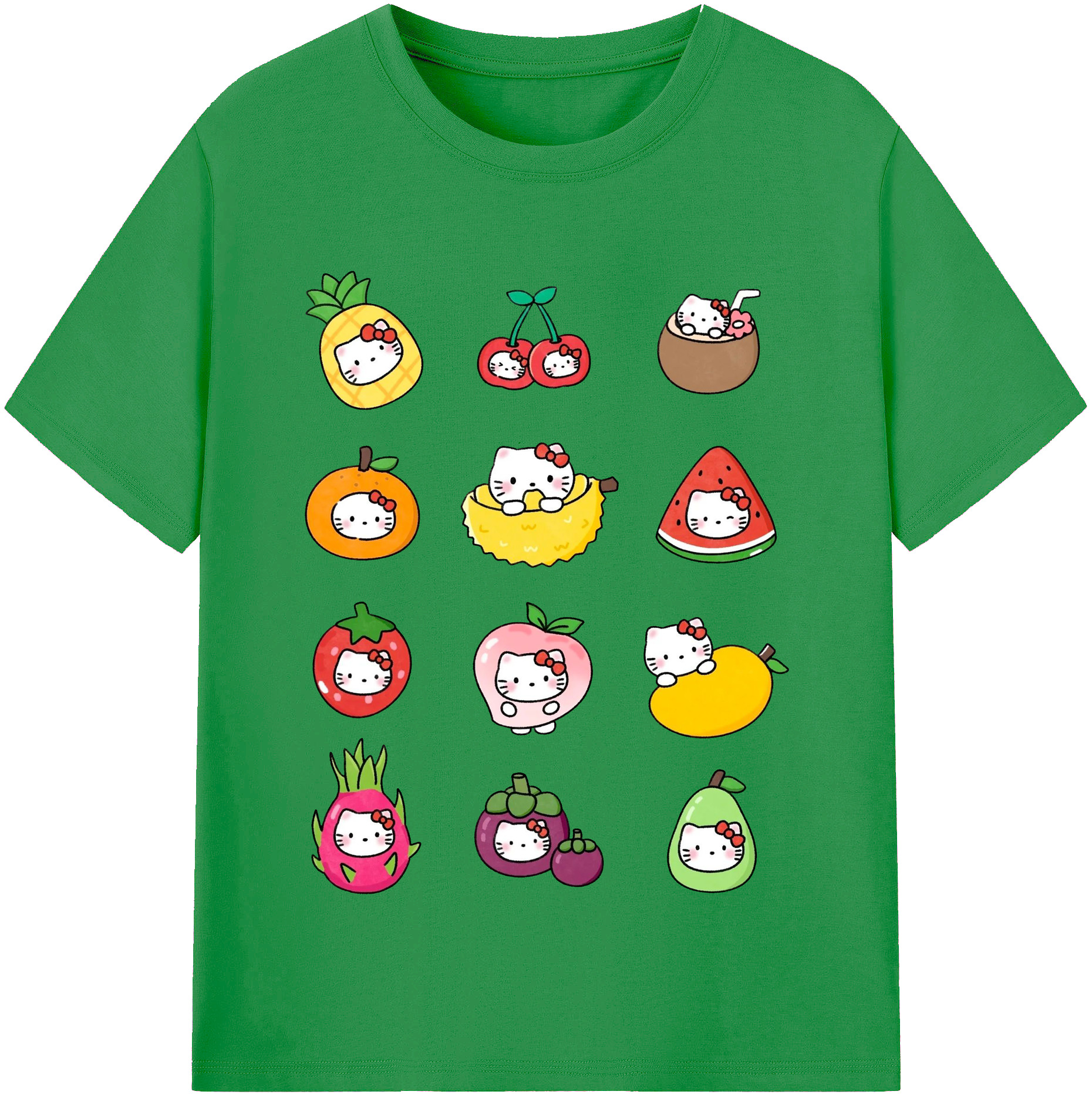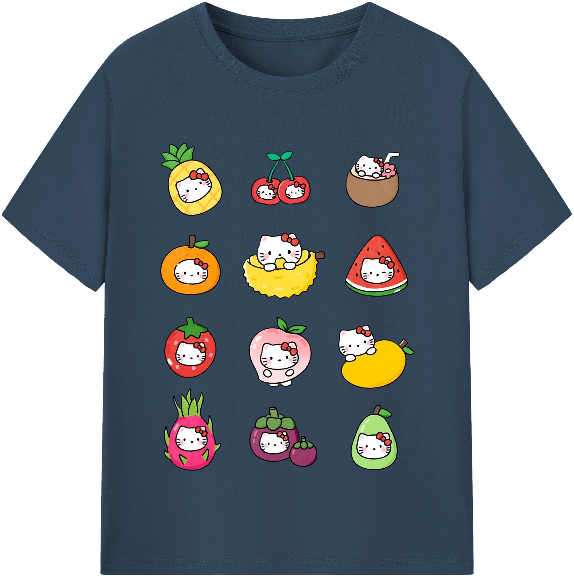 フルーツモチーフのハローキティ - 綿100% ヴィンテージ風 半袖Tシャツ ・ フロントプリント ・ 柔らか肌触り ・ 通気性 快適 ・ スポーツ カジュアル 外出用