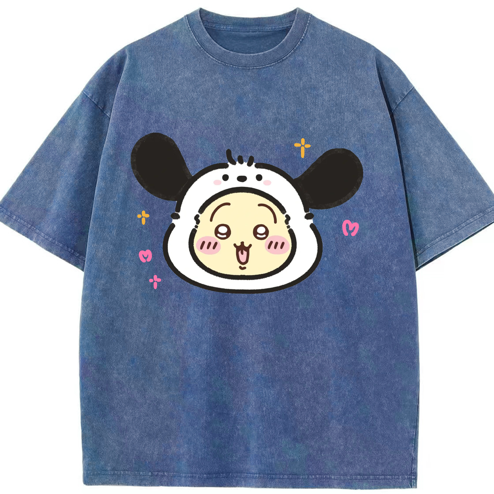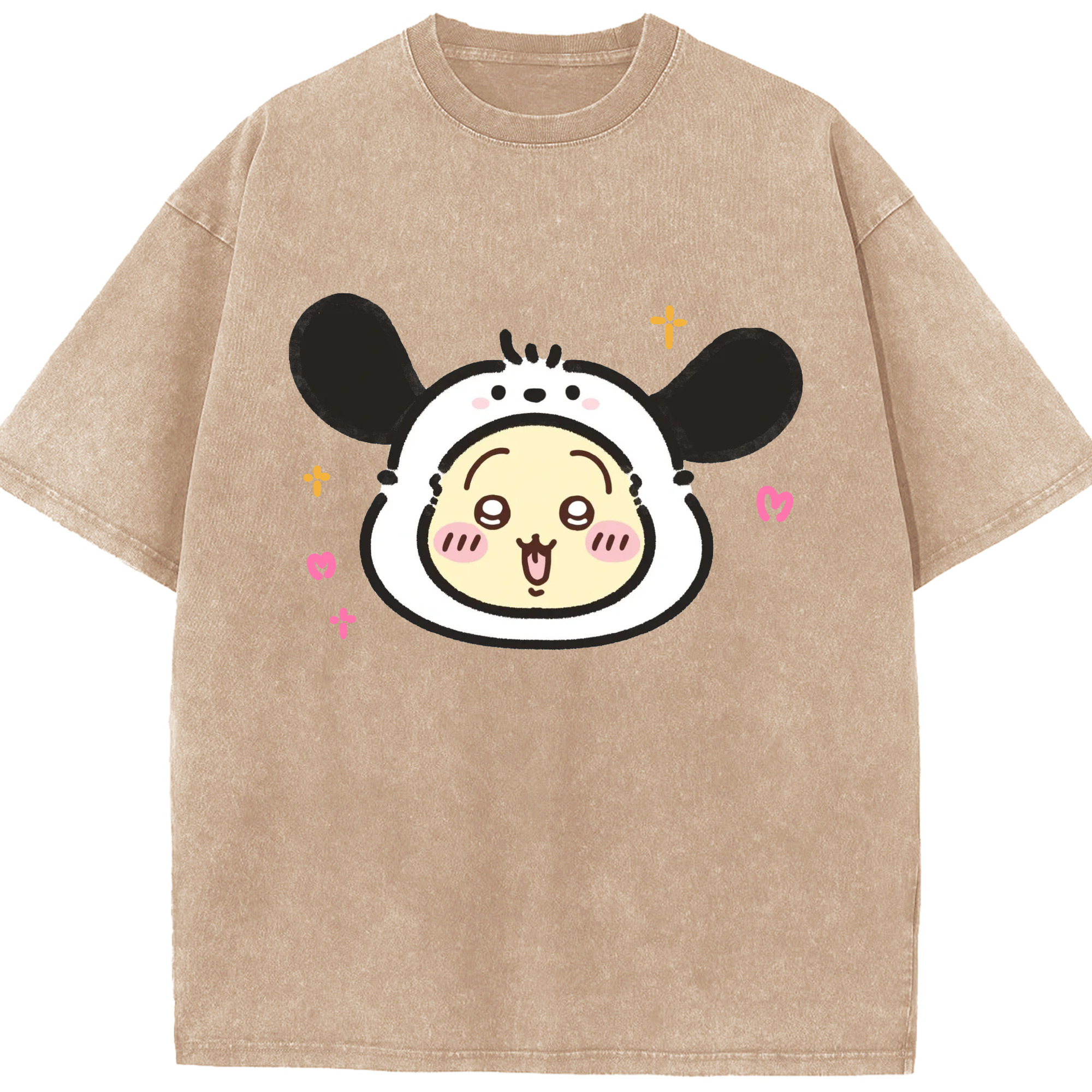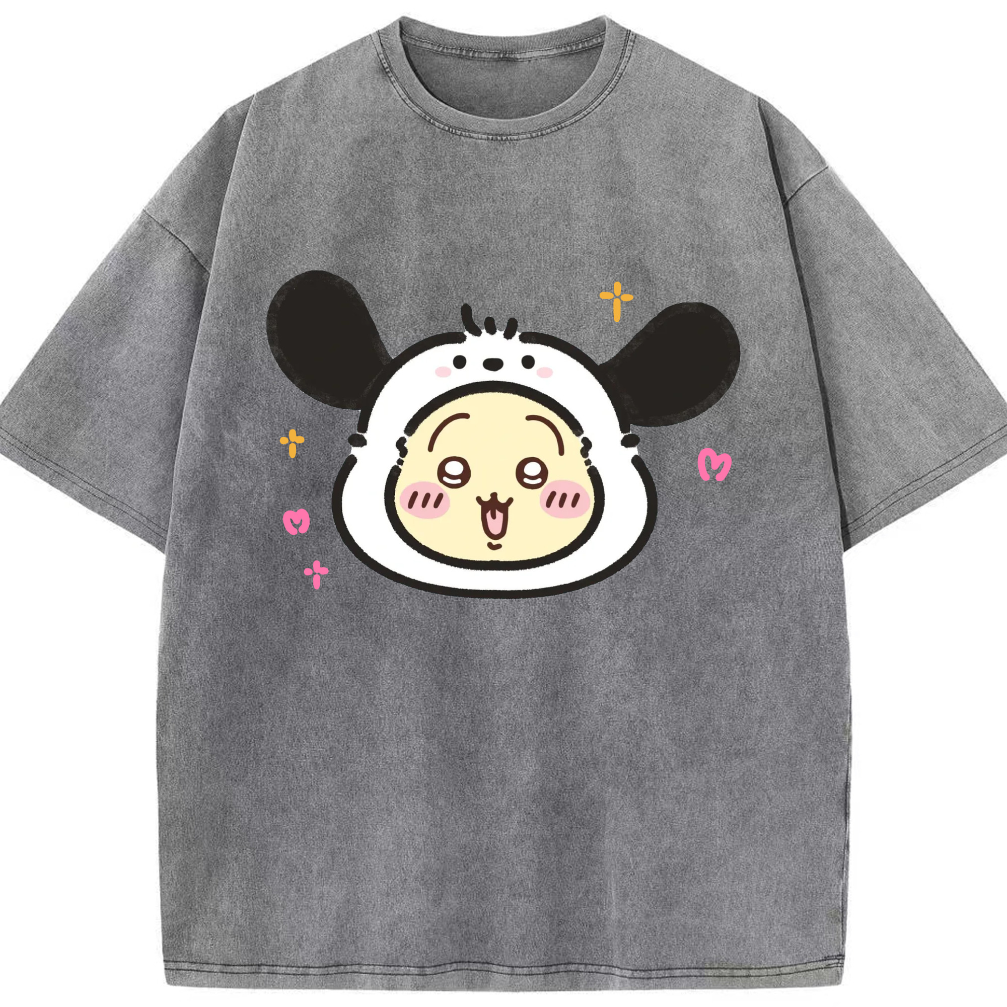 ポチャッコ&ちいかわ - 綿100% ヴィンテージ風 半袖Tシャツ ・ 背面プリント ・ 柔らか肌触り ・ 通気性 快適 ・ スポーツ カジュアル 外出用