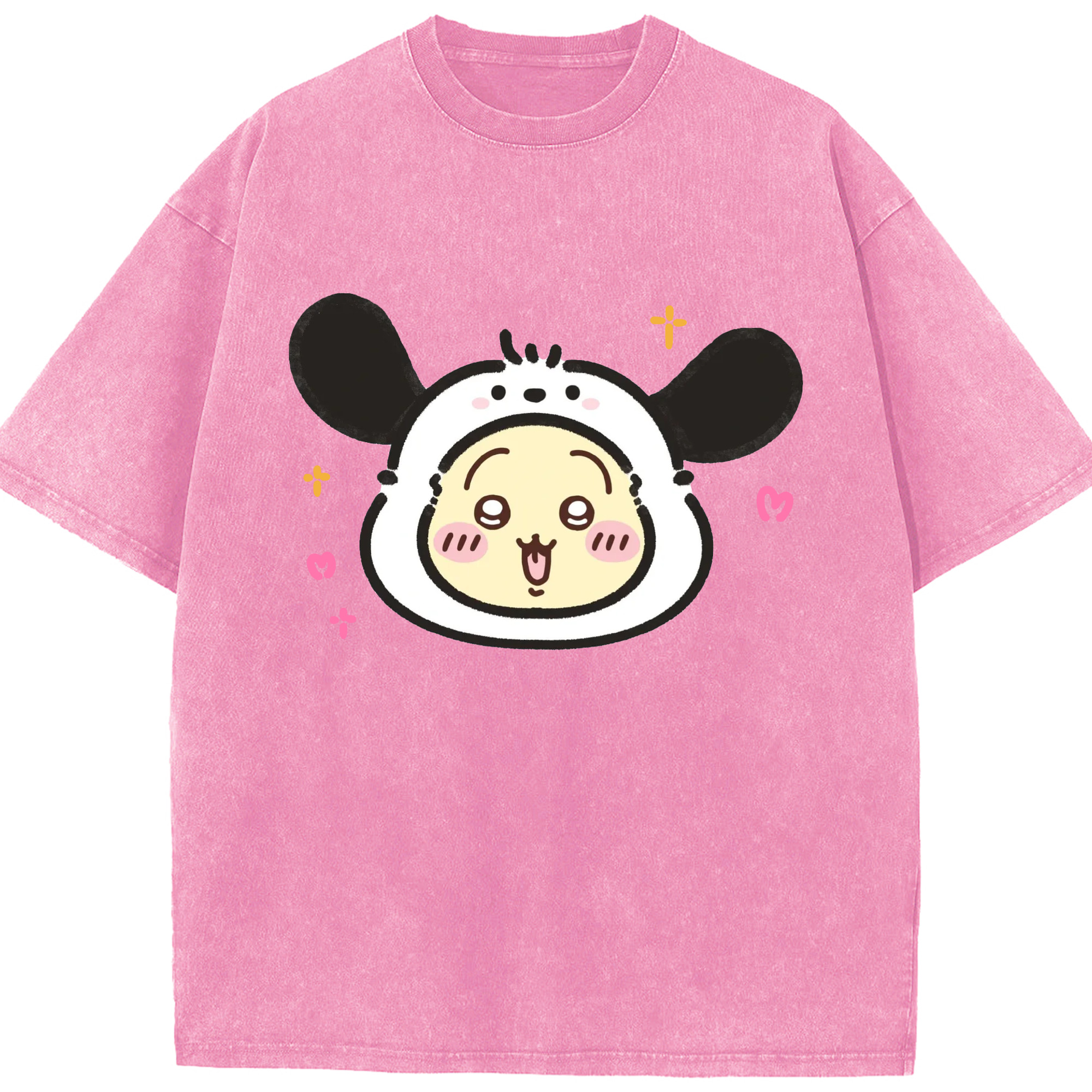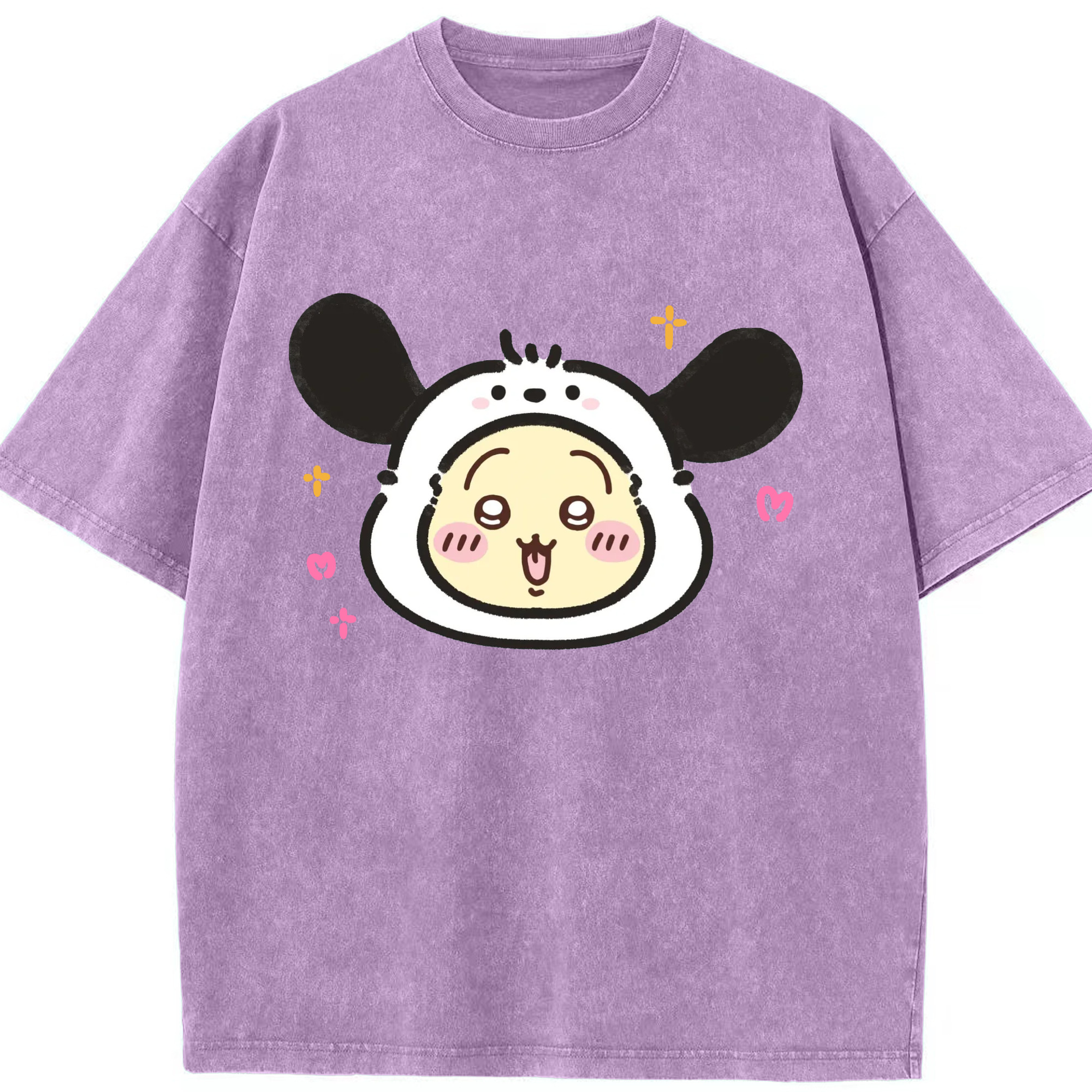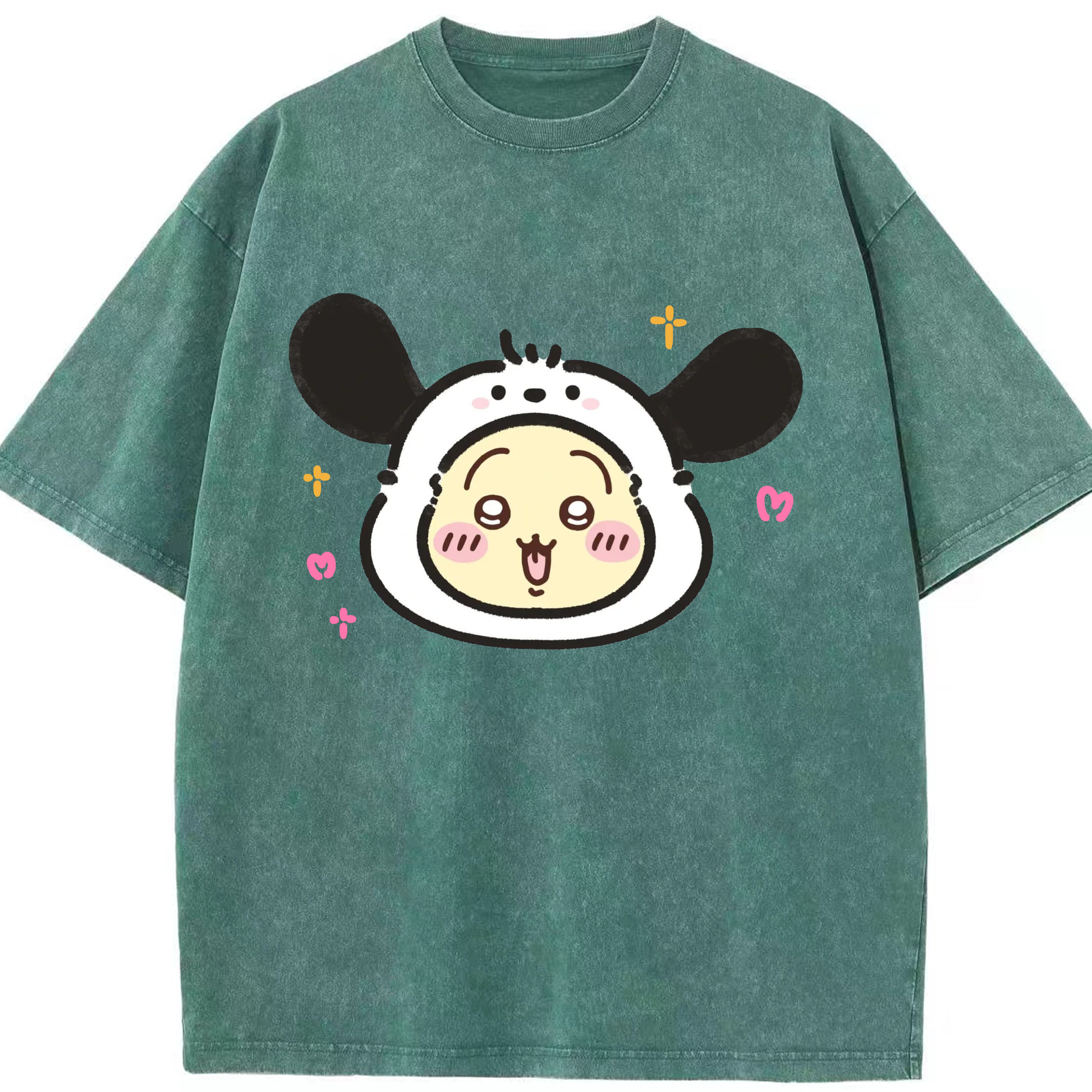 ポチャッコ&ちいかわ - 綿100% ヴィンテージ風 半袖Tシャツ ・ 背面プリント ・ 柔らか肌触り ・ 通気性 快適 ・ スポーツ カジュアル 外出用
