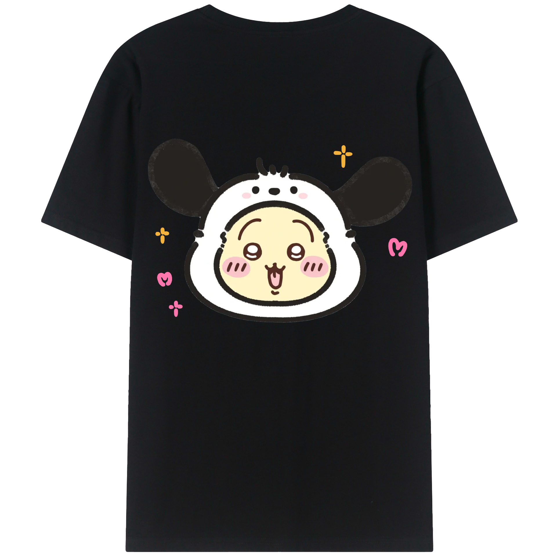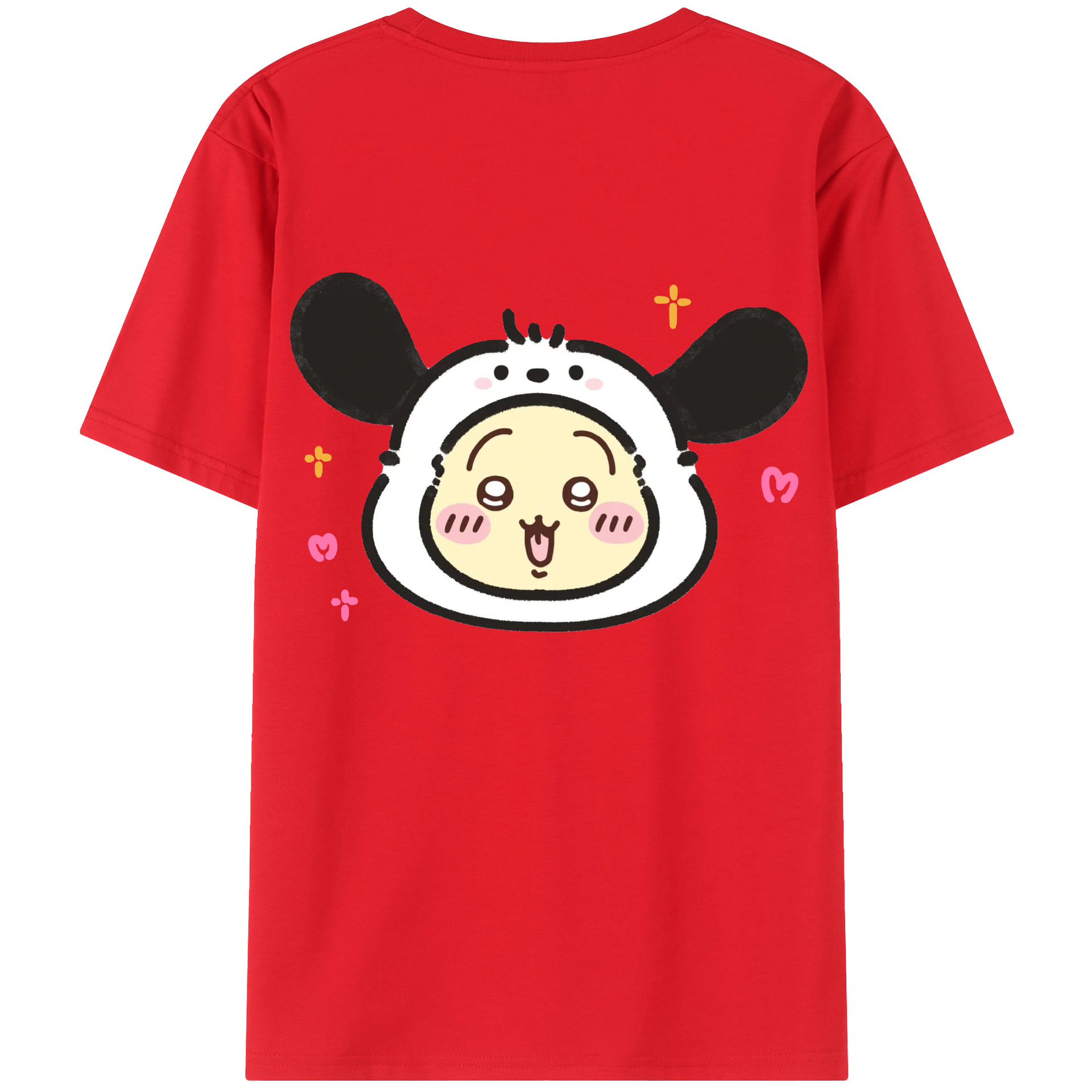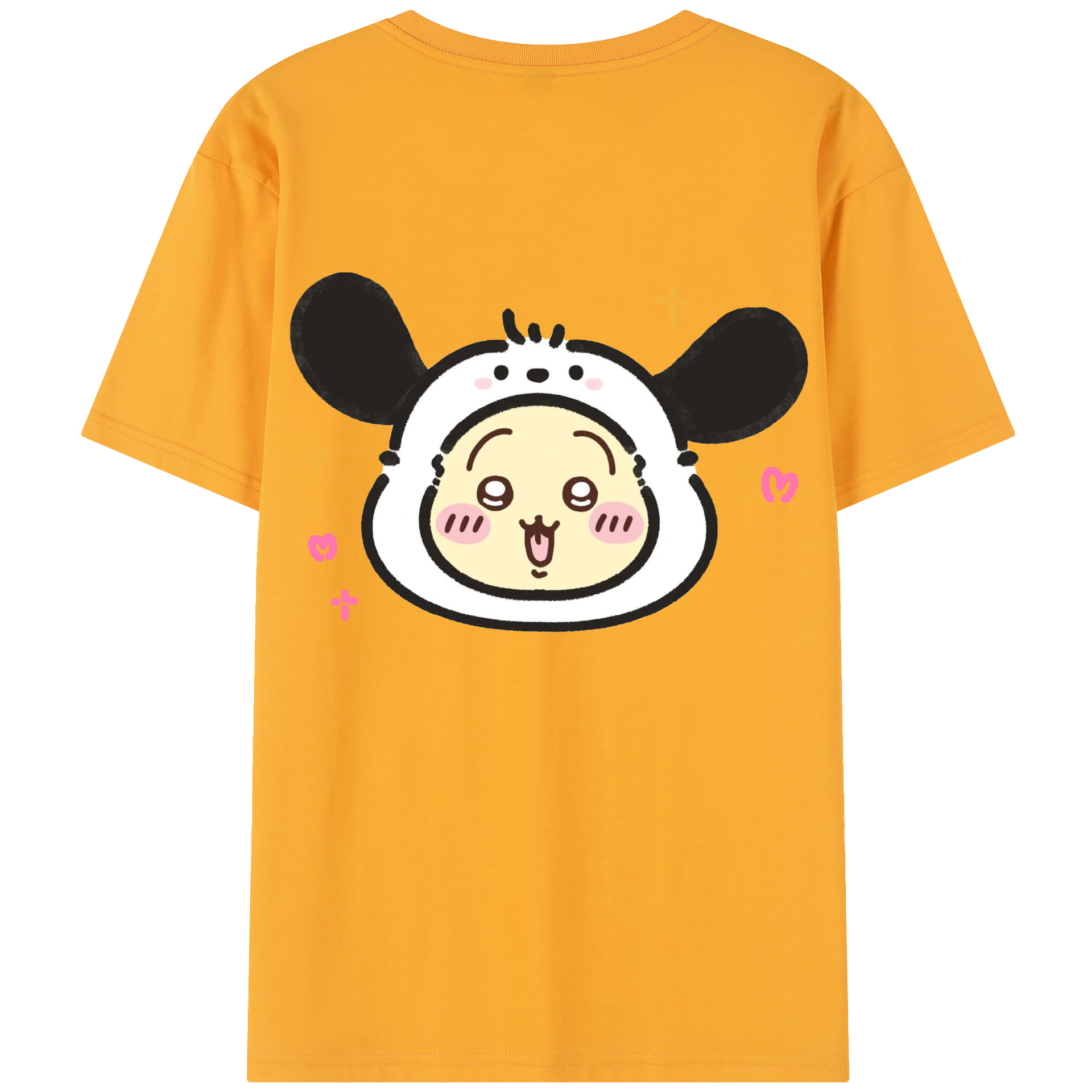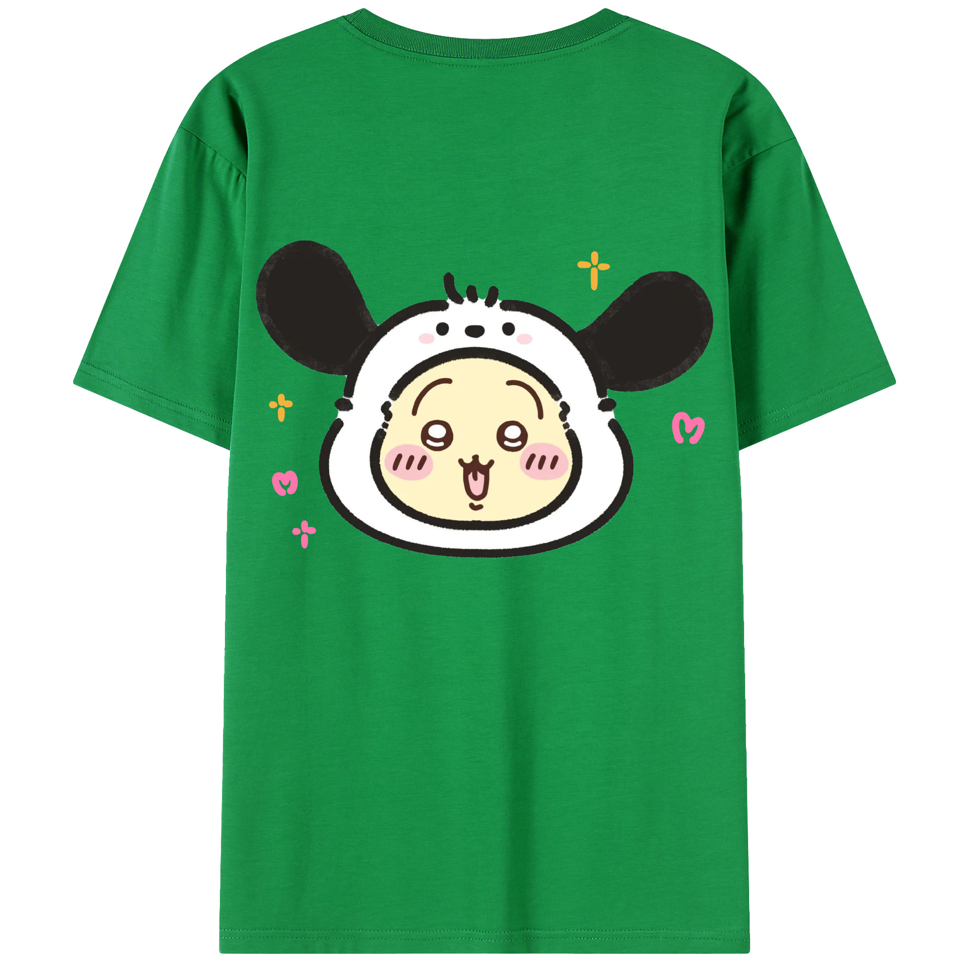 ポチャッコ&ちいかわ - レディース半袖Tシャツ ・ 綿100% ・ バックプリント ・ 強化クルーネック ・ 二重折り袖口 ・ 快適 通気性 ・ フィットネス カジュアル 旅行用