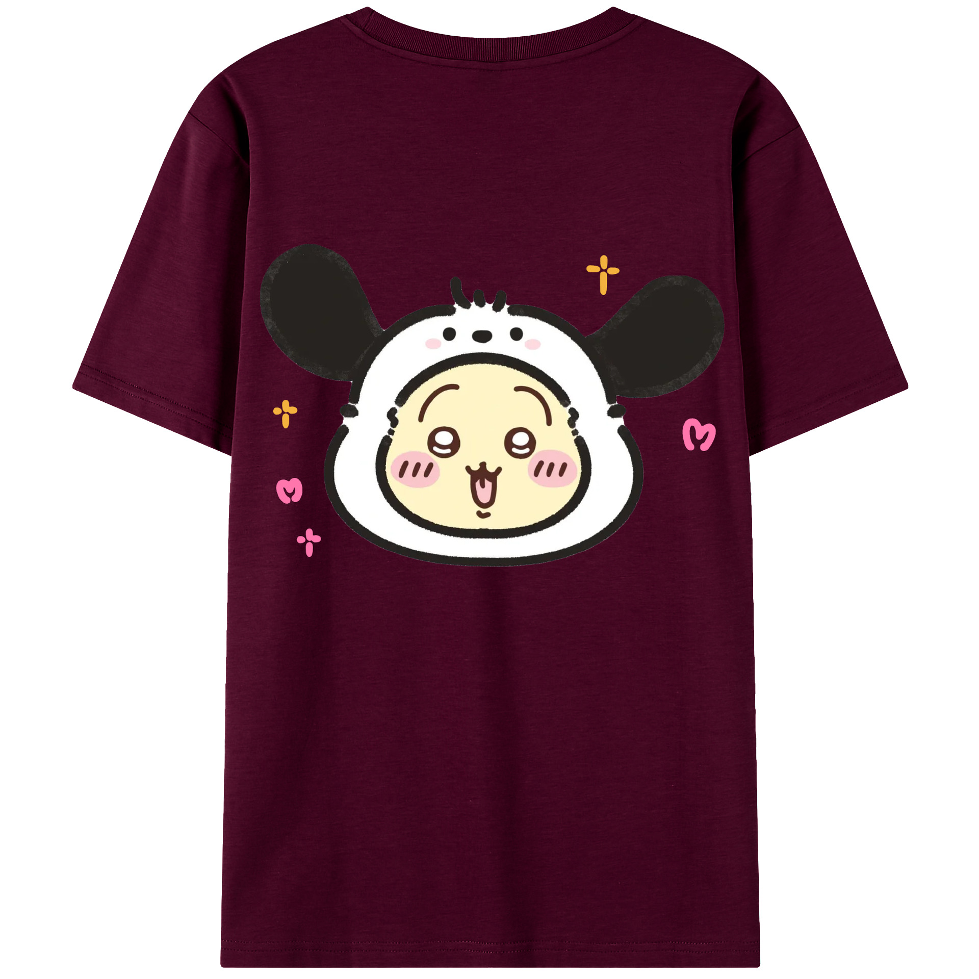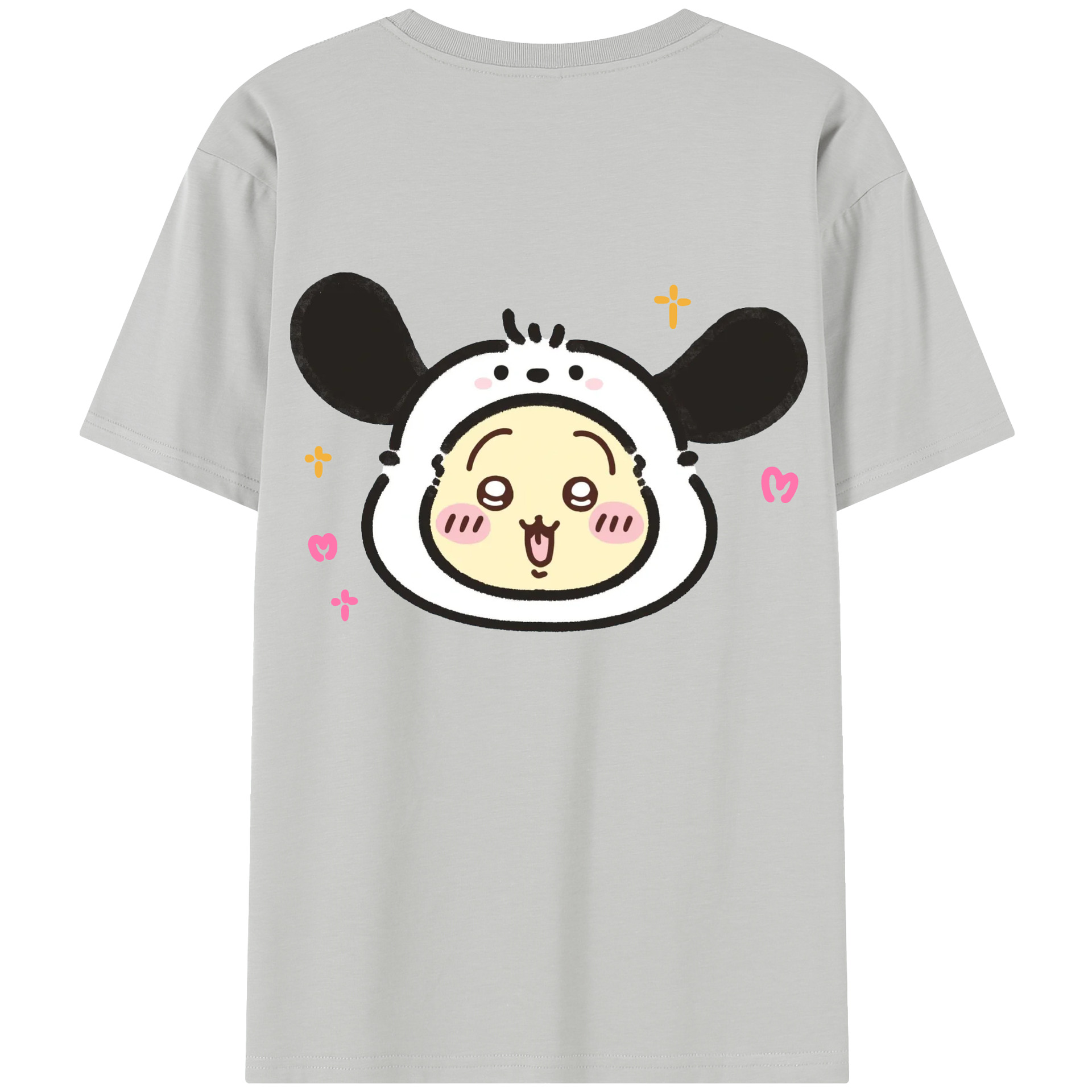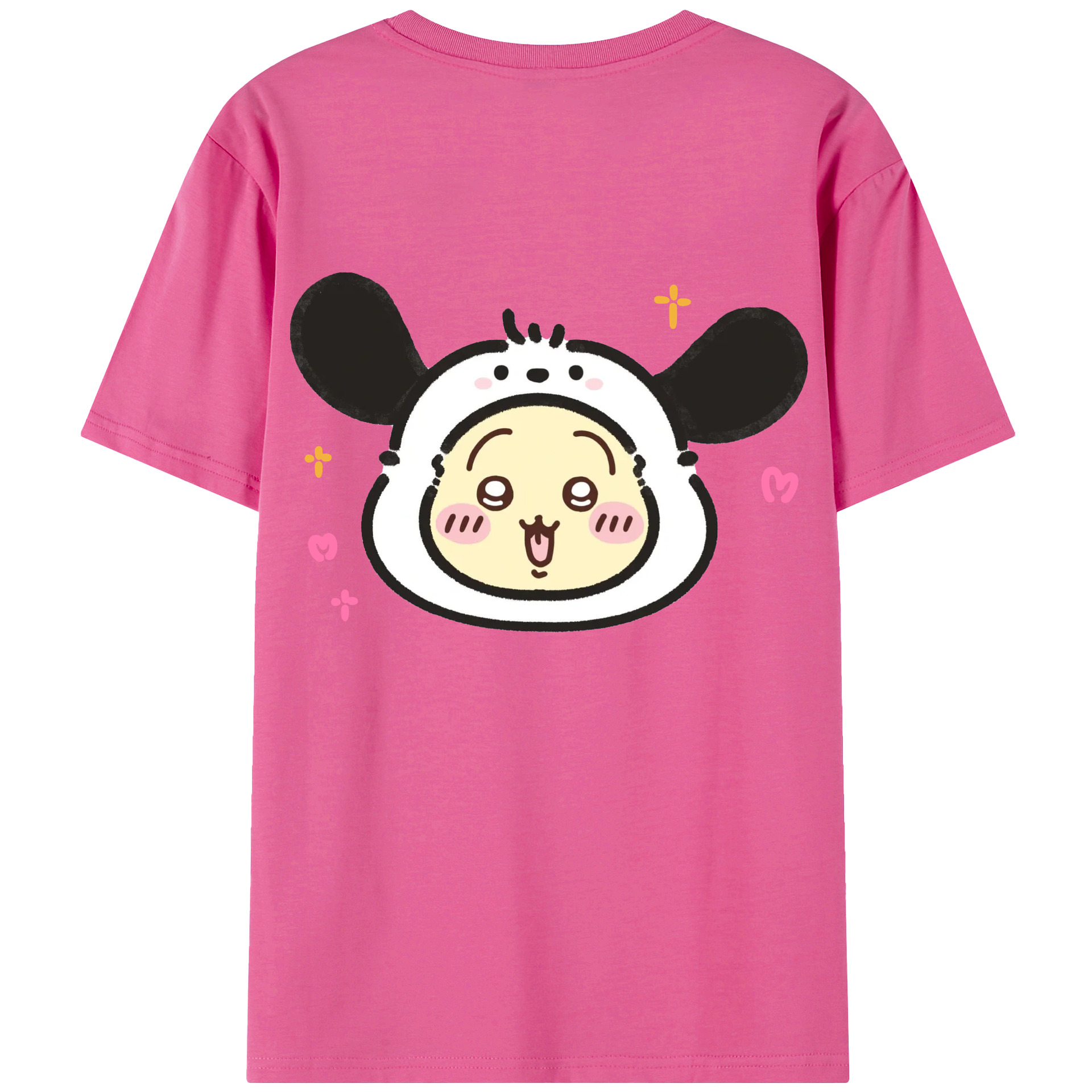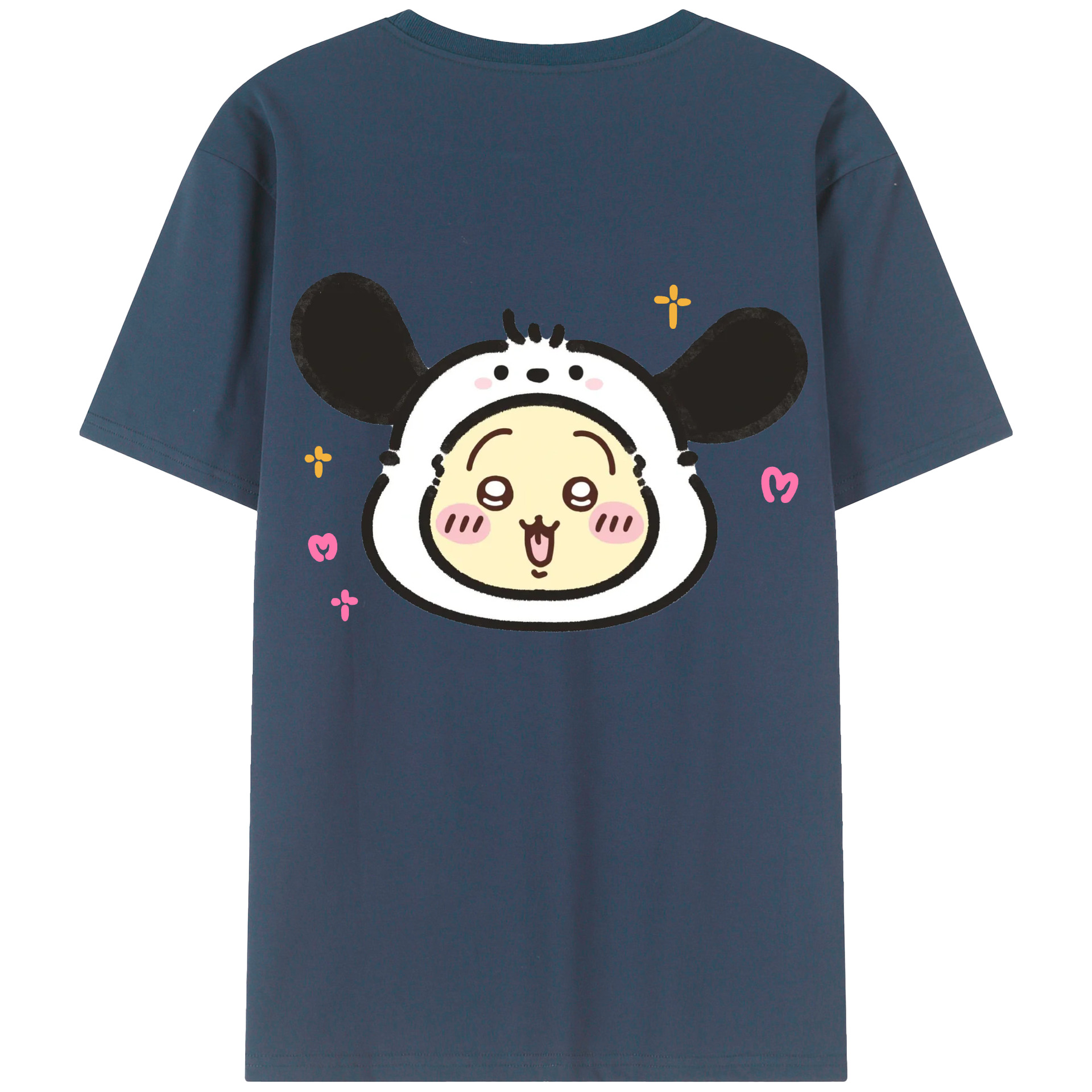 ポチャッコ&ちいかわ - レディース半袖Tシャツ ・ 綿100% ・ バックプリント ・ 強化クルーネック ・ 二重折り袖口 ・ 快適 通気性 ・ フィットネス カジュアル 旅行用