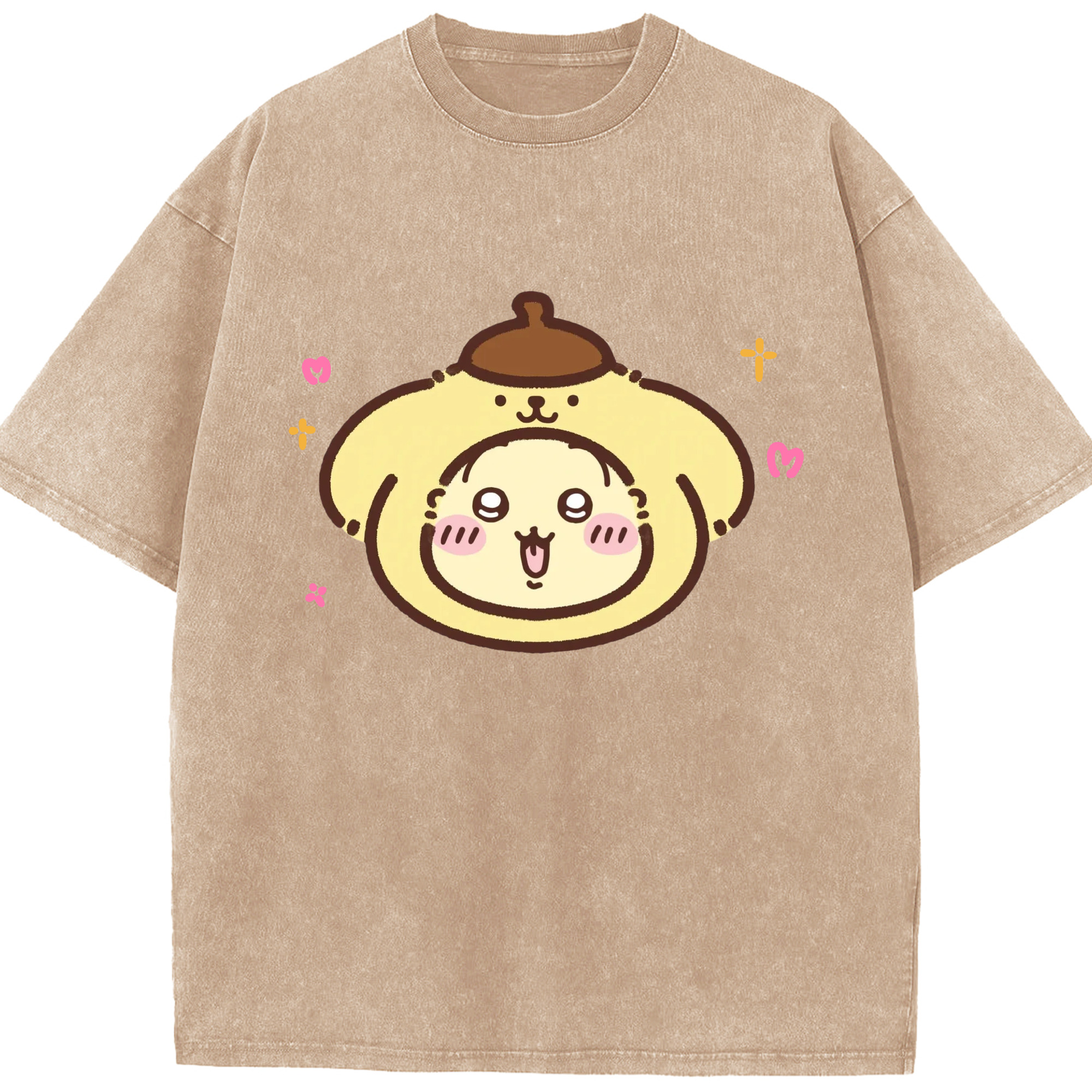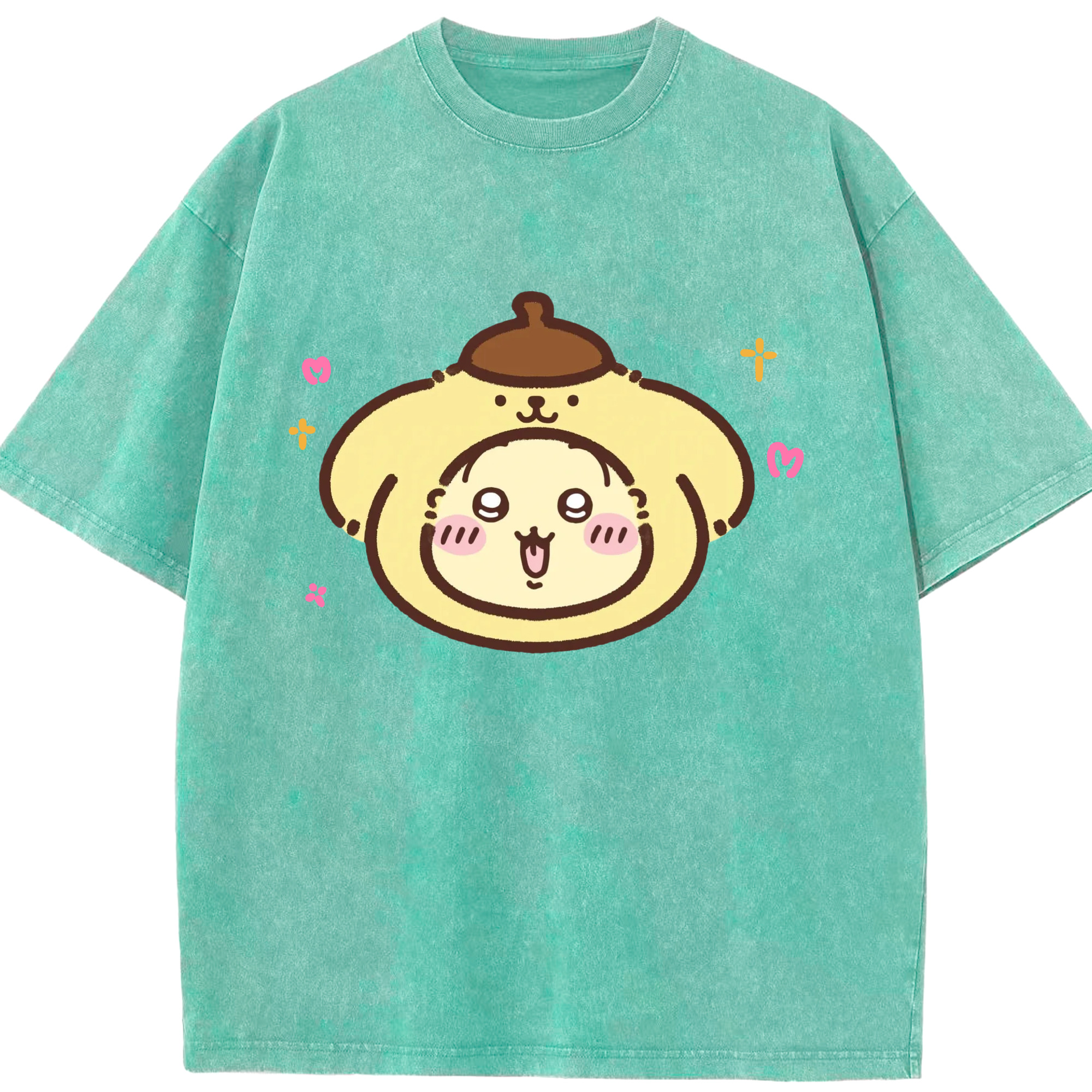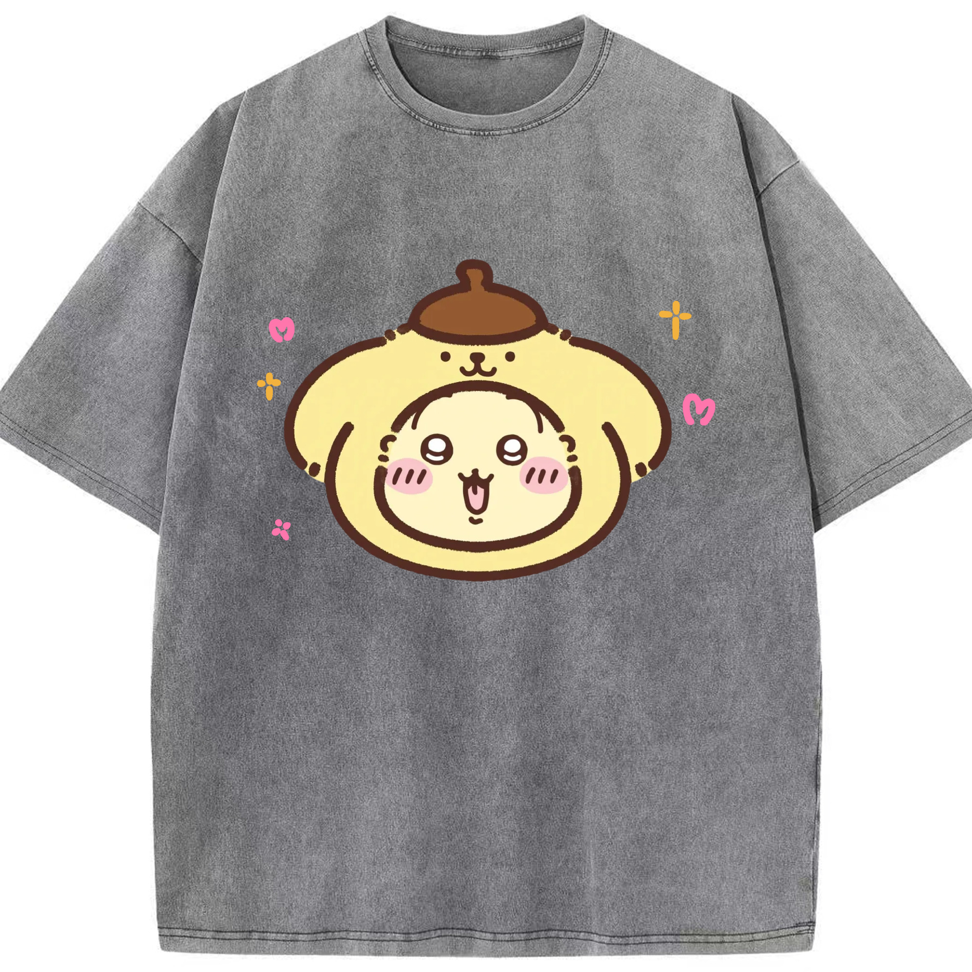 ポムポムプリン&ちいかわ - 綿100% ヴィンテージ風 半袖Tシャツ ・ 背面プリント ・ 柔らか肌触り ・ 通気性 快適 ・ スポーツ カジュアル 外出用