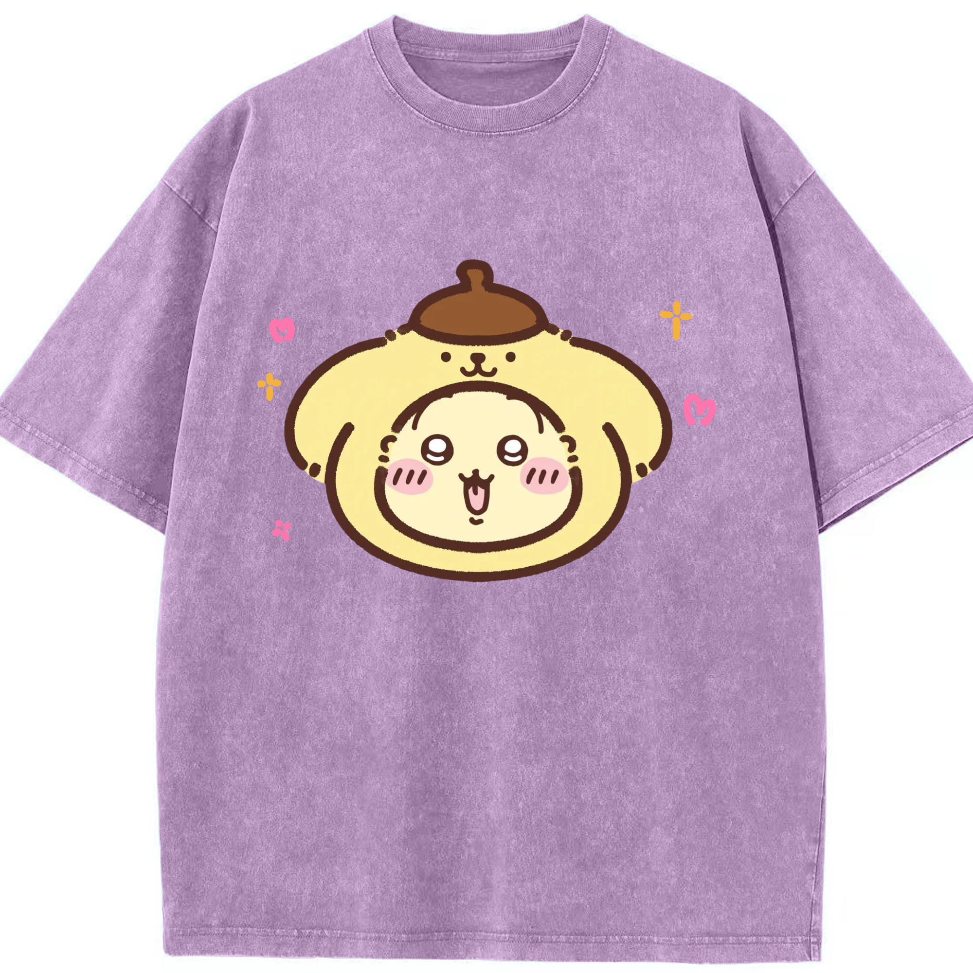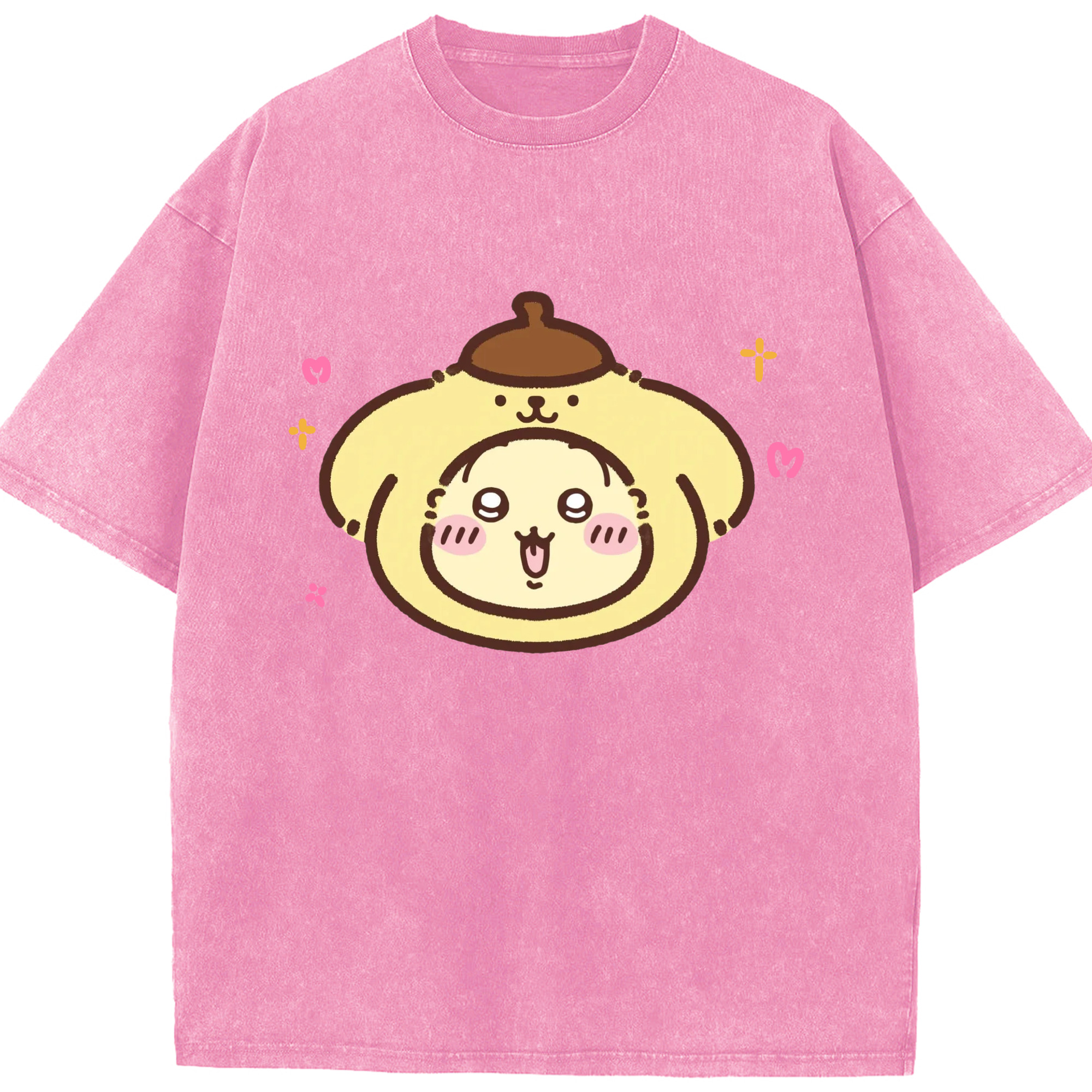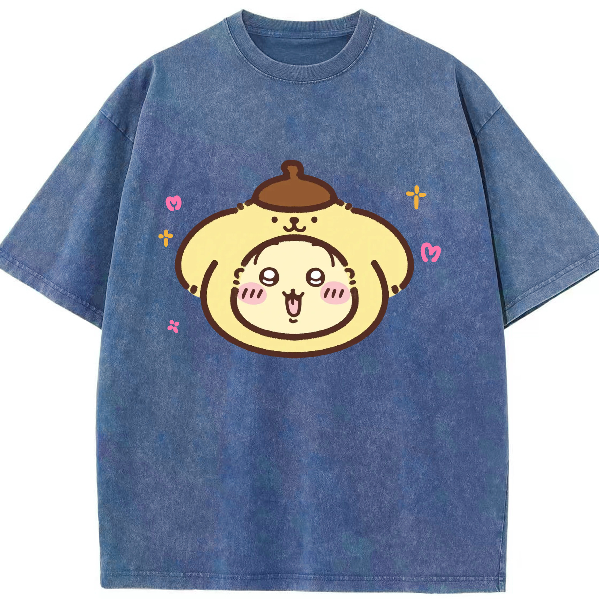 ポムポムプリン&ちいかわ - 綿100% ヴィンテージ風 半袖Tシャツ ・ 背面プリント ・ 柔らか肌触り ・ 通気性 快適 ・ スポーツ カジュアル 外出用