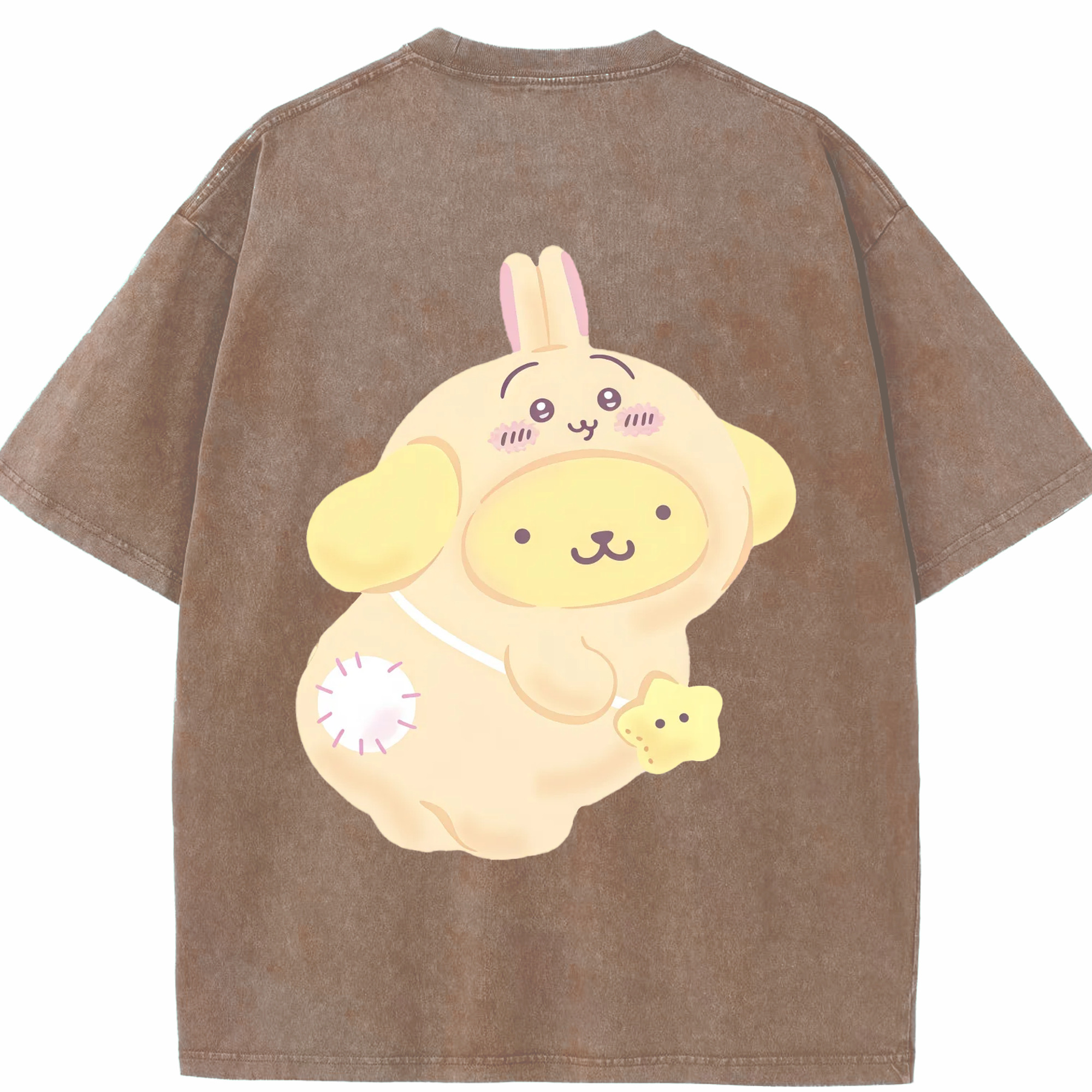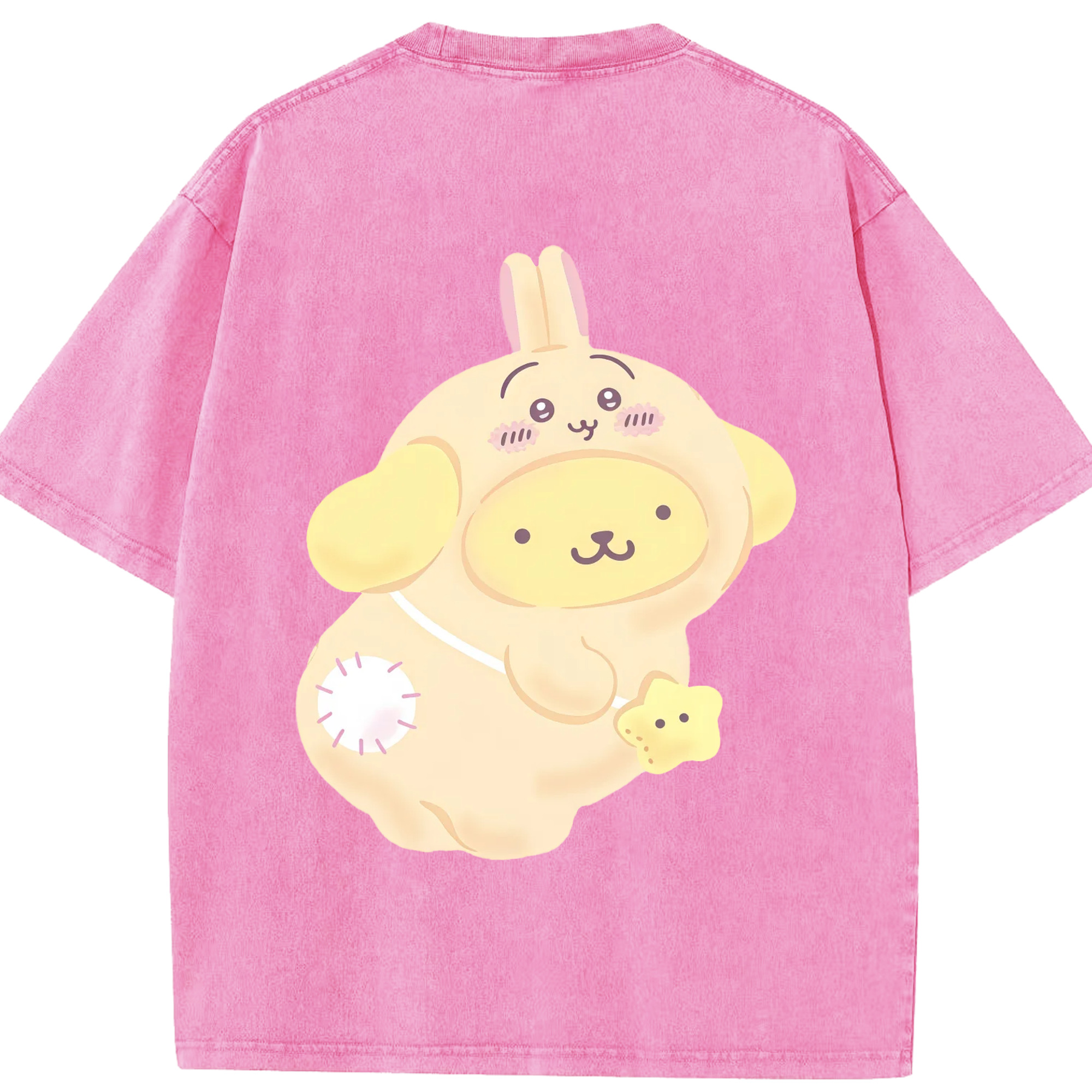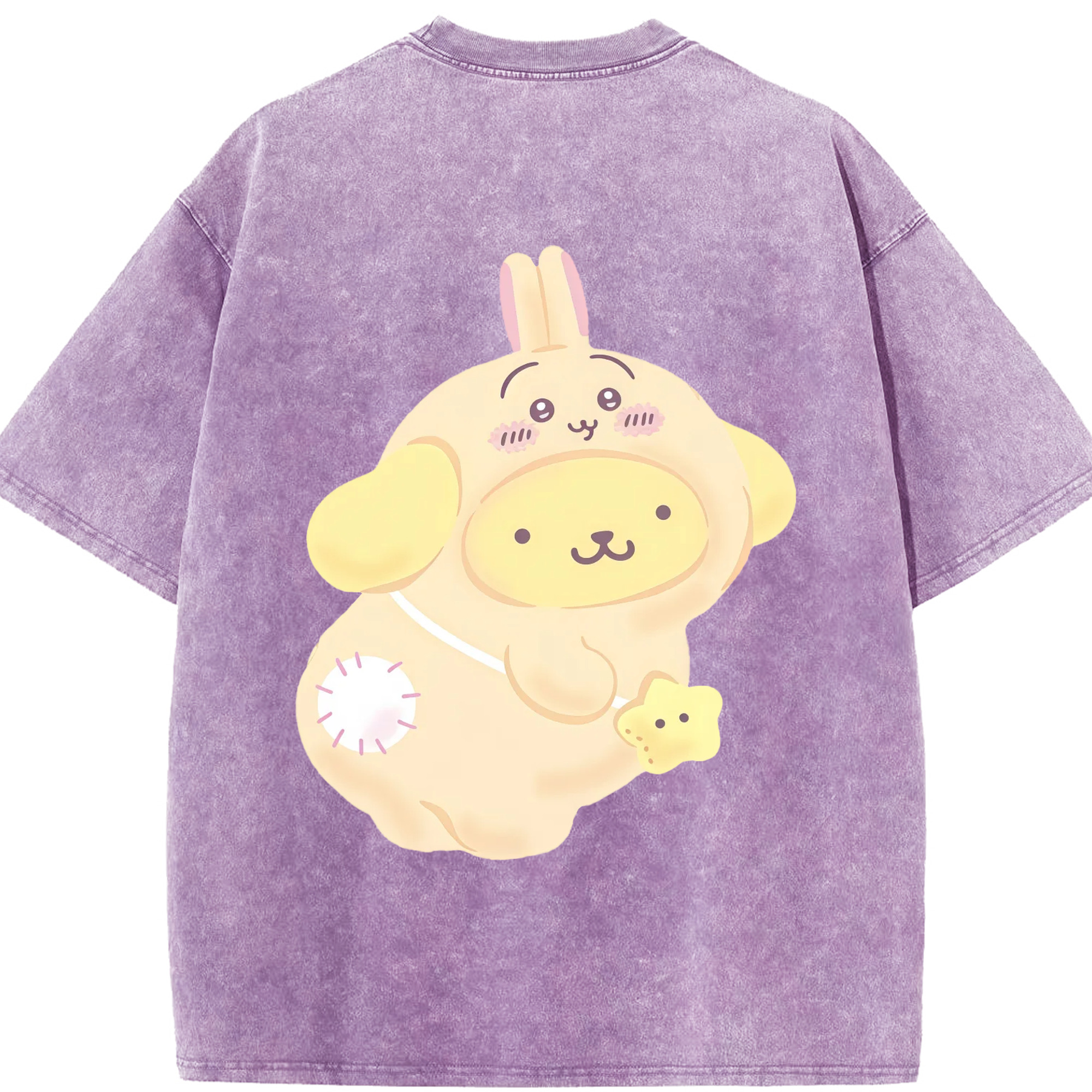 ポムポムプリン&ちいかわ - 綿100% ヴィンテージ風 半袖Tシャツ ・ フロントプリント ・ 柔らか肌触り ・ 通気性 快適 ・ スポーツ カジュアル 外出用