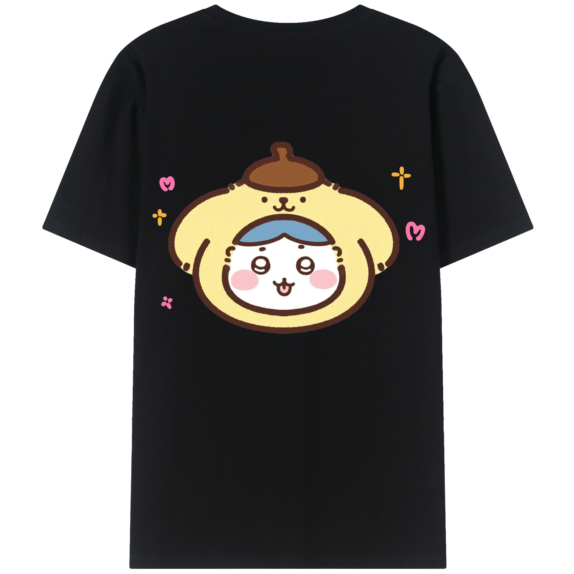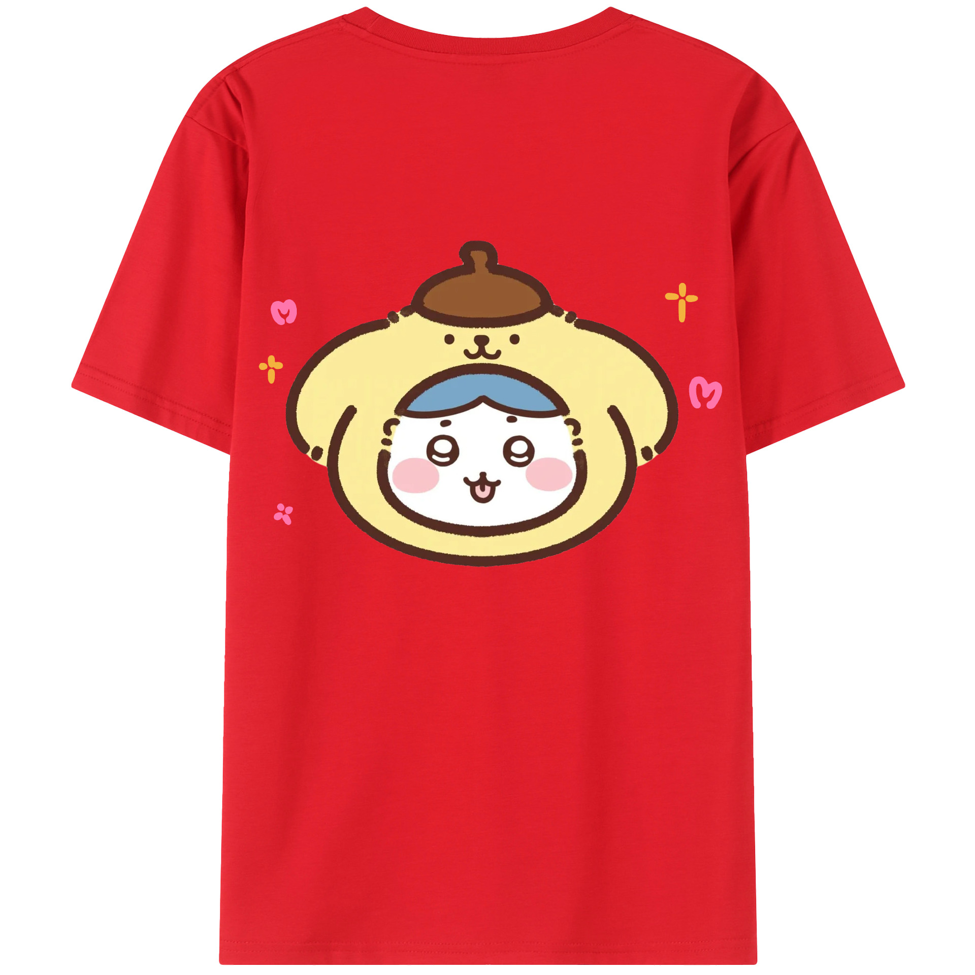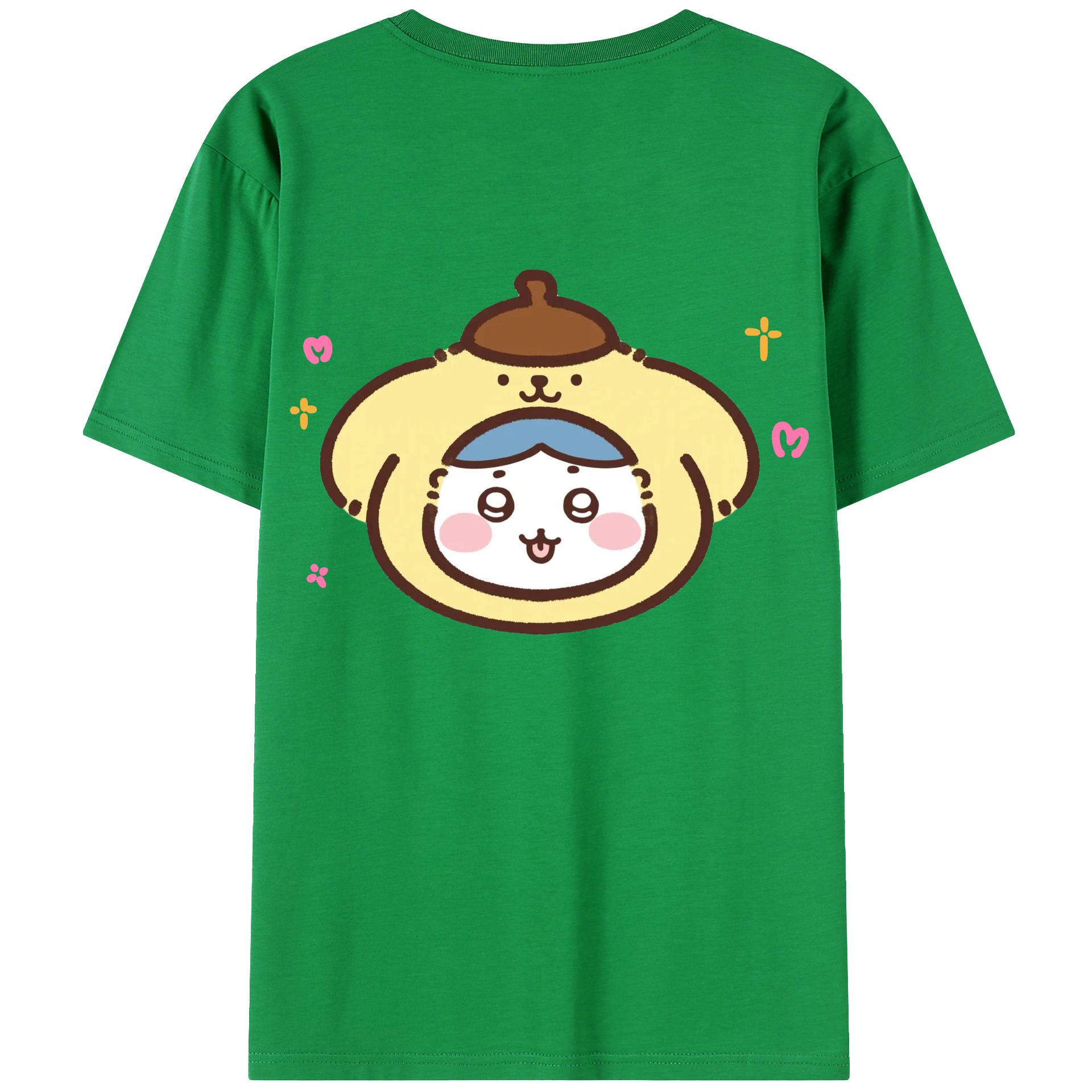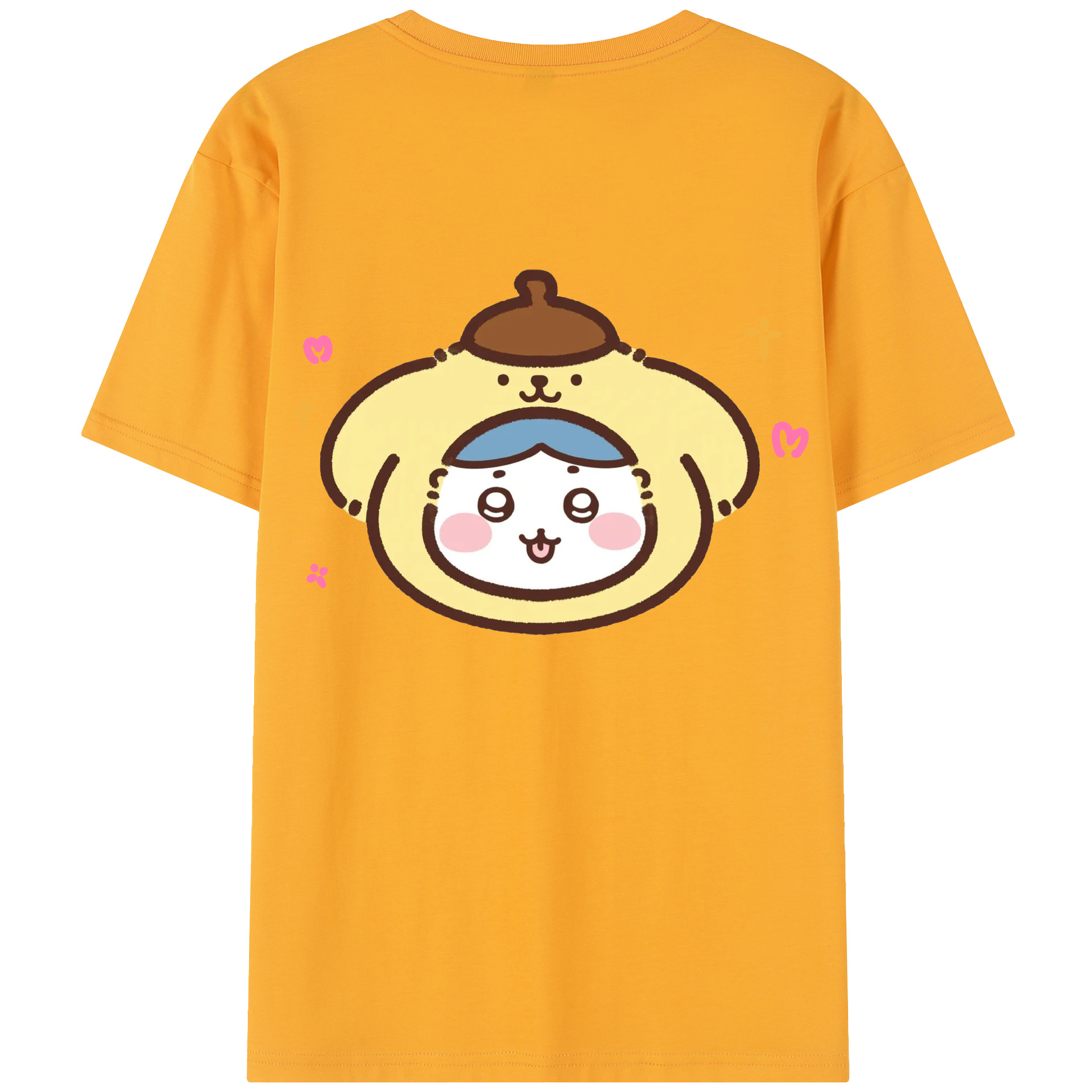 ポムポムプリン&ちいかわ - レディース半袖Tシャツ ・ 綿100% ・ バックプリント ・ 強化クルーネック ・ 二重折り袖口 ・ 快適 通気性 ・ フィットネス カジュアル 旅行用