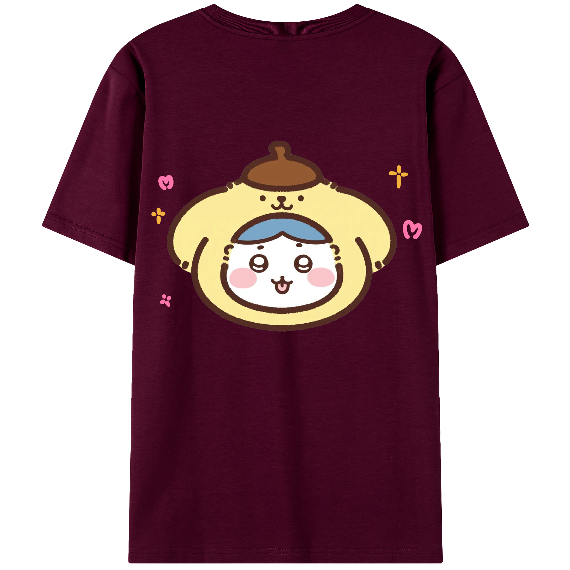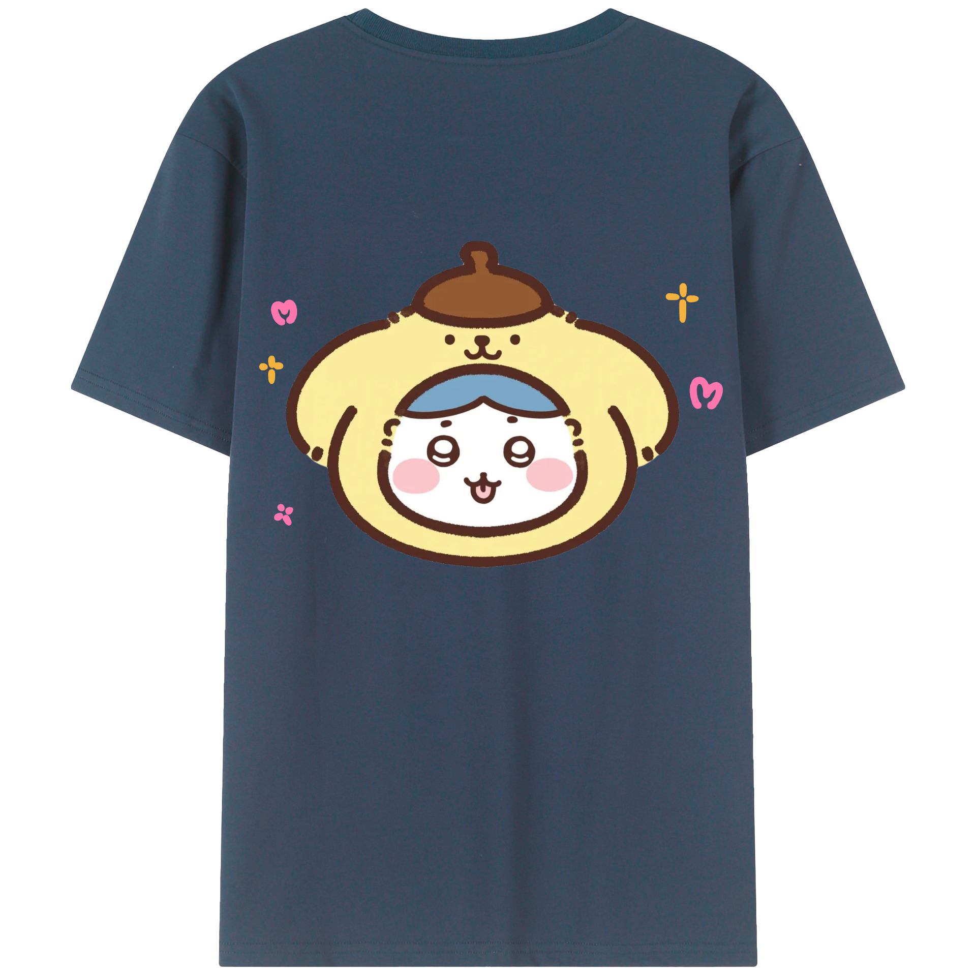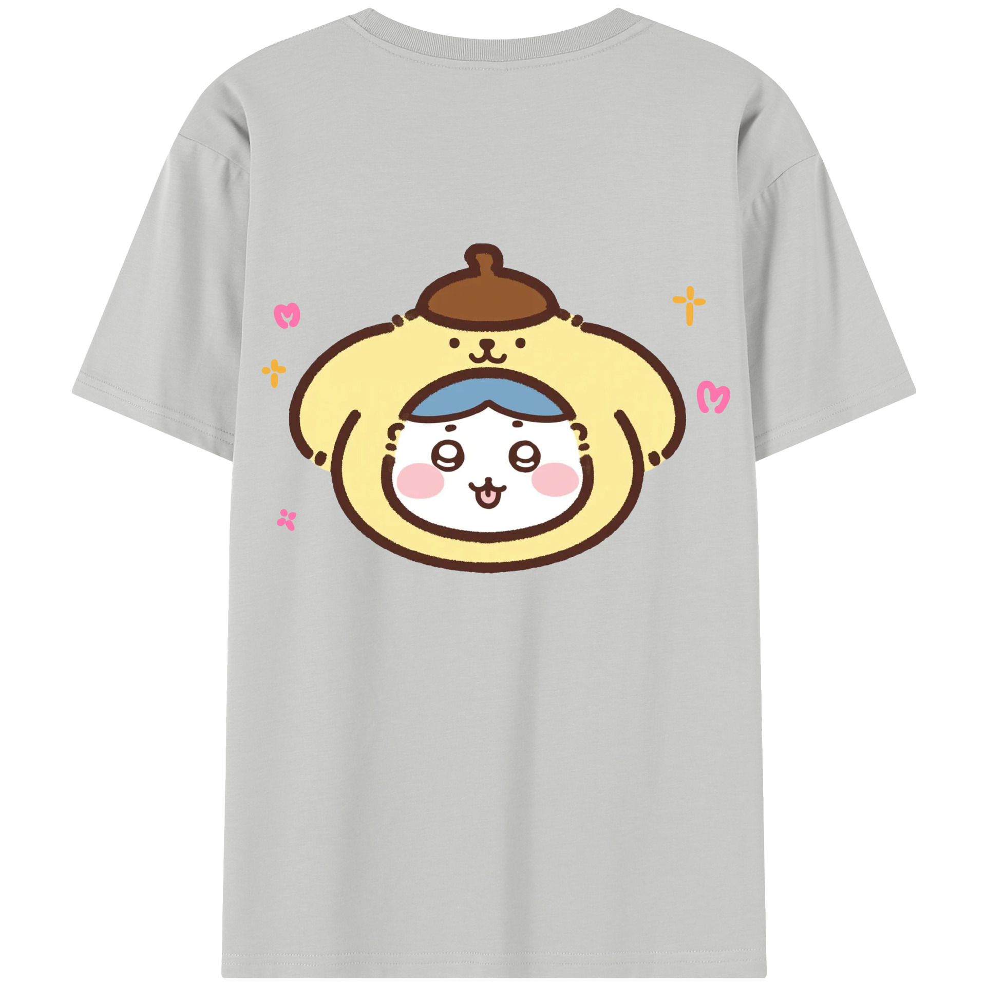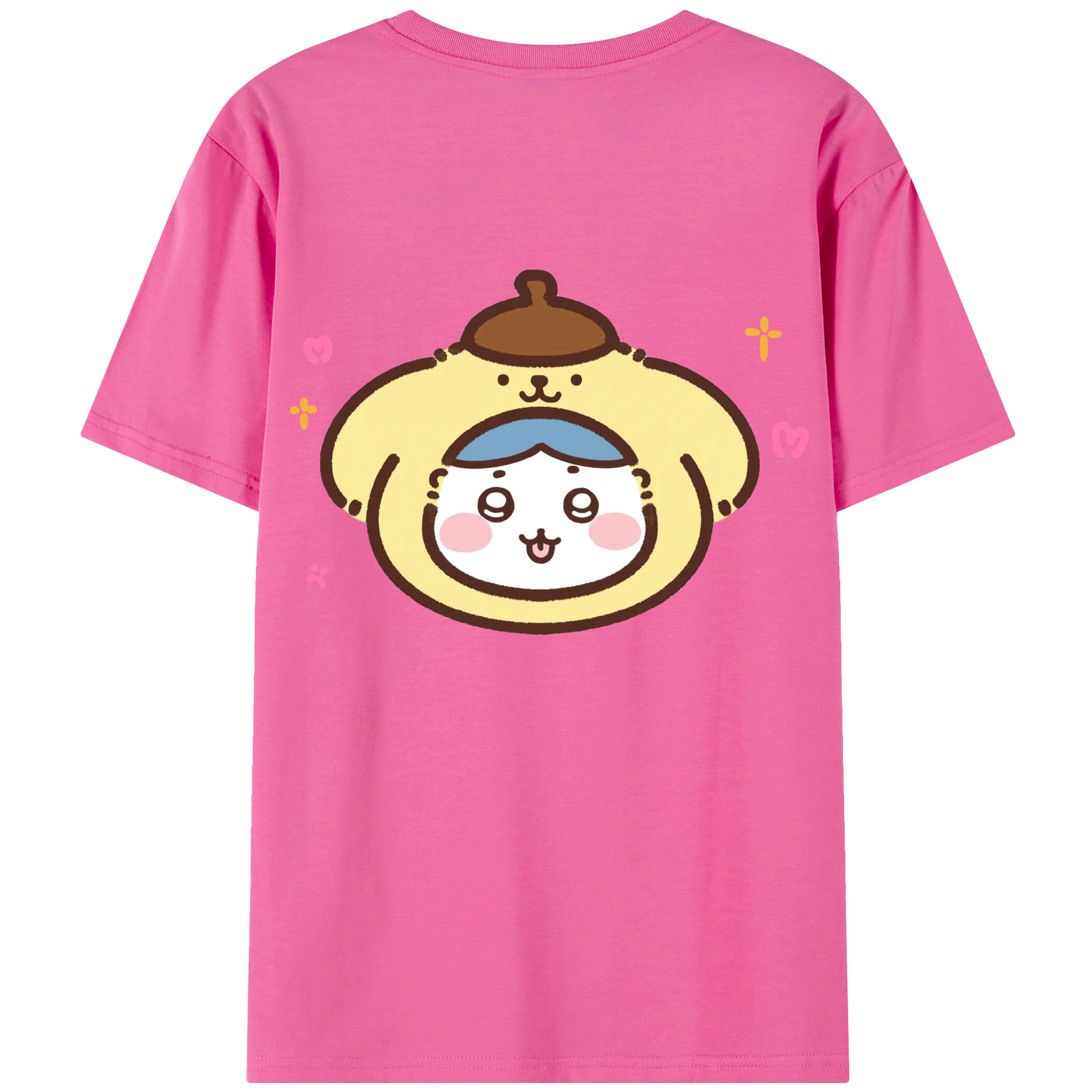 ポムポムプリン&ちいかわ - レディース半袖Tシャツ ・ 綿100% ・ バックプリント ・ 強化クルーネック ・ 二重折り袖口 ・ 快適 通気性 ・ フィットネス カジュアル 旅行用