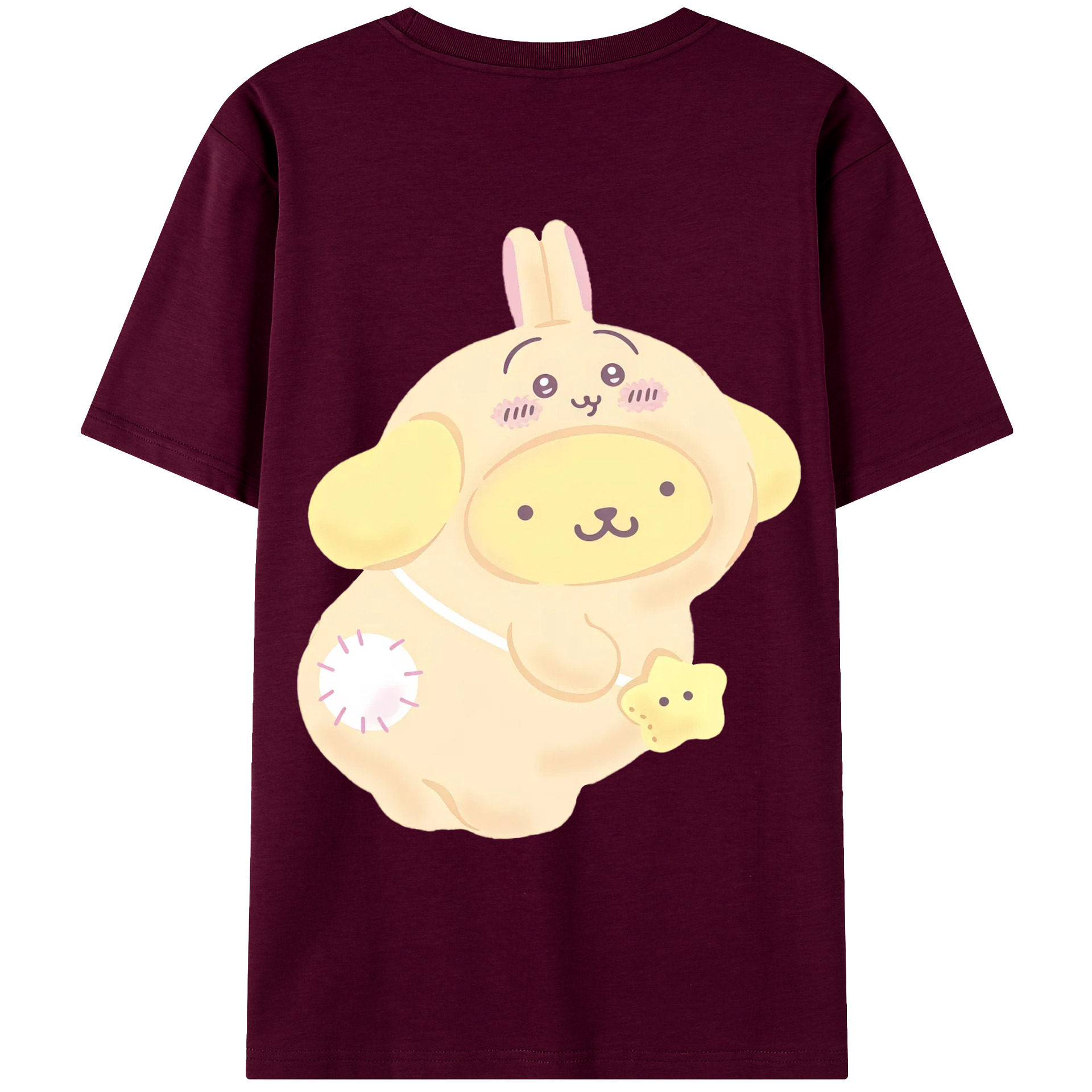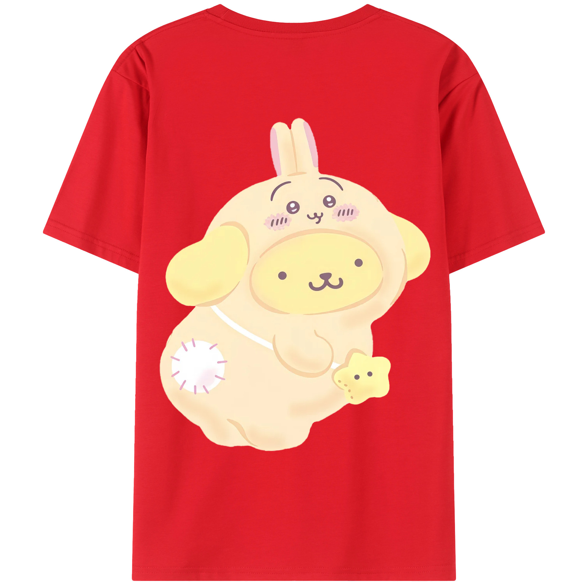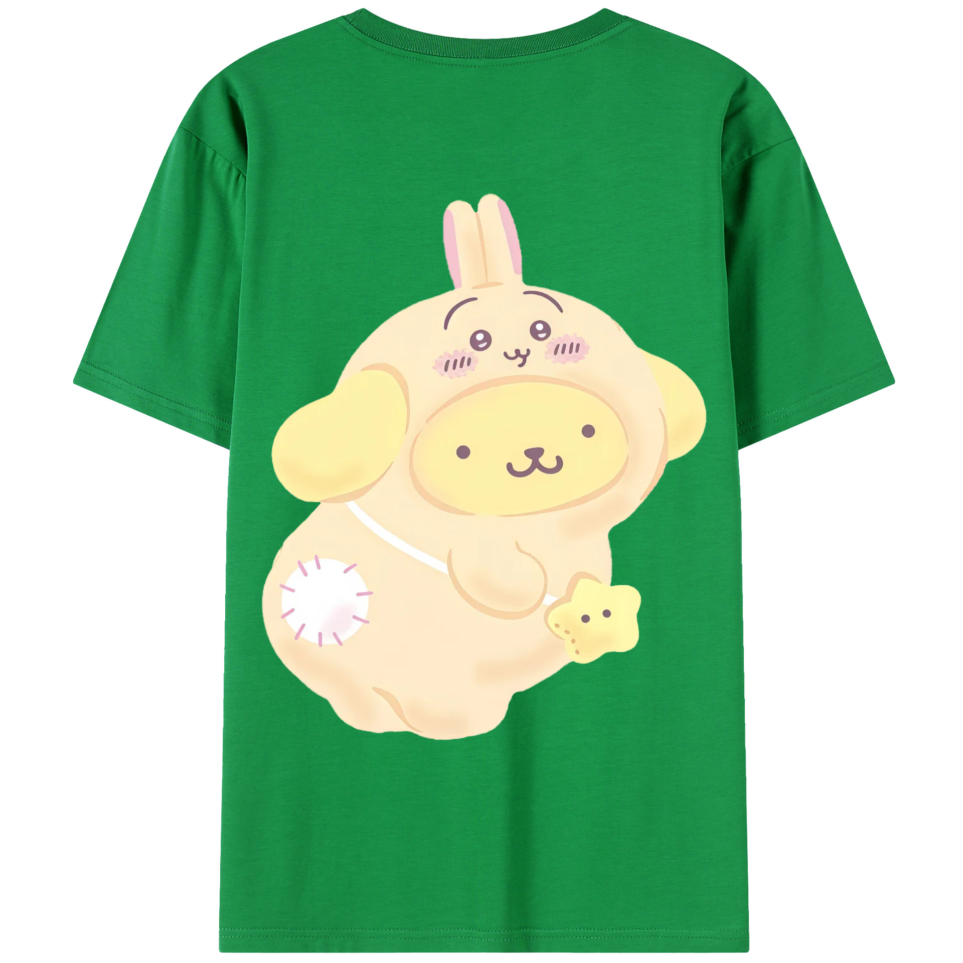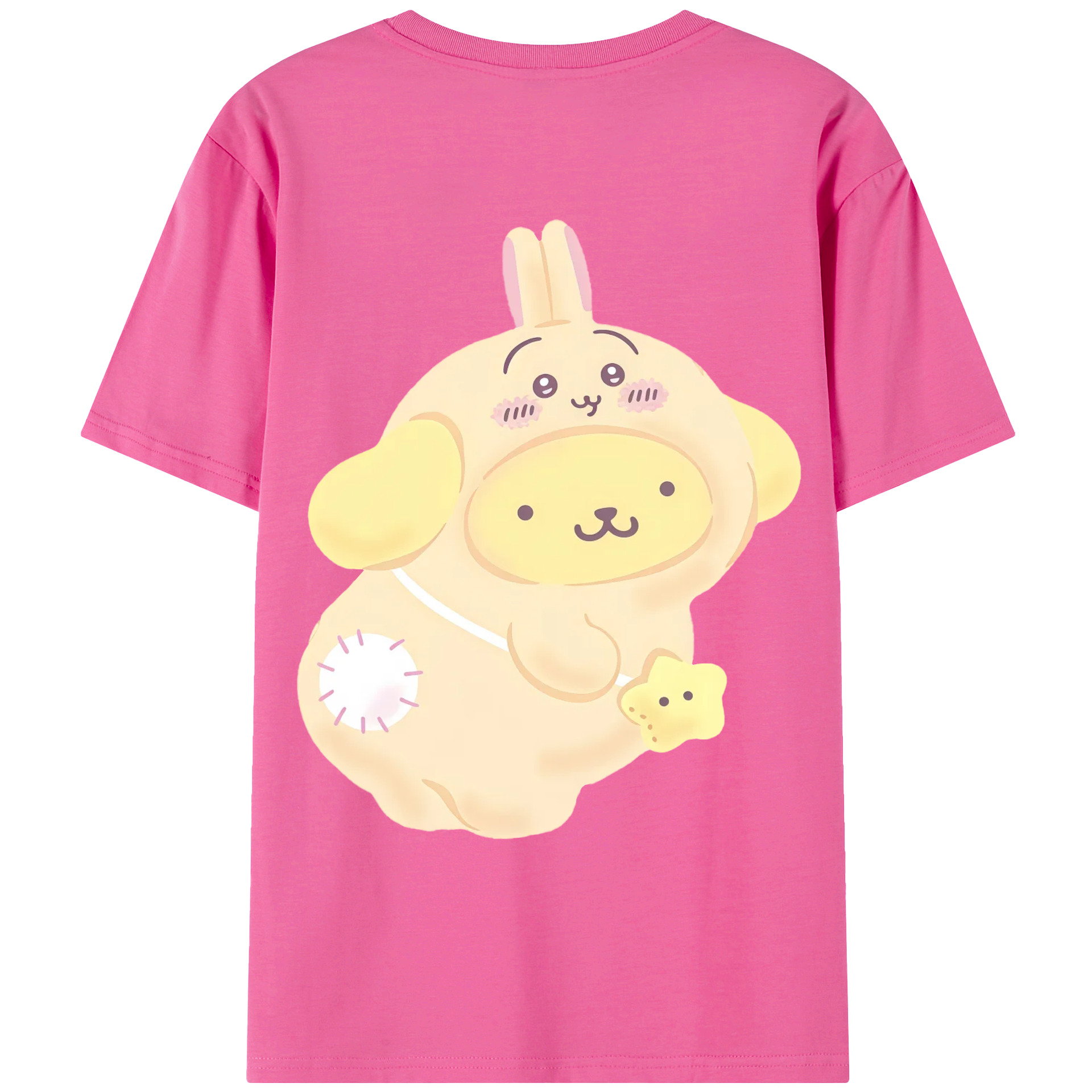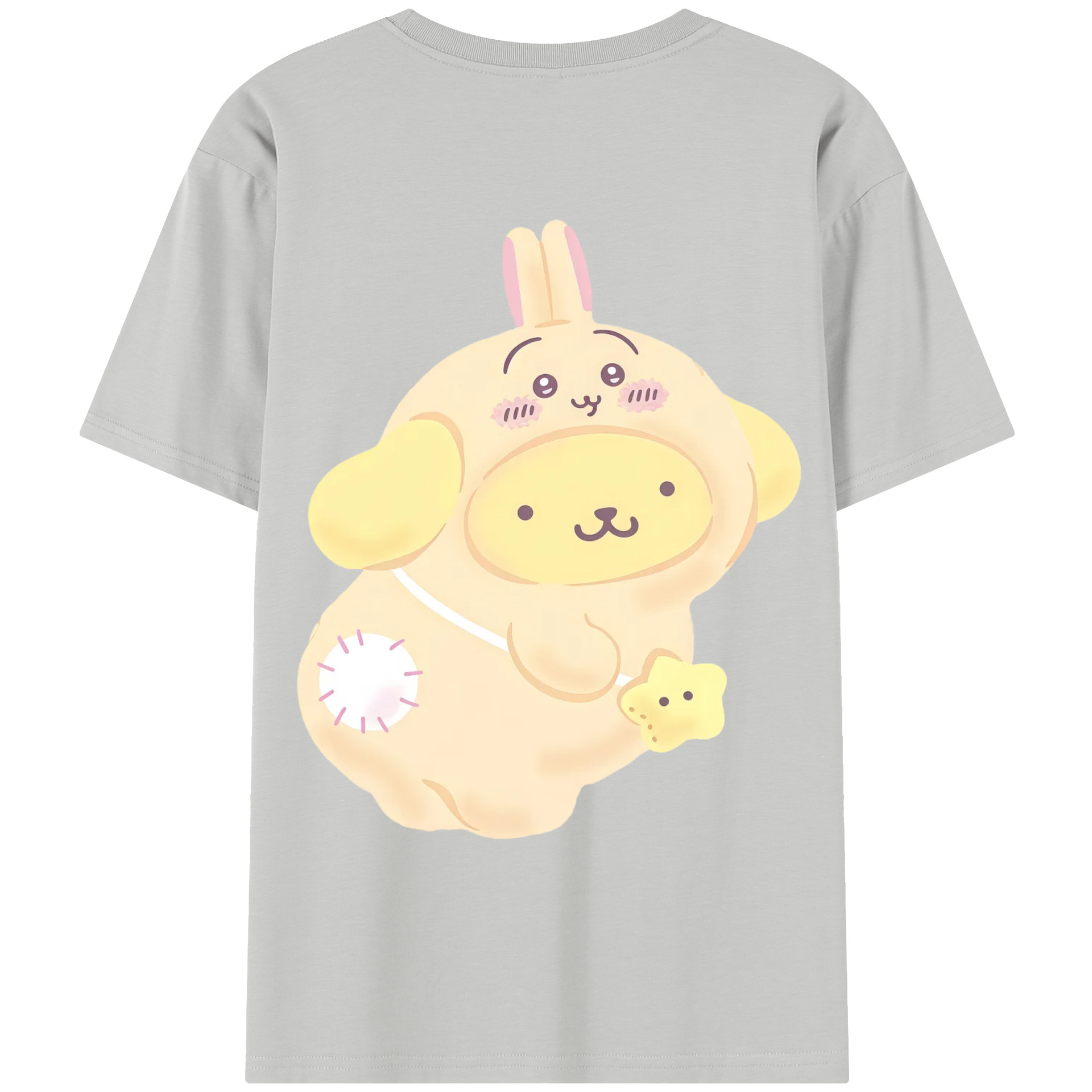 ポムポムプリン&ちいかわ - 綿100% ヴィンテージ風 半袖Tシャツ ・ 背面プリント ・ 柔らか肌触り ・ 通気性 快適 ・ スポーツ カジュアル 外出用