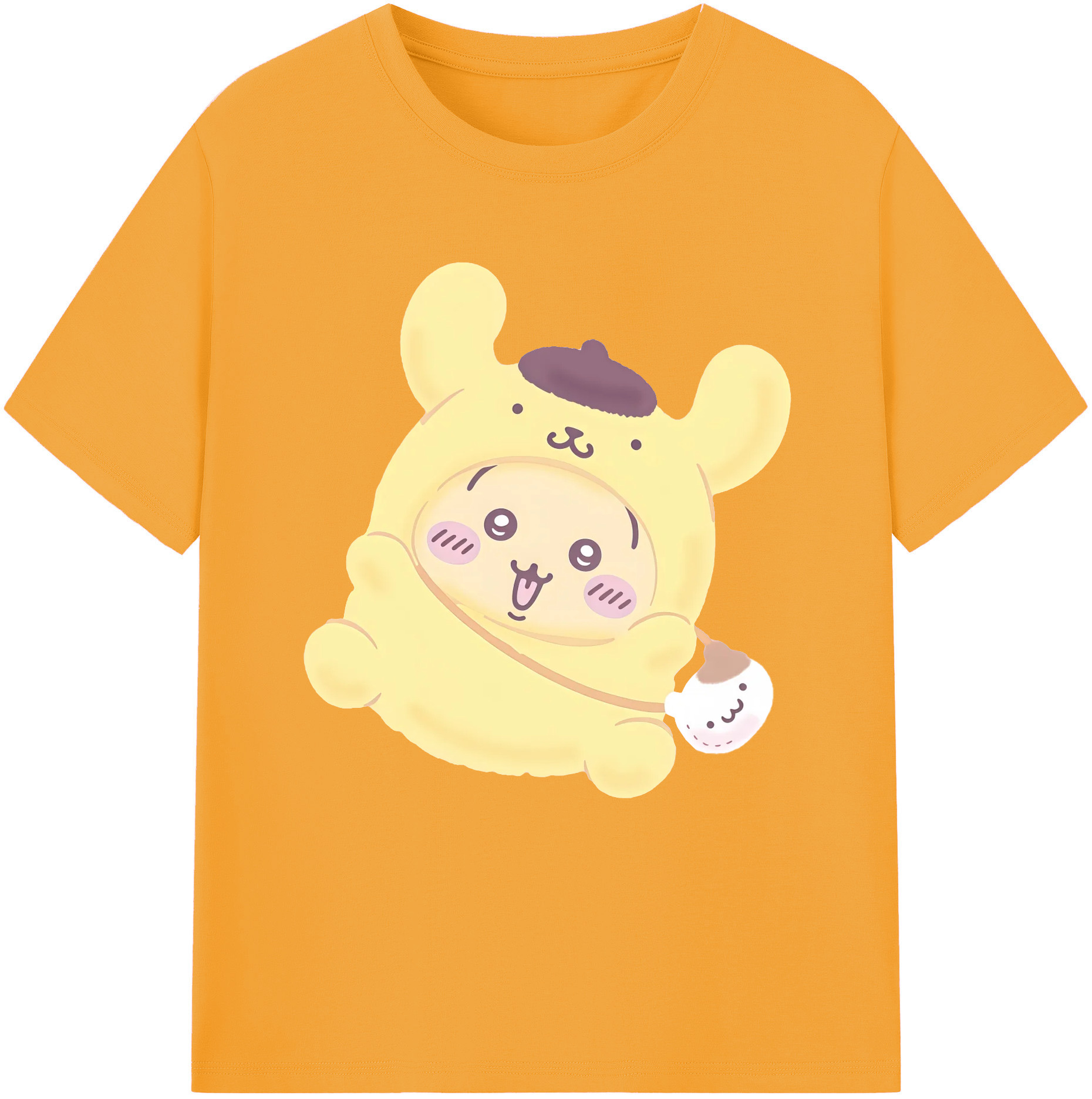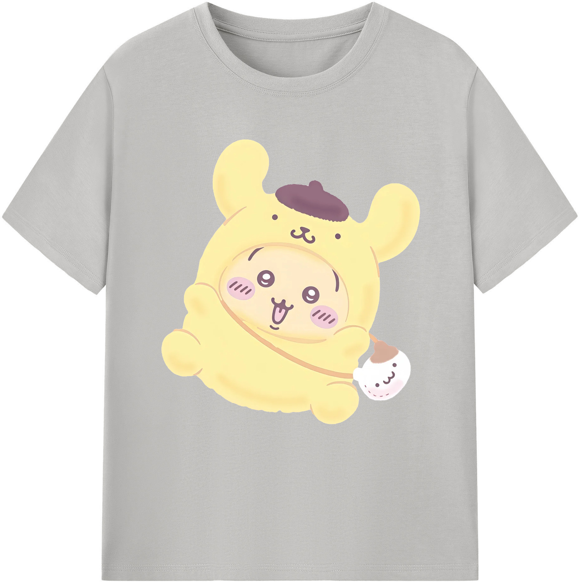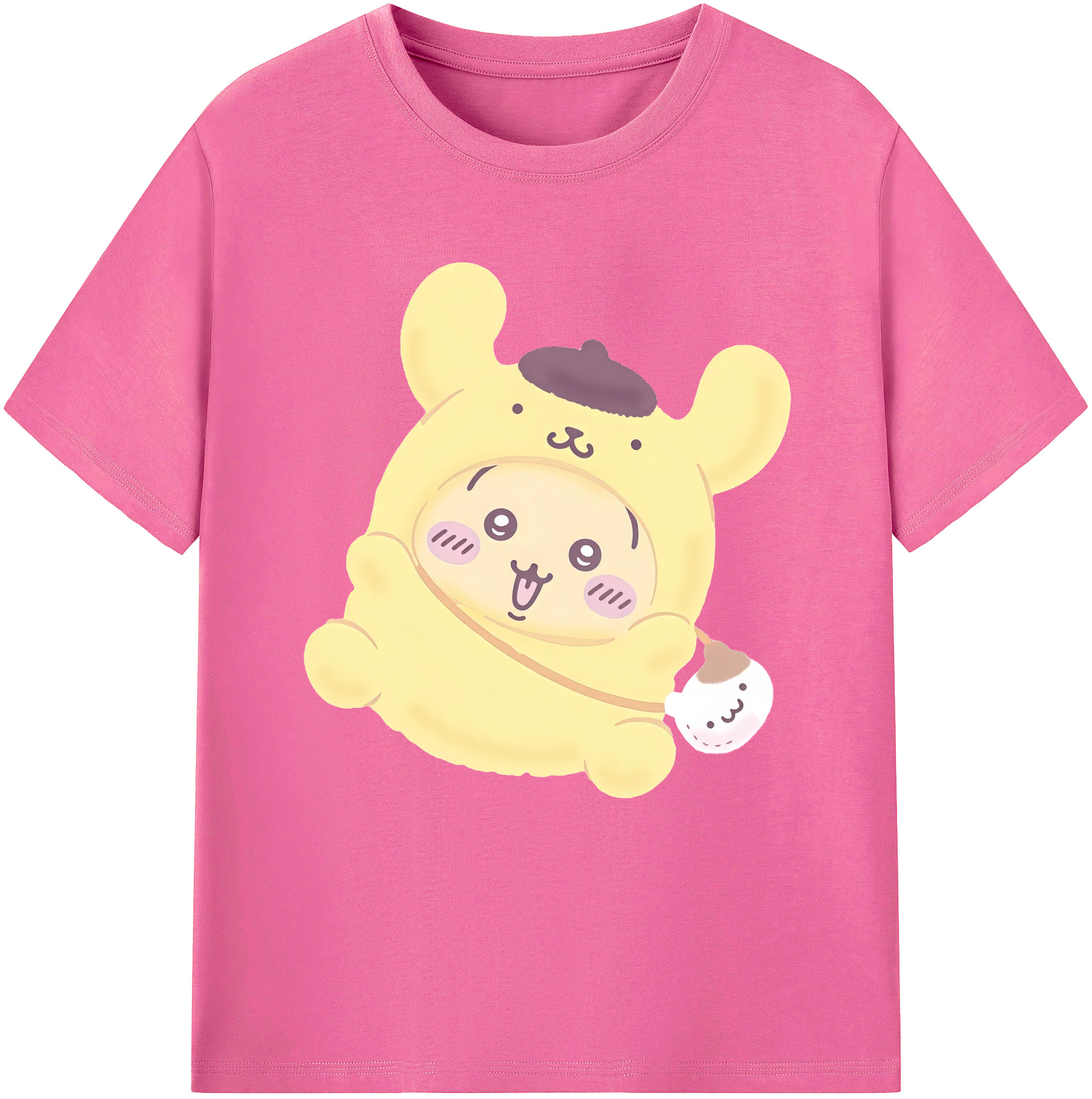 ポムポムプリン&ちいかわ - レディースカジュアルプリントTシャツ ・ 綿100% ・ クルーネック ・ フロントプリント ・ 柔らかく快適 ・ フィットネス カジュアル 旅行用
