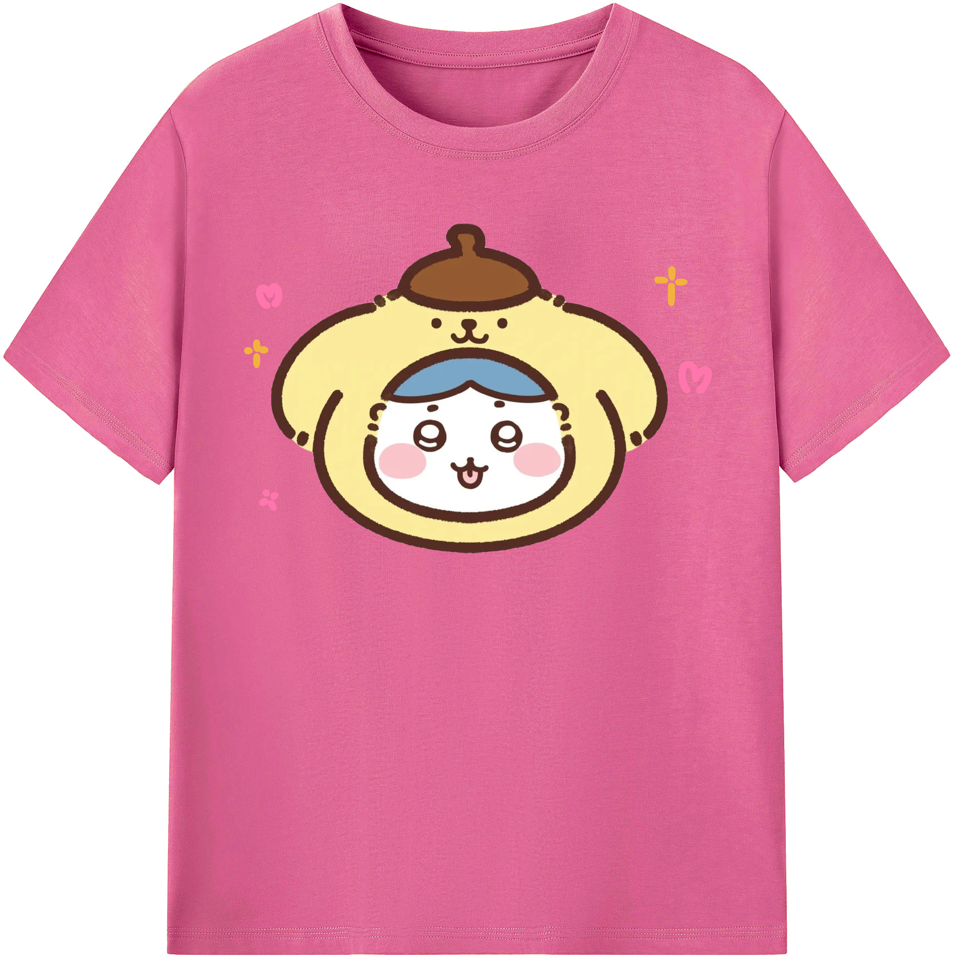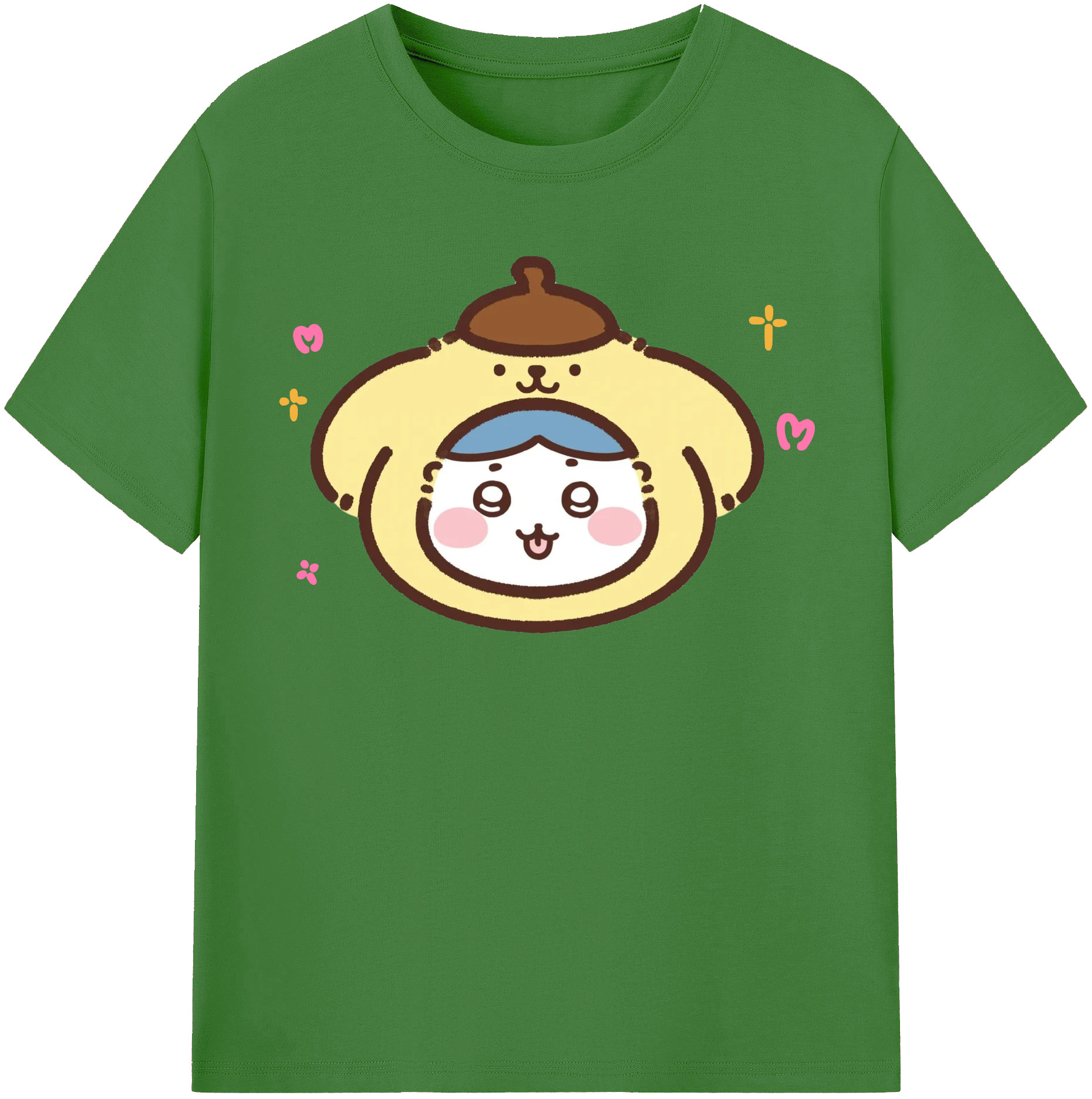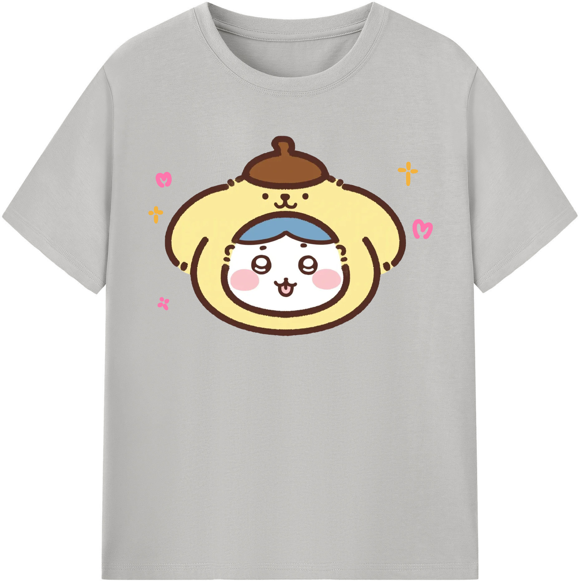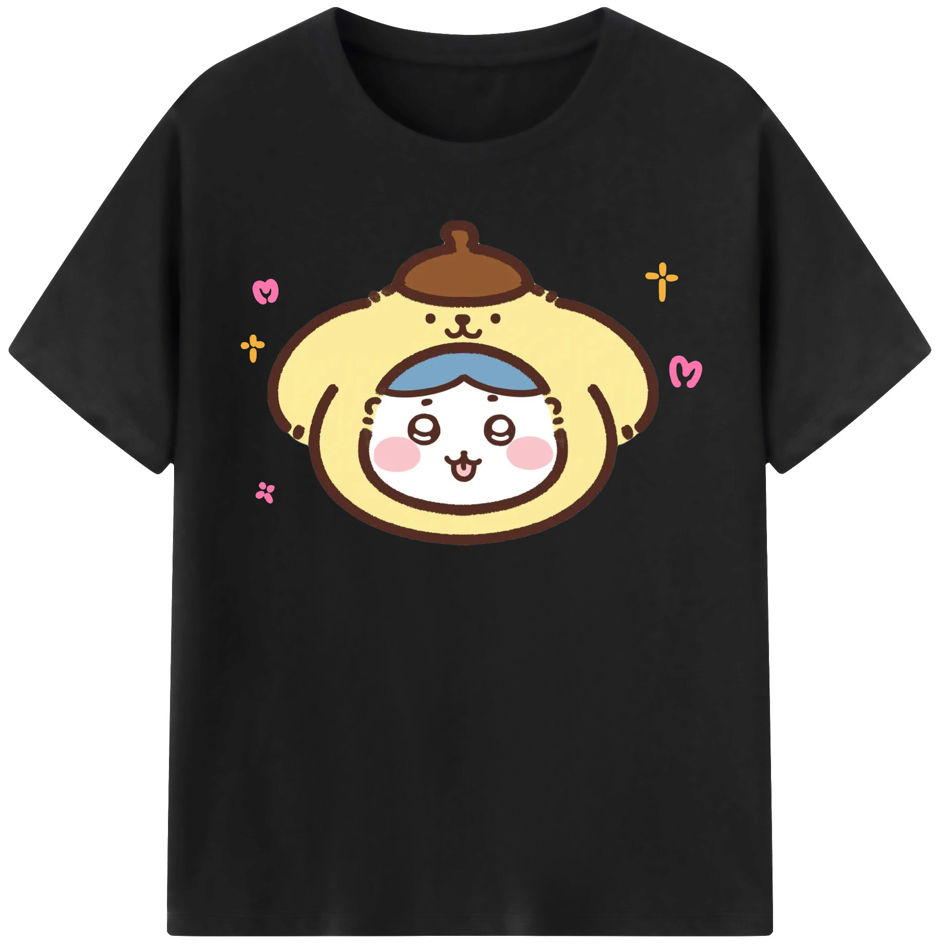ポムポムプリン&ちいかわ - レディースカジュアルプリントTシャツ ・ 綿100% ・ クルーネック ・ フロントプリント ・ 柔らかく快適 ・ フィットネス カジュアル 旅行用