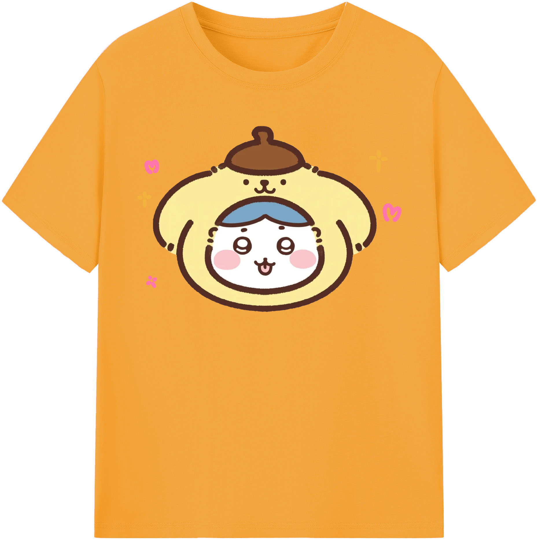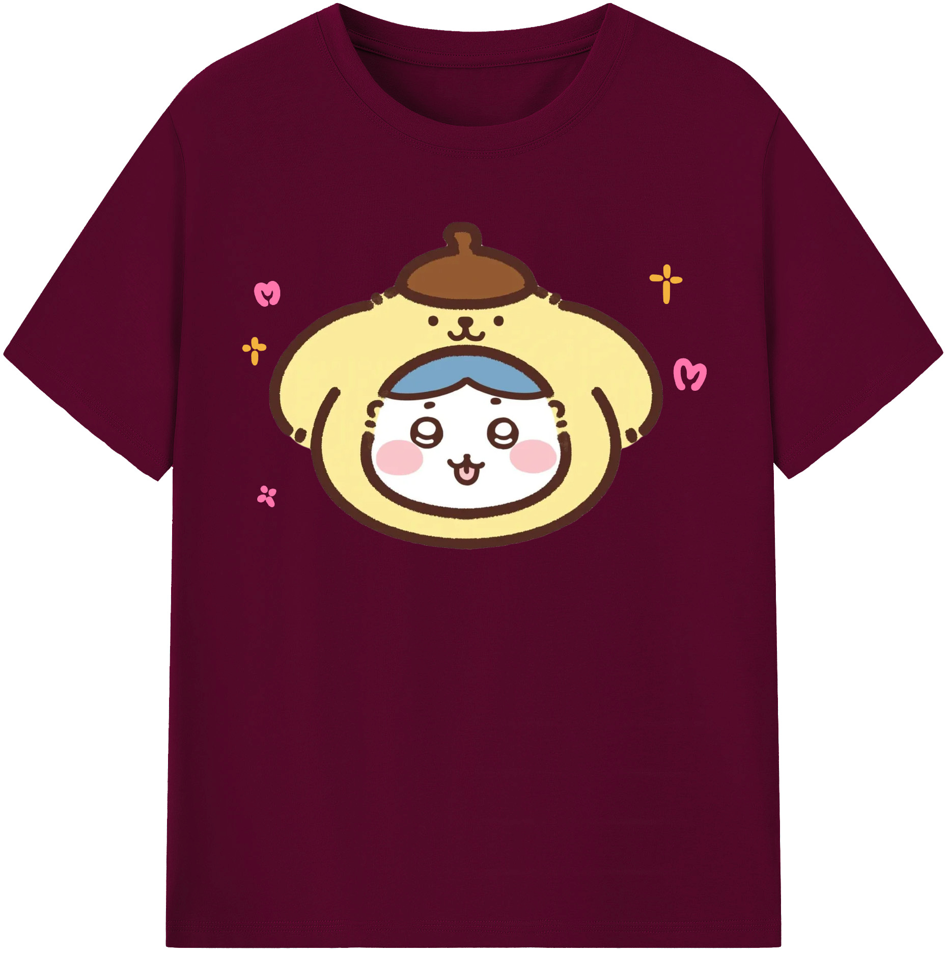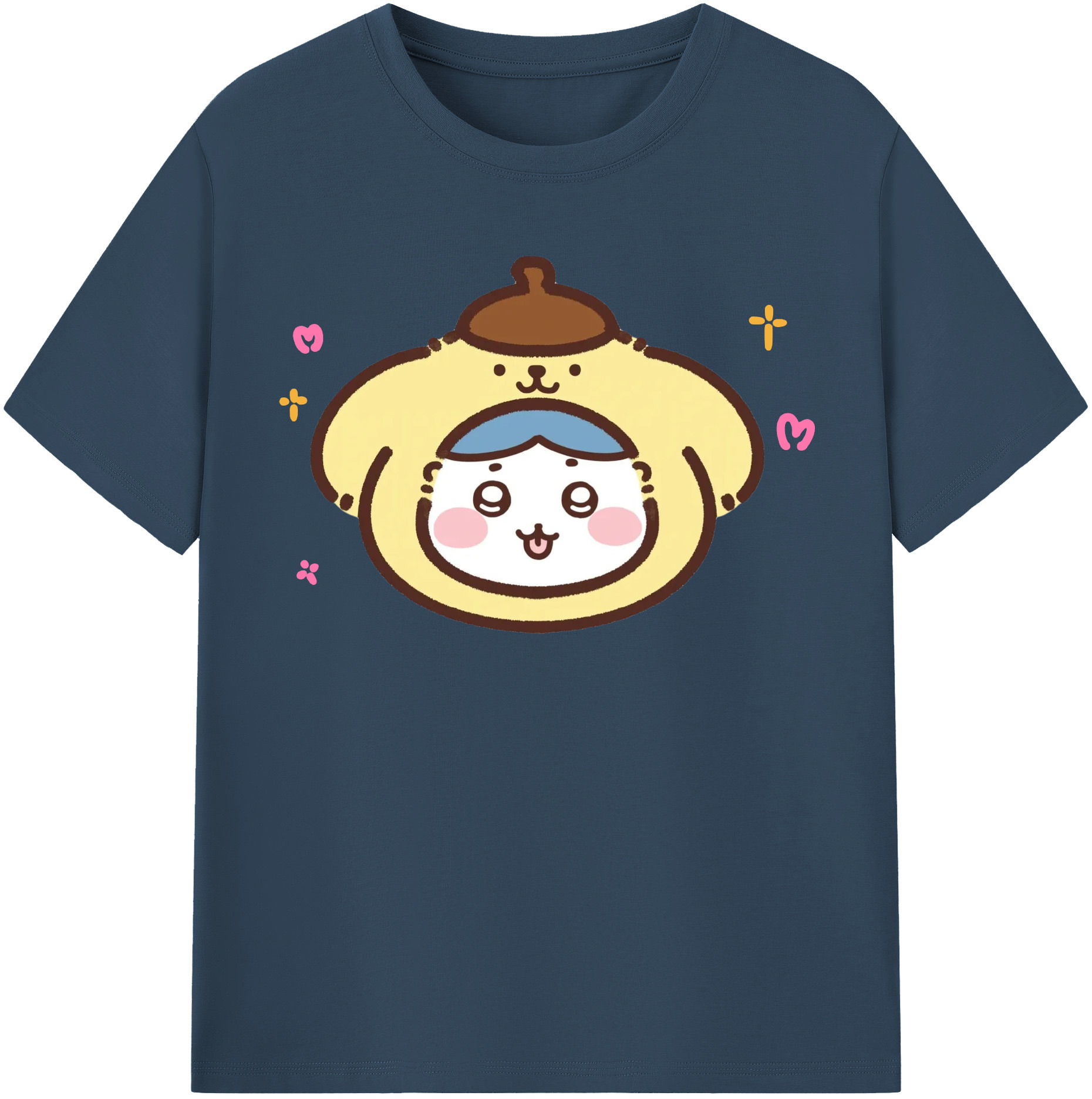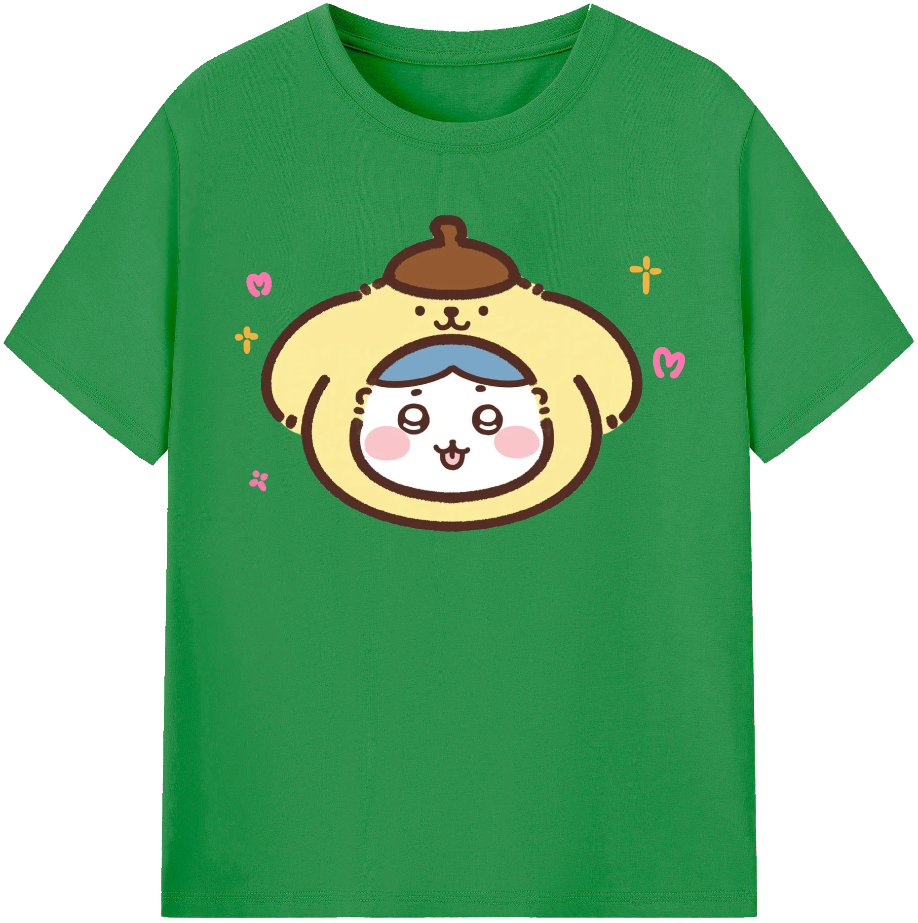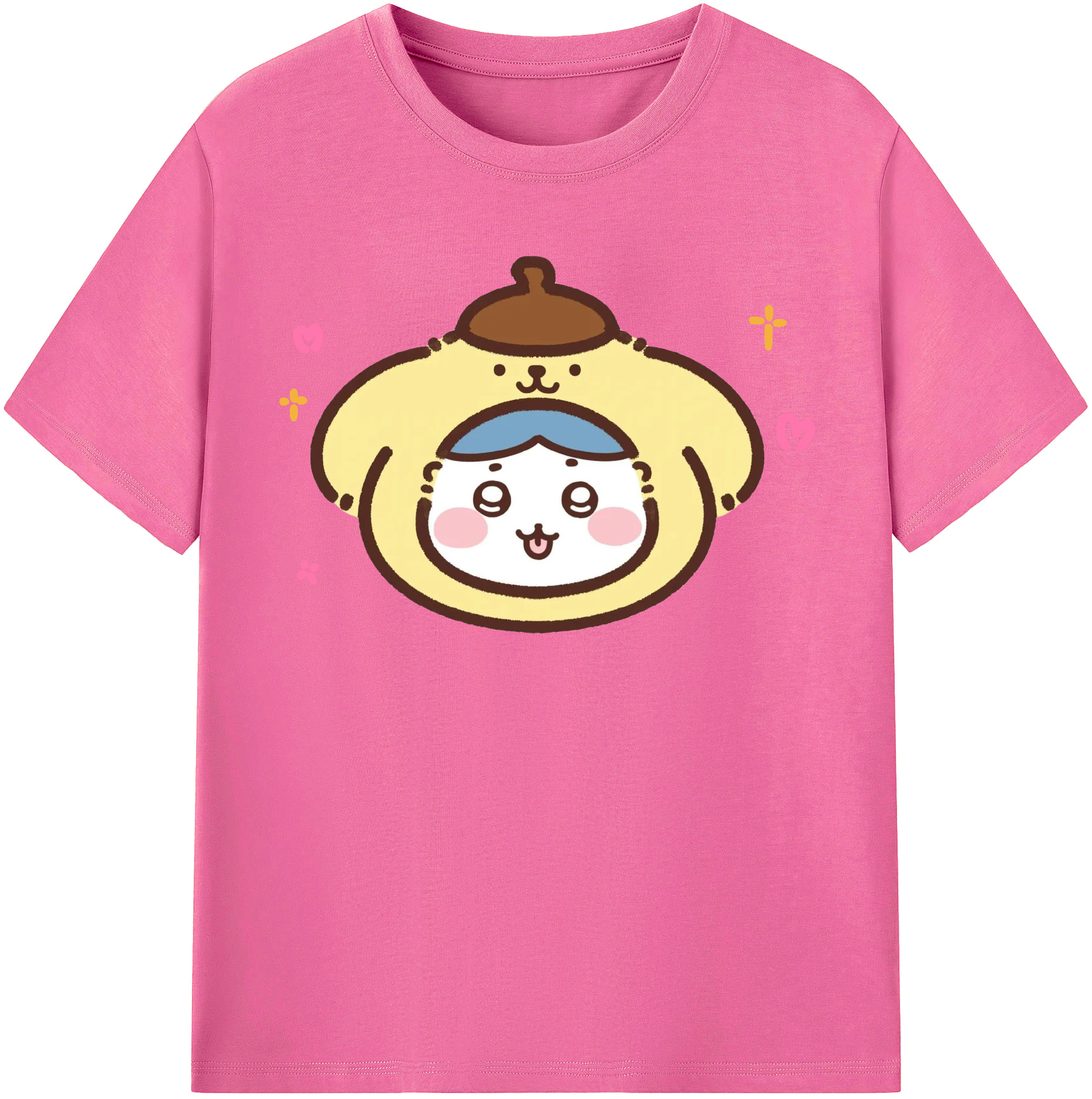 ポムポムプリン&ちいかわ - レディースカジュアルプリントTシャツ ・ 綿100% ・ クルーネック ・ フロントプリント ・ 柔らかく快適 ・ フィットネス カジュアル 旅行用